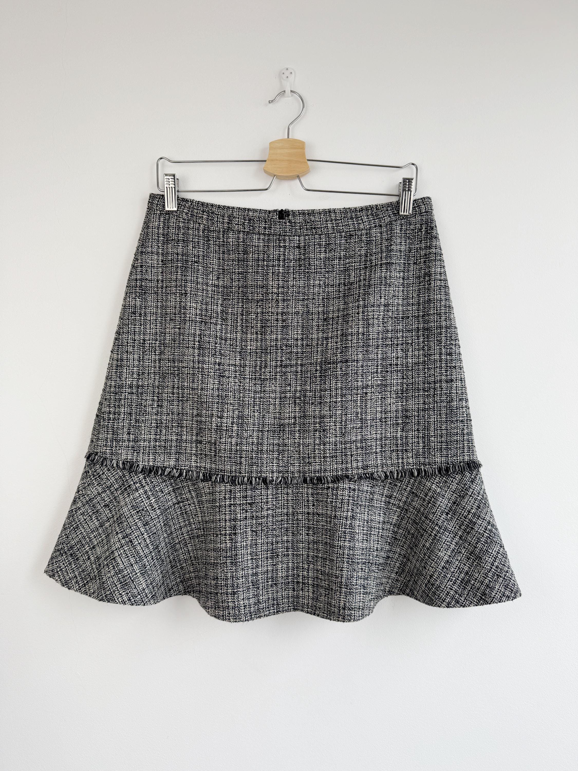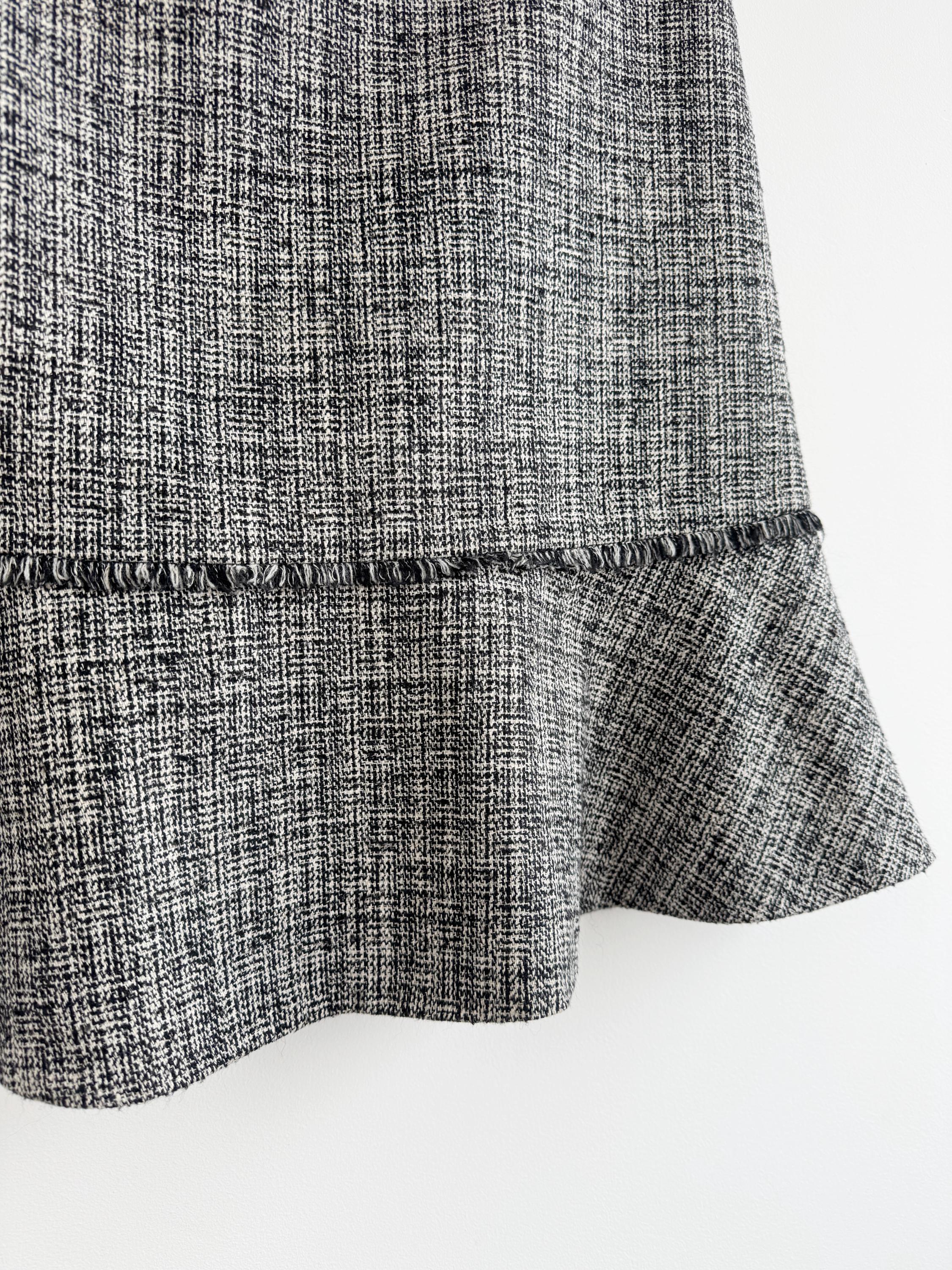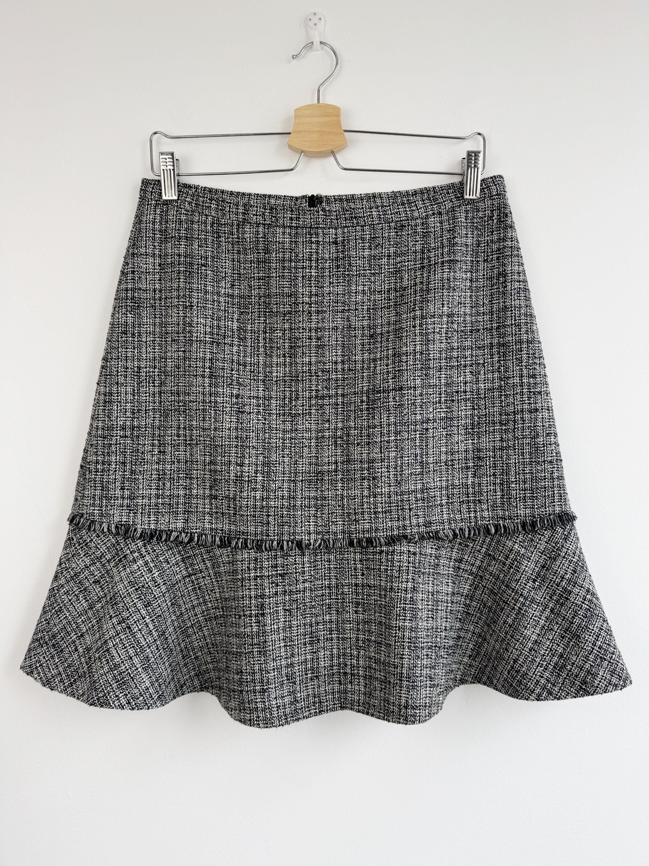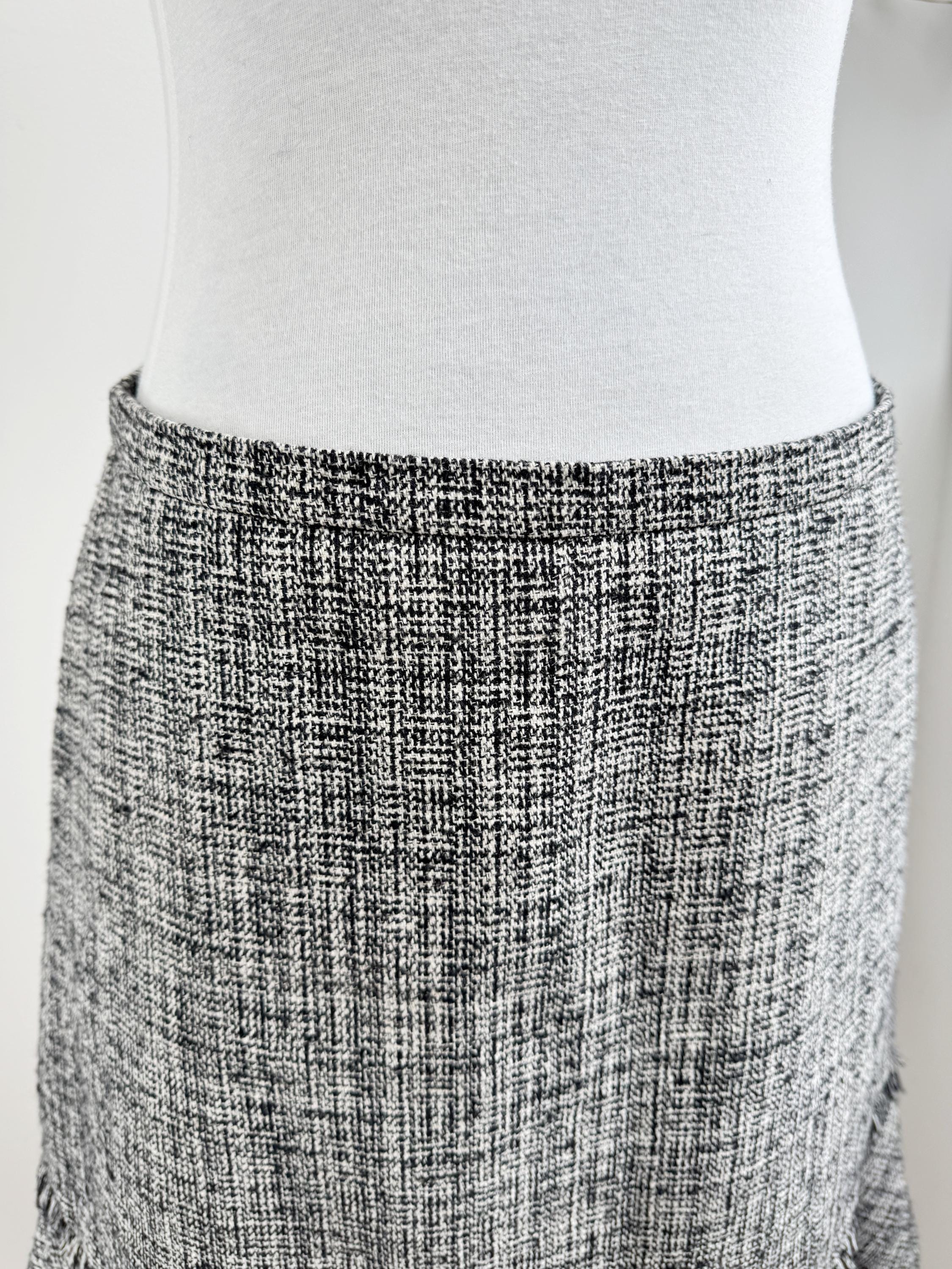 Elevate your professional and evening wardrobe with this authentic Max Mara Studio tweed skirt. Crafted from a premium blend of cotton and wool, this twed skirt features a sophisticated black white monochrome texture that offers timeless elegance. This cotton wool blend trumpet skirt is designed with a flattering structured waist that flows into a subtle flared "trumpet" hem, accented by a delicate raw-fringe trim for a touch of contemporary texture.