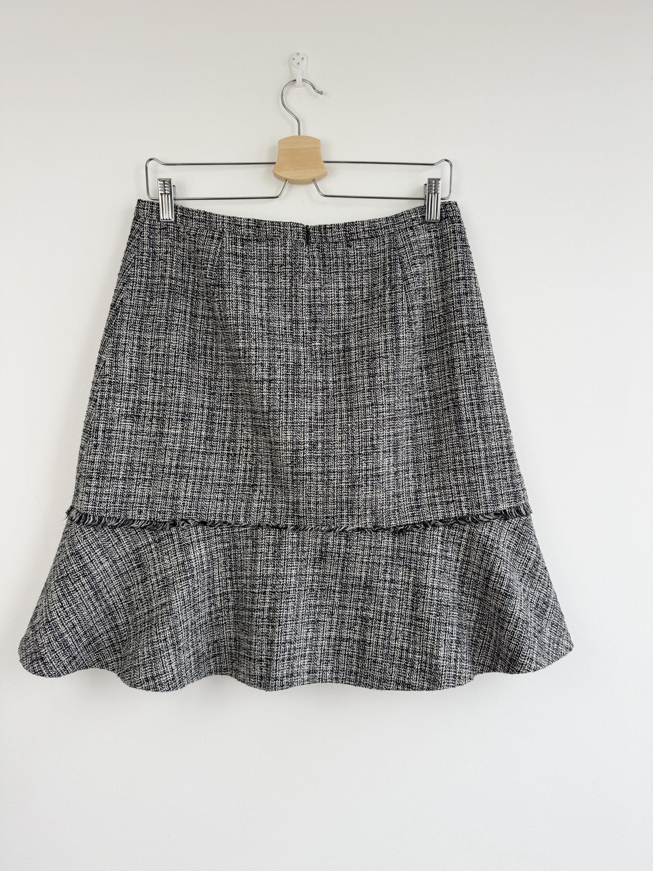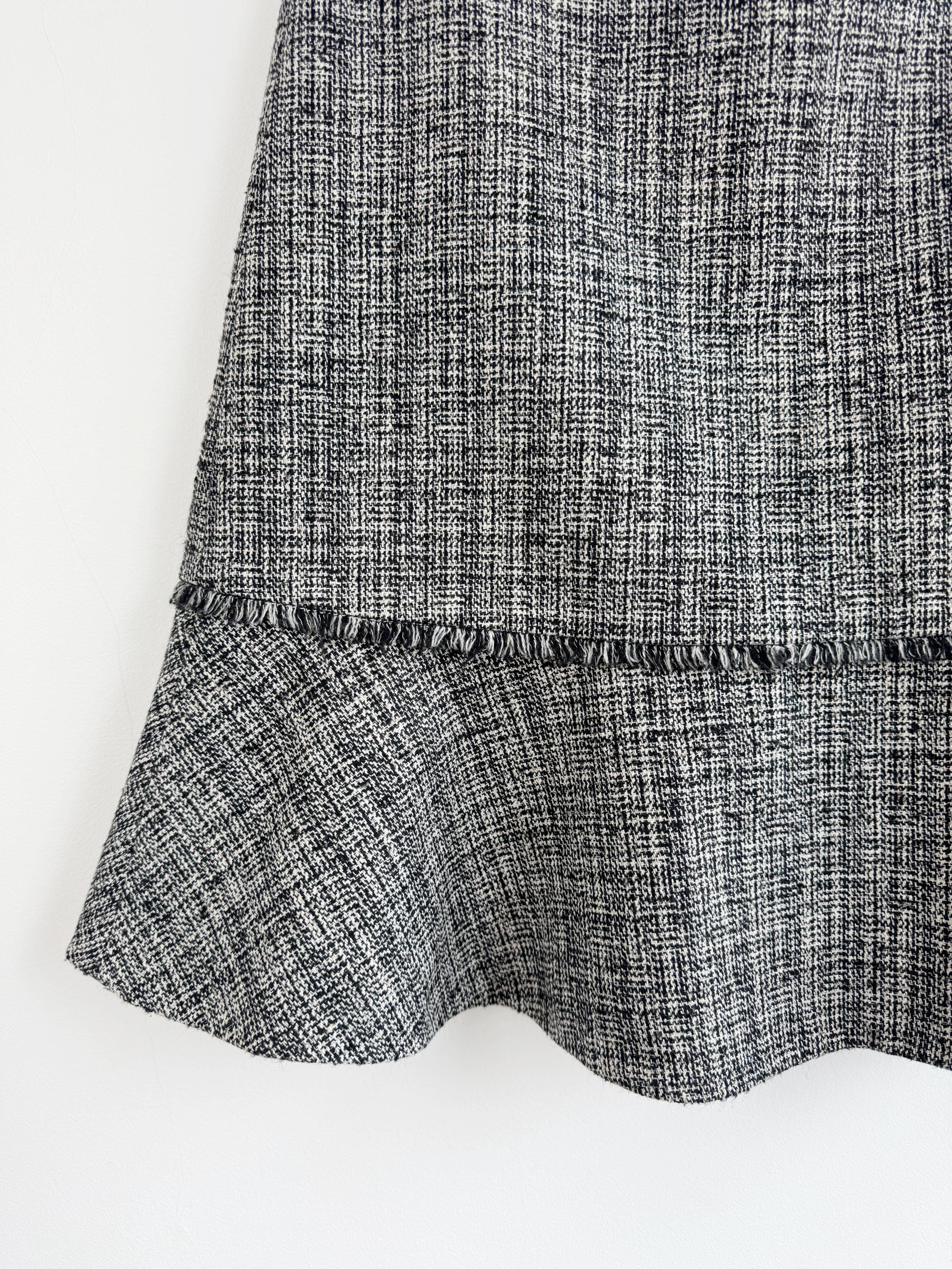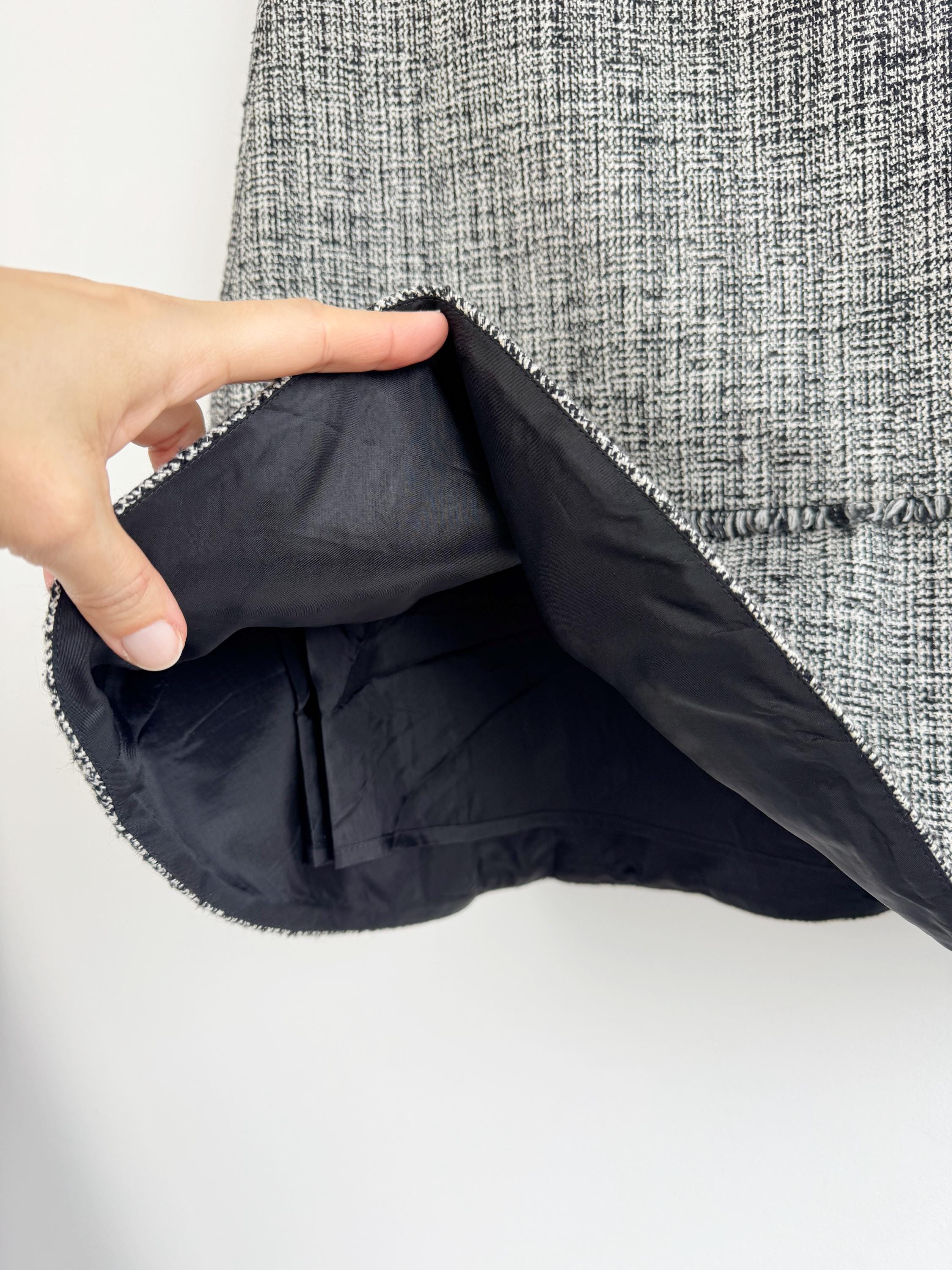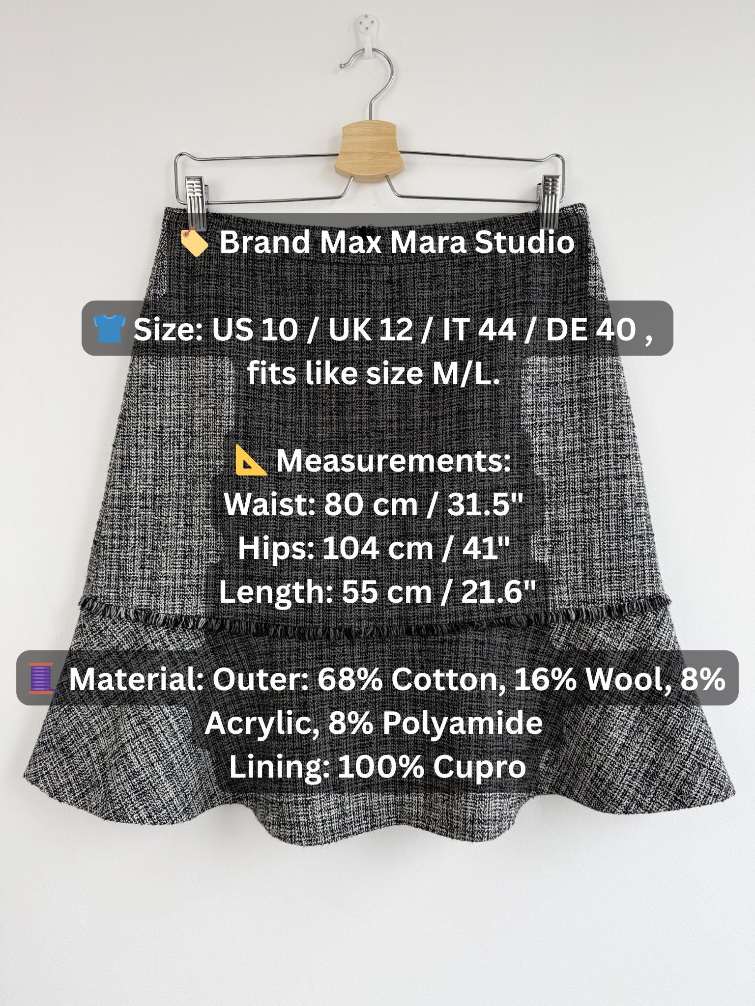 Elevate your professional and evening wardrobe with this authentic Max Mara Studio tweed skirt. Crafted from a premium blend of cotton and wool, this twed skirt features a sophisticated black white monochrome texture that offers timeless elegance. This cotton wool blend trumpet skirt is designed with a flattering structured waist that flows into a subtle flared "trumpet" hem, accented by a delicate raw-fringe trim for a touch of contemporary texture.