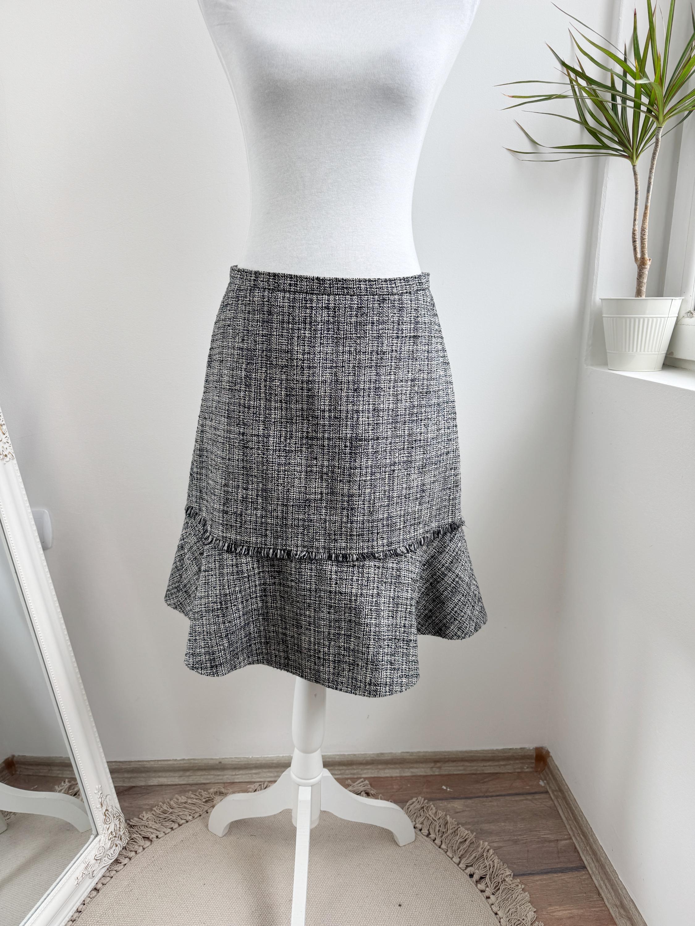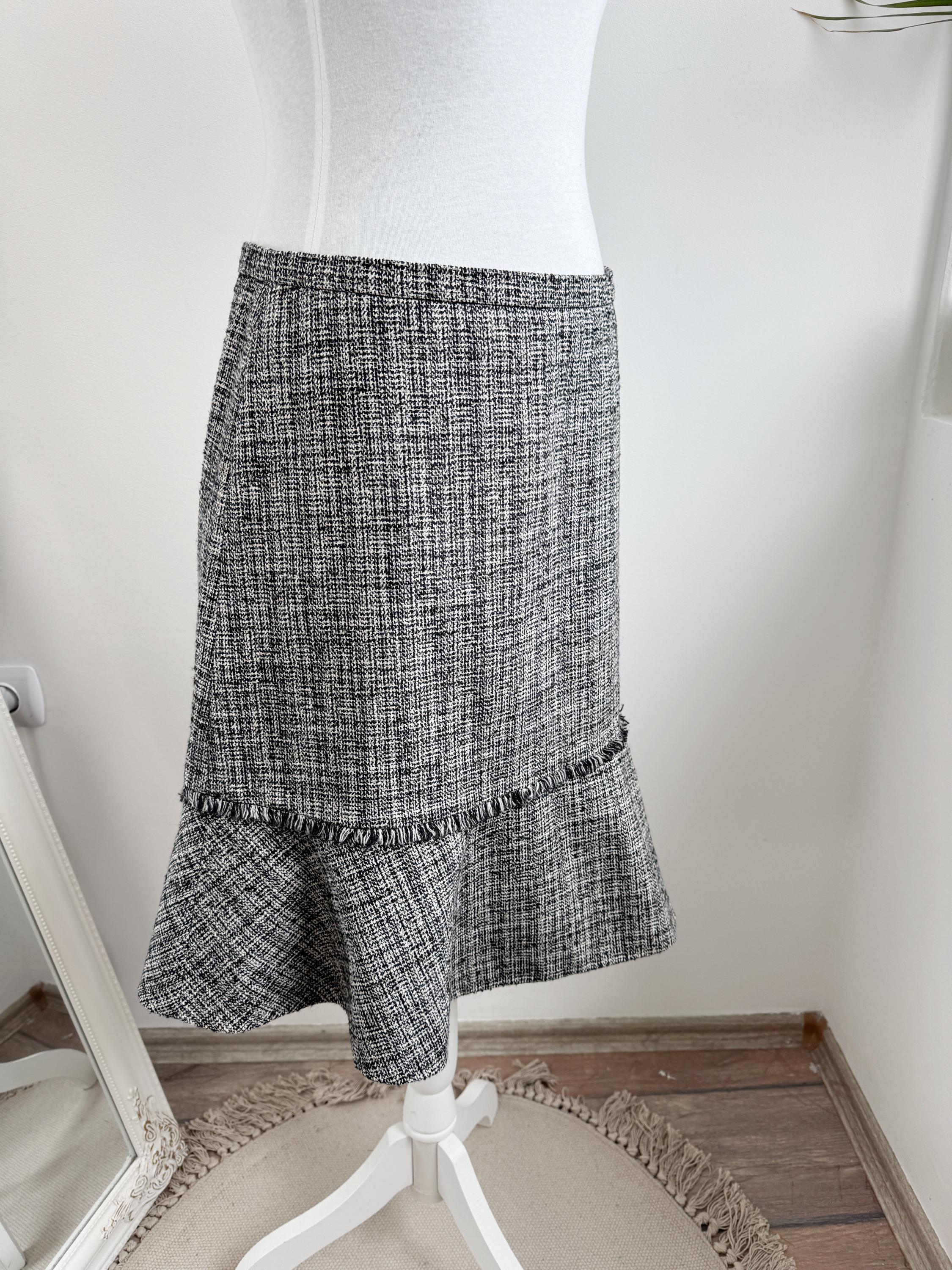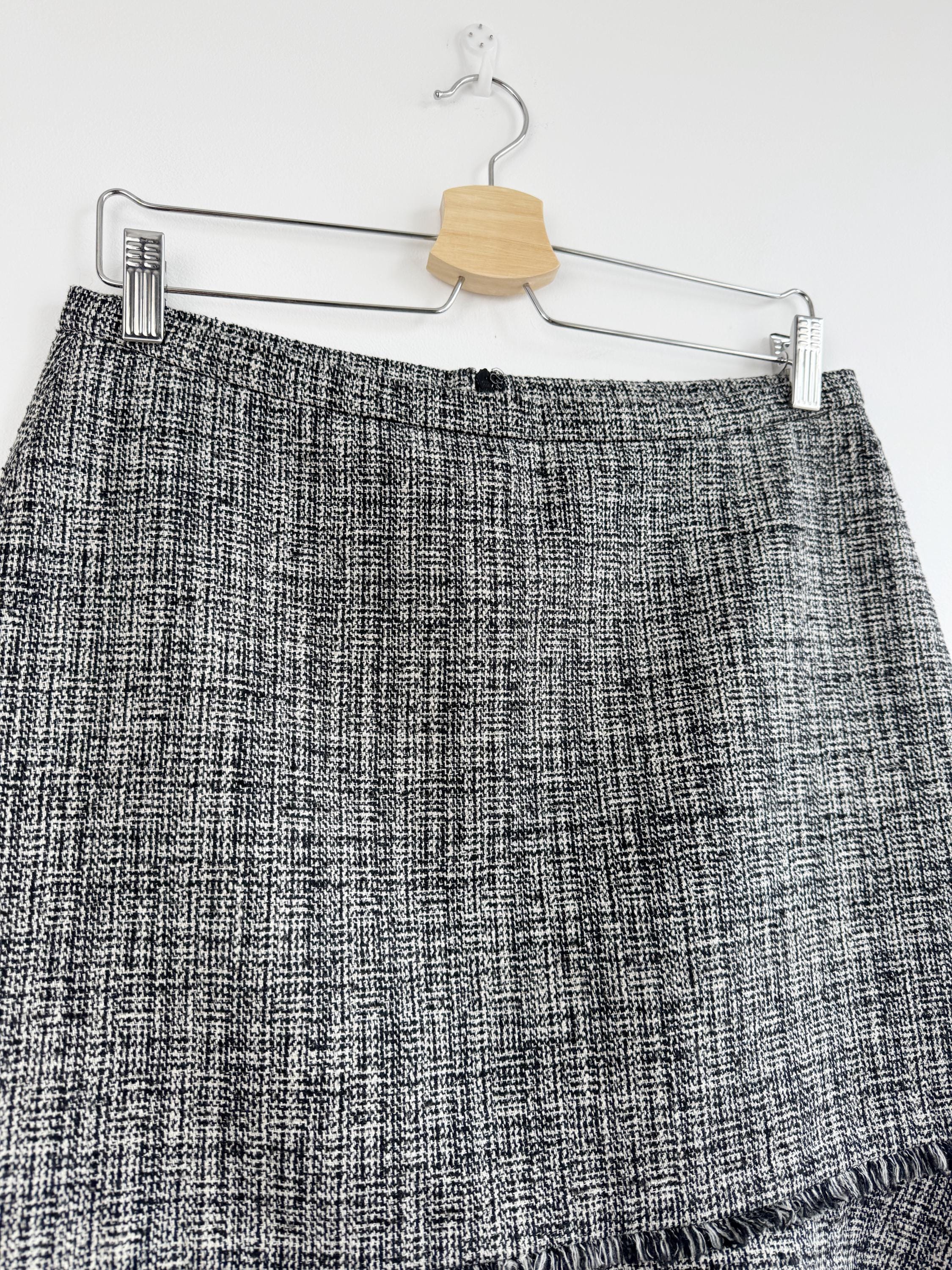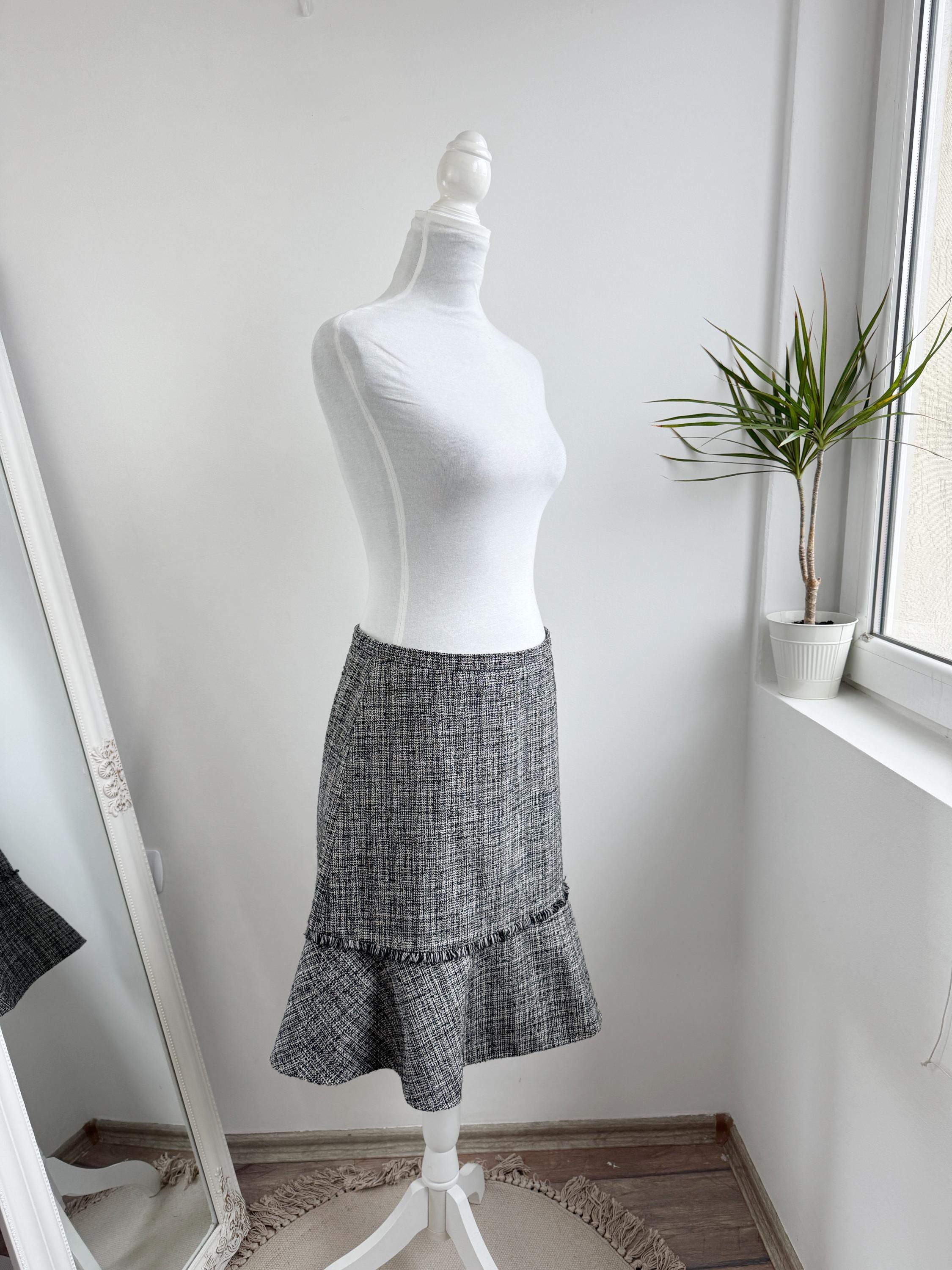 Elevate your professional and evening wardrobe with this authentic Max Mara Studio tweed skirt. Crafted from a premium blend of cotton and wool, this twed skirt features a sophisticated black white monochrome texture that offers timeless elegance. This cotton wool blend trumpet skirt is designed with a flattering structured waist that flows into a subtle flared "trumpet" hem, accented by a delicate raw-fringe trim for a touch of contemporary texture.
