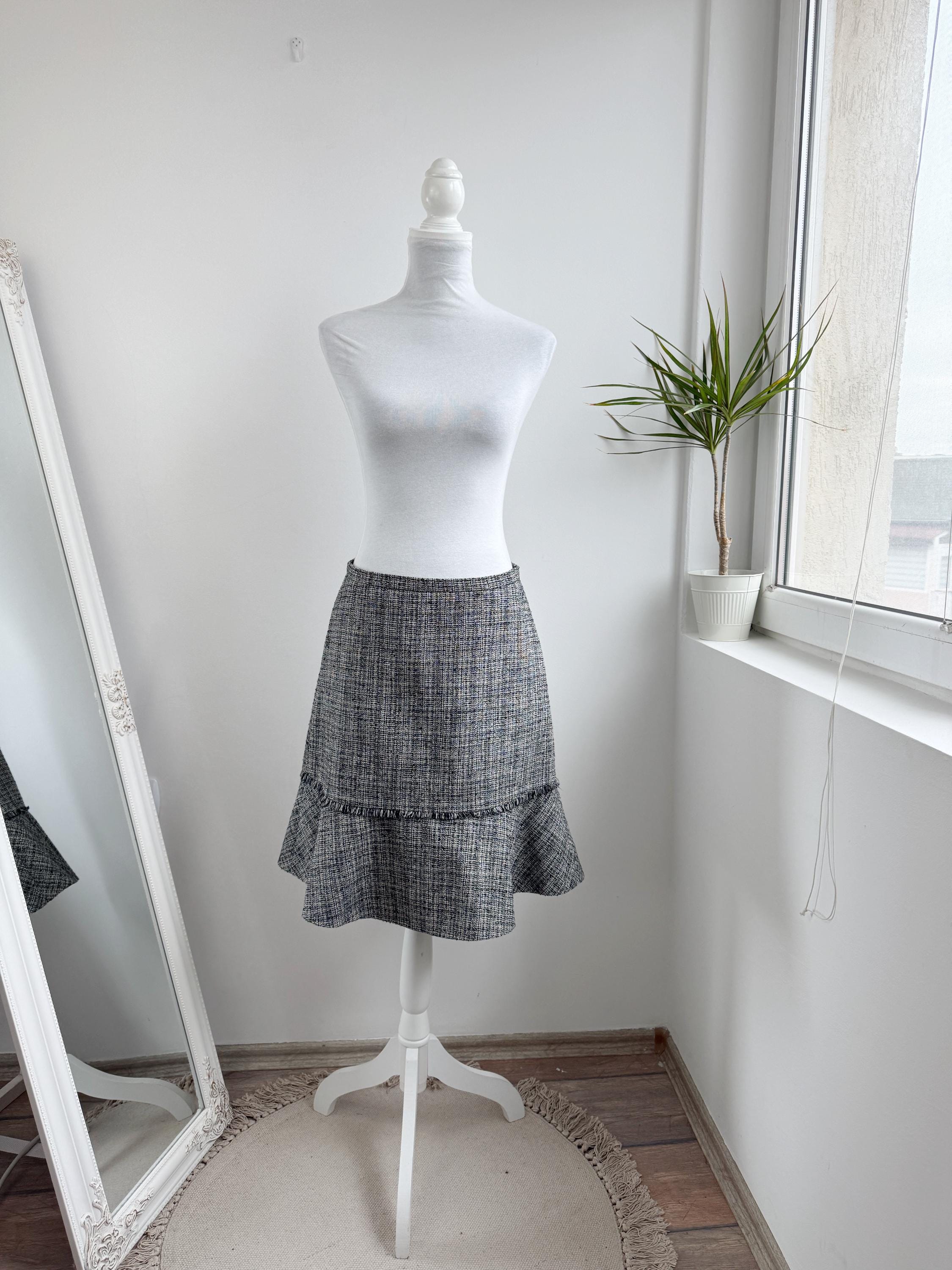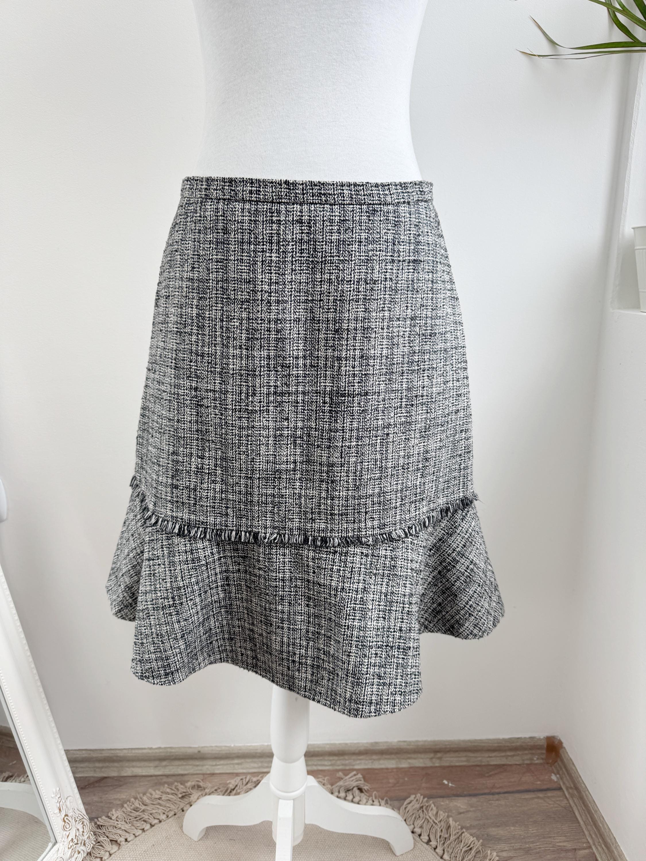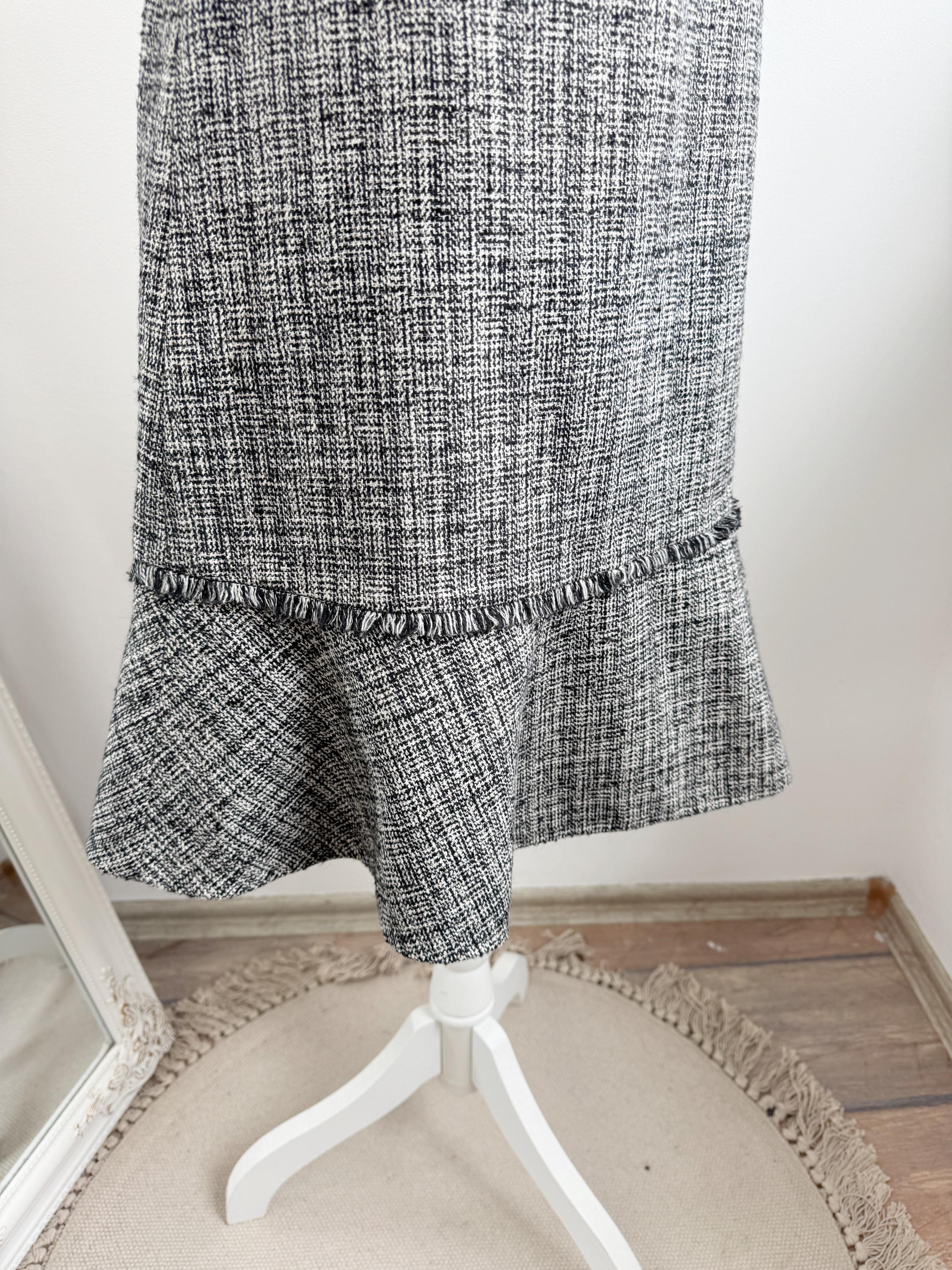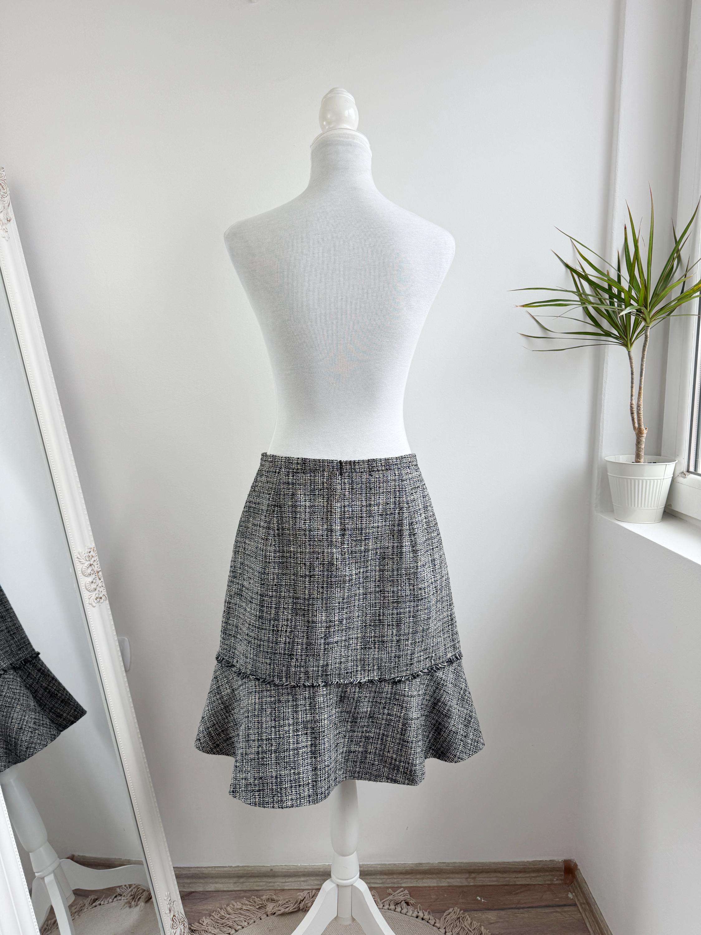 Elevate your professional and evening wardrobe with this authentic Max Mara Studio tweed skirt. Crafted from a premium blend of cotton and wool, this twed skirt features a sophisticated black white monochrome texture that offers timeless elegance. This cotton wool blend trumpet skirt is designed with a flattering structured waist that flows into a subtle flared "trumpet" hem, accented by a delicate raw-fringe trim for a touch of contemporary texture.