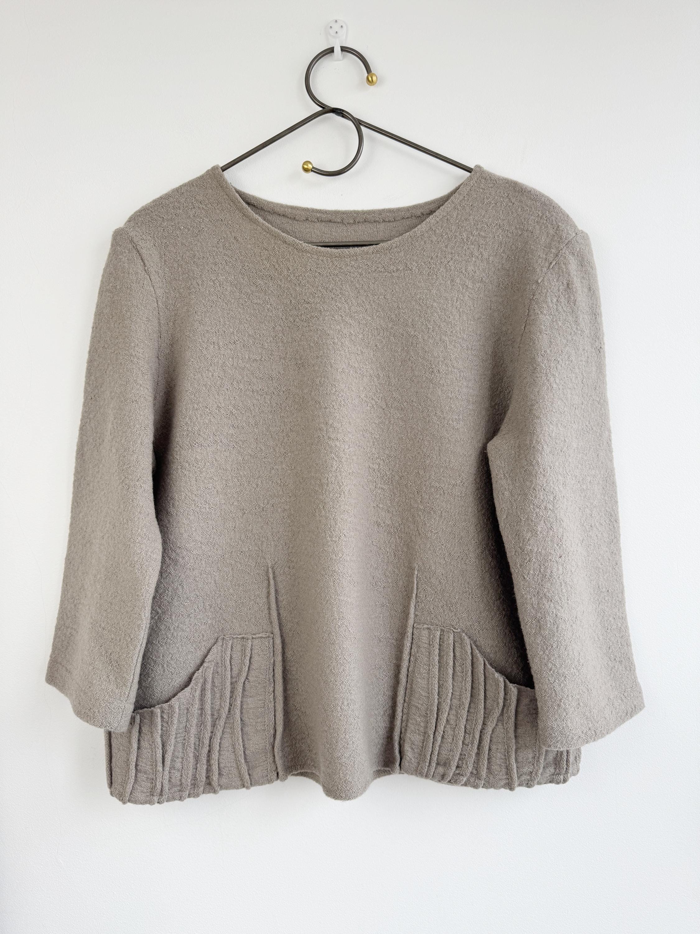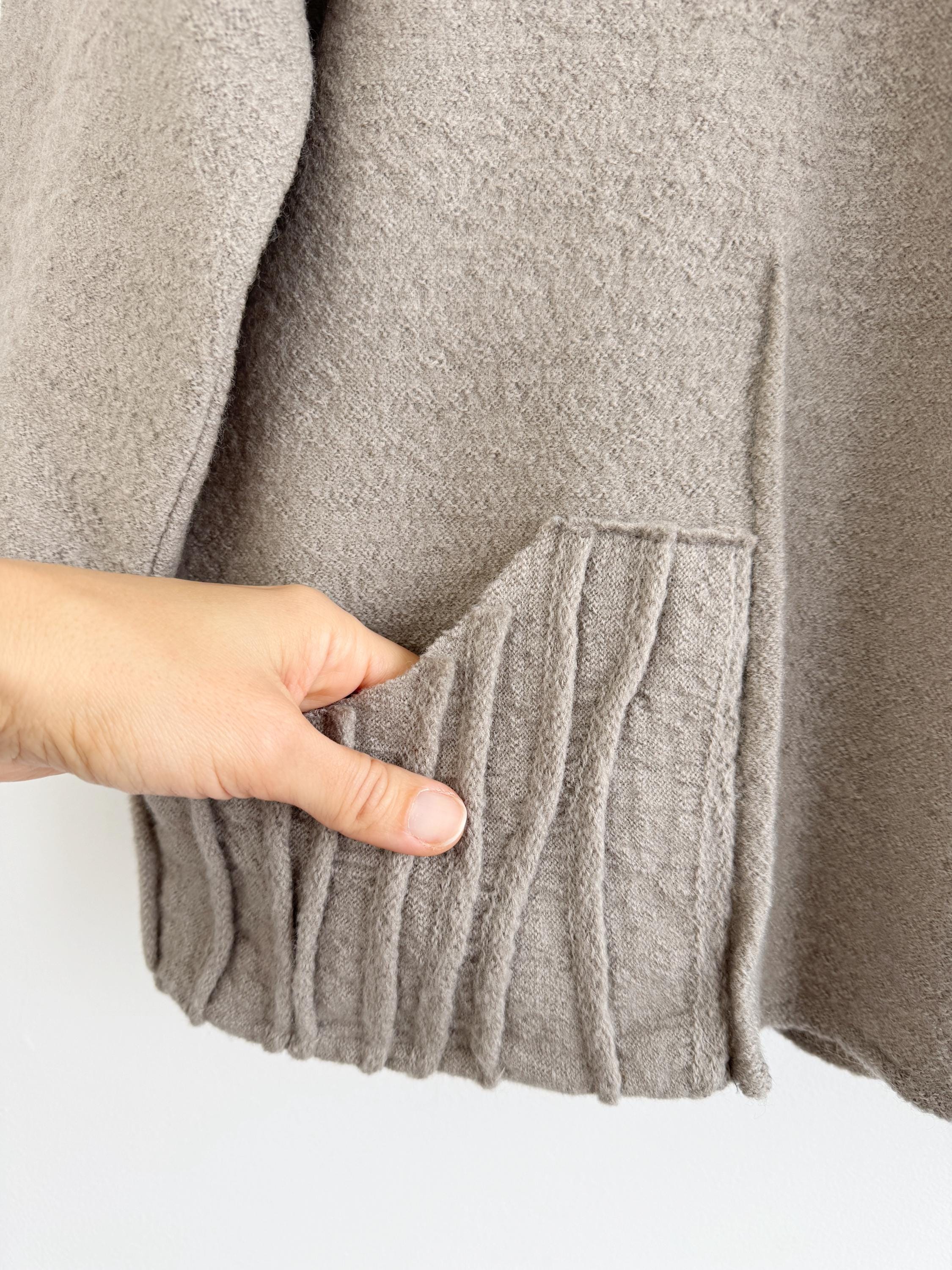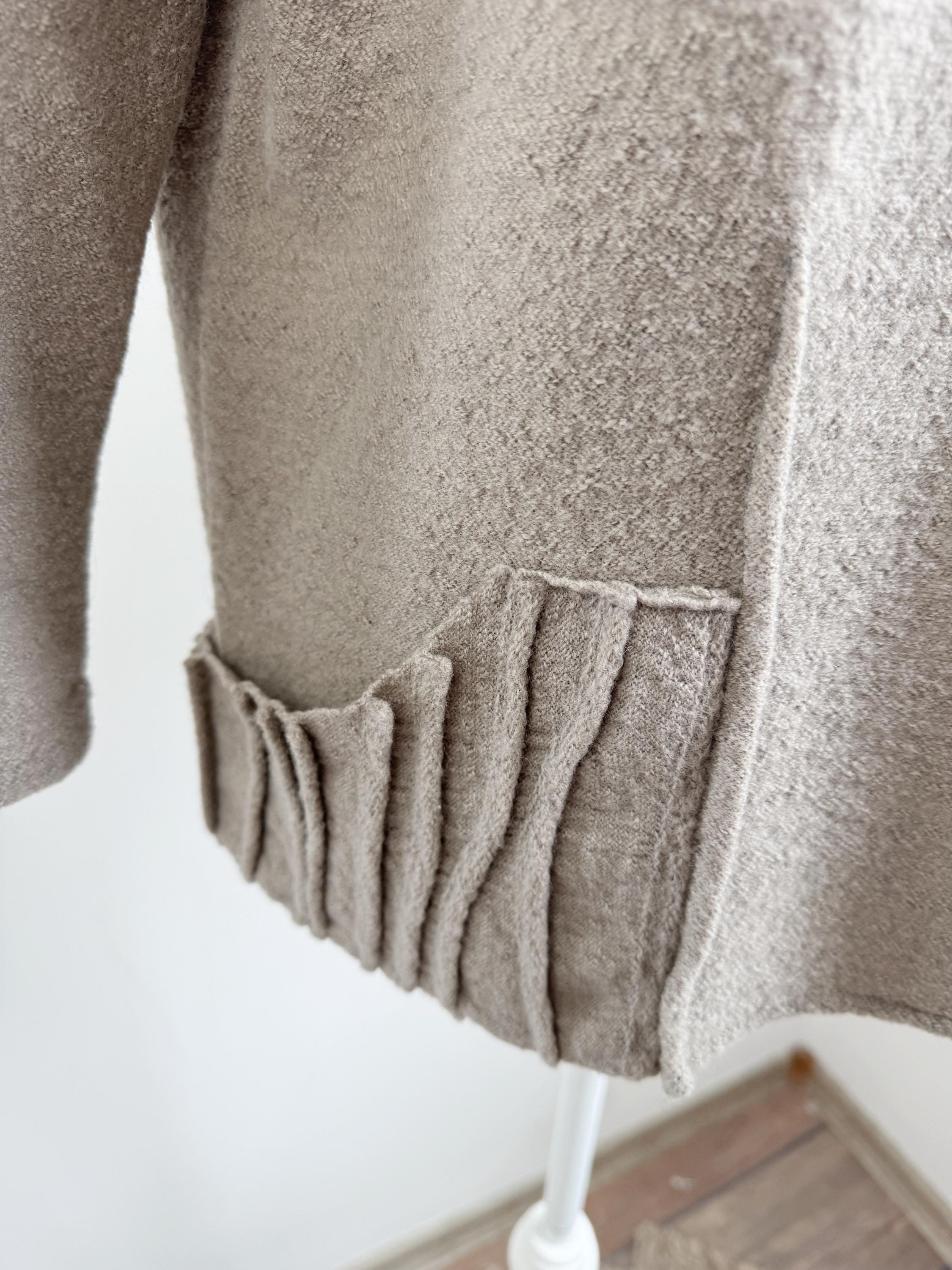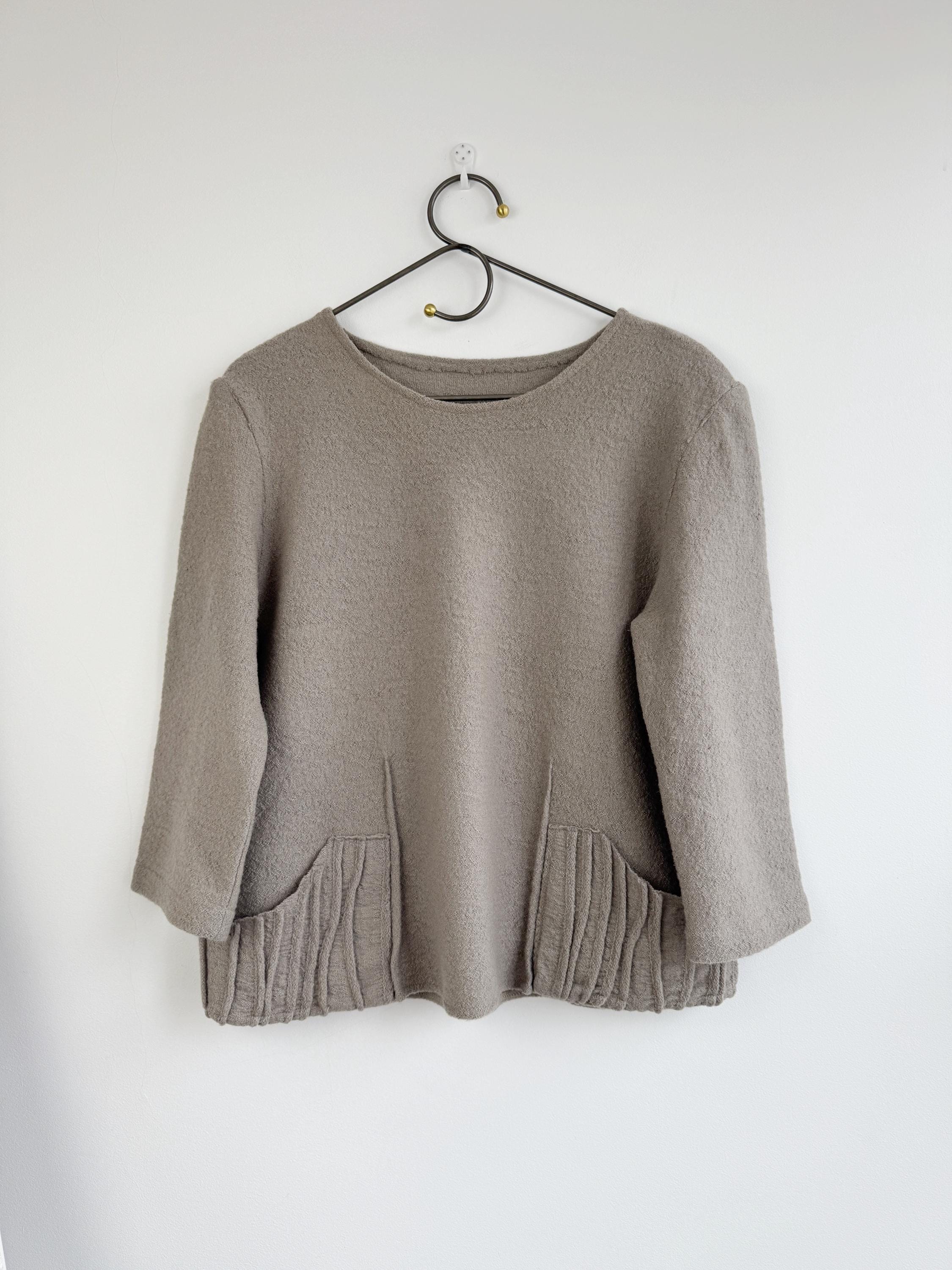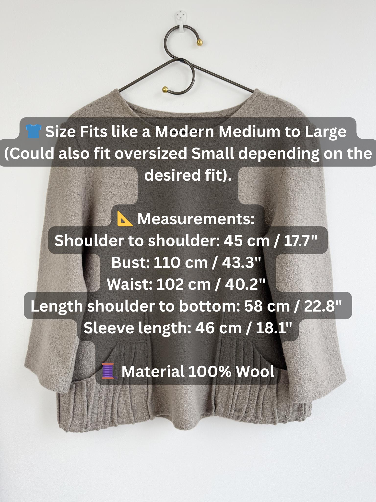Elevate your sustainable wardrobe with this sophisticated vintage 100% boiled wool sweater top in taupe color, scoop neck and 3/4 length sleeves. Crafted from a soft, boiled wool fabric in a versatile taupe/mushroom shade, this boxy wool sweater perfectly balances minimalist design with unique architectural details. The standout features are the structured, accordion-pleated front pockets and the subtle vertical seams that create a flattering, boxy silhouette.