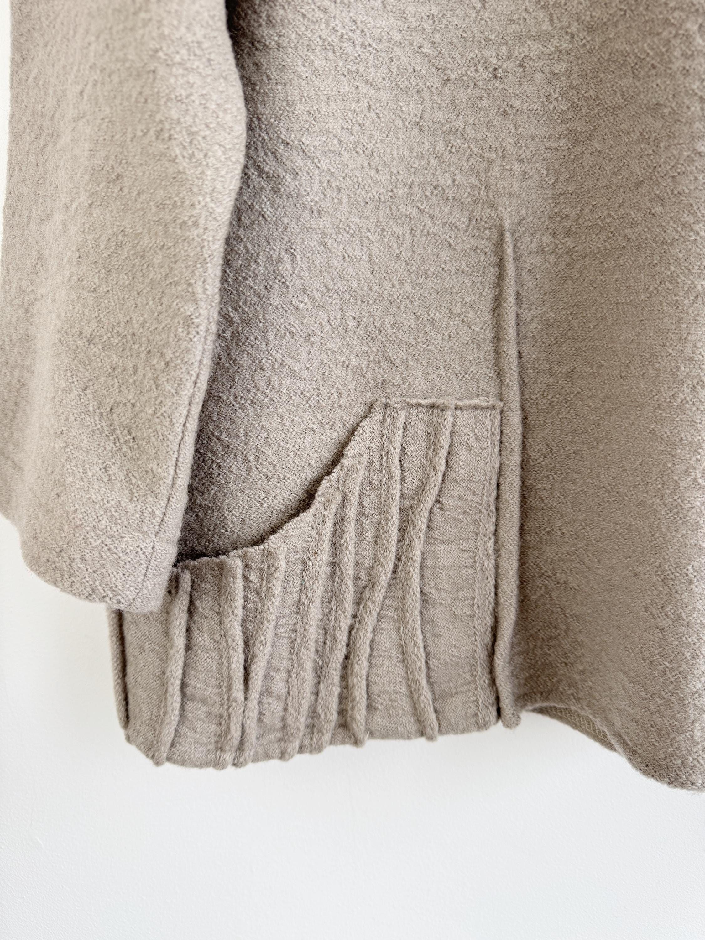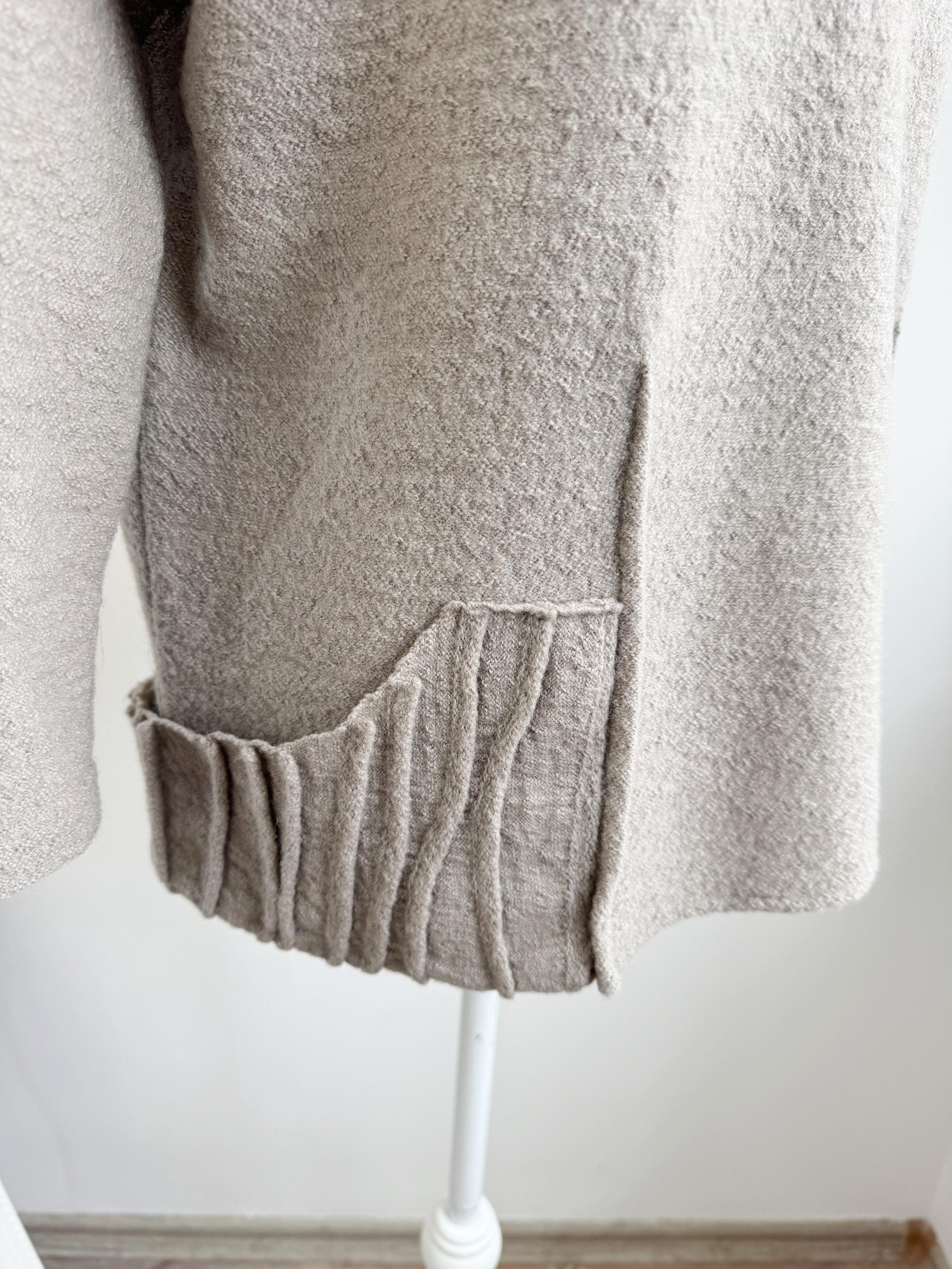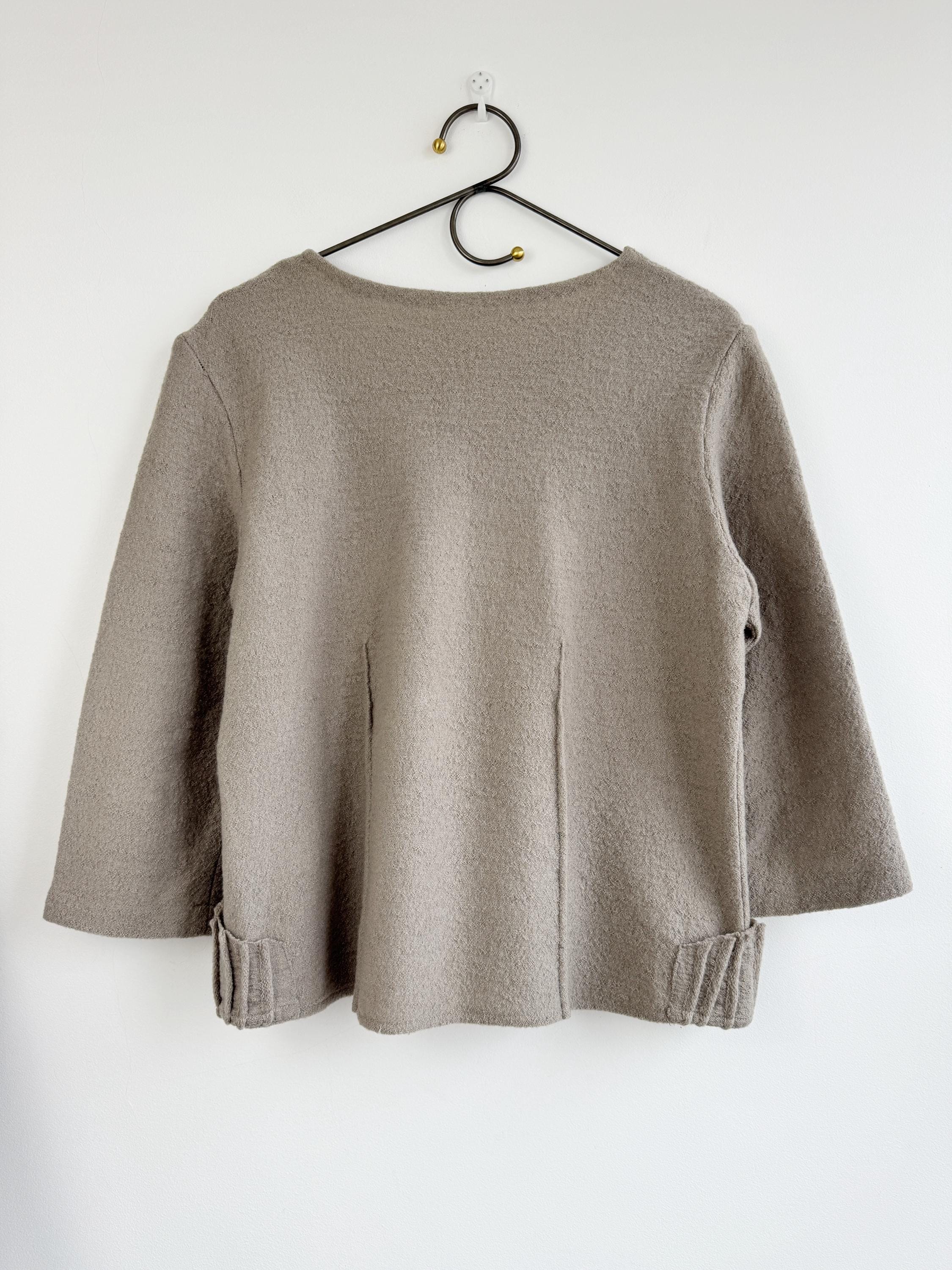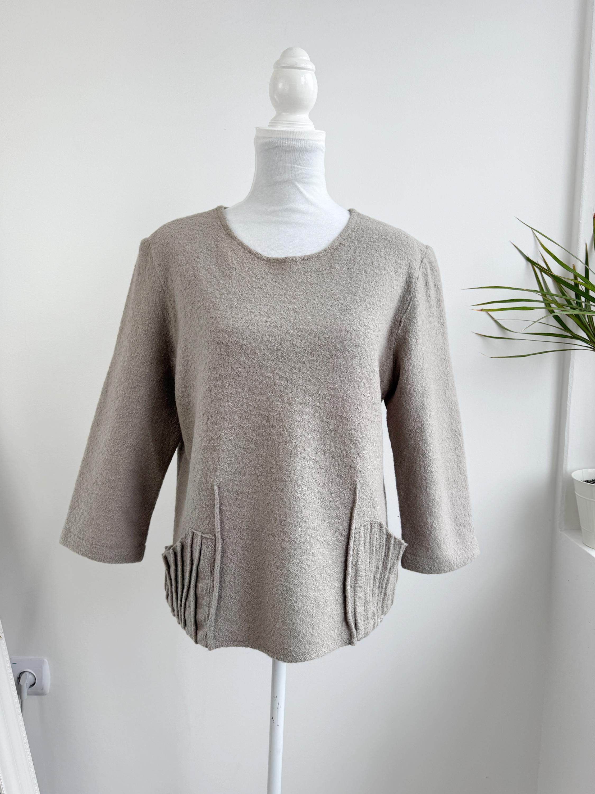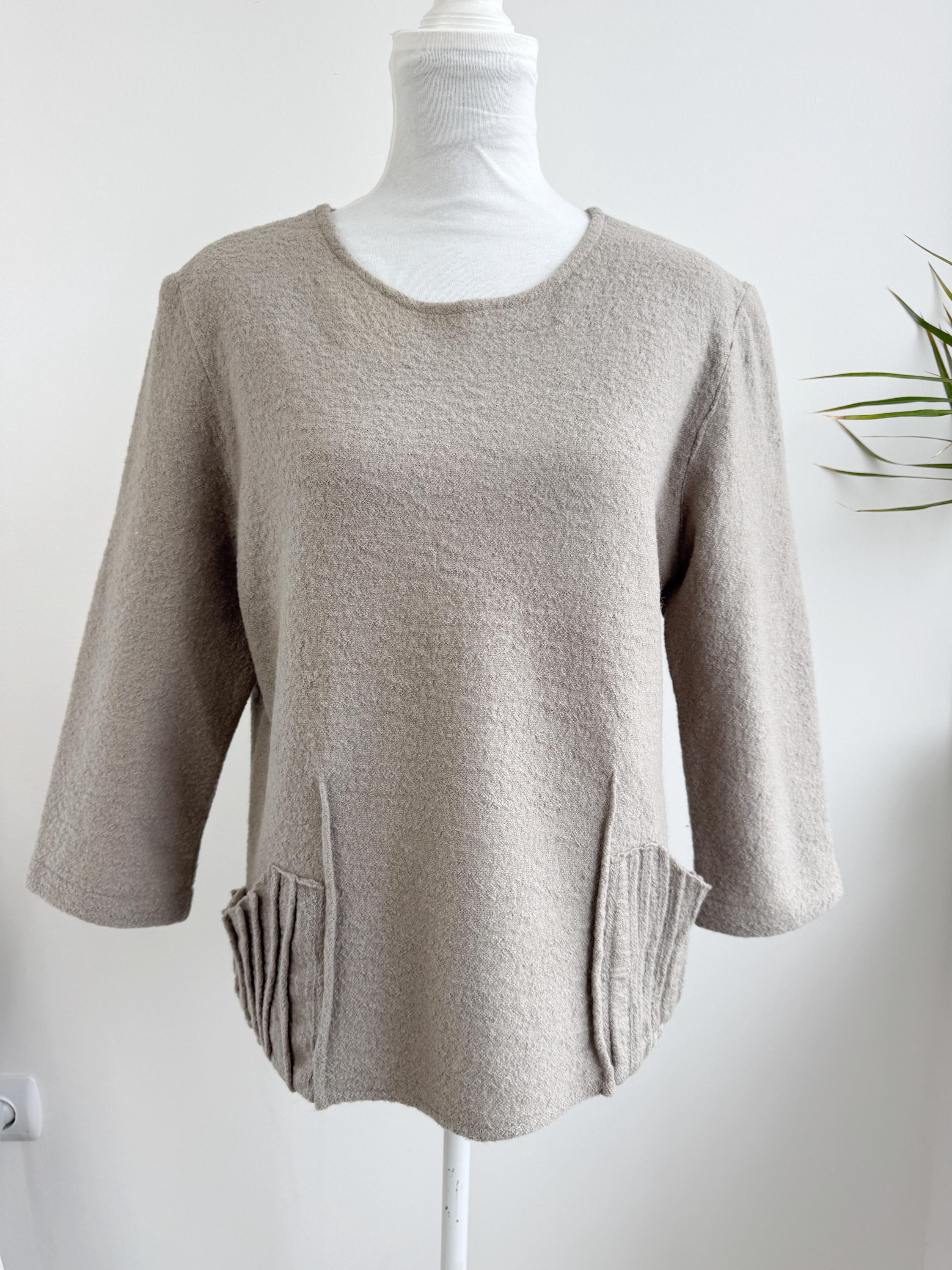 Elevate your sustainable wardrobe with this sophisticated vintage 100% boiled wool sweater top in taupe color, scoop neck and 3/4 length sleeves. Crafted from a soft, boiled wool fabric in a versatile taupe/mushroom shade, this boxy wool sweater perfectly balances minimalist design with unique architectural details. The standout features are the structured, accordion-pleated front pockets and the subtle vertical seams that create a flattering, boxy silhouette.