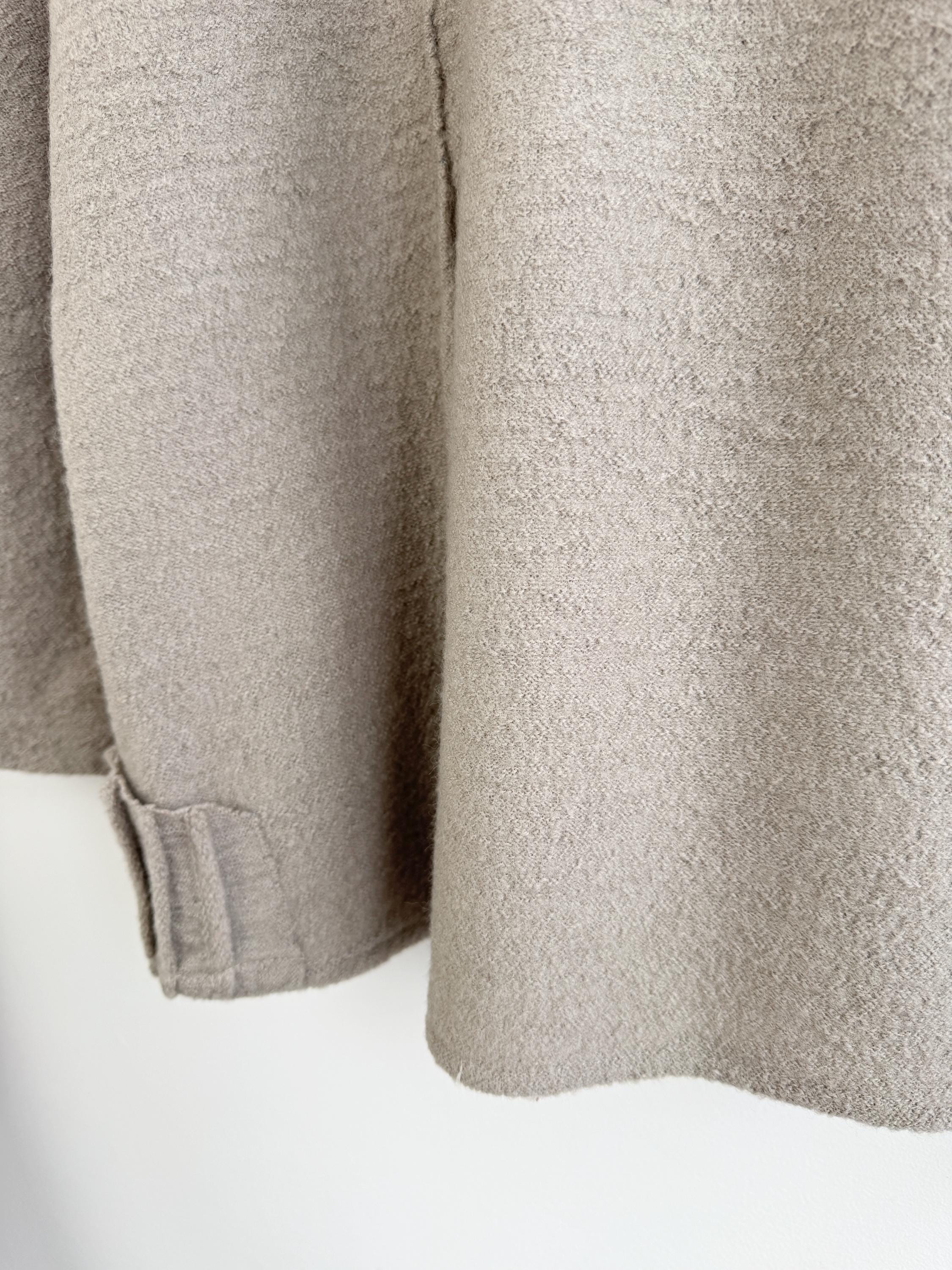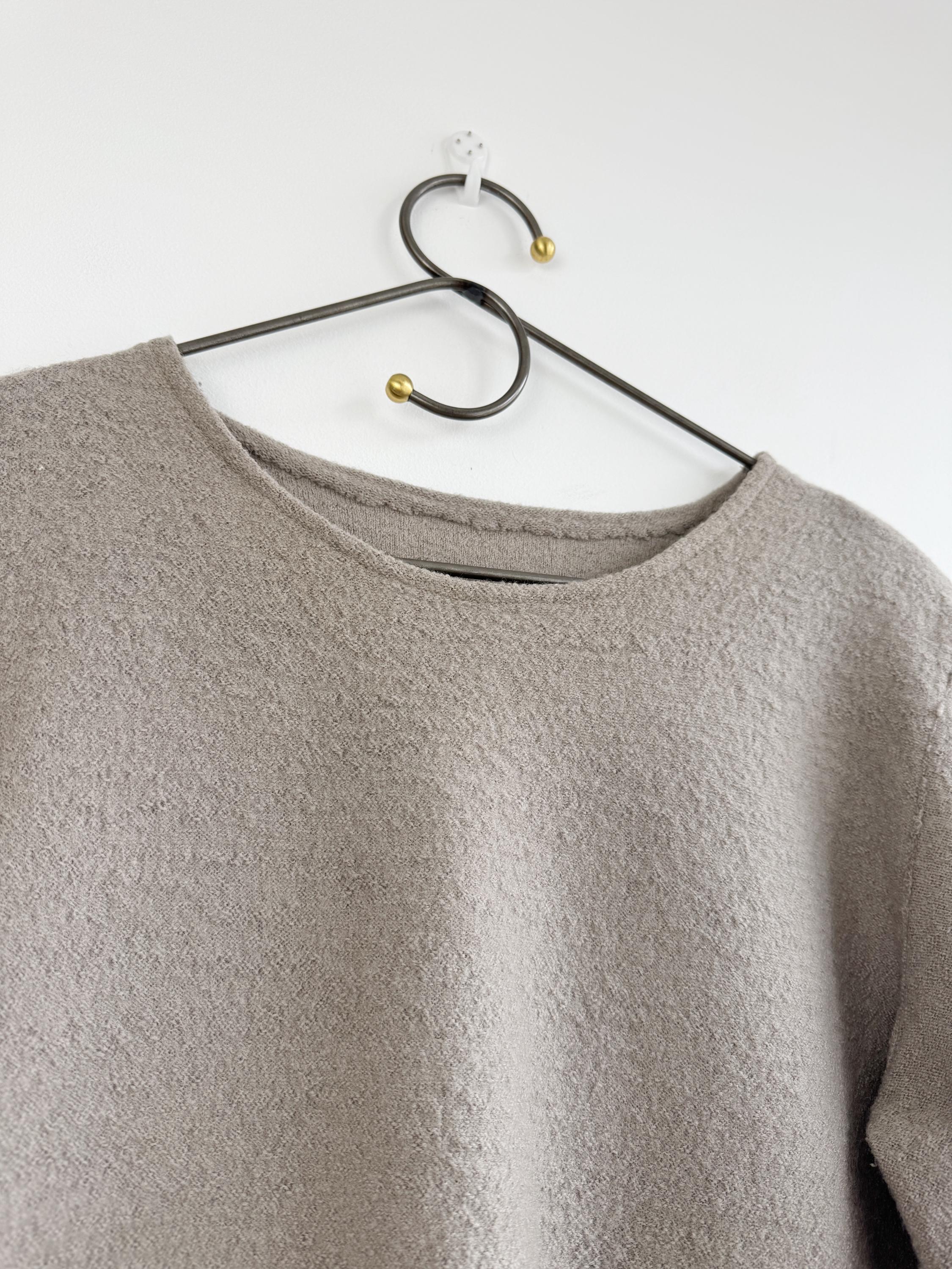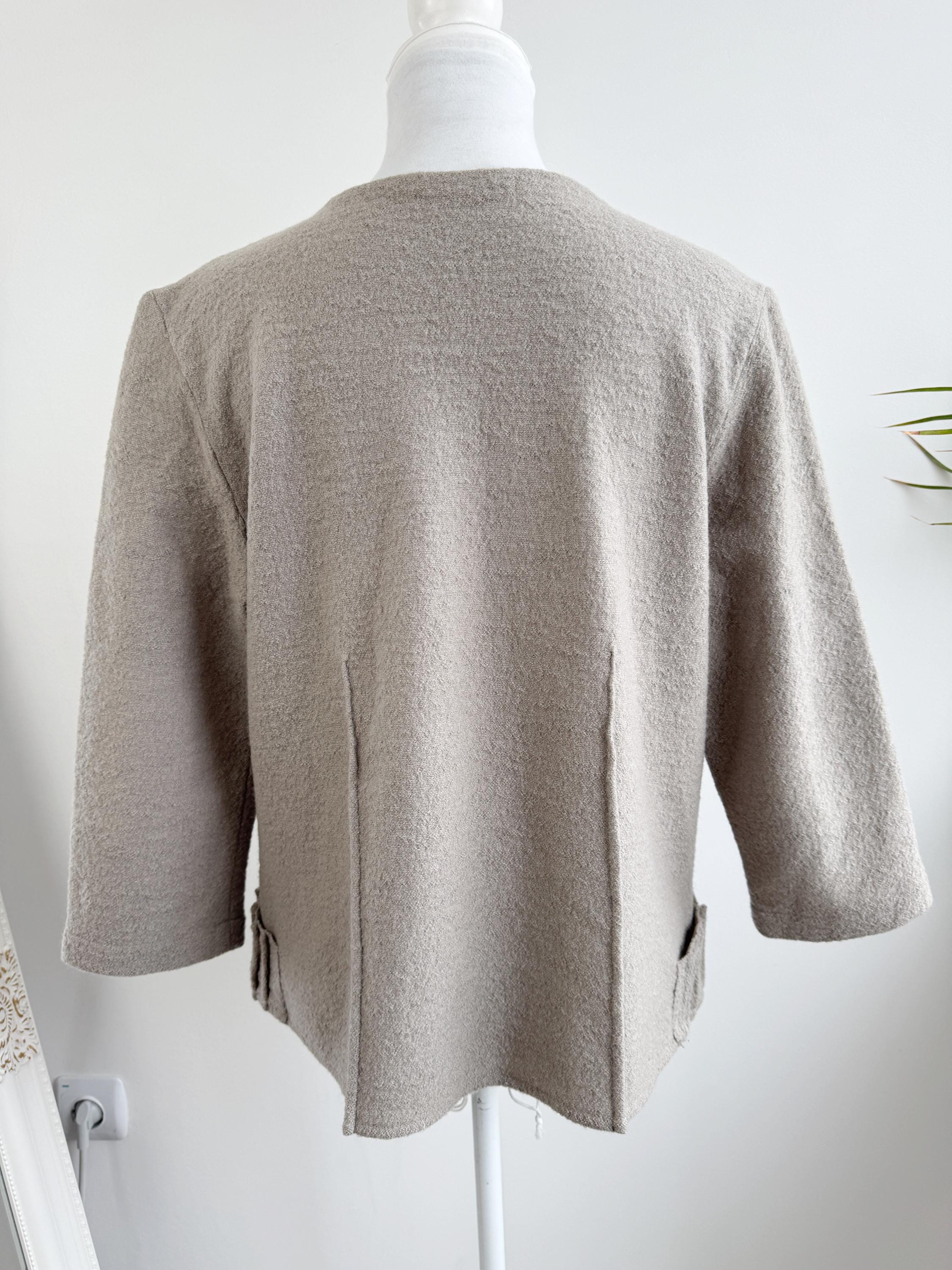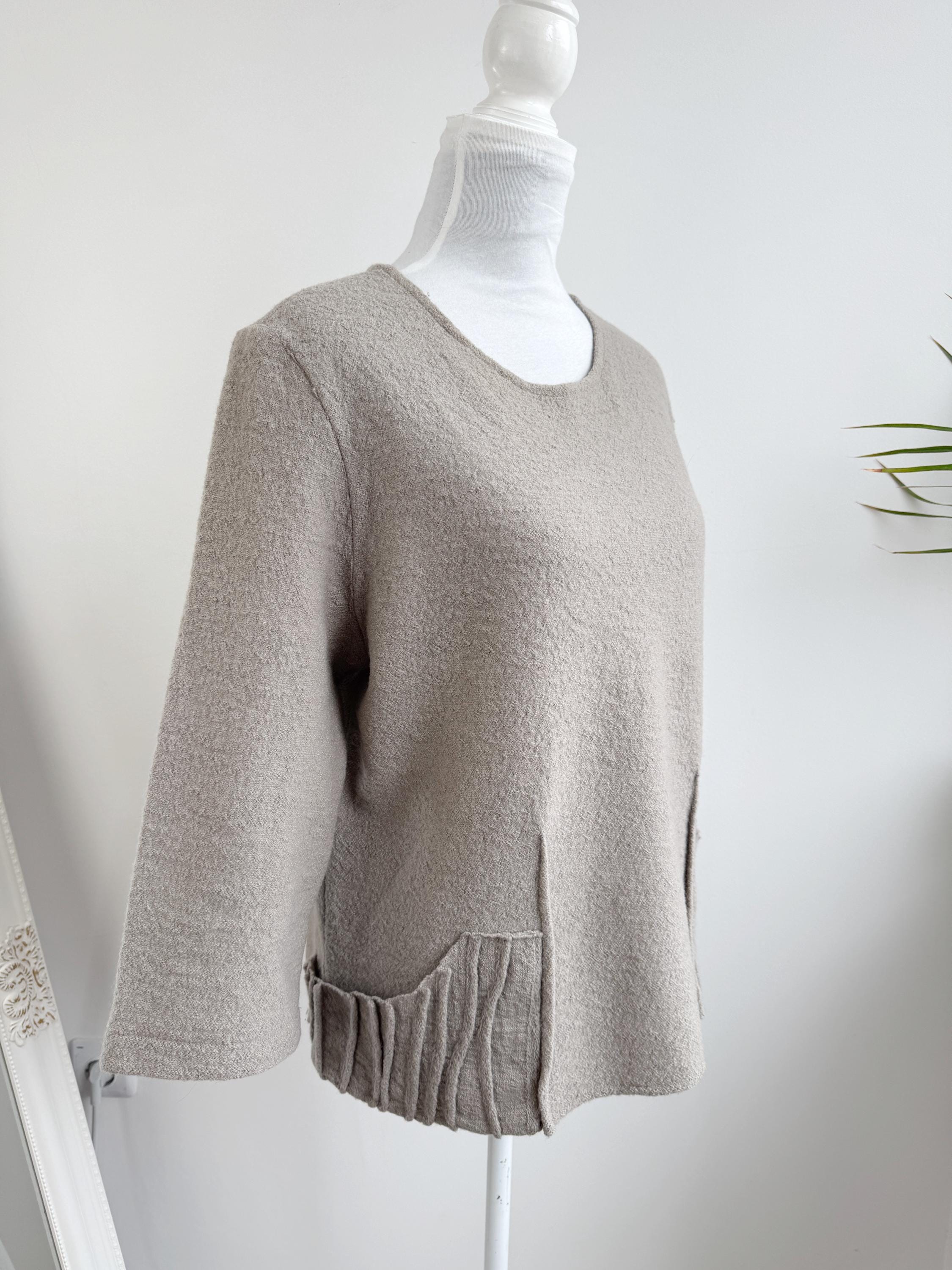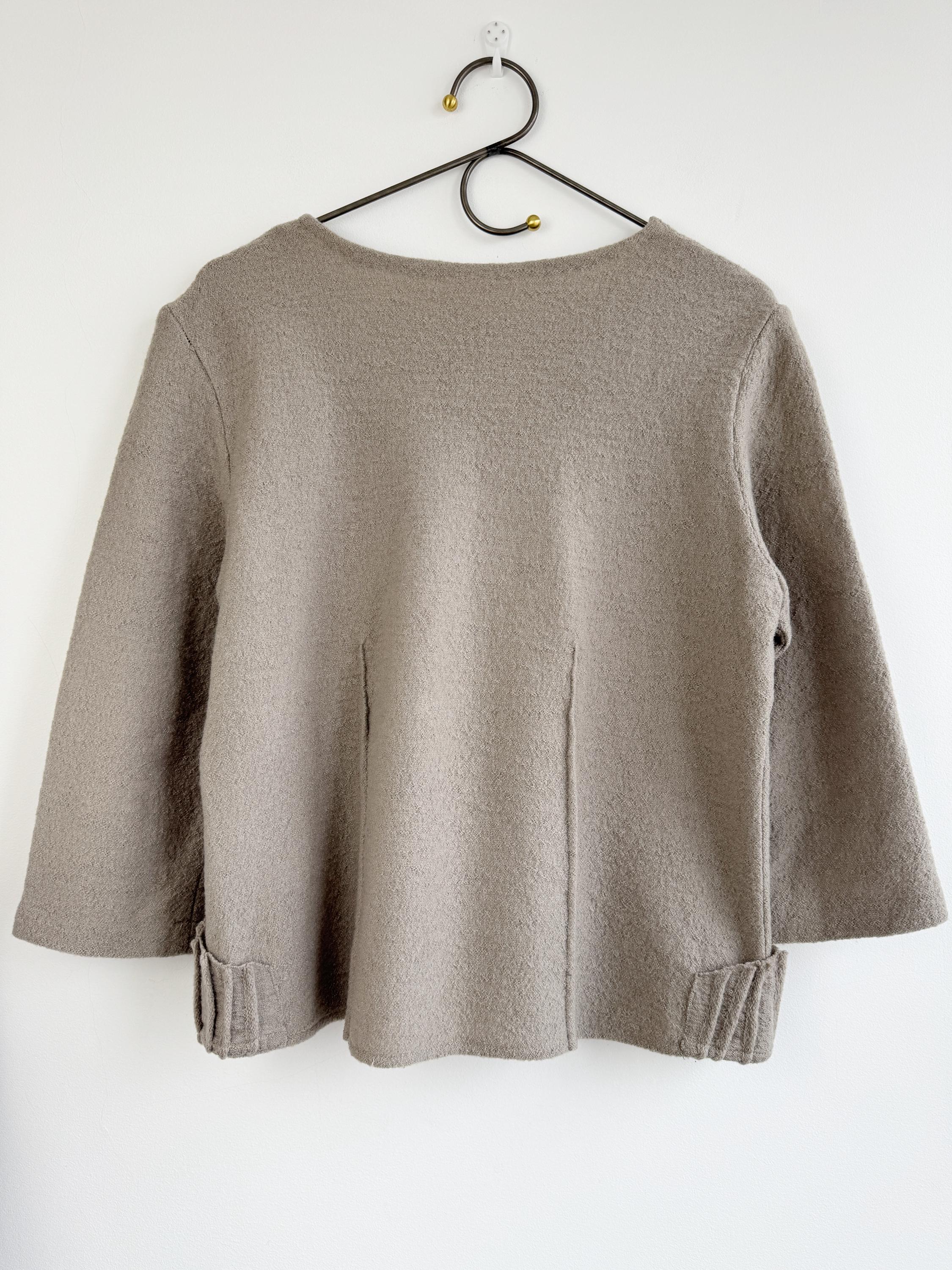 Elevate your sustainable wardrobe with this sophisticated vintage 100% boiled wool sweater top in taupe color, scoop neck and 3/4 length sleeves. Crafted from a soft, boiled wool fabric in a versatile taupe/mushroom shade, this boxy wool sweater perfectly balances minimalist design with unique architectural details. The standout features are the structured, accordion-pleated front pockets and the subtle vertical seams that create a flattering, boxy silhouette.