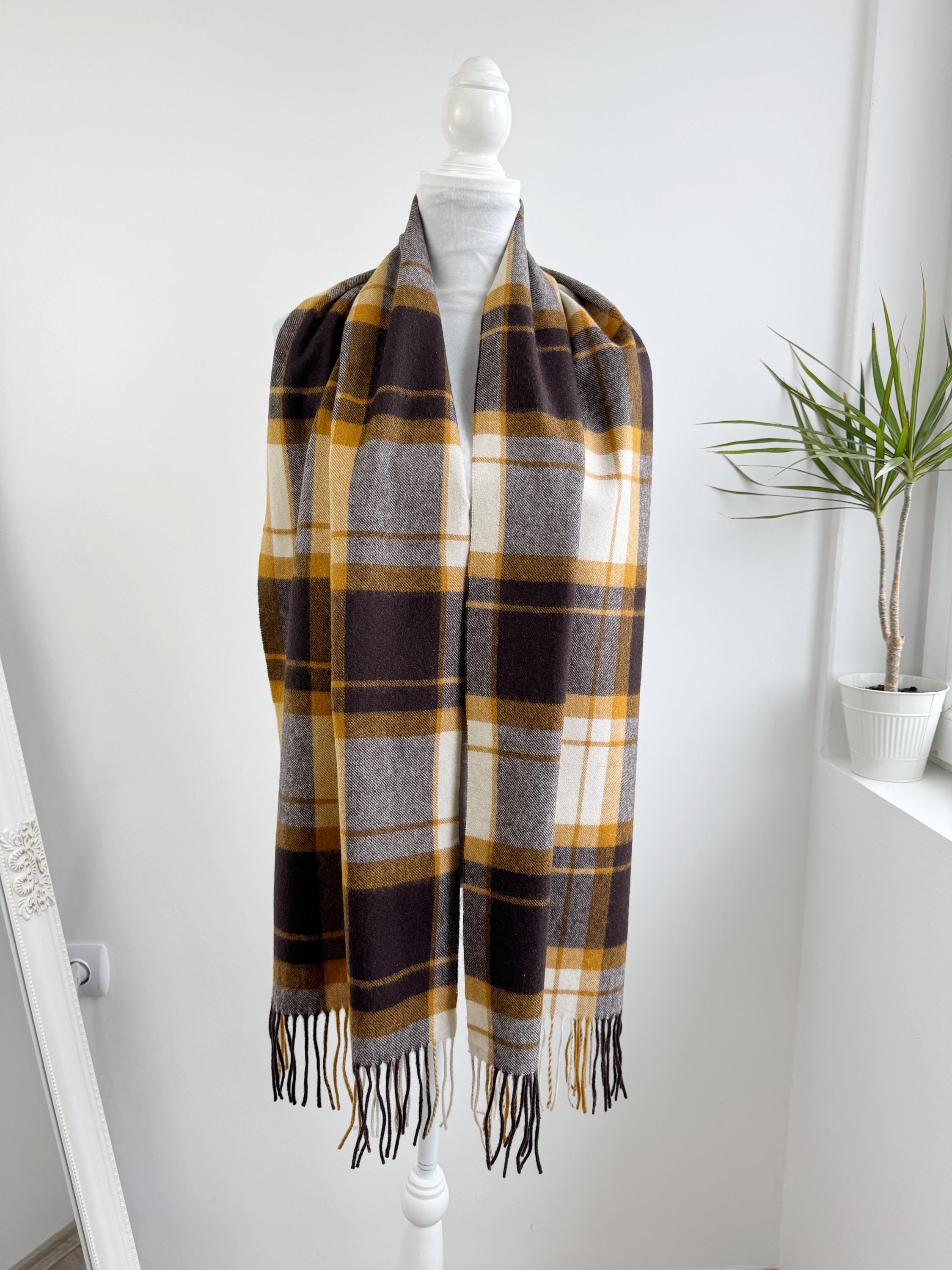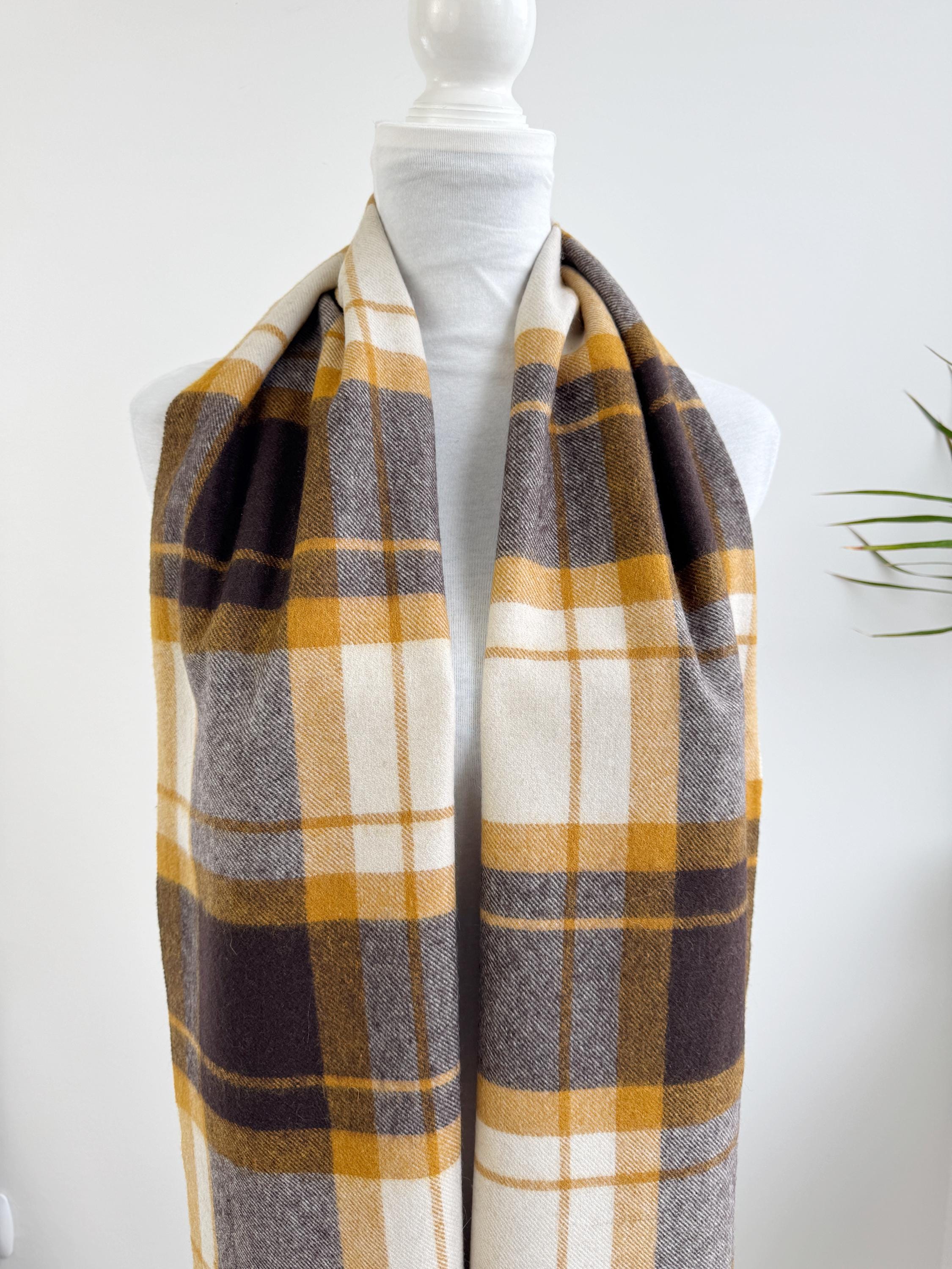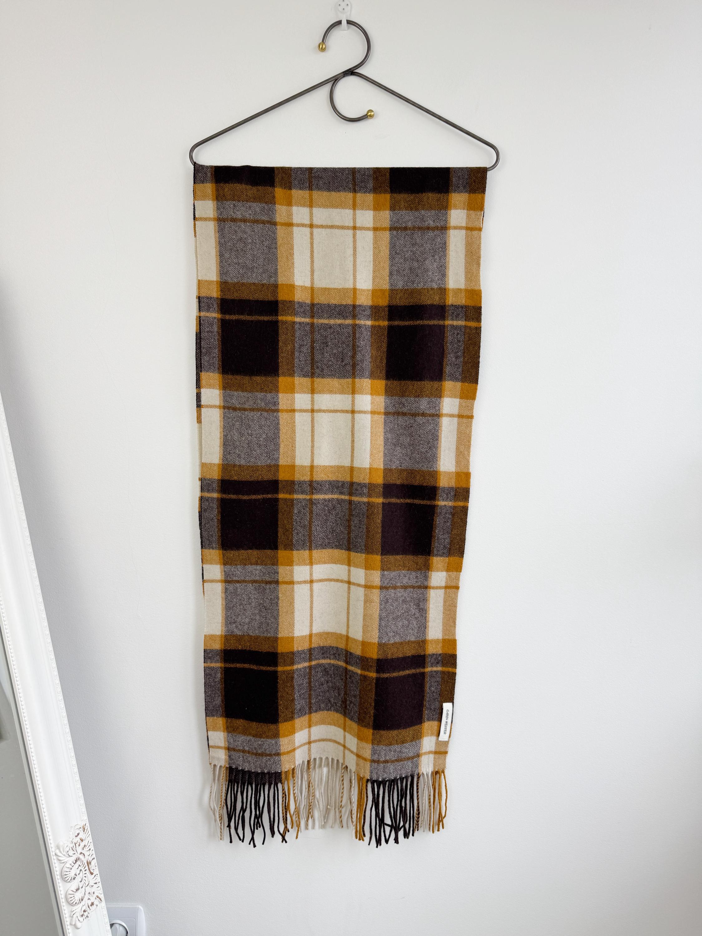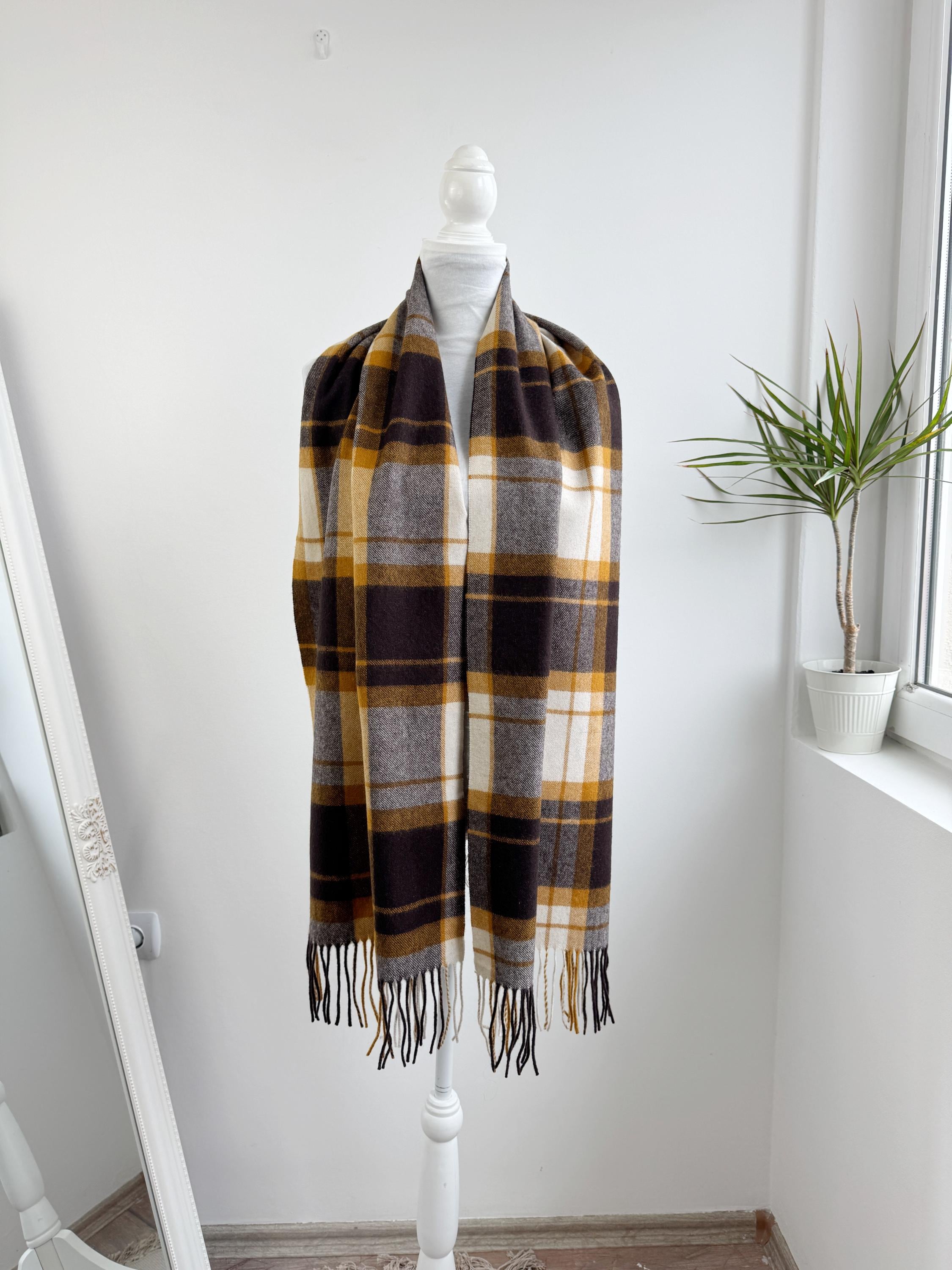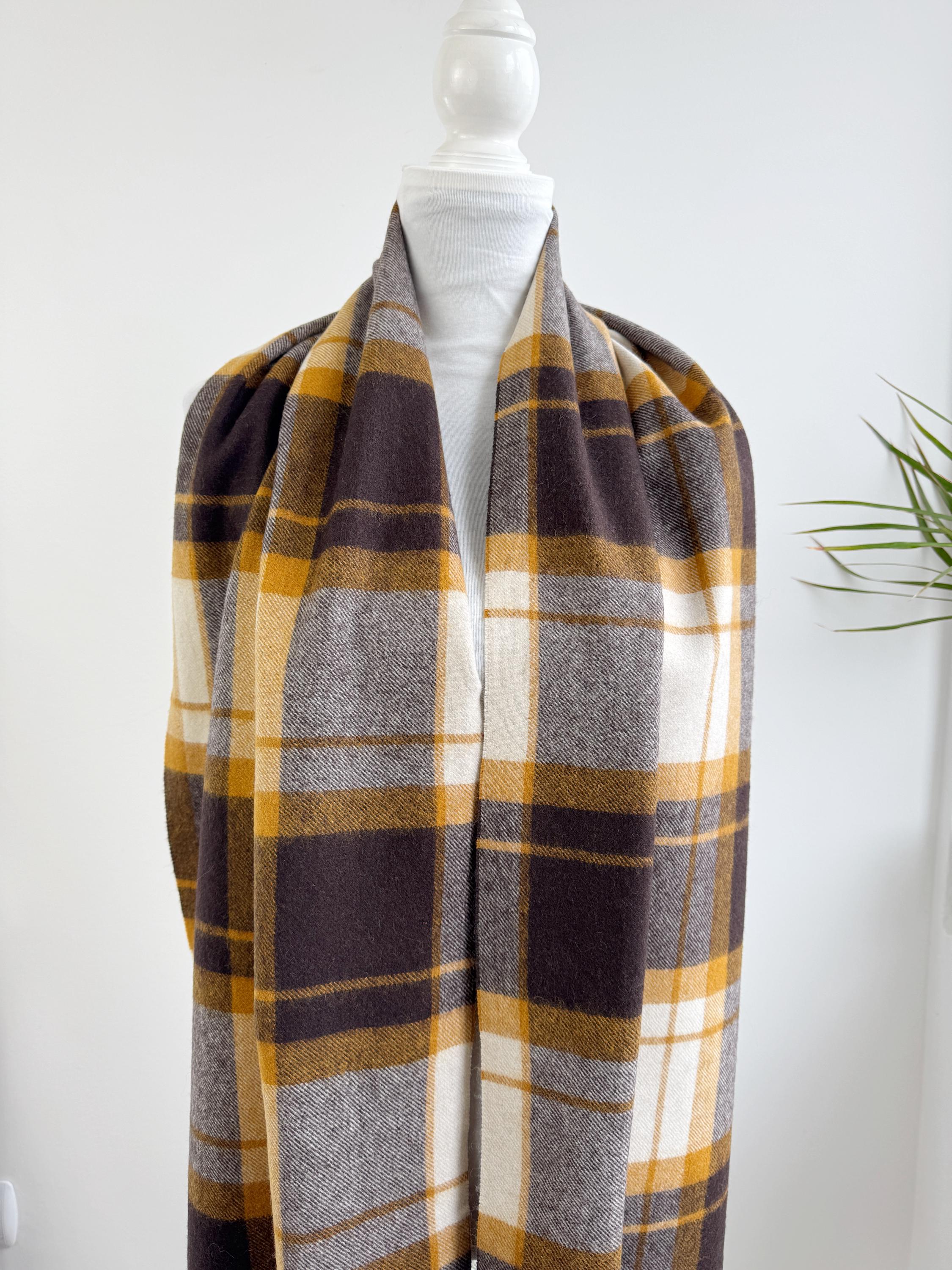 Wrap yourself in effortless Scandinavian style with this beautiful Carin Wester oversized plaid wool blend scarf. Featuring a sophisticated palette of mustard yellow, chocolate brown, and creamy off white, this large checkered shawl is the perfect statement piece for your autumn and winter wardrobe.