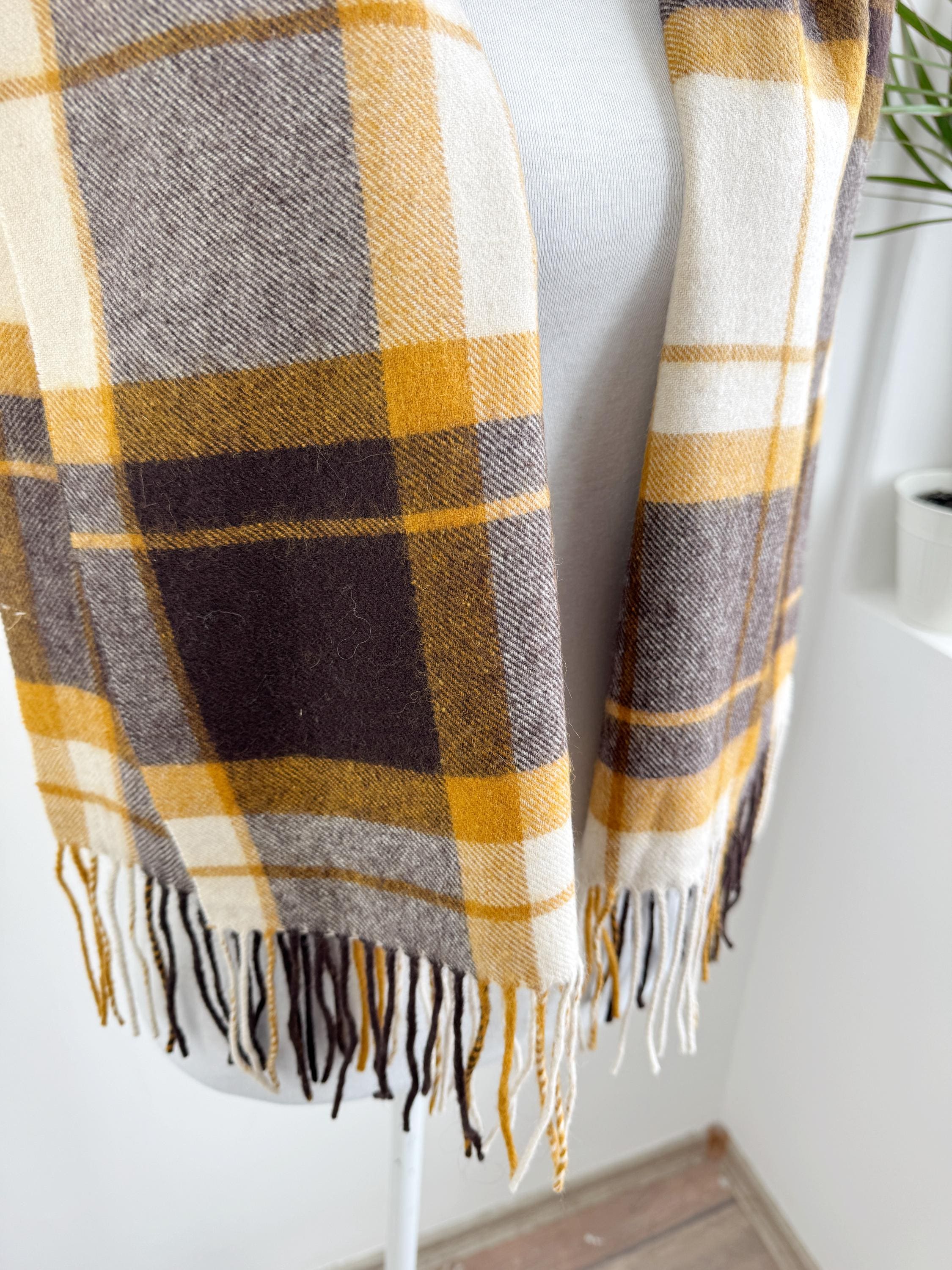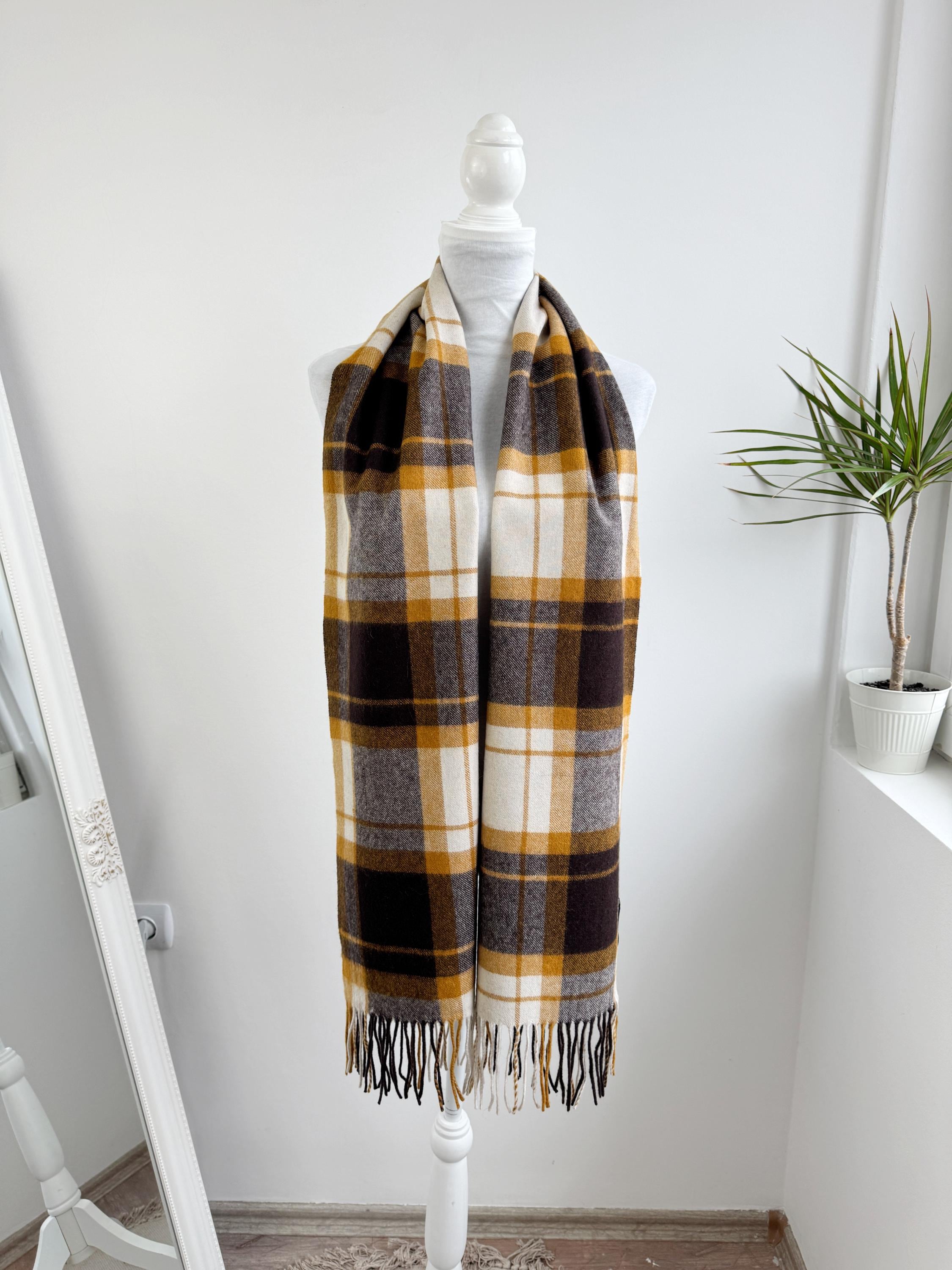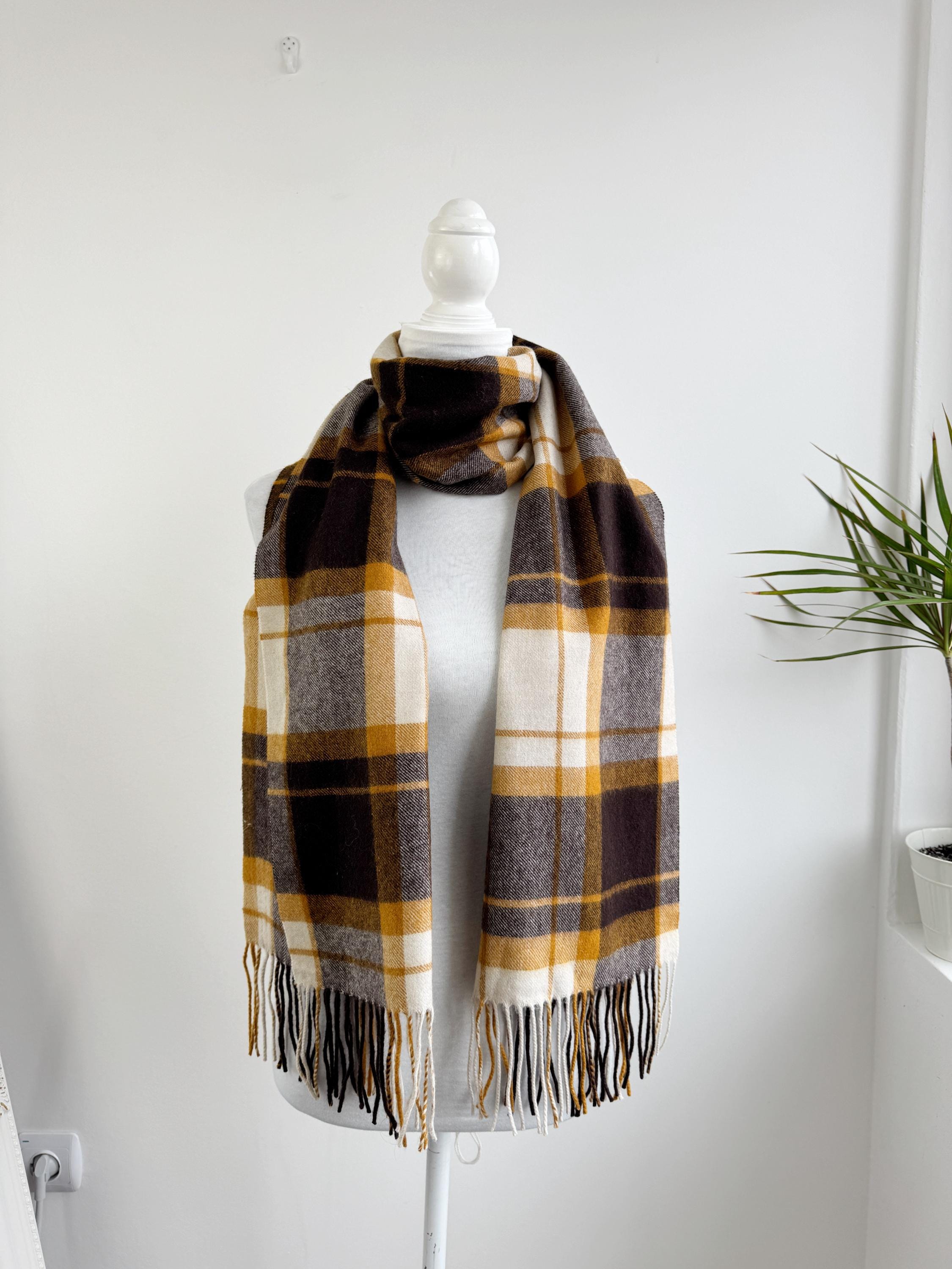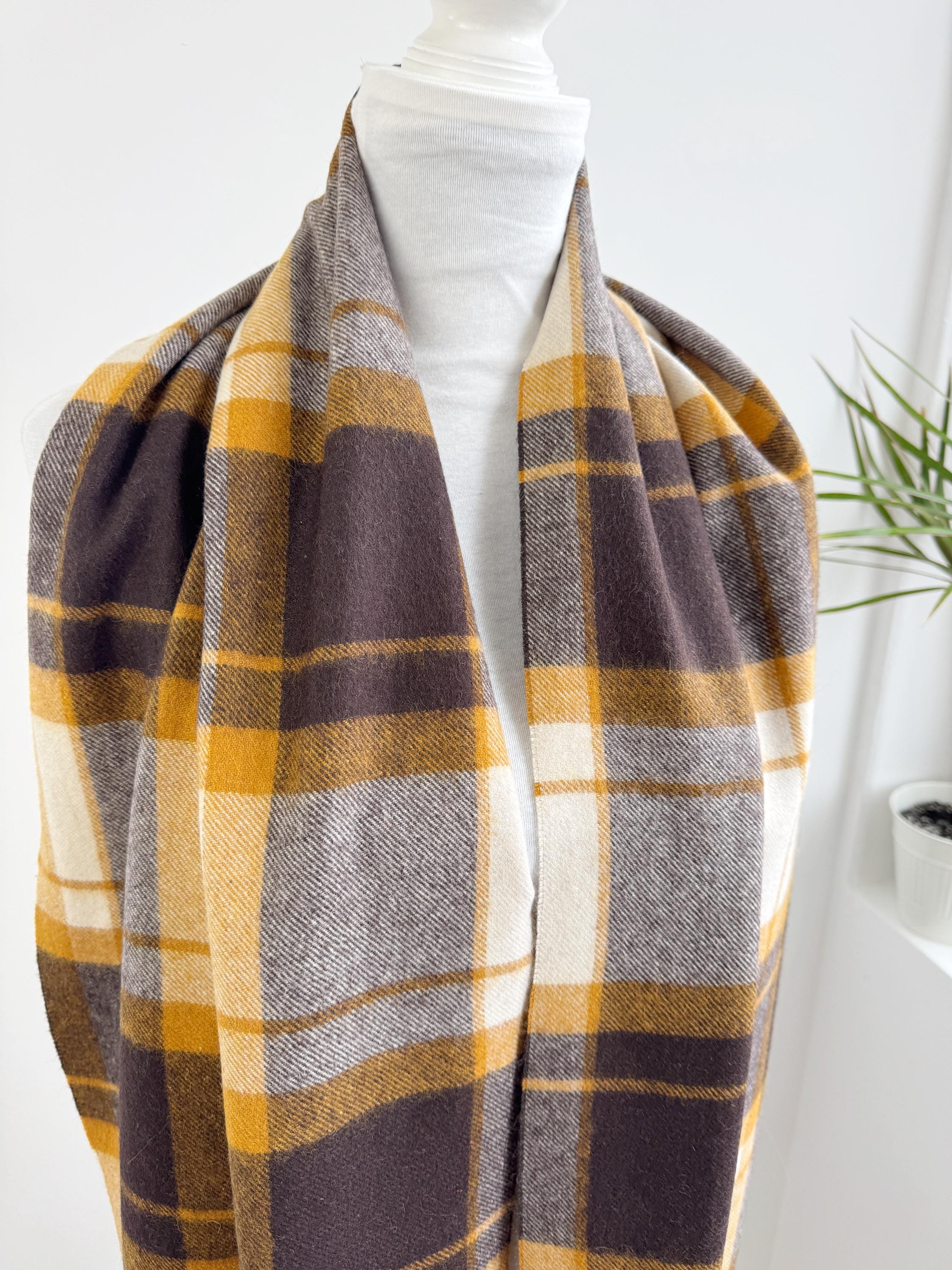 Wrap yourself in effortless Scandinavian style with this beautiful Carin Wester oversized plaid wool blend scarf. Featuring a sophisticated palette of mustard yellow, chocolate brown, and creamy off white, this large checkered shawl is the perfect statement piece for your autumn and winter wardrobe.