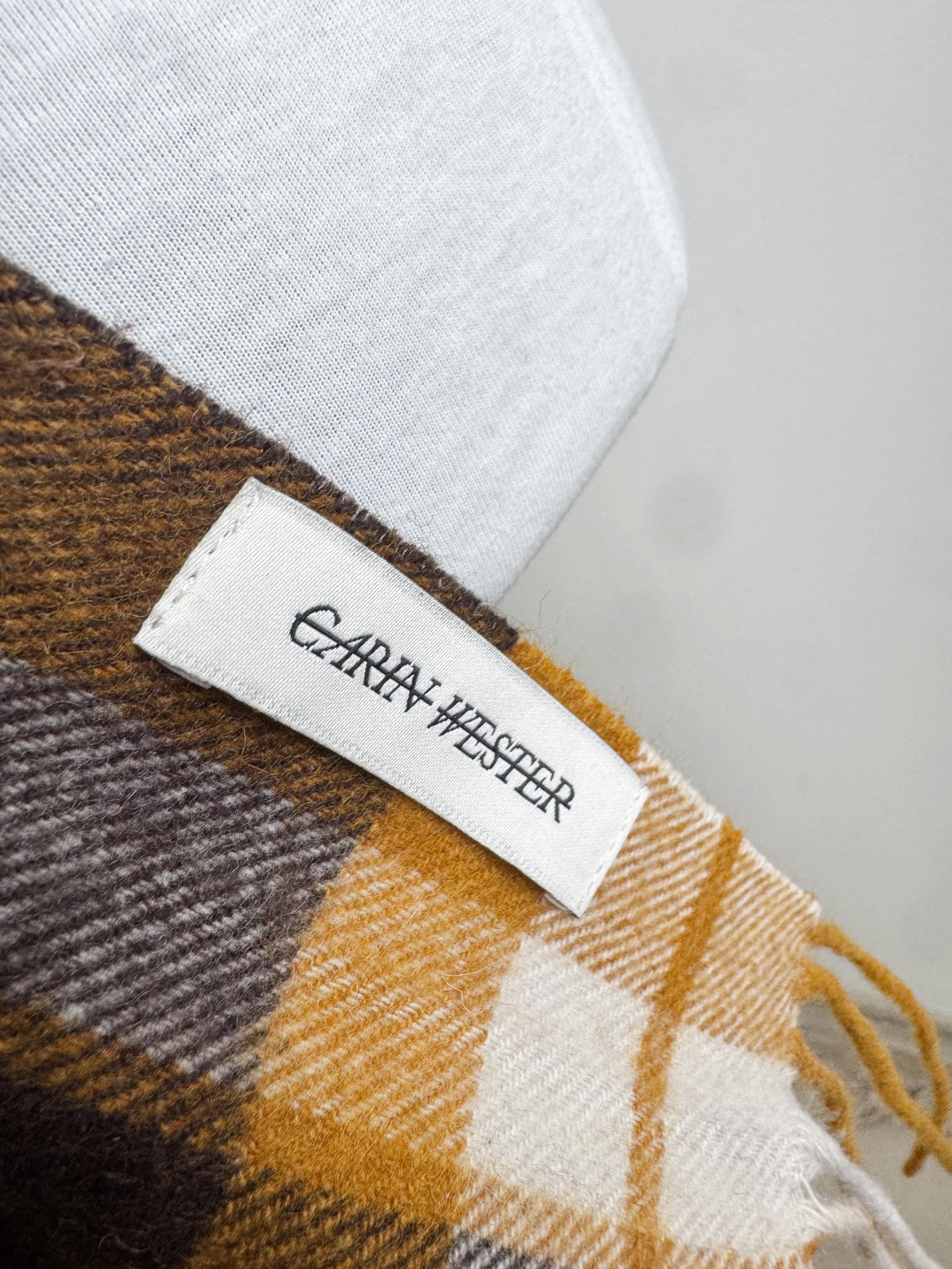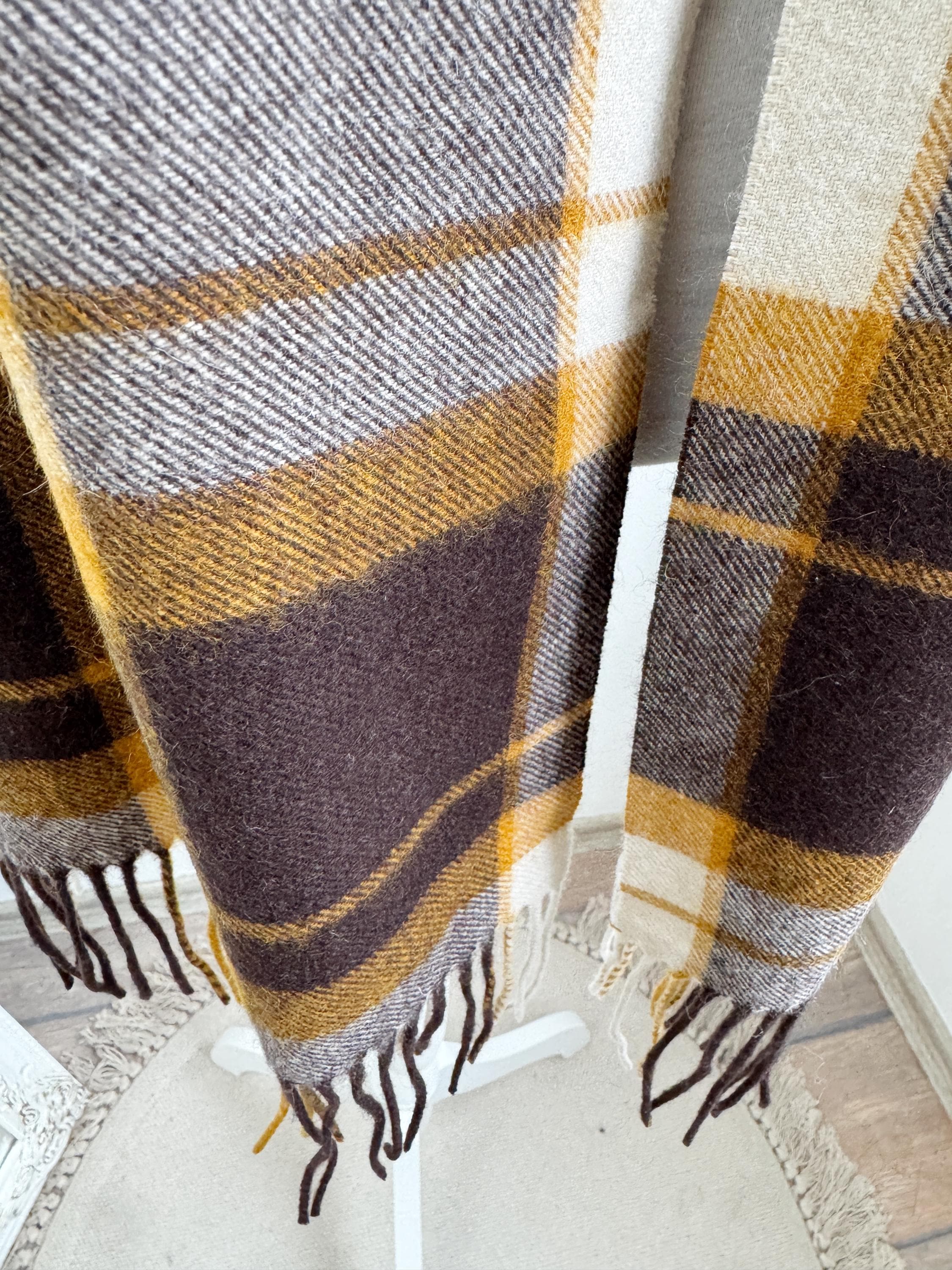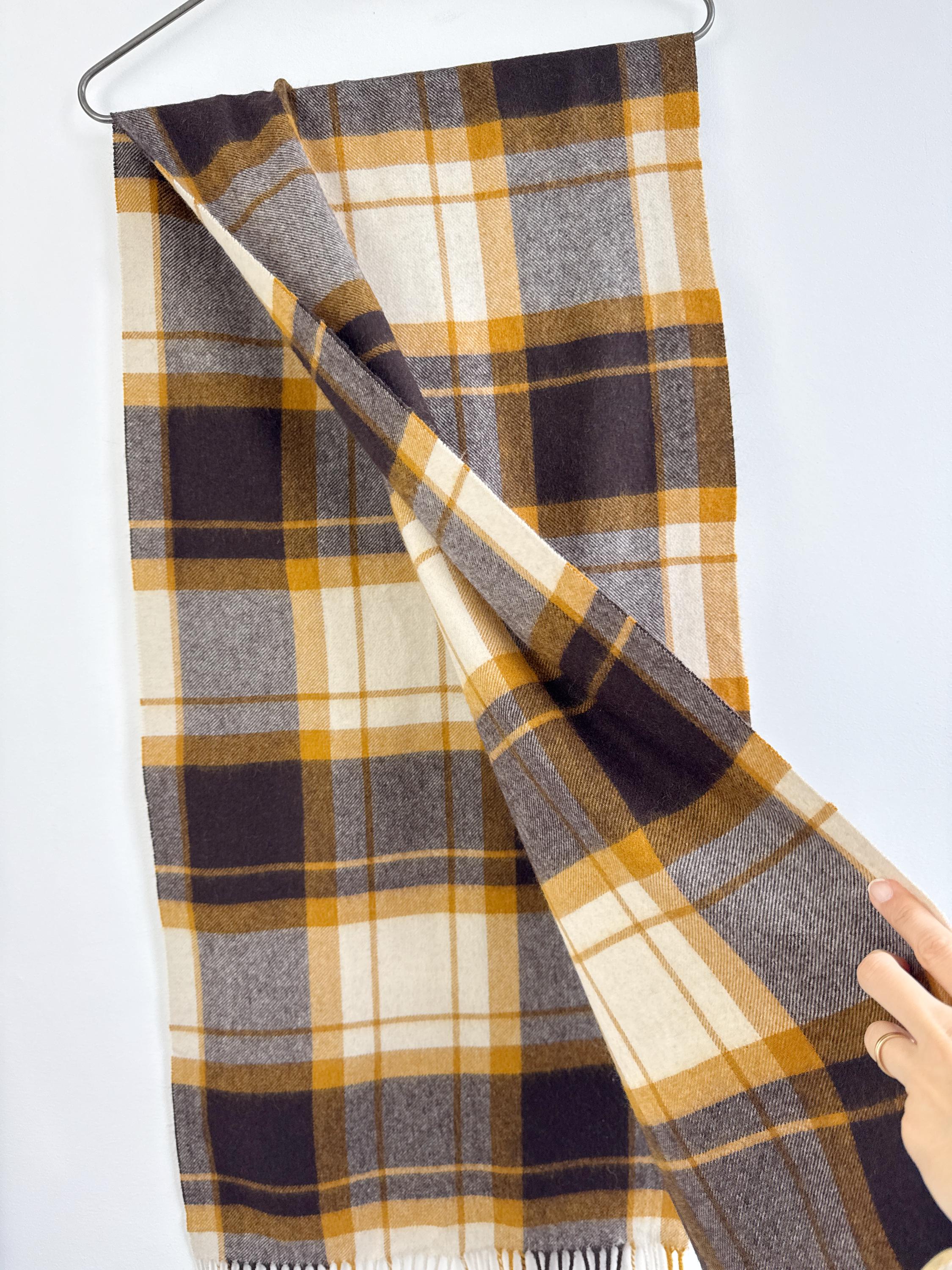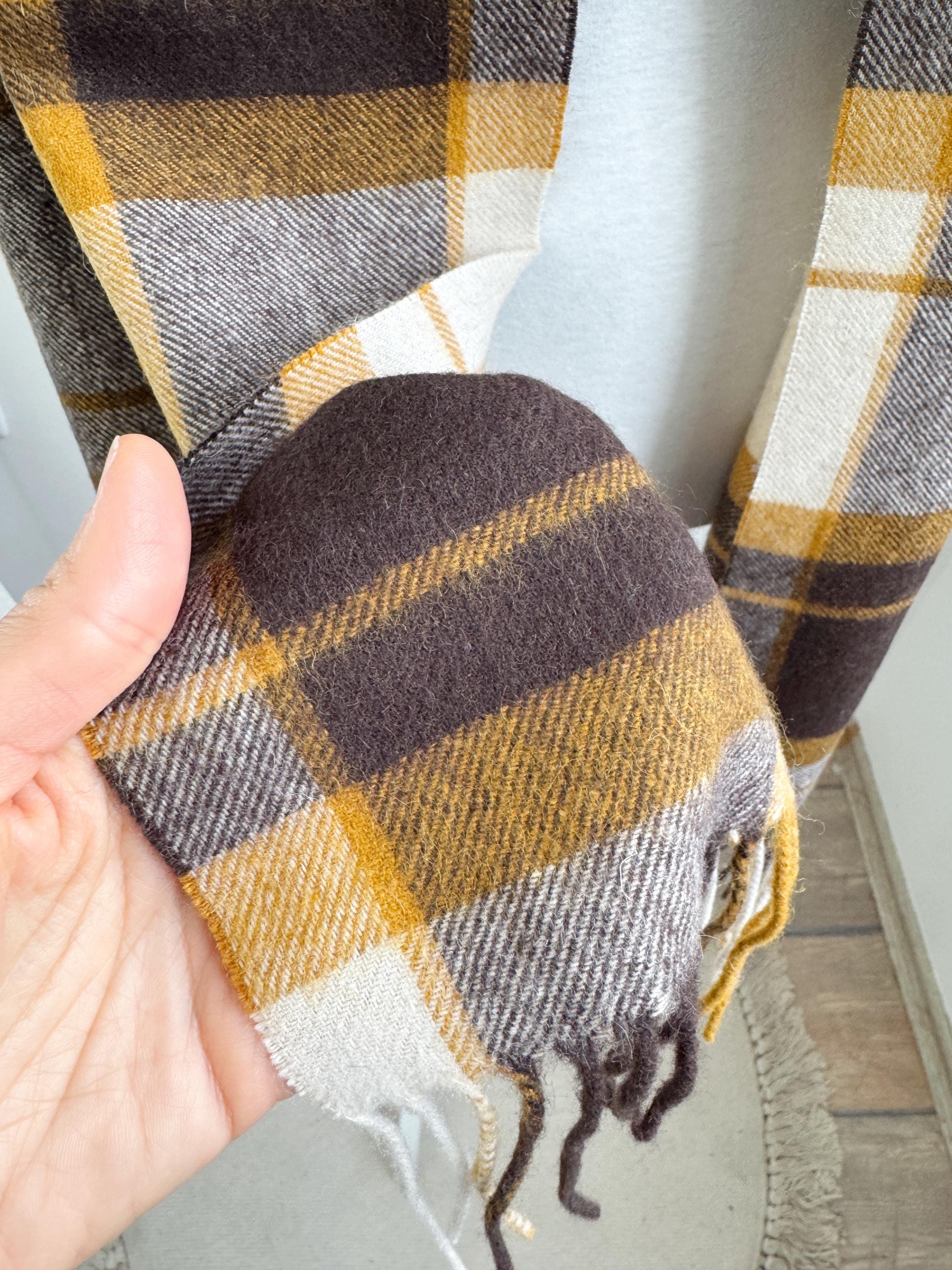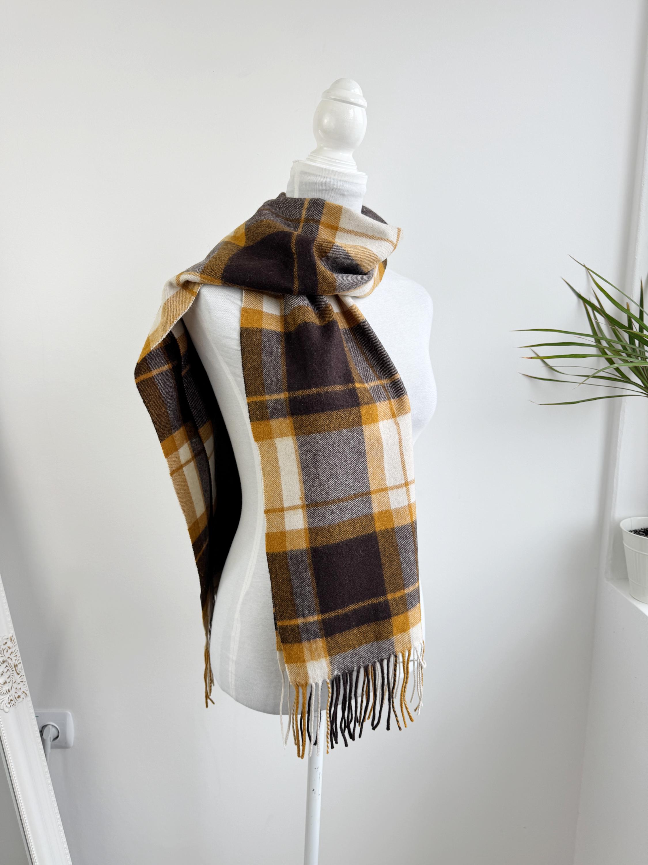 Wrap yourself in effortless Scandinavian style with this beautiful Carin Wester oversized plaid wool blend scarf. Featuring a sophisticated palette of mustard yellow, chocolate brown, and creamy off white, this large checkered shawl is the perfect statement piece for your autumn and winter wardrobe.