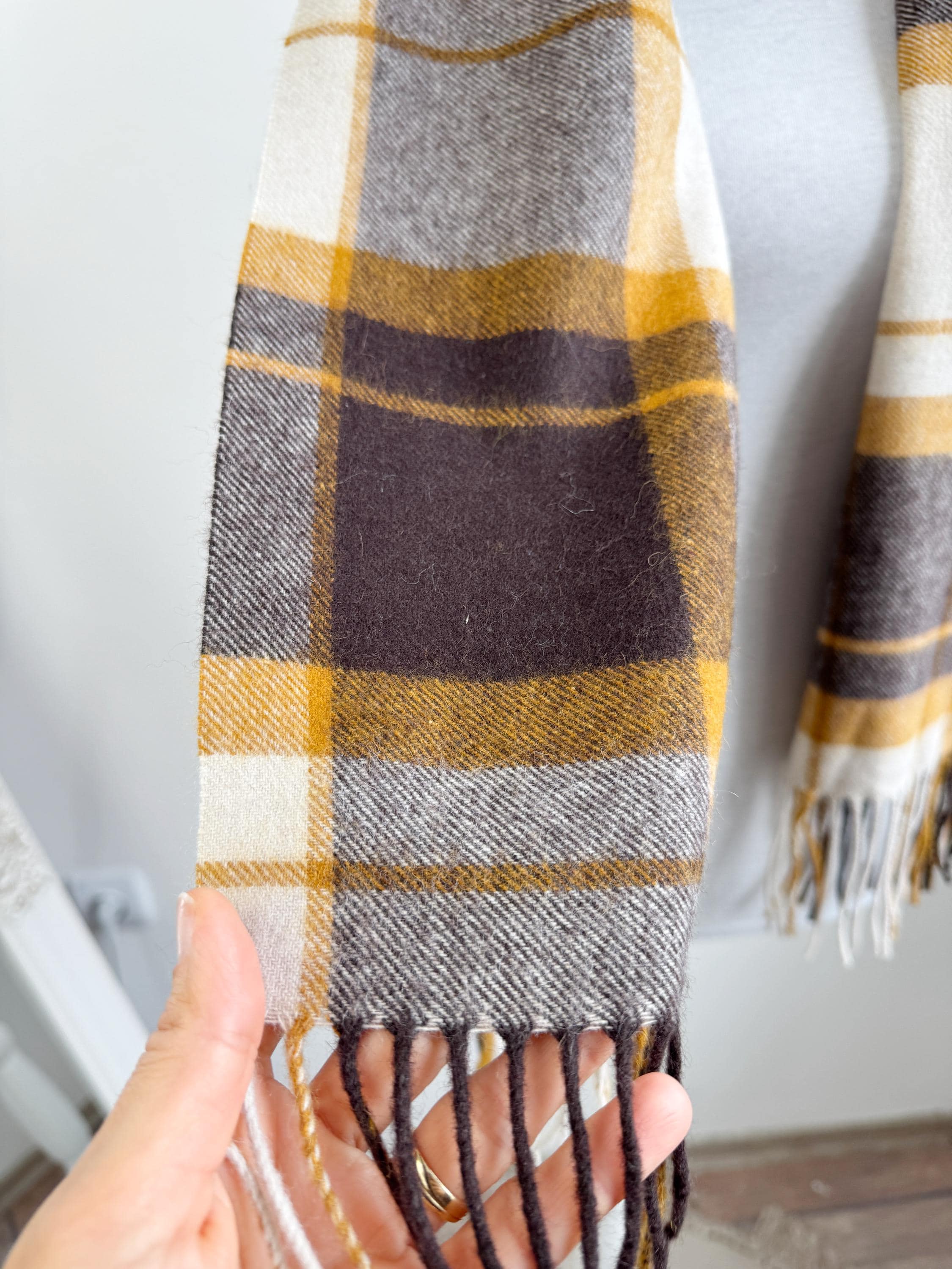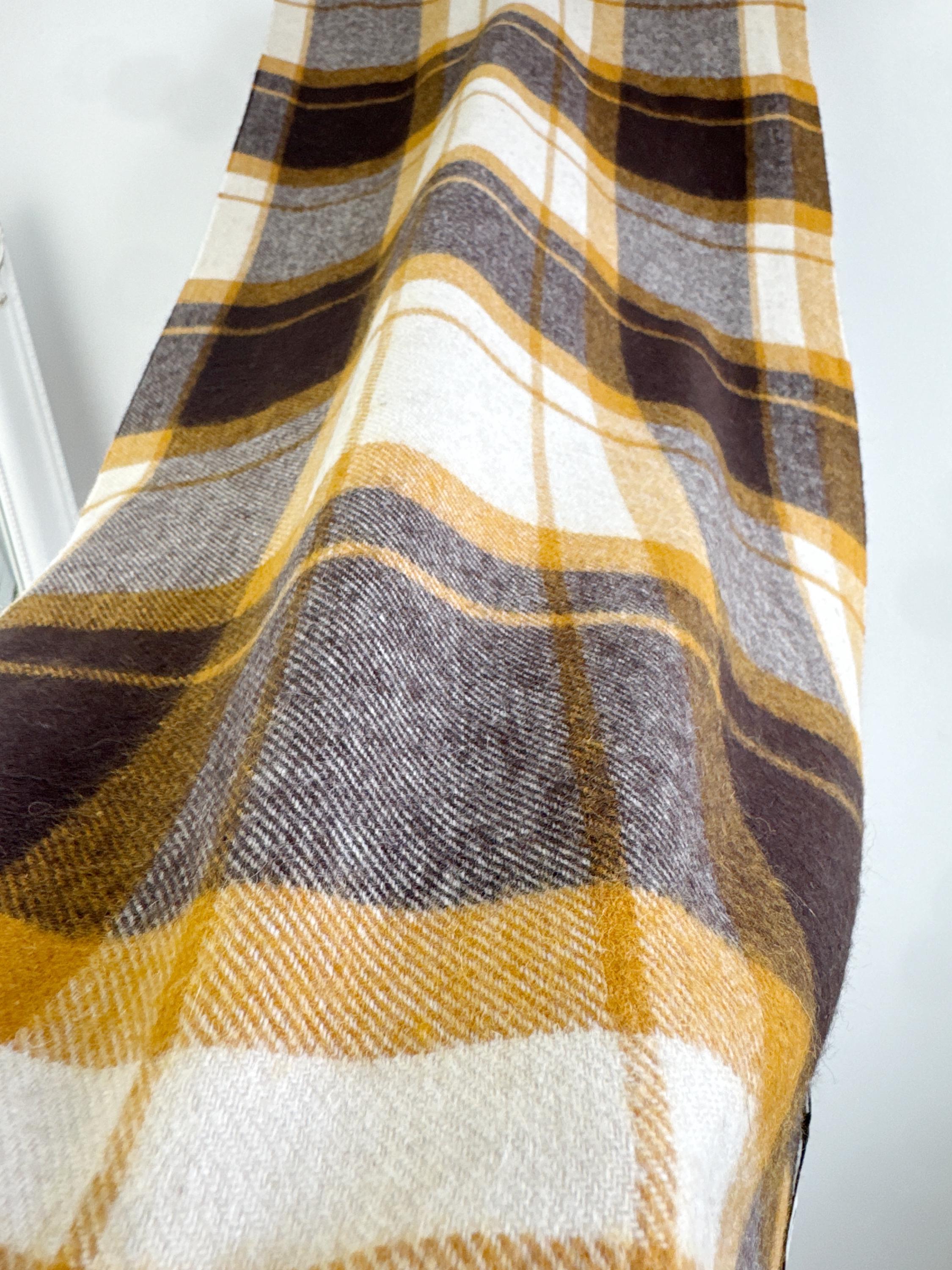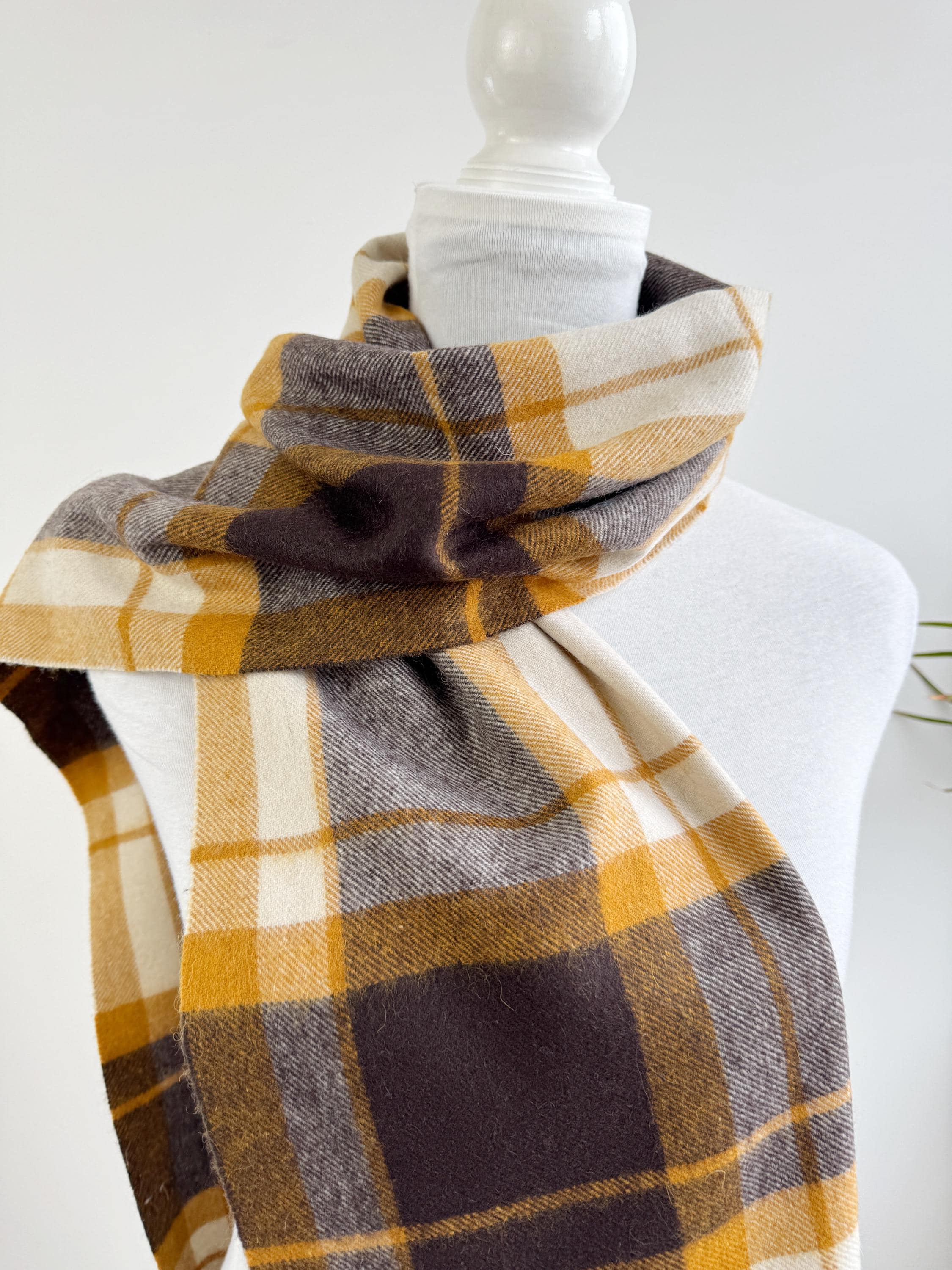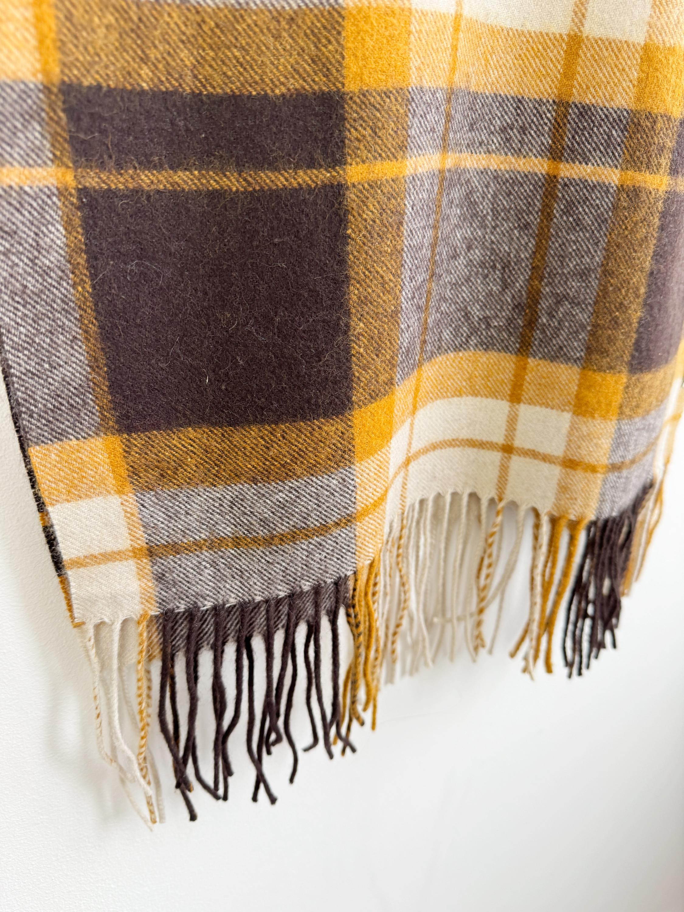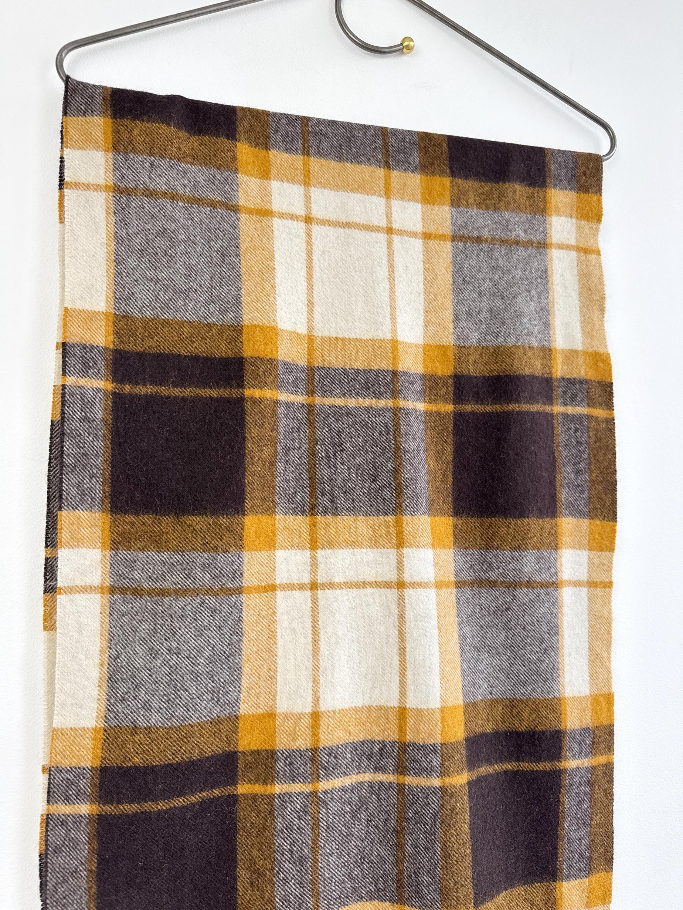 Wrap yourself in effortless Scandinavian style with this beautiful Carin Wester oversized plaid wool blend scarf. Featuring a sophisticated palette of mustard yellow, chocolate brown, and creamy off white, this large checkered shawl is the perfect statement piece for your autumn and winter wardrobe.
