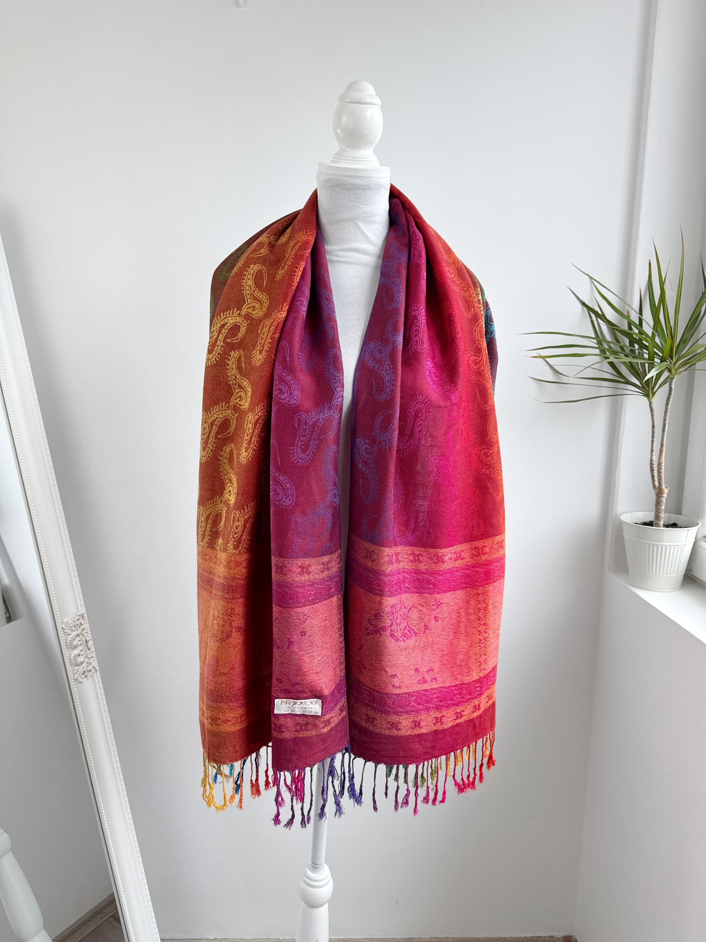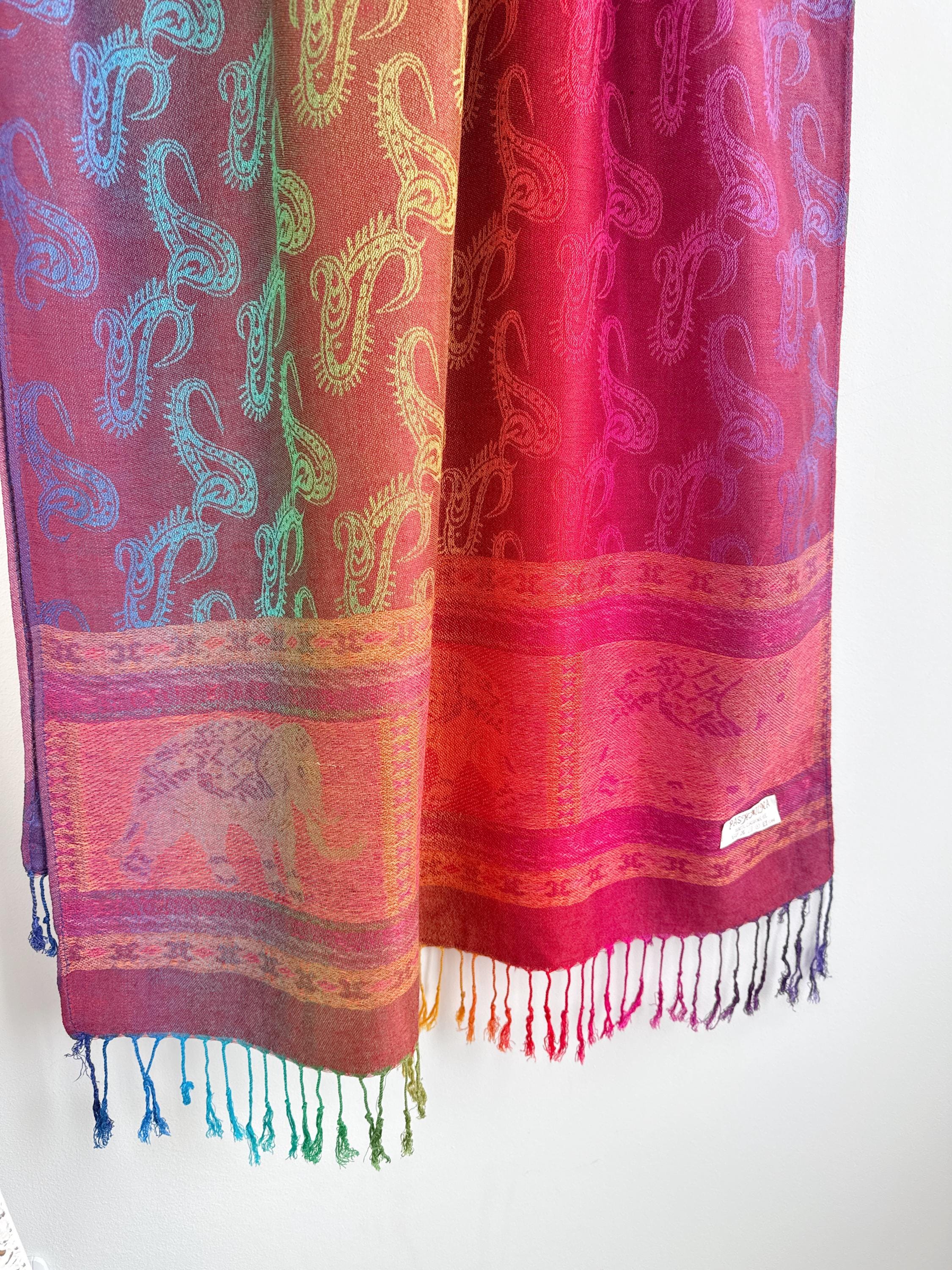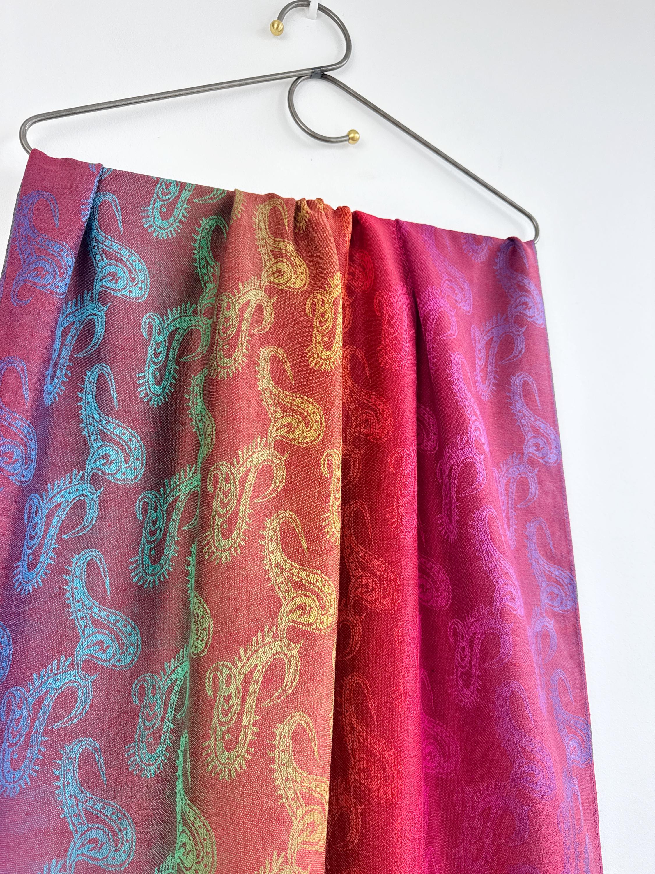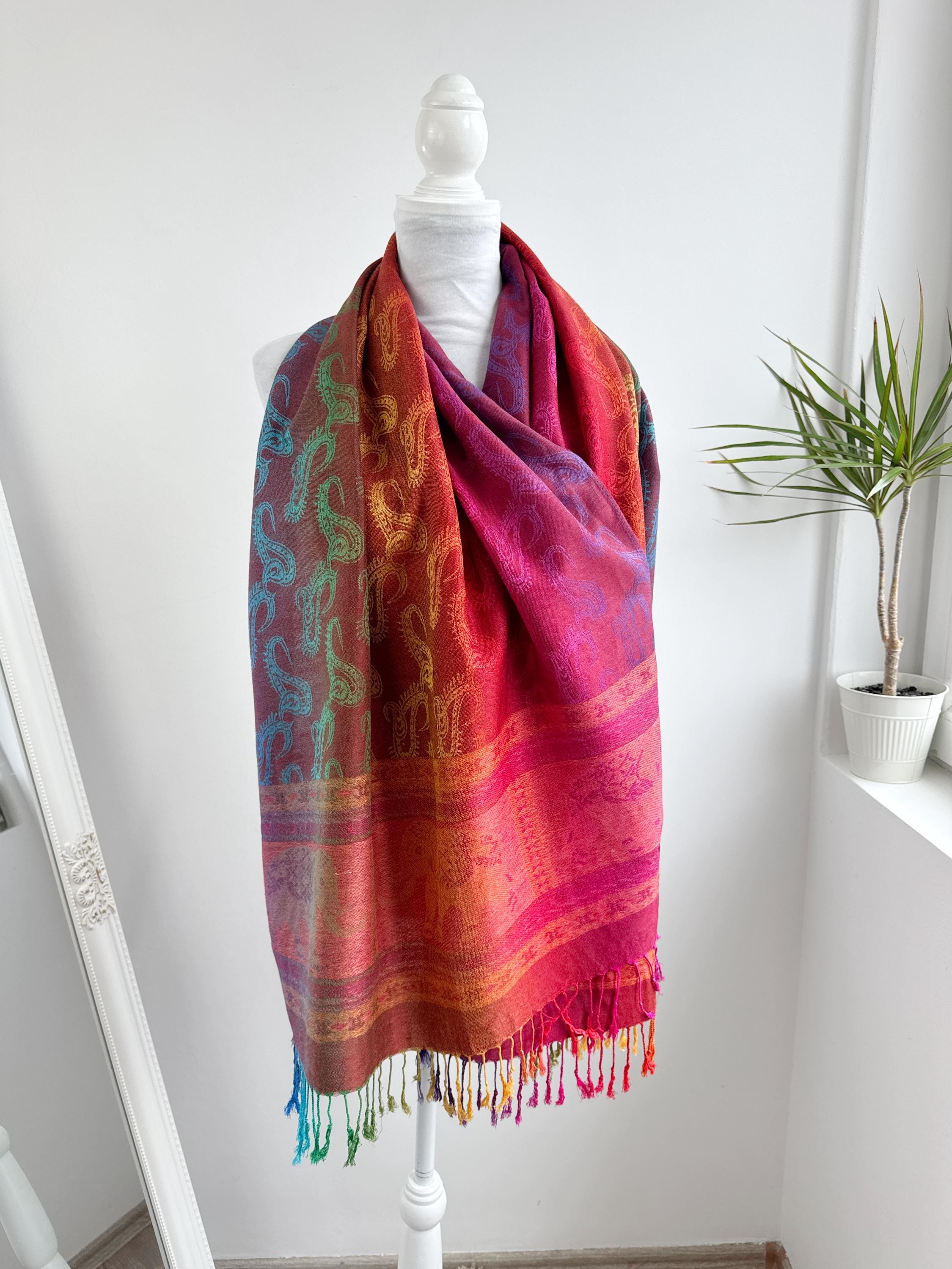 Add a burst of color to your wardrobe with this exquisite vintage rainbow pashmina shawl. Featuring a classic paisley jacquard weave, this 100% cashmere oversized wrap transitions beautifully through a full spectrum of vibrant hues—from deep magenta and fiery orange to emerald green and royal blue.