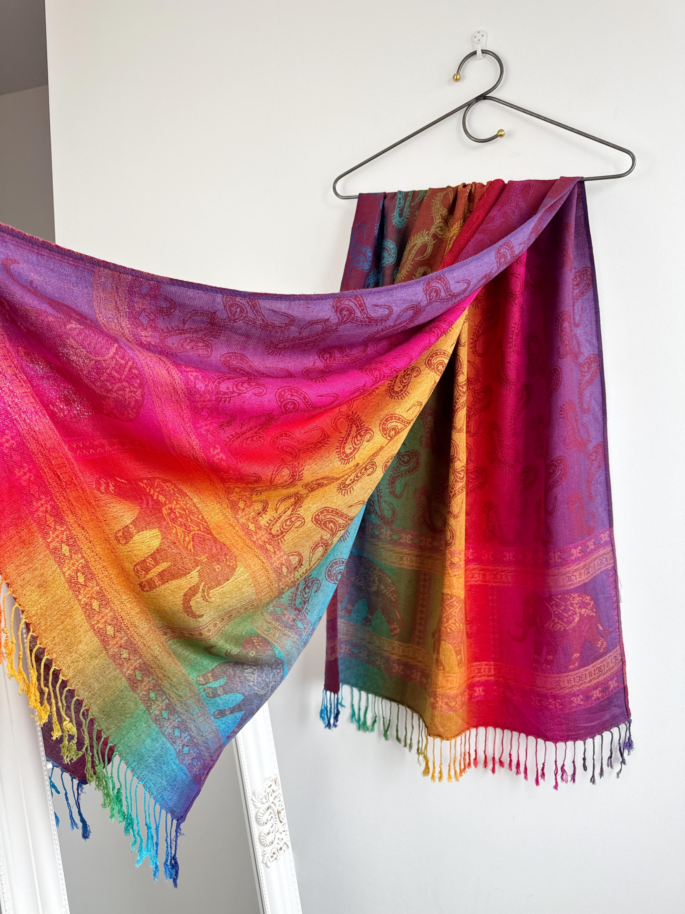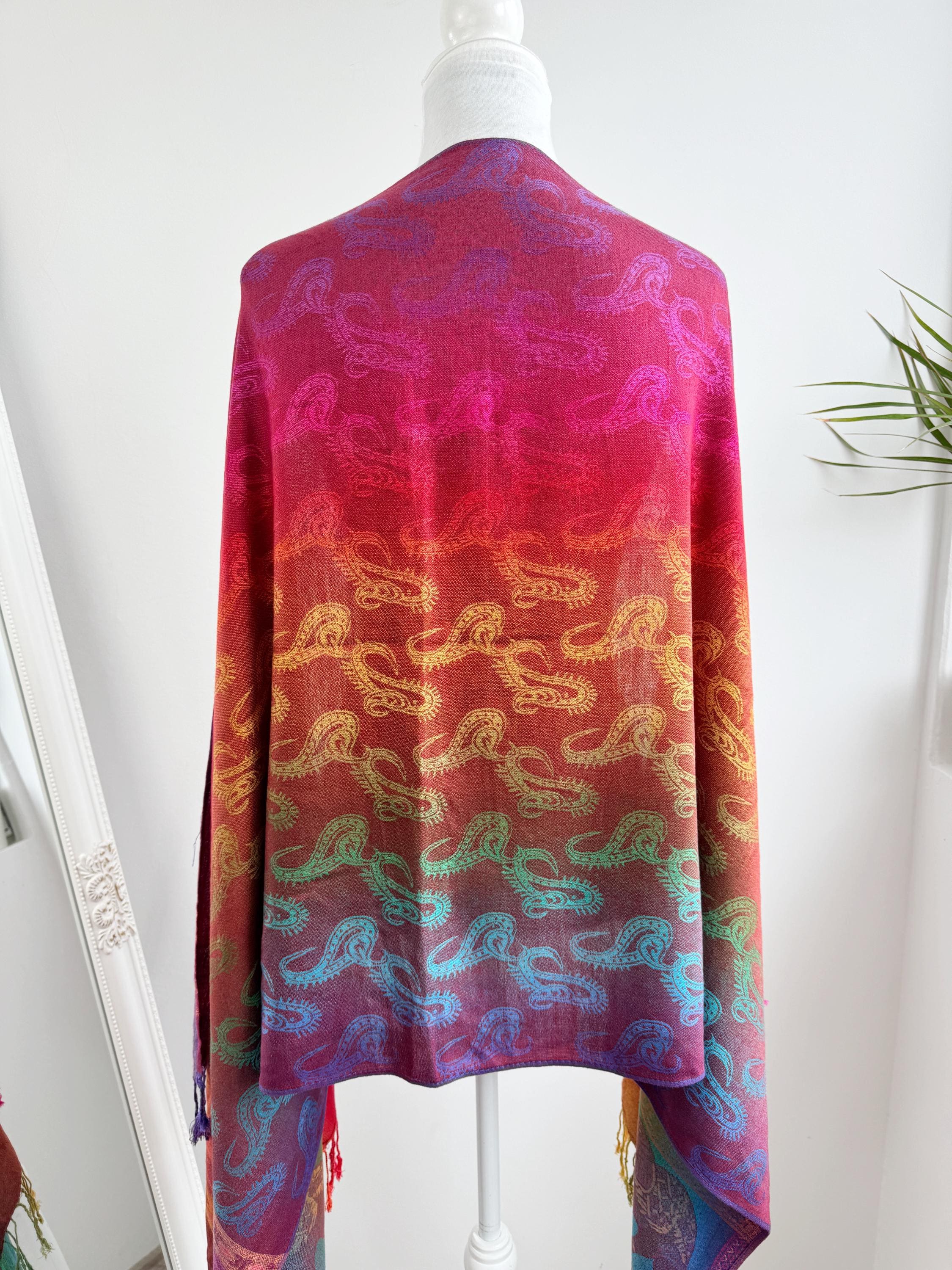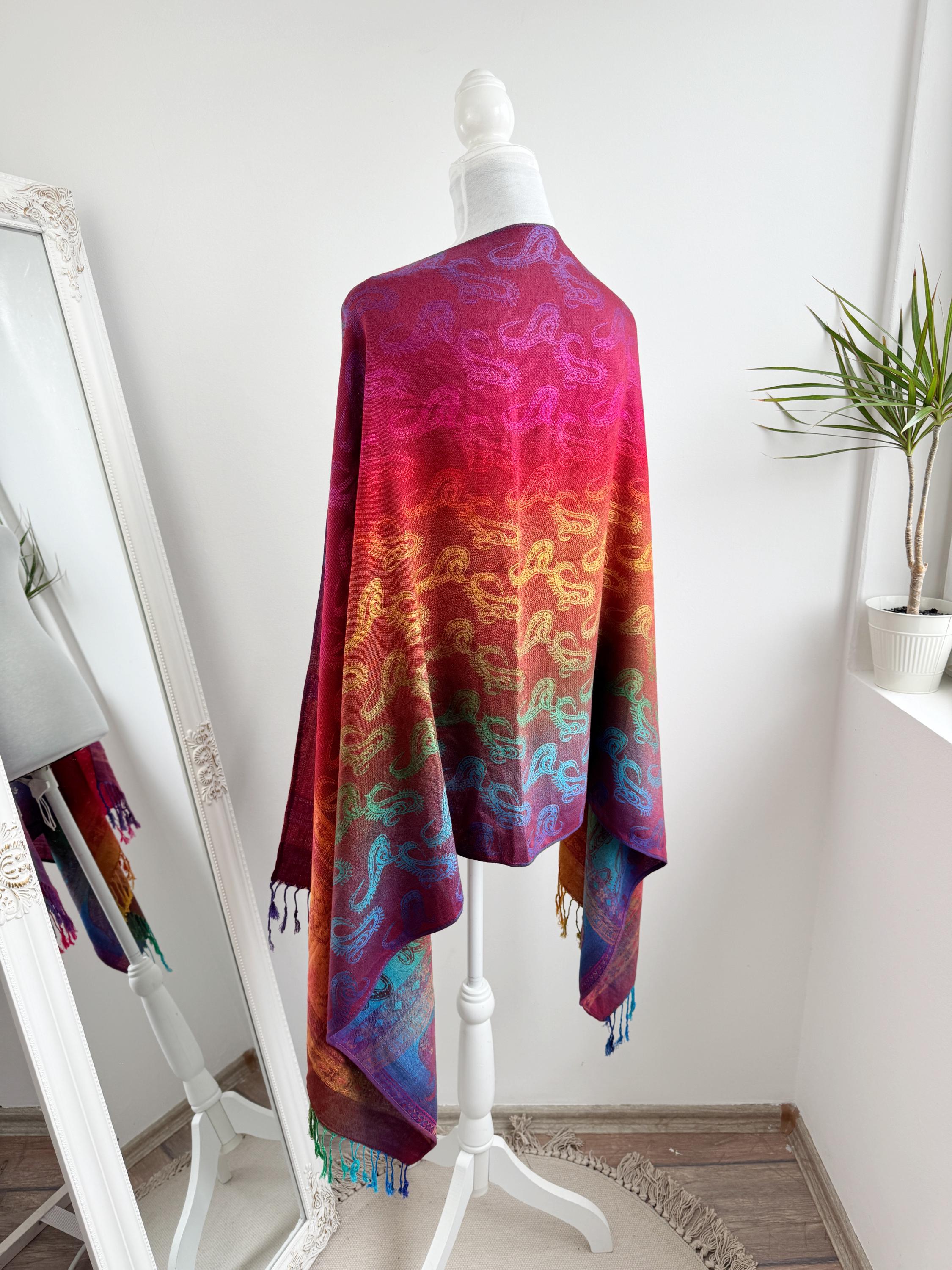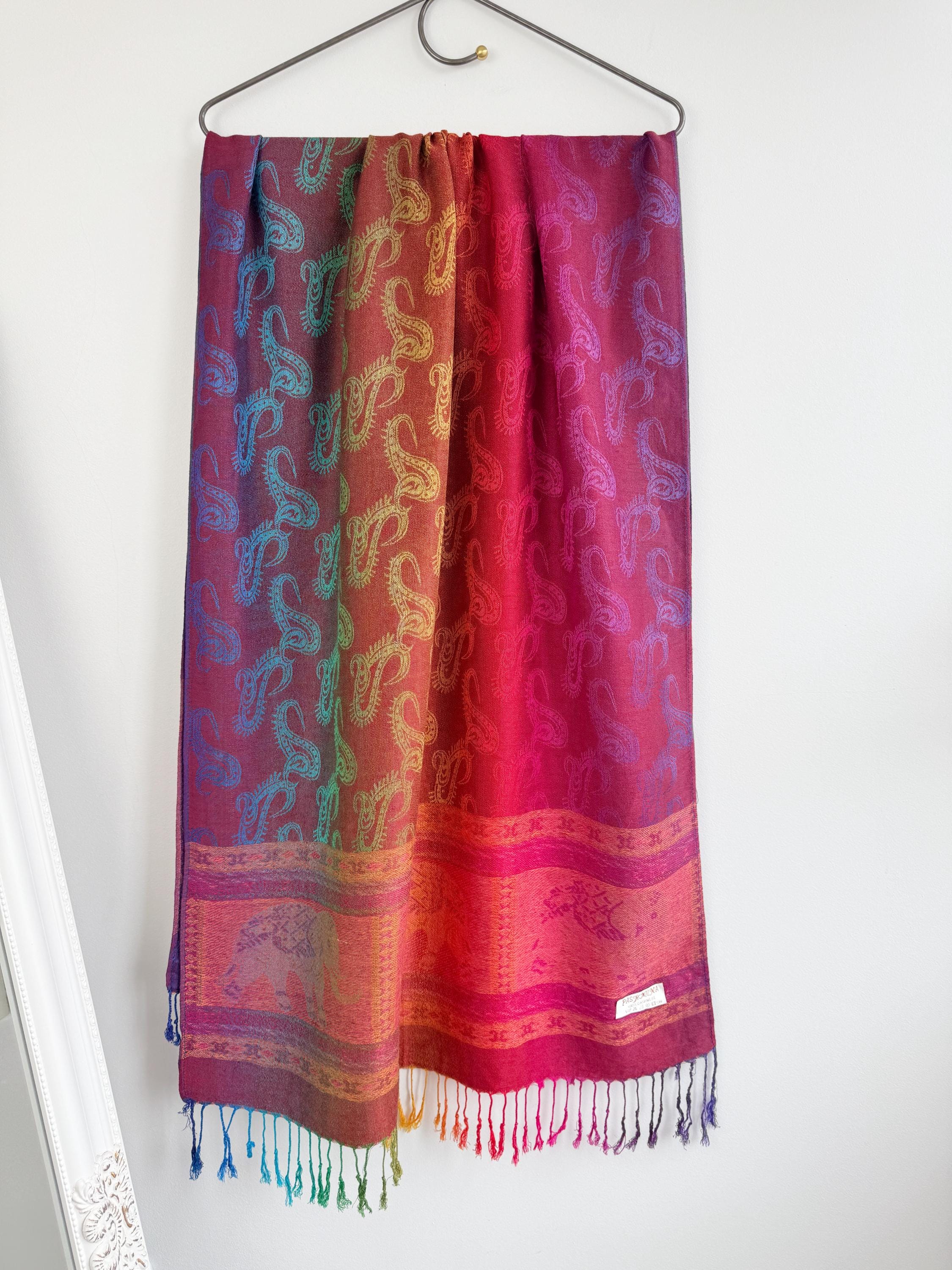 Add a burst of color to your wardrobe with this exquisite vintage rainbow pashmina shawl. Featuring a classic paisley jacquard weave, this 100% cashmere oversized wrap transitions beautifully through a full spectrum of vibrant hues—from deep magenta and fiery orange to emerald green and royal blue.