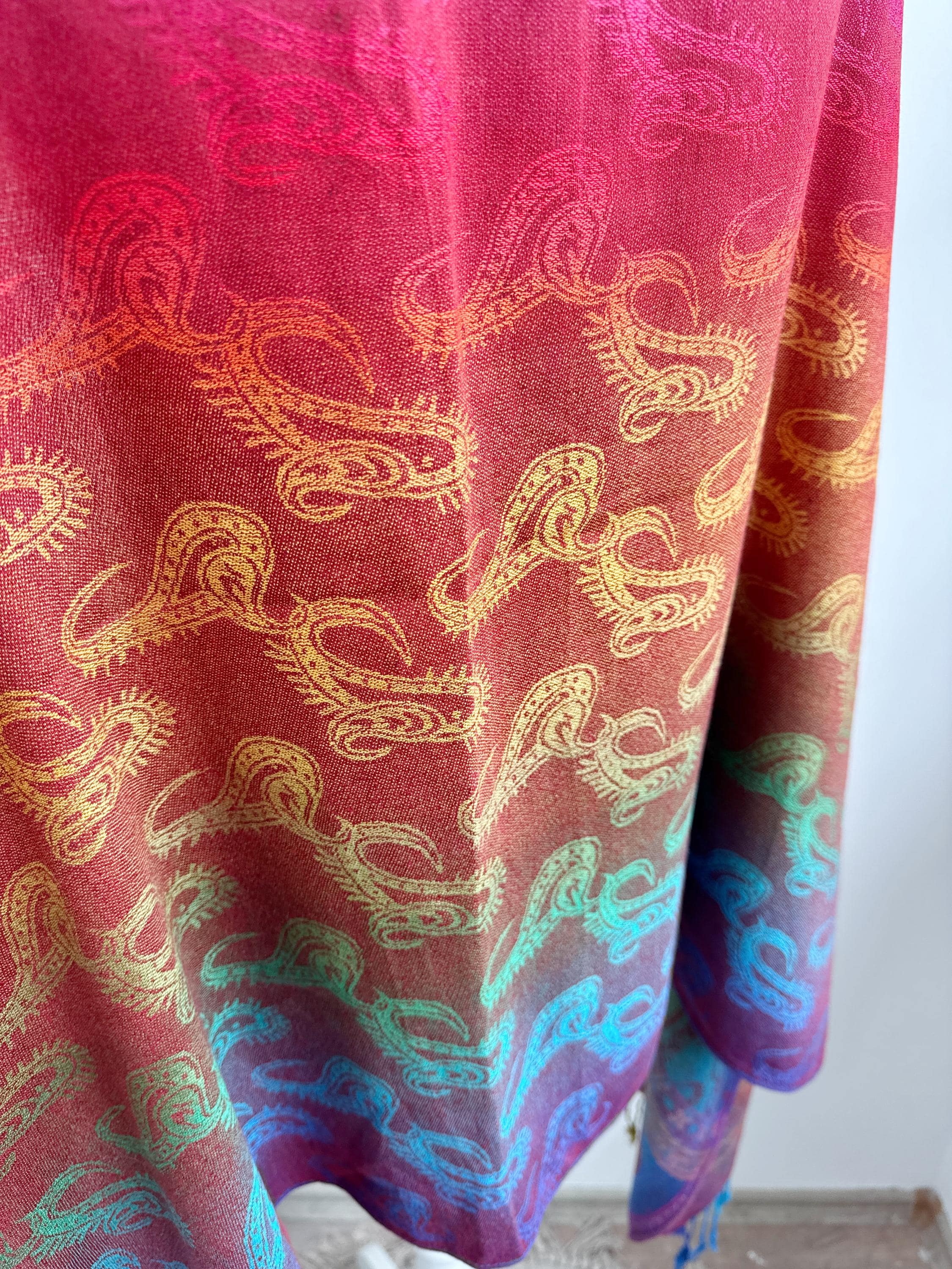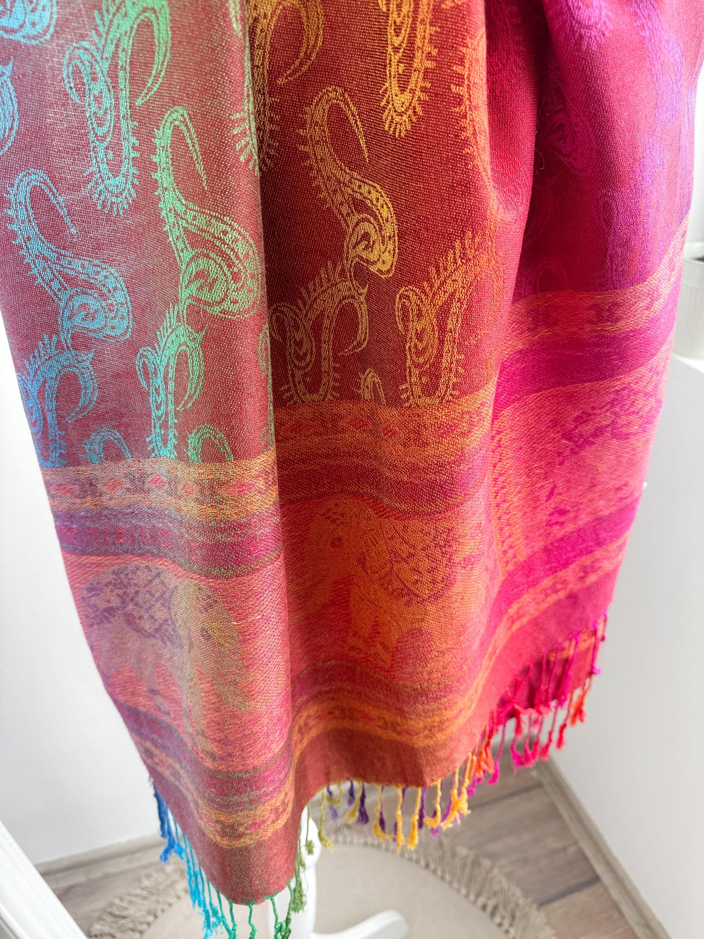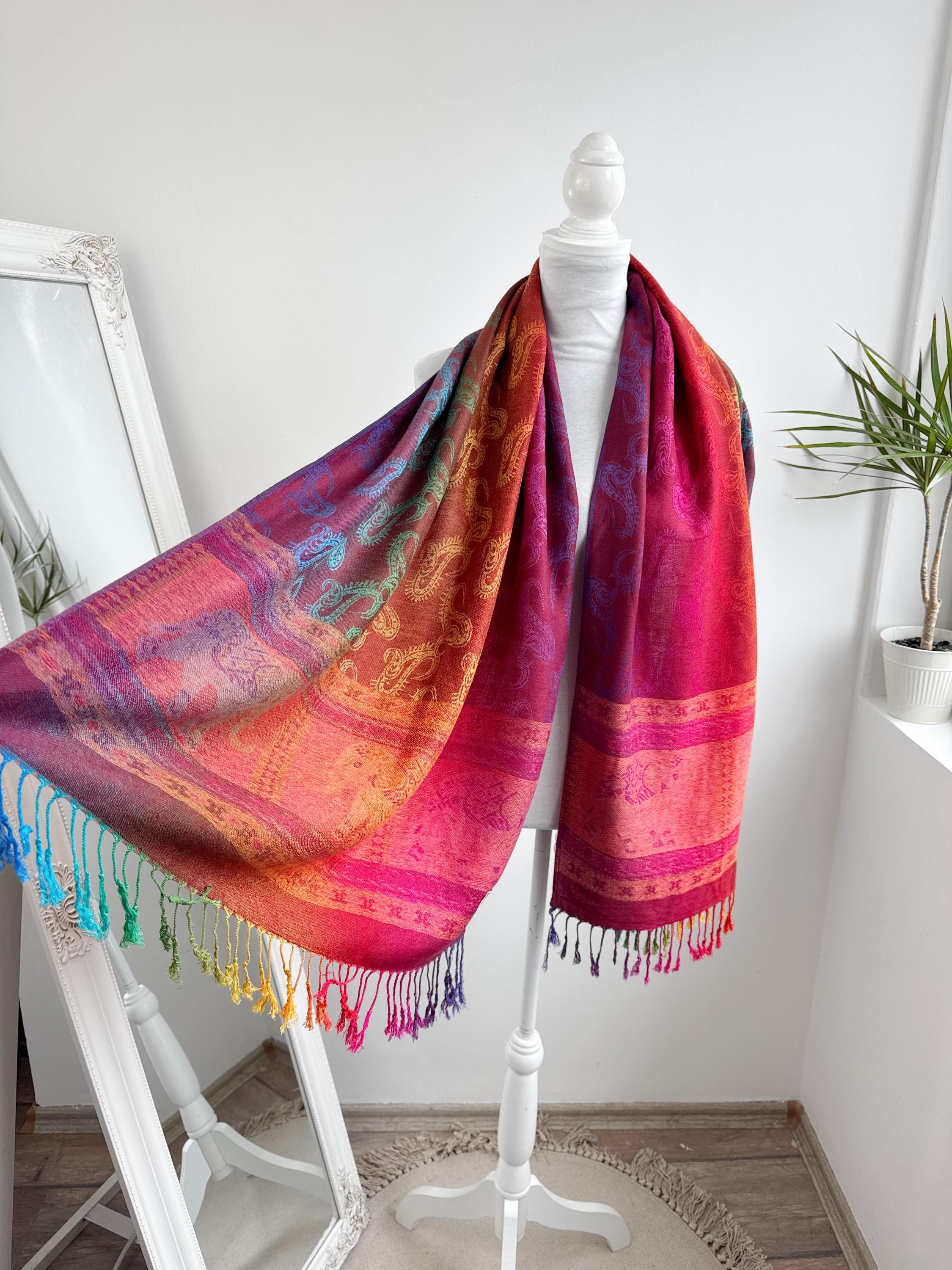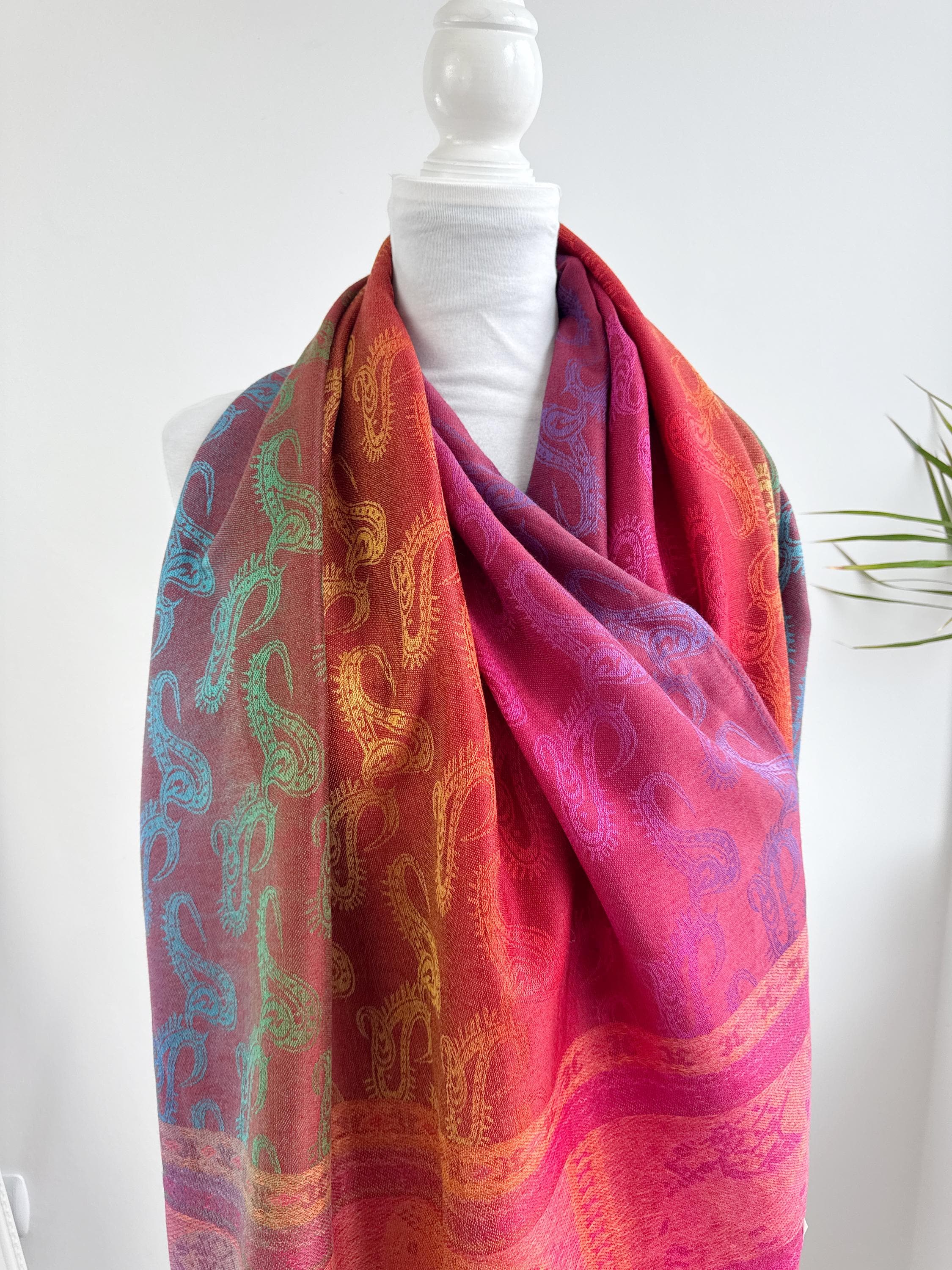 Add a burst of color to your wardrobe with this exquisite vintage rainbow pashmina shawl. Featuring a classic paisley jacquard weave, this 100% cashmere oversized wrap transitions beautifully through a full spectrum of vibrant hues—from deep magenta and fiery orange to emerald green and royal blue.