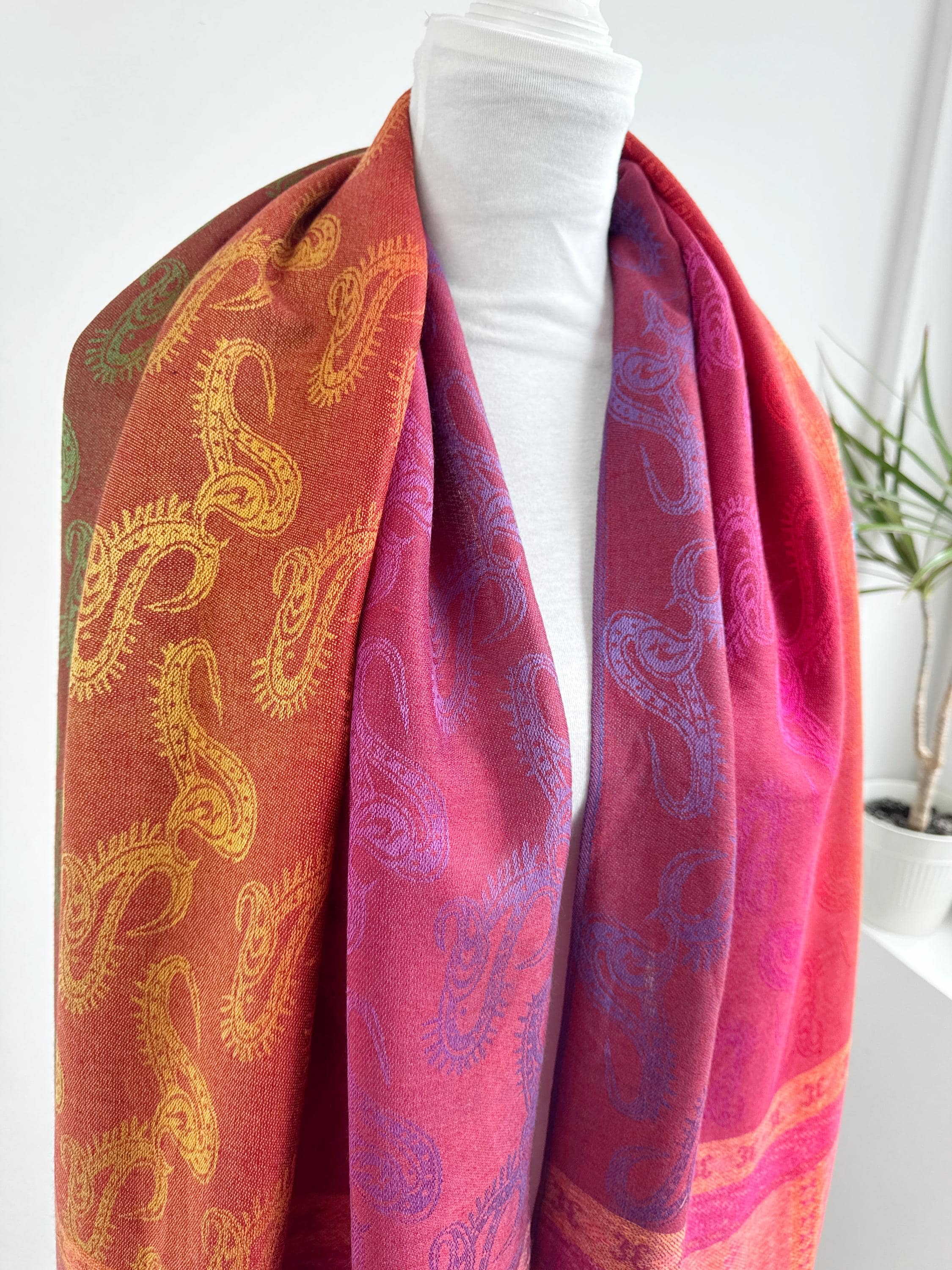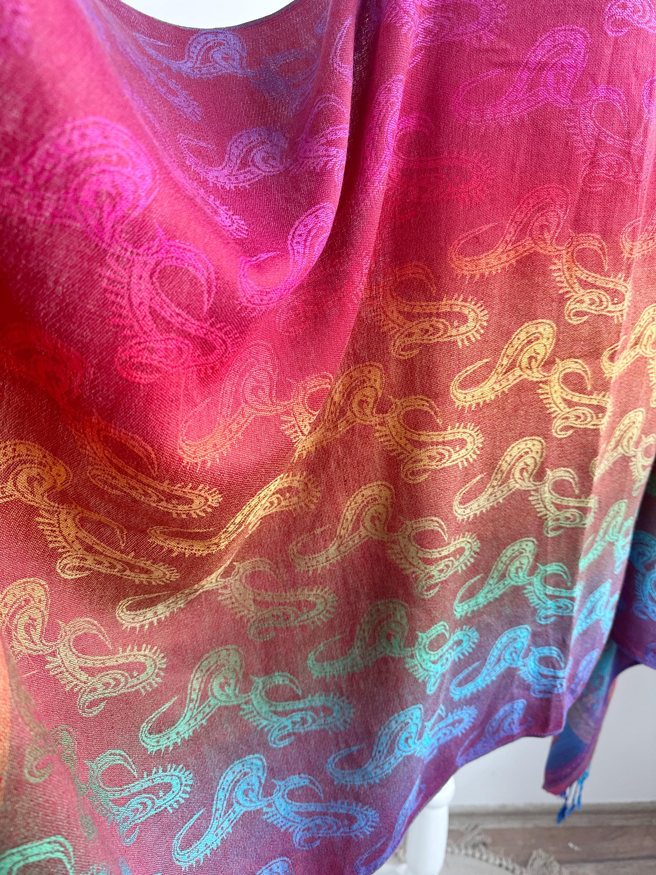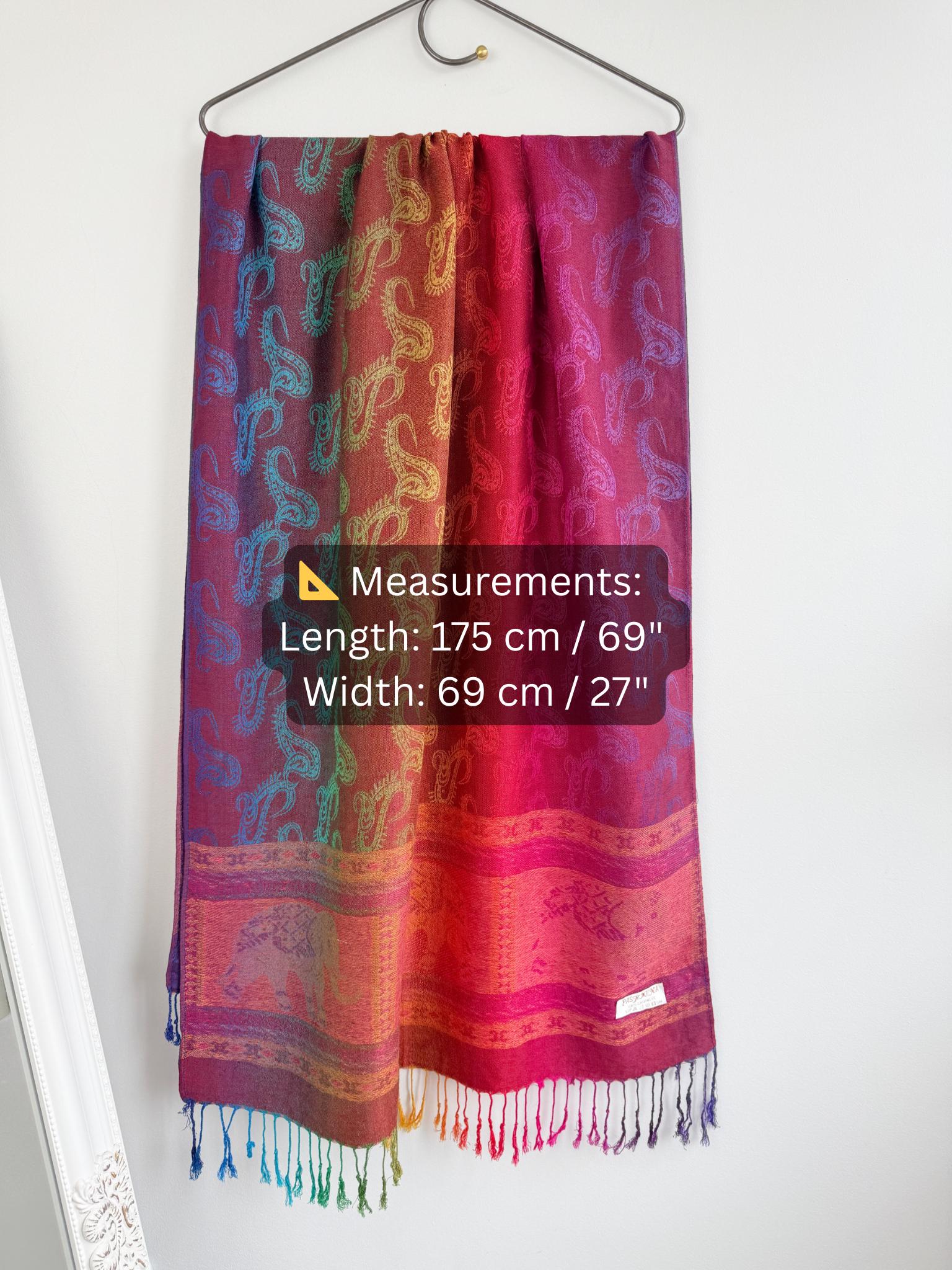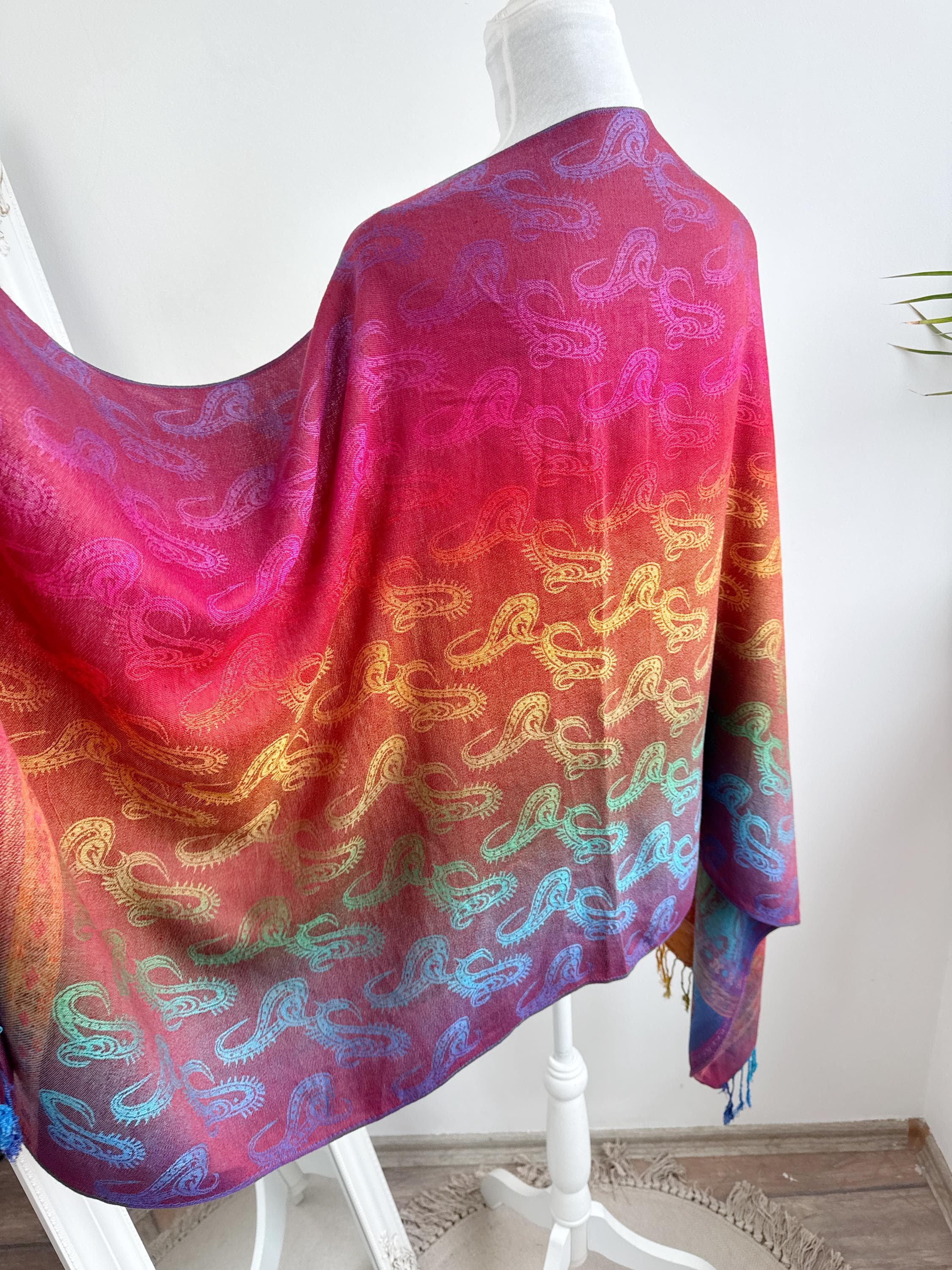 Add a burst of color to your wardrobe with this exquisite vintage rainbow pashmina shawl. Featuring a classic paisley jacquard weave, this 100% cashmere oversized wrap transitions beautifully through a full spectrum of vibrant hues—from deep magenta and fiery orange to emerald green and royal blue.