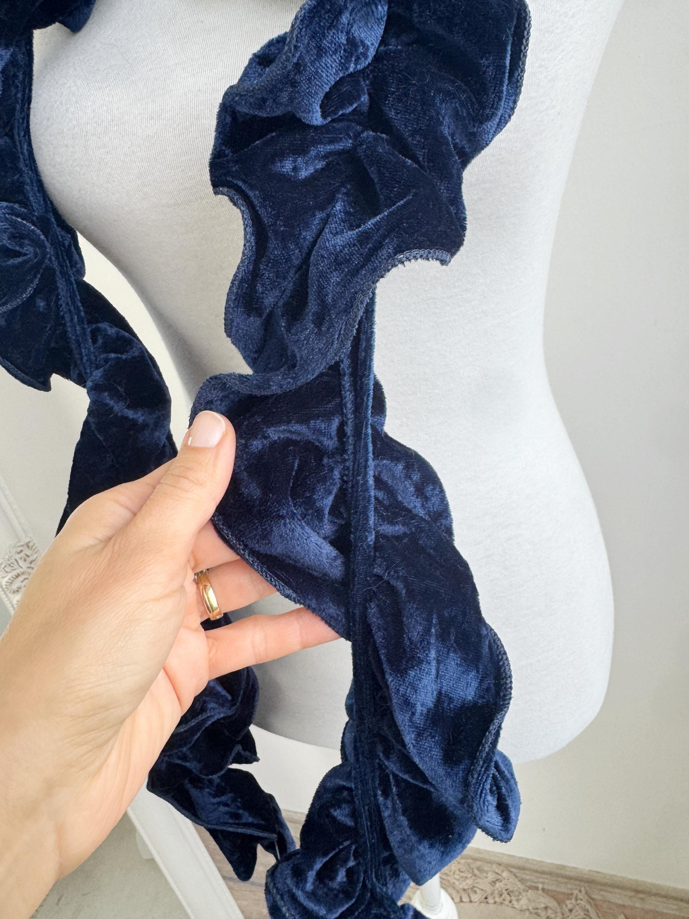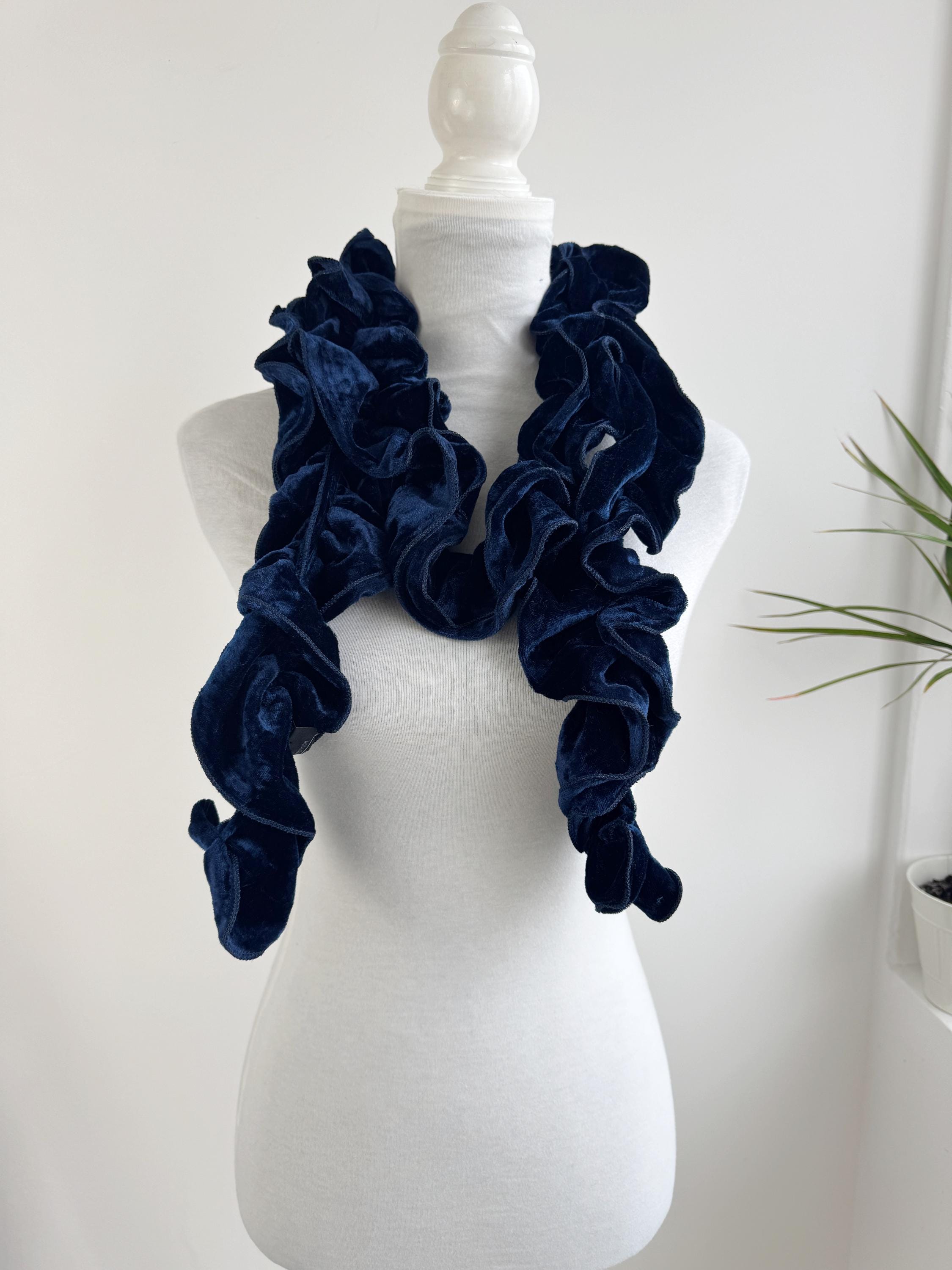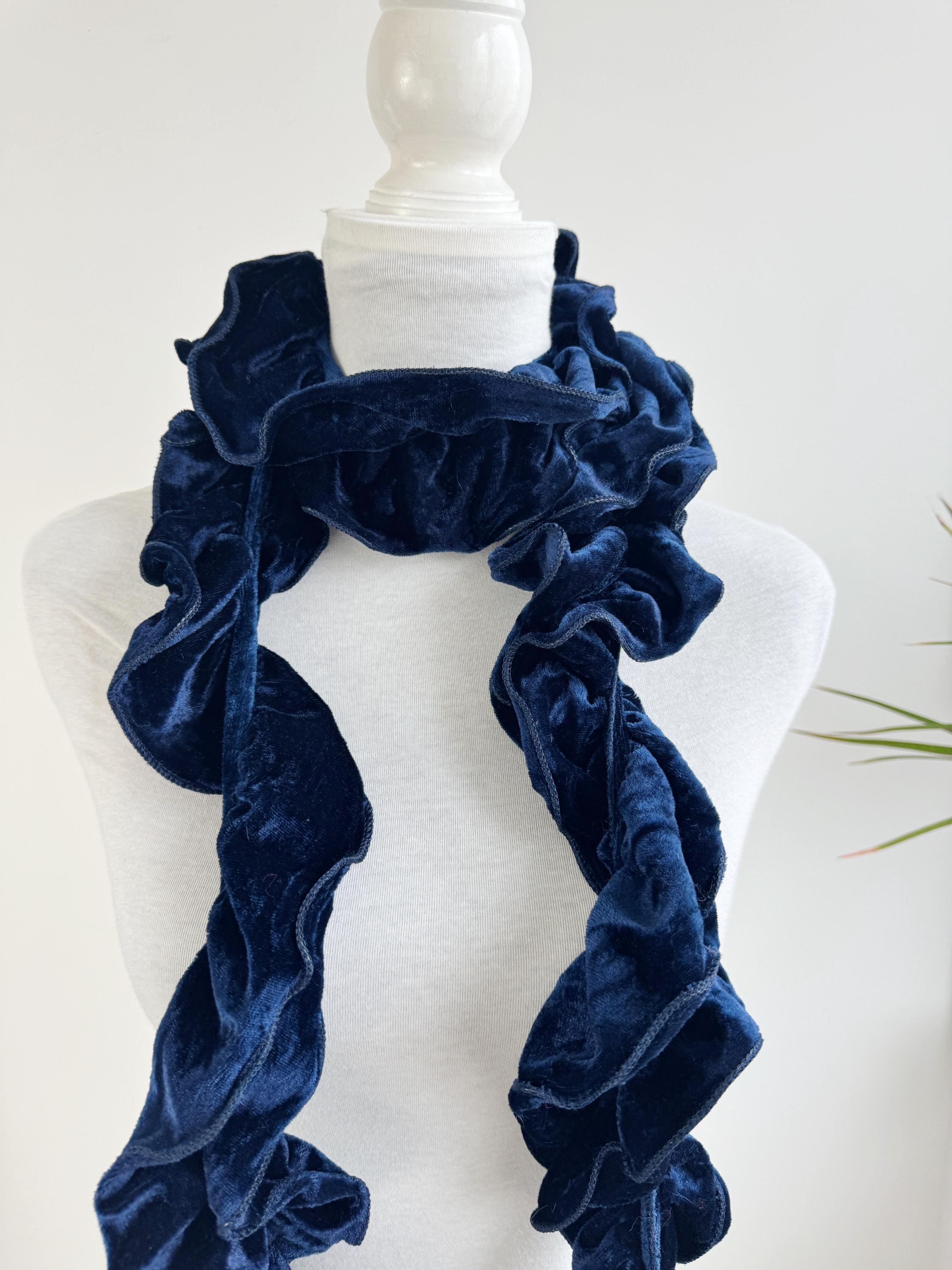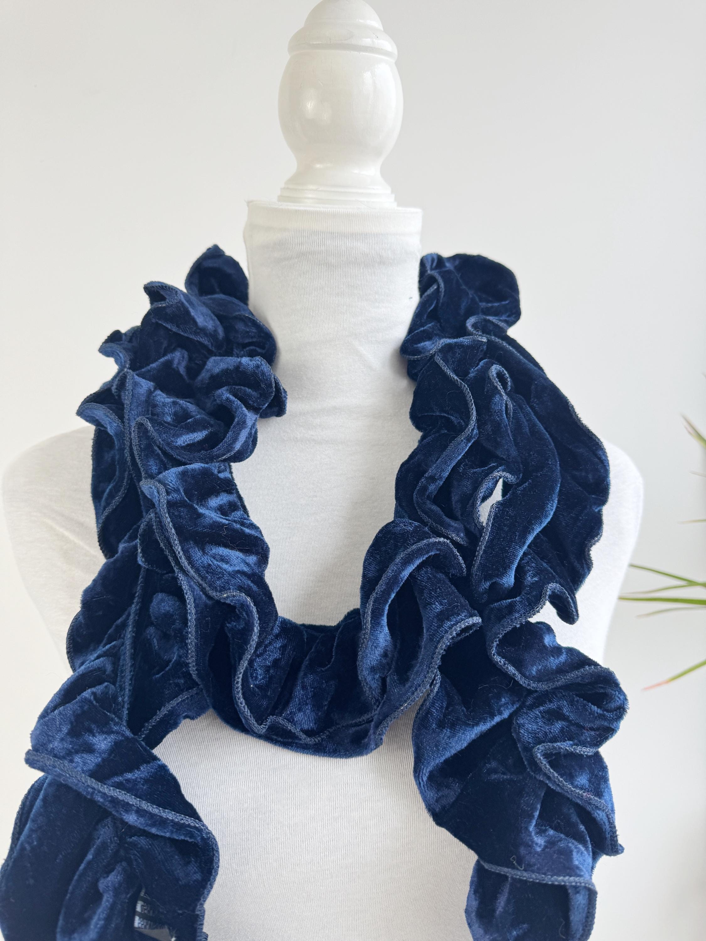 Elevate your winter wardrobe with this stunning vintage navy blue velvet ruffle scarf. Expertly crafted in Italy, this potato chip style velvet scarf features a dramatic ruched design that creates effortless volume and a romantic, wavy silhouette. The deep midnight blue hue has a beautiful sheen that catches the light, making it a perfect velvet shoulder wrap accessory for both casual cozy days and elegant evening outings.