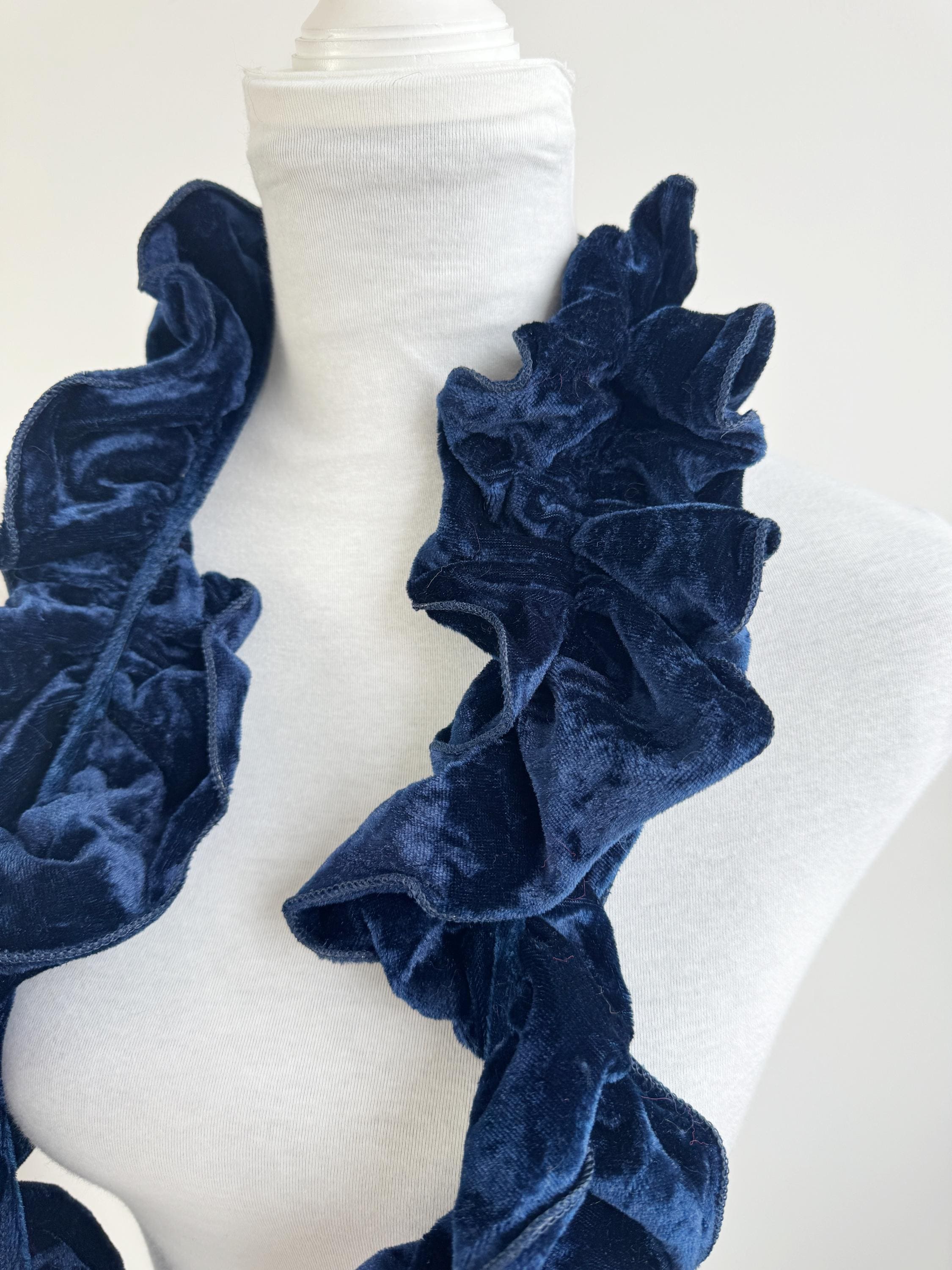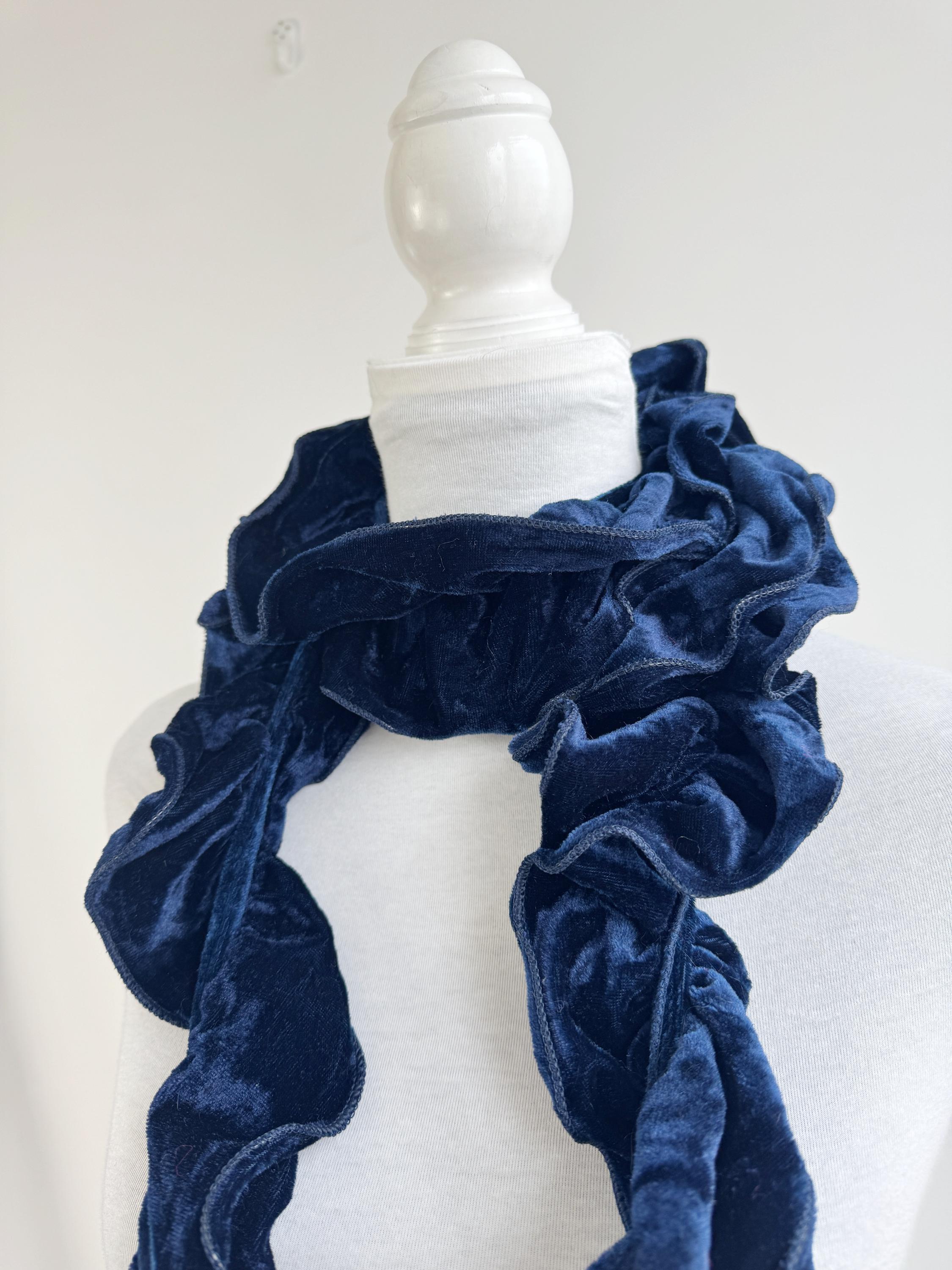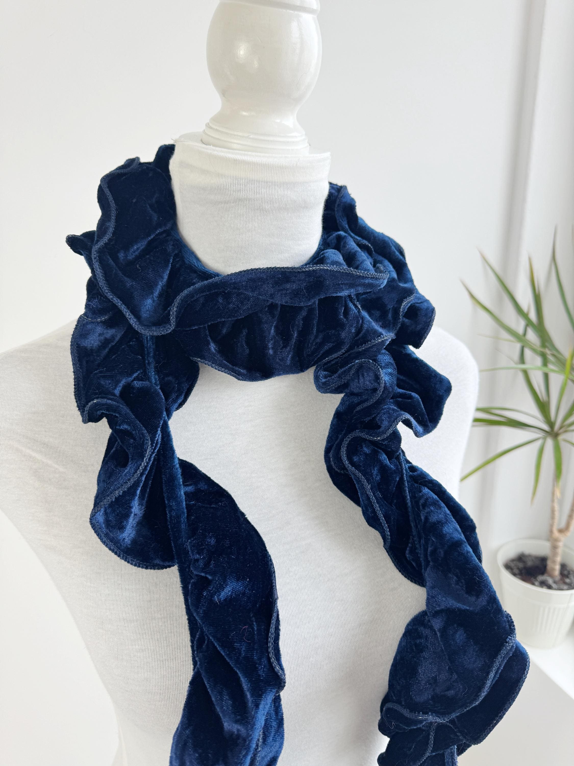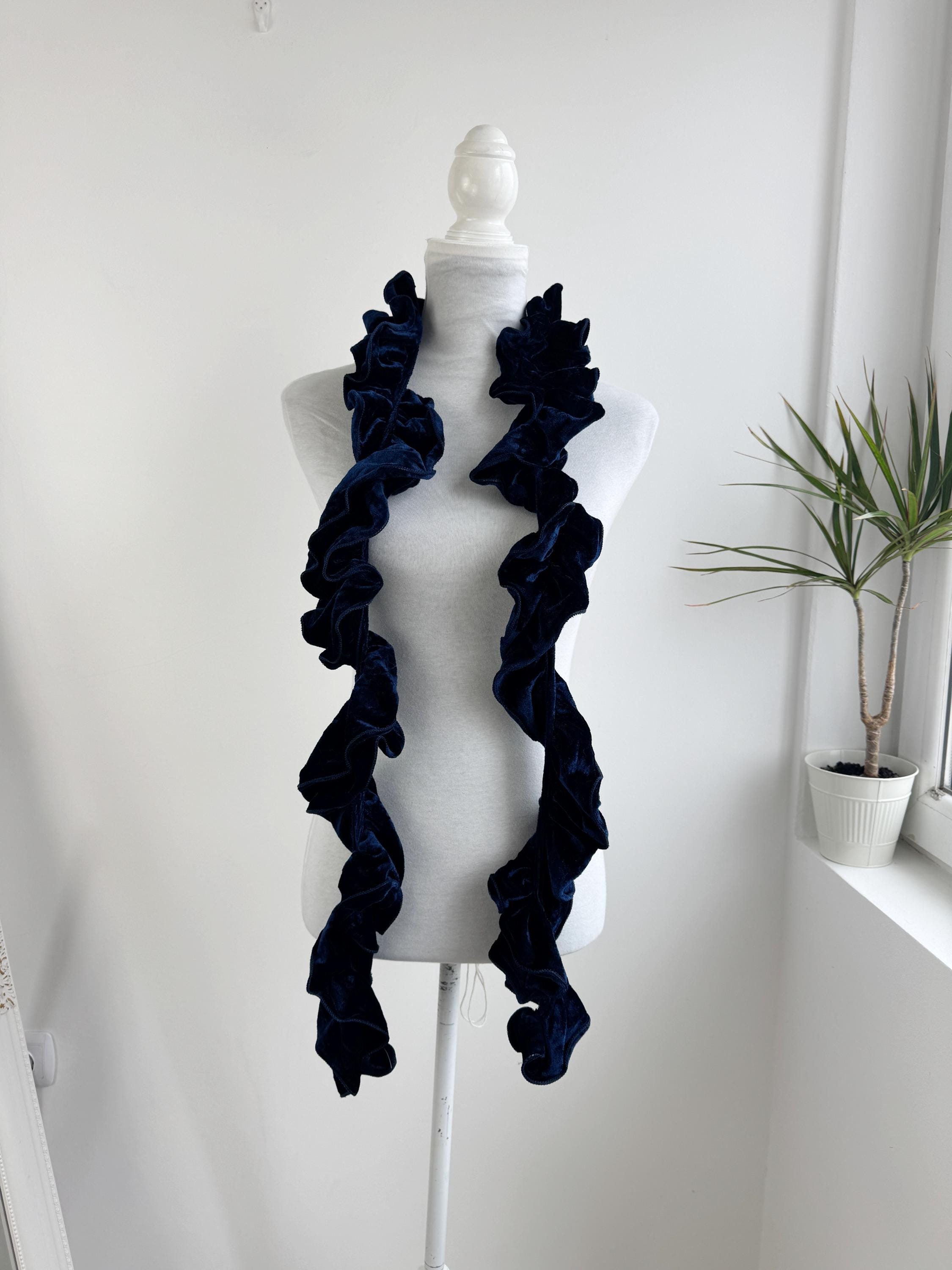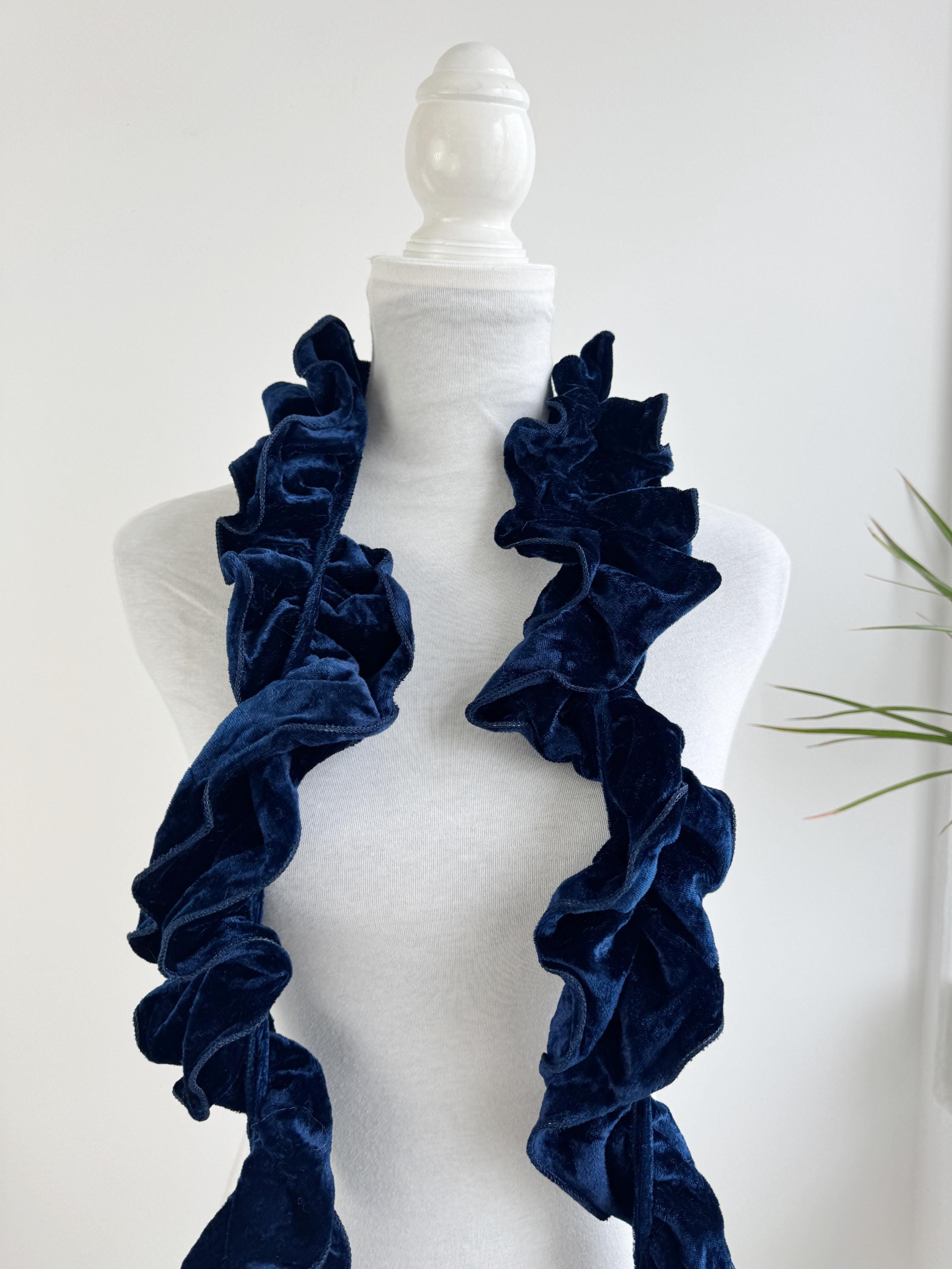 Elevate your winter wardrobe with this stunning vintage navy blue velvet ruffle scarf. Expertly crafted in Italy, this potato chip style velvet scarf features a dramatic ruched design that creates effortless volume and a romantic, wavy silhouette. The deep midnight blue hue has a beautiful sheen that catches the light, making it a perfect velvet shoulder wrap accessory for both casual cozy days and elegant evening outings.