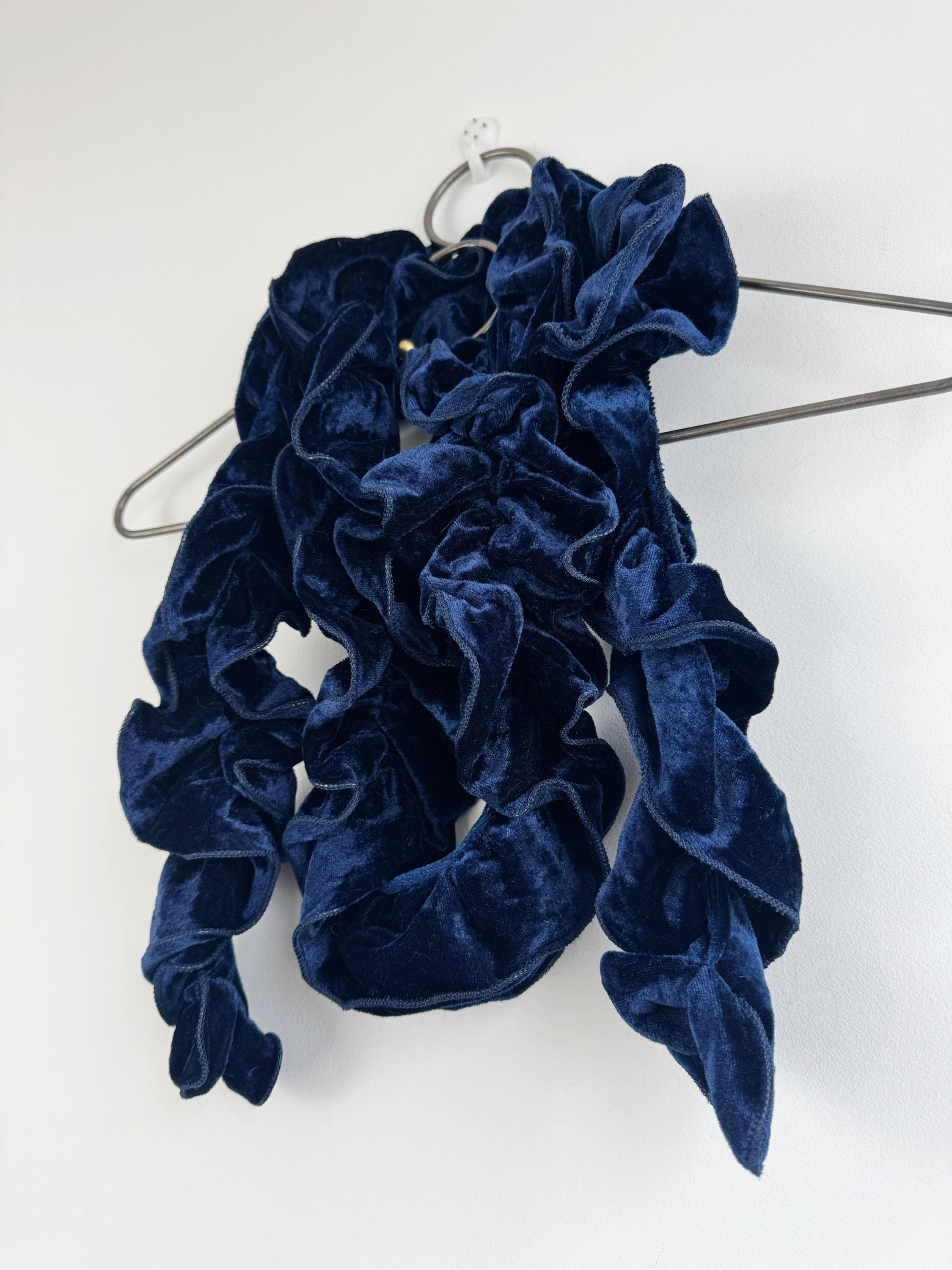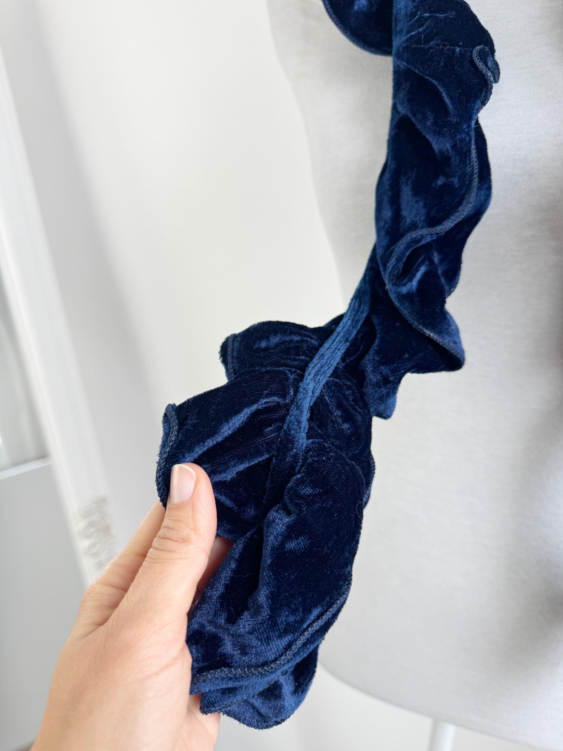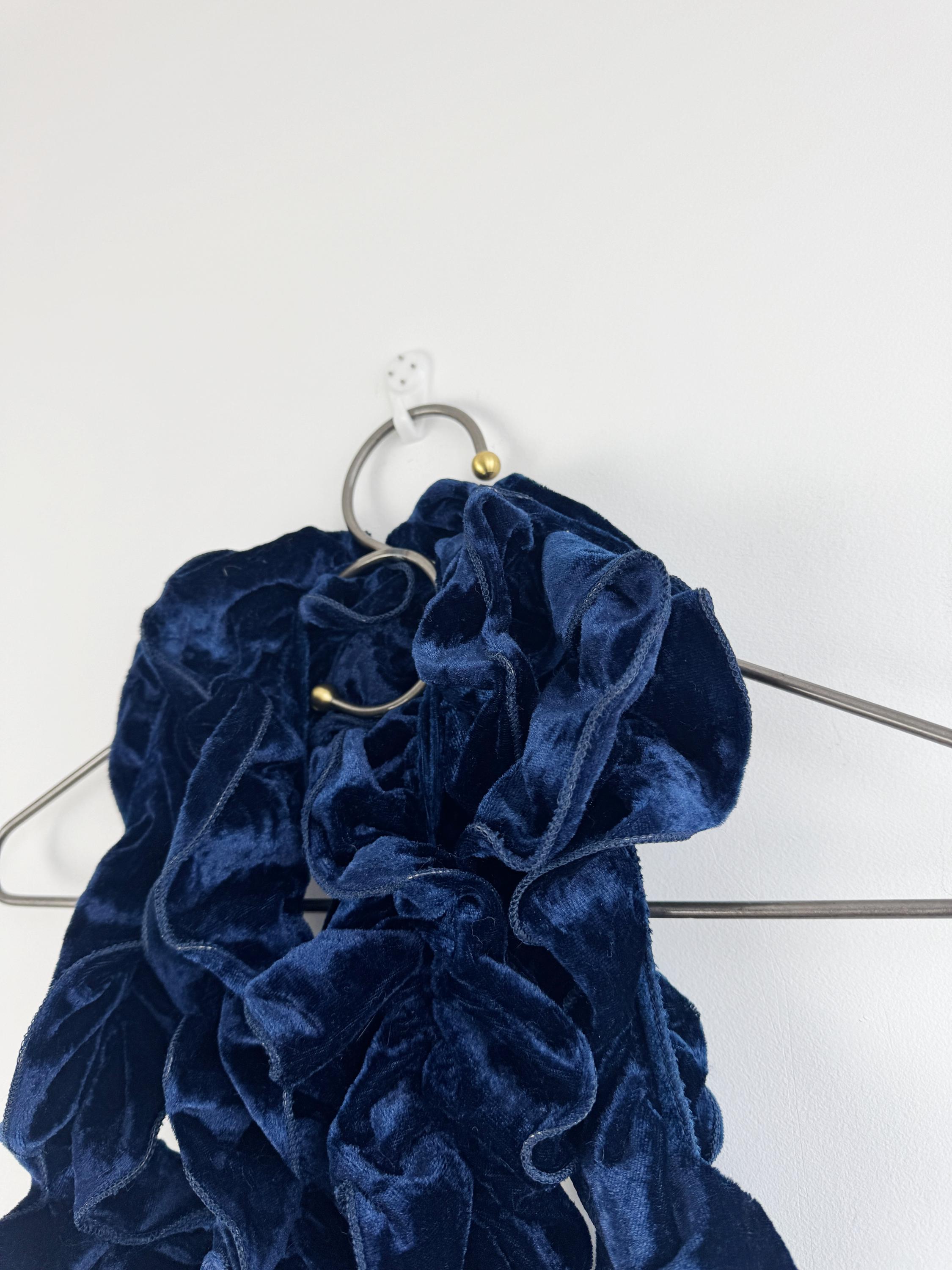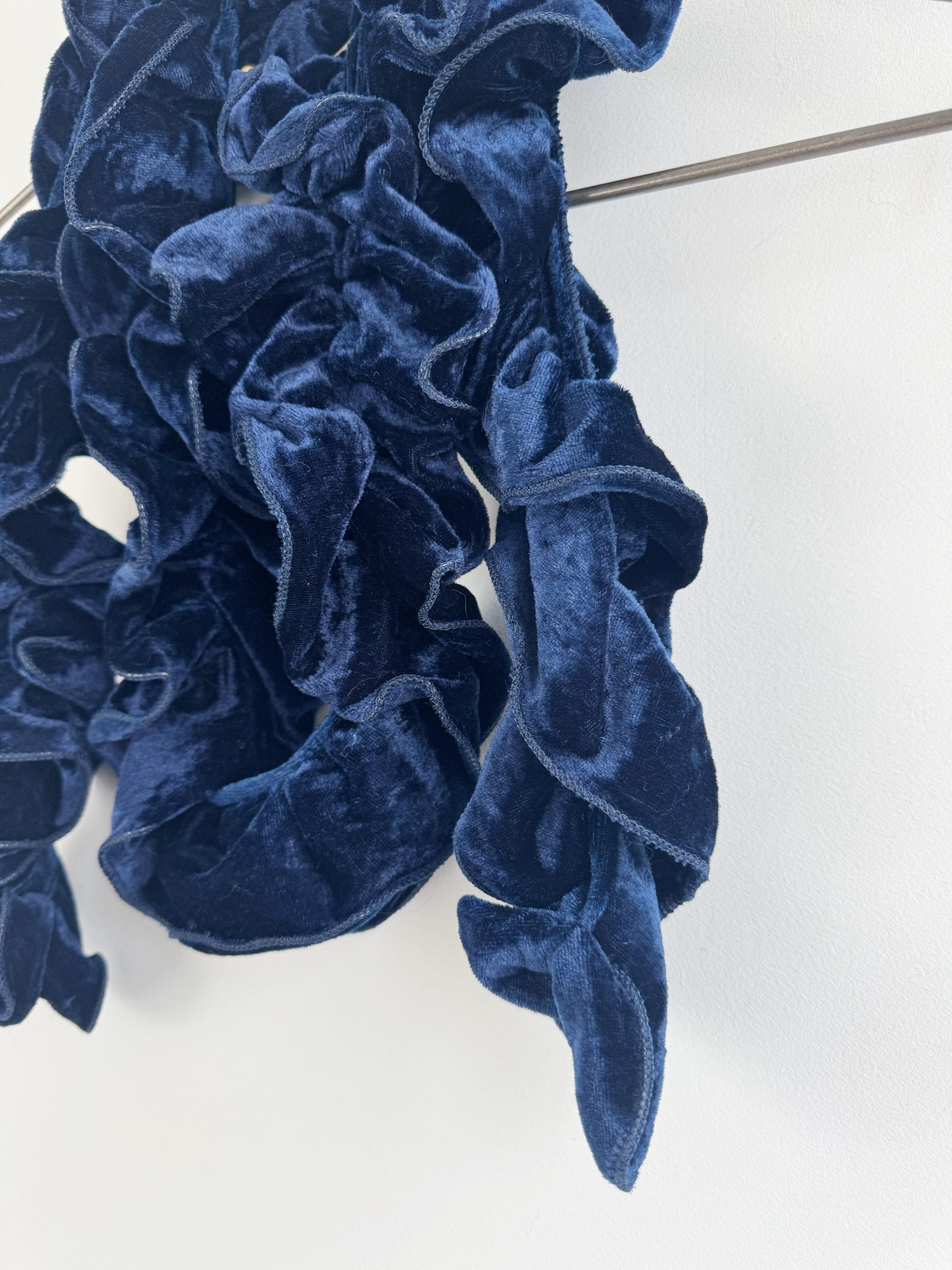 Elevate your winter wardrobe with this stunning vintage navy blue velvet ruffle scarf. Expertly crafted in Italy, this potato chip style velvet scarf features a dramatic ruched design that creates effortless volume and a romantic, wavy silhouette. The deep midnight blue hue has a beautiful sheen that catches the light, making it a perfect velvet shoulder wrap accessory for both casual cozy days and elegant evening outings.