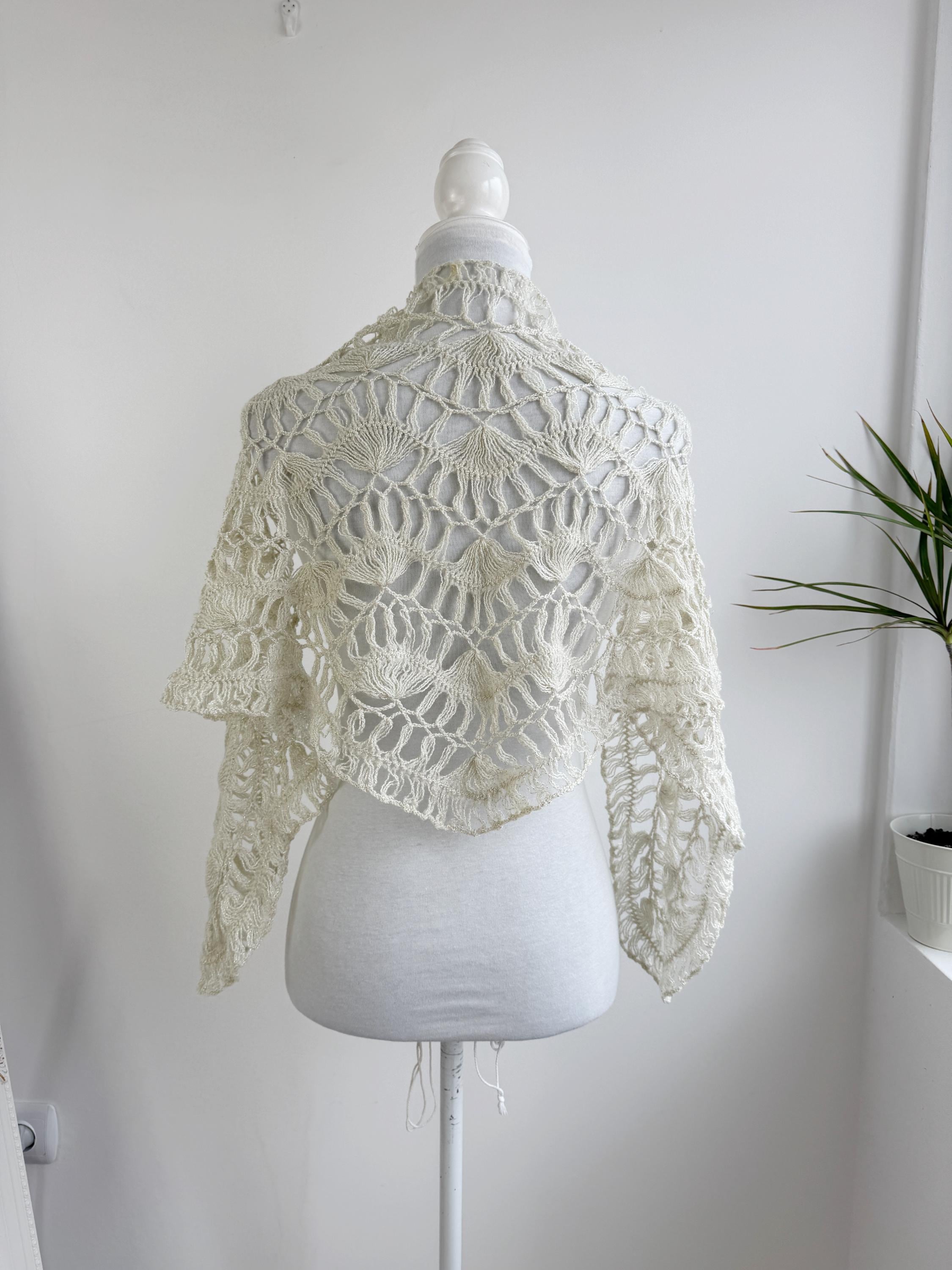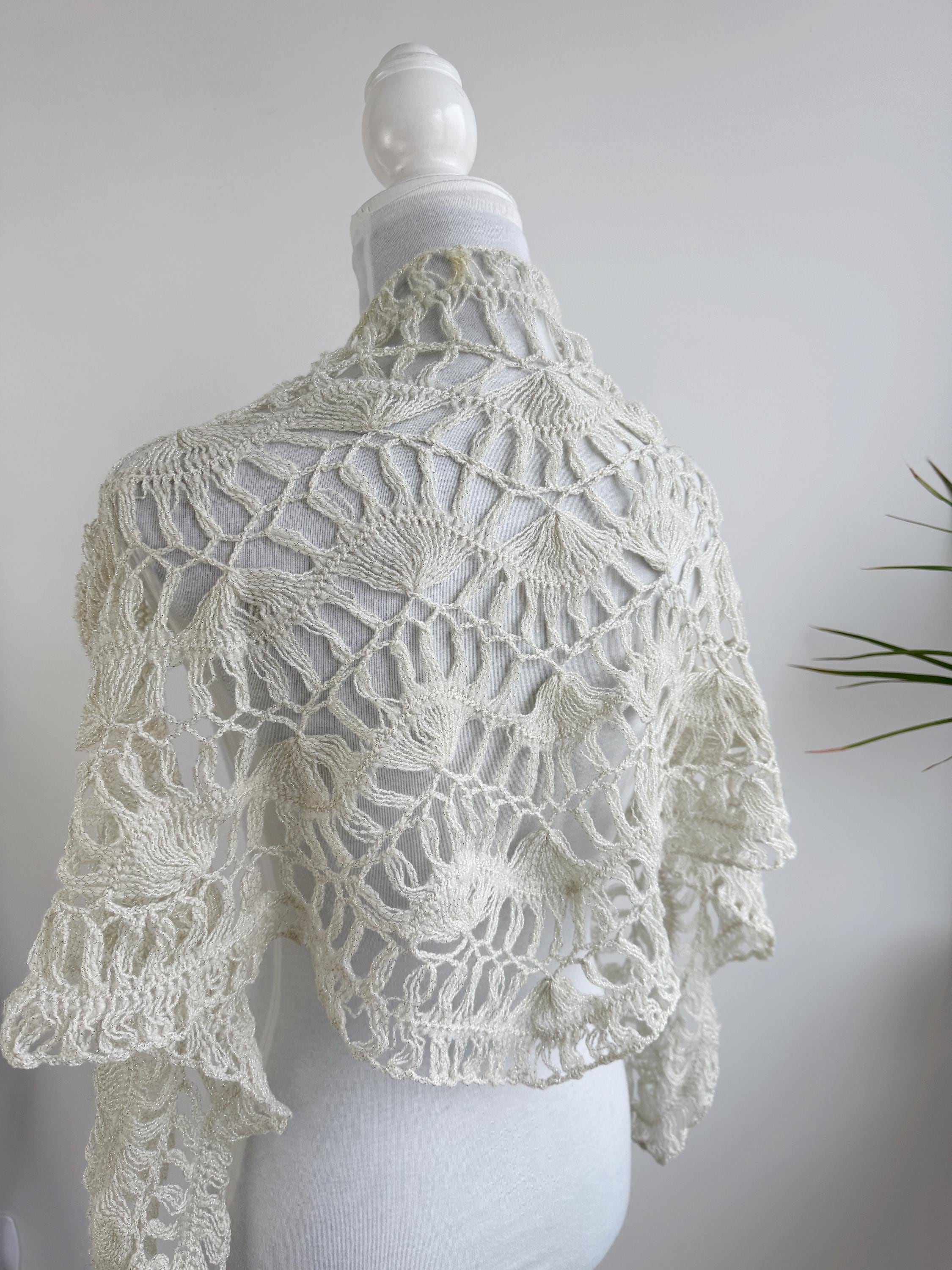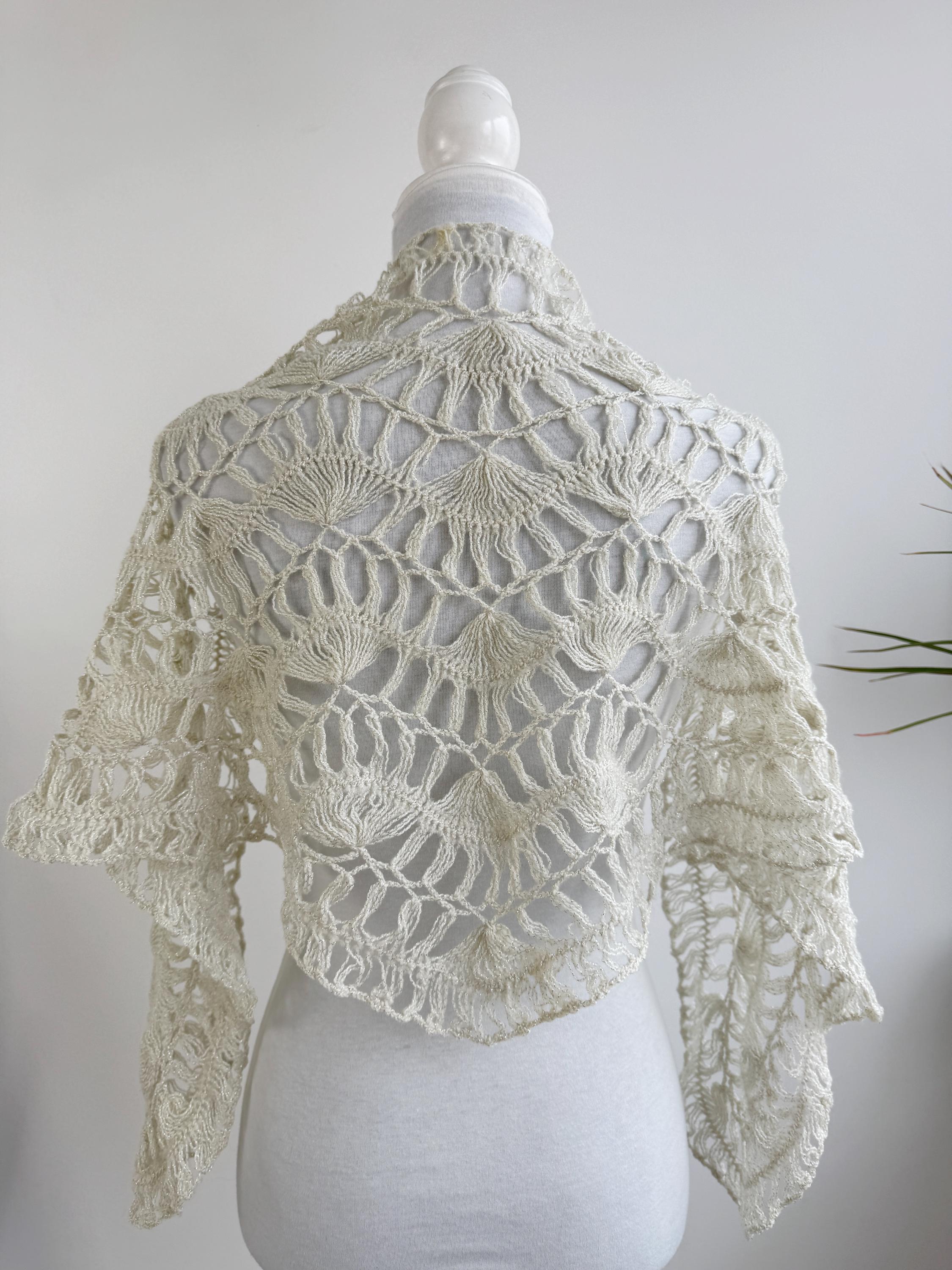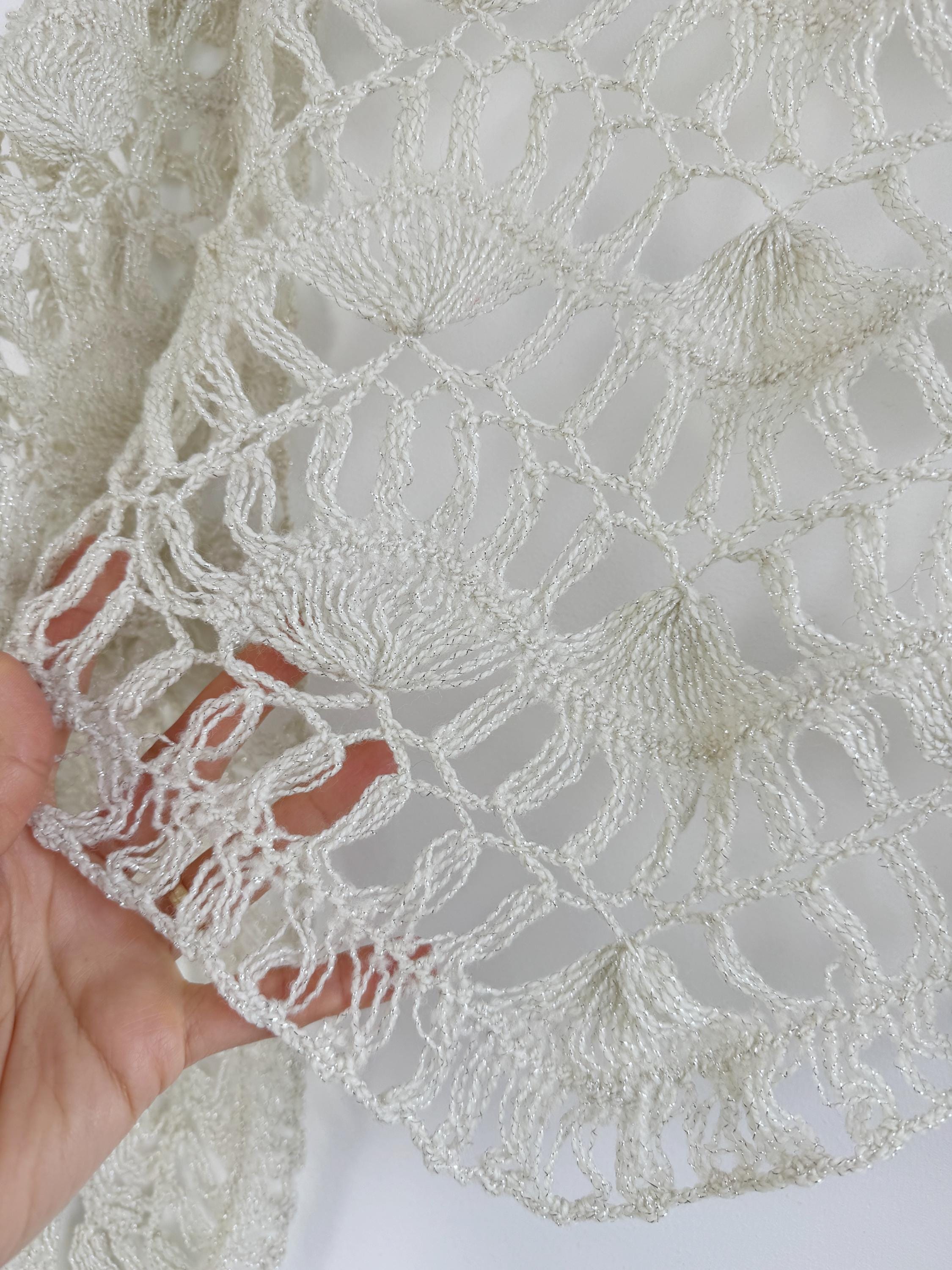 Elevate your evening attire with this exquisite vintage hand-crochet broomstick lace shawl. Featuring a delicate fan-shaped openwork pattern, this handmade wrap is crafted from a soft cream-white yarn interwoven with a subtle silver metallic thread that catches the light beautifully.