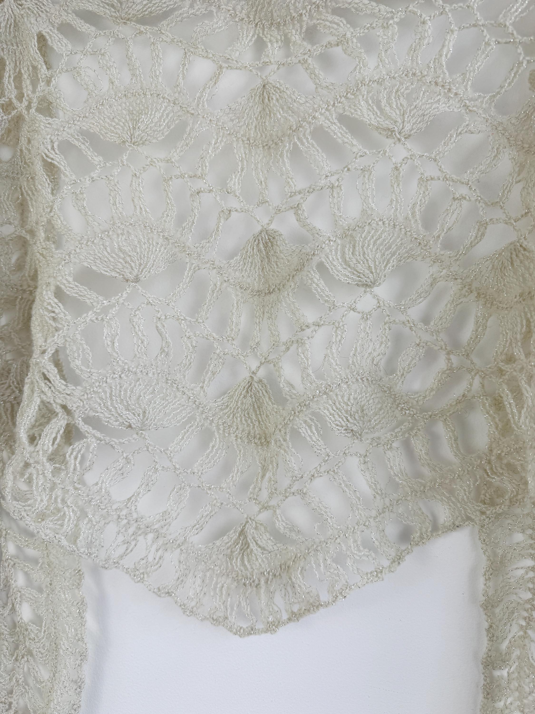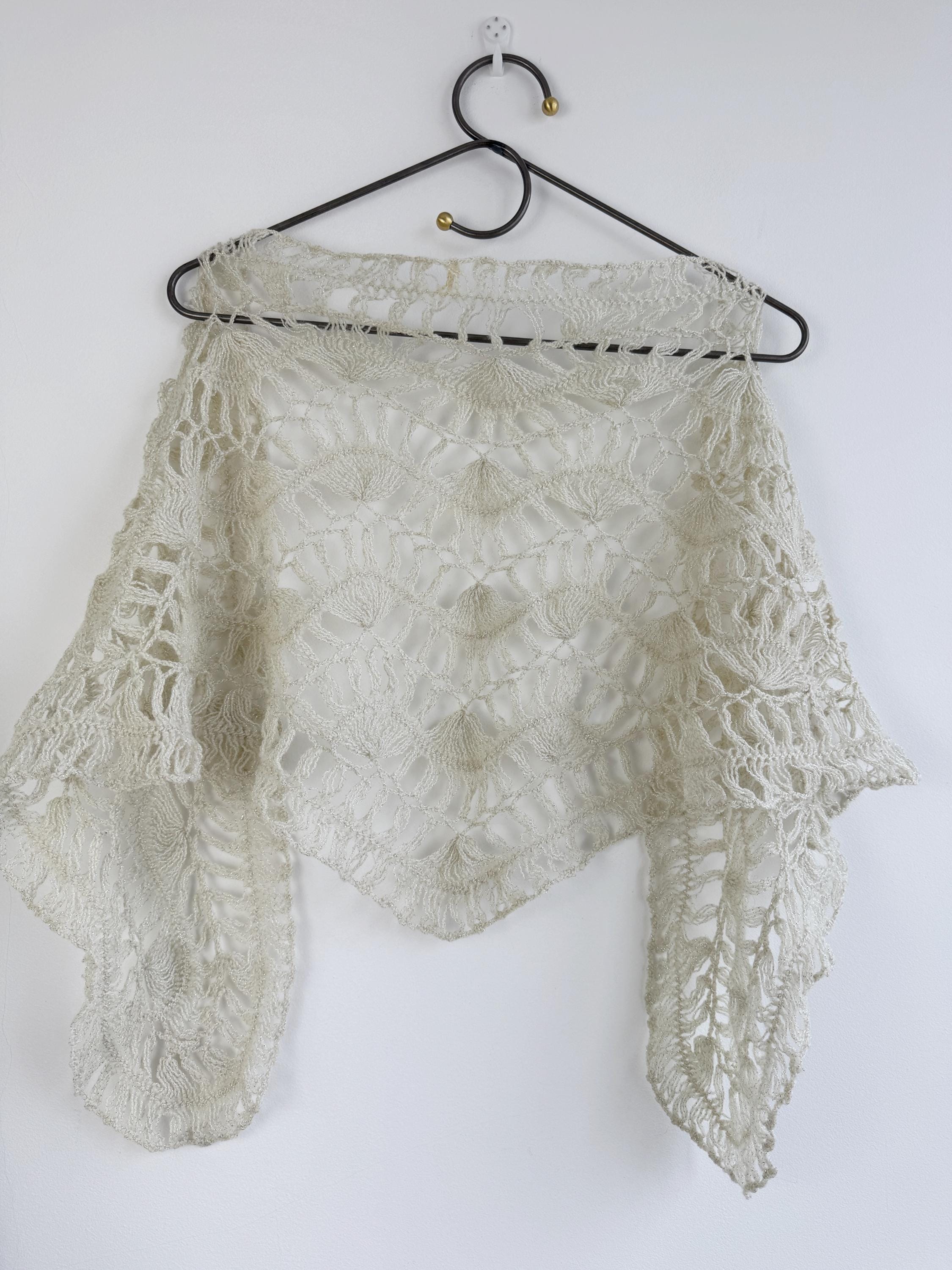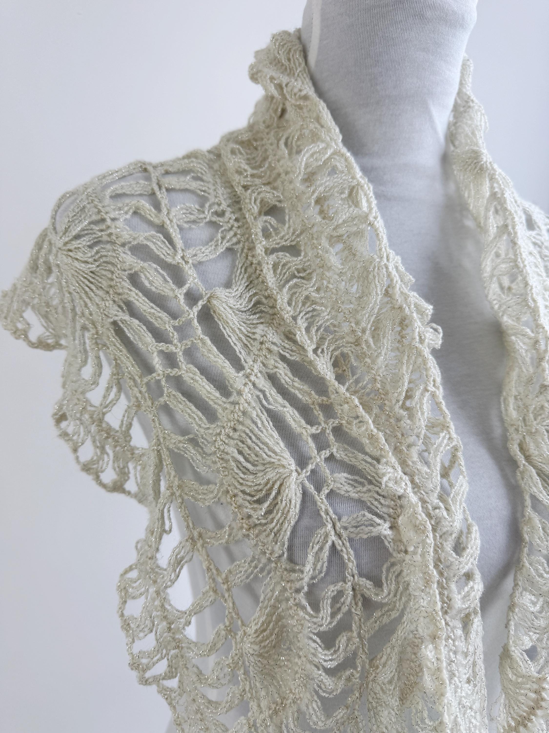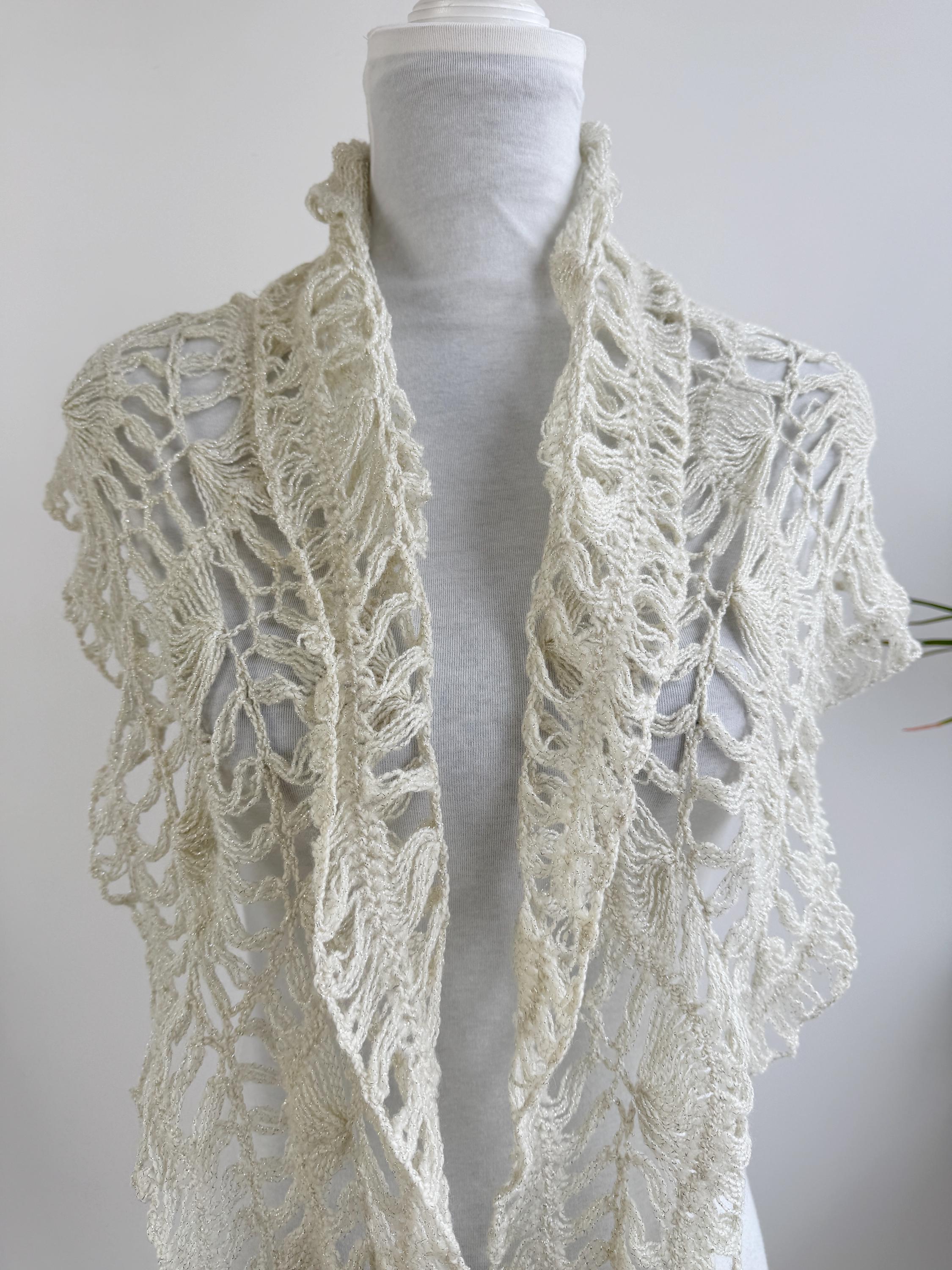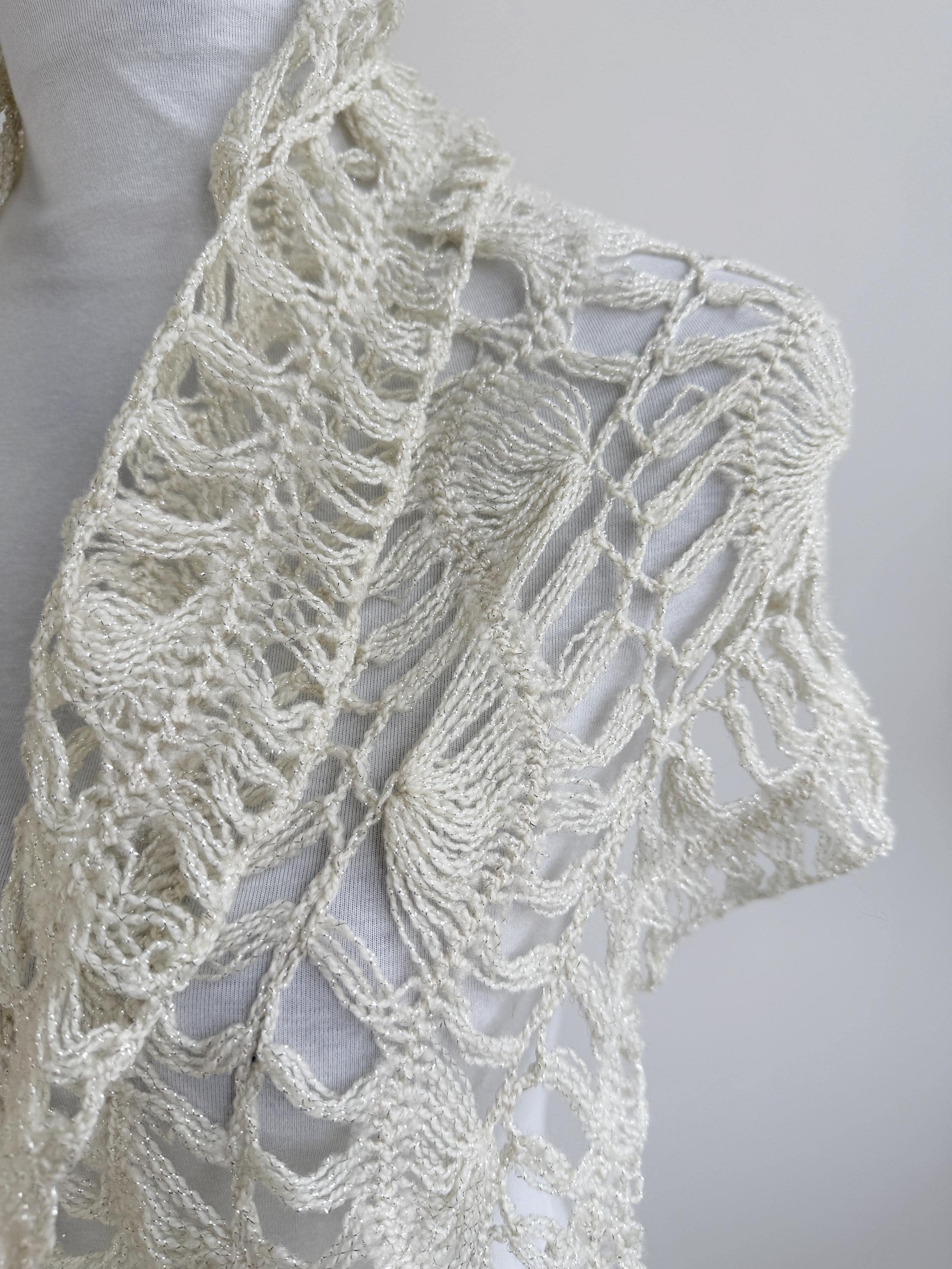 Elevate your evening attire with this exquisite vintage hand-crochet broomstick lace shawl. Featuring a delicate fan-shaped openwork pattern, this handmade wrap is crafted from a soft cream-white yarn interwoven with a subtle silver metallic thread that catches the light beautifully.