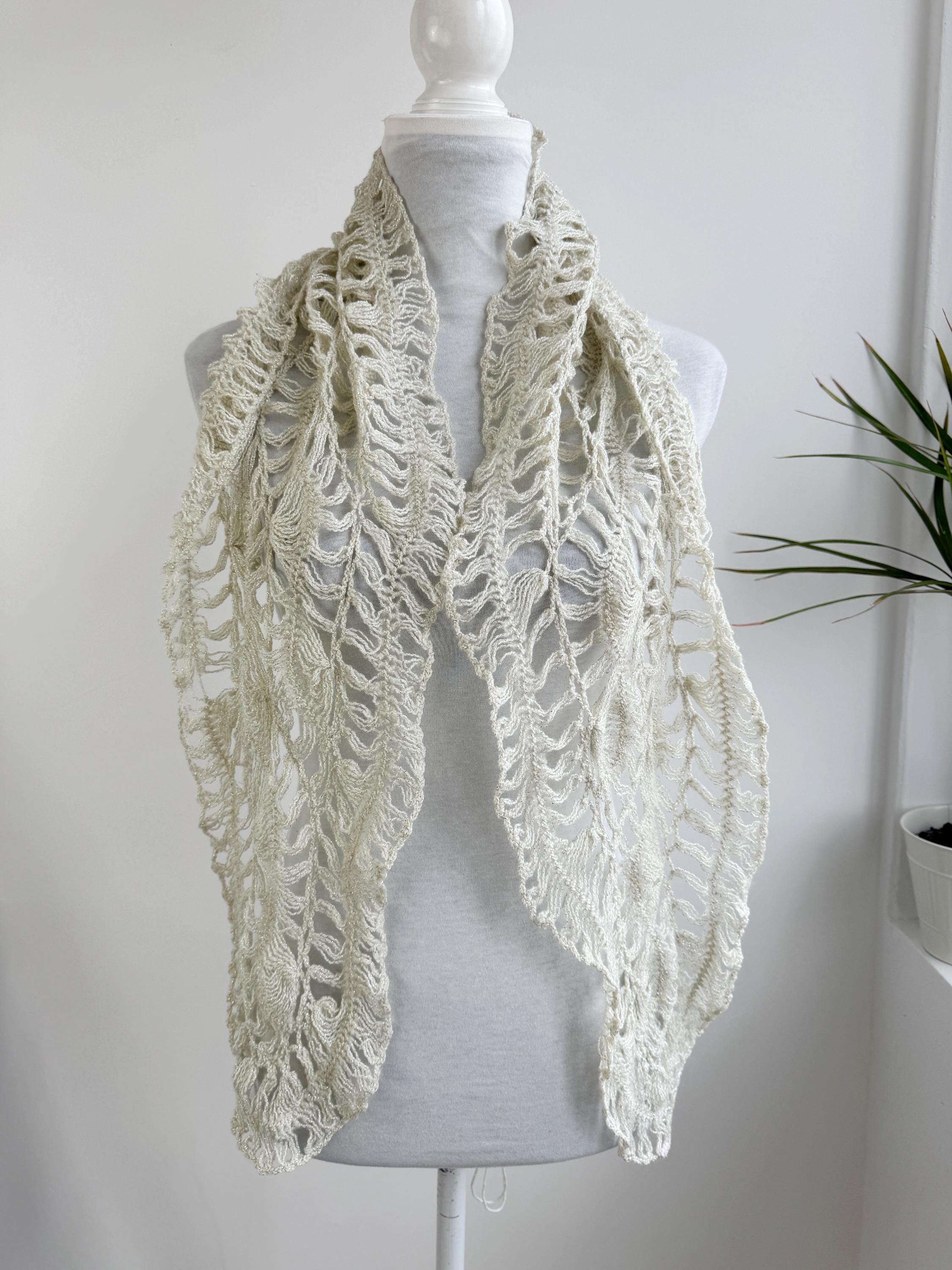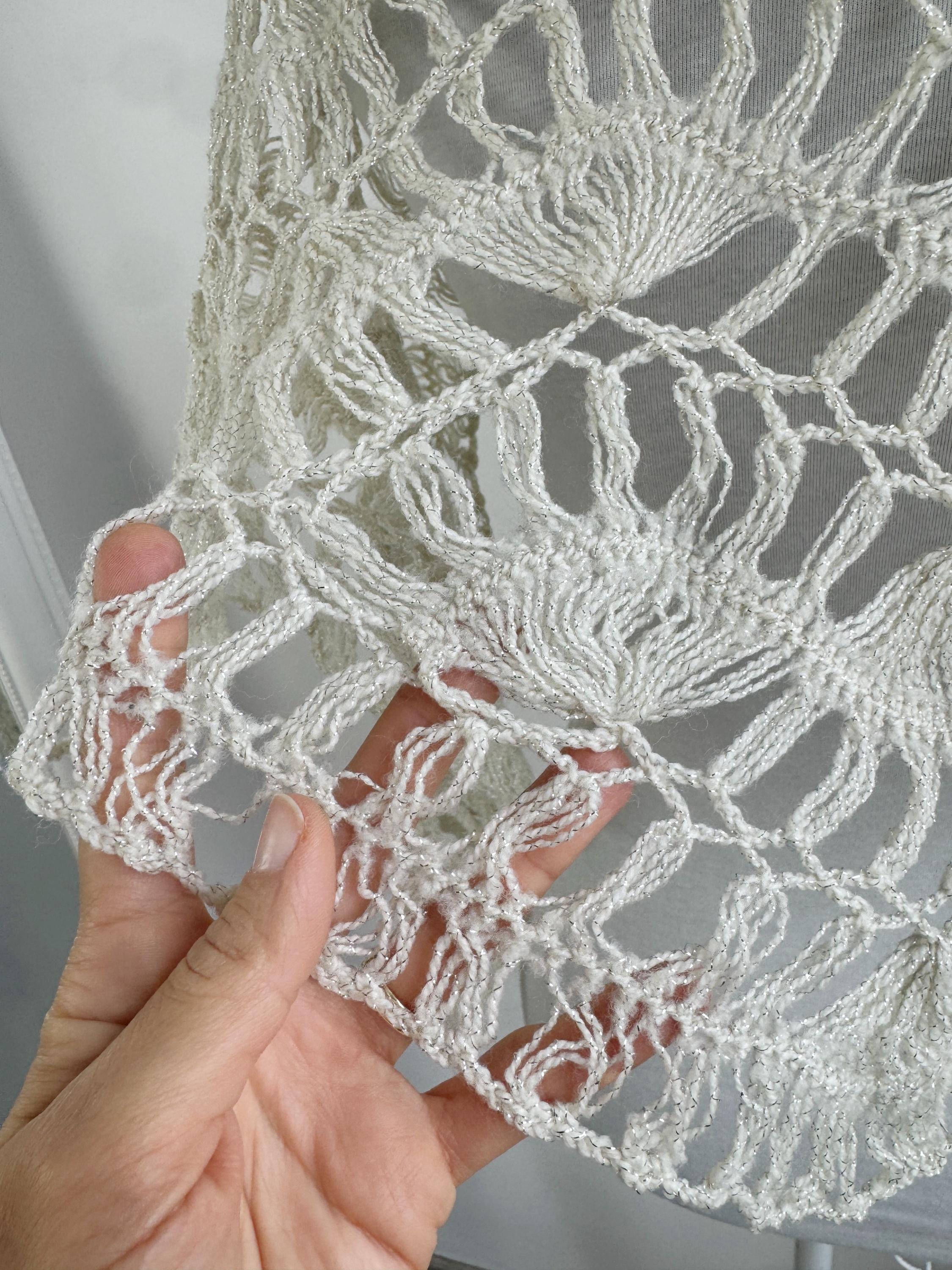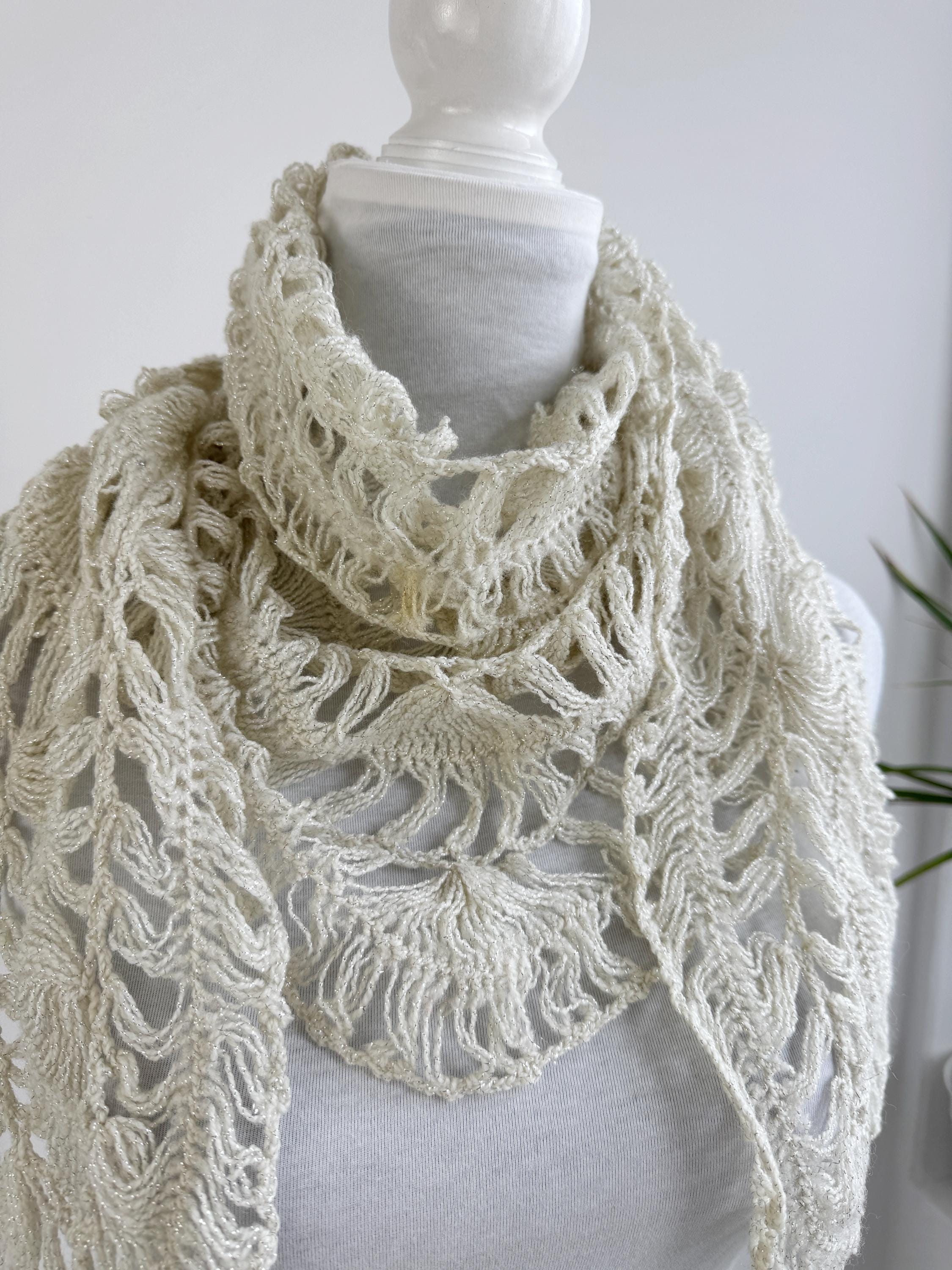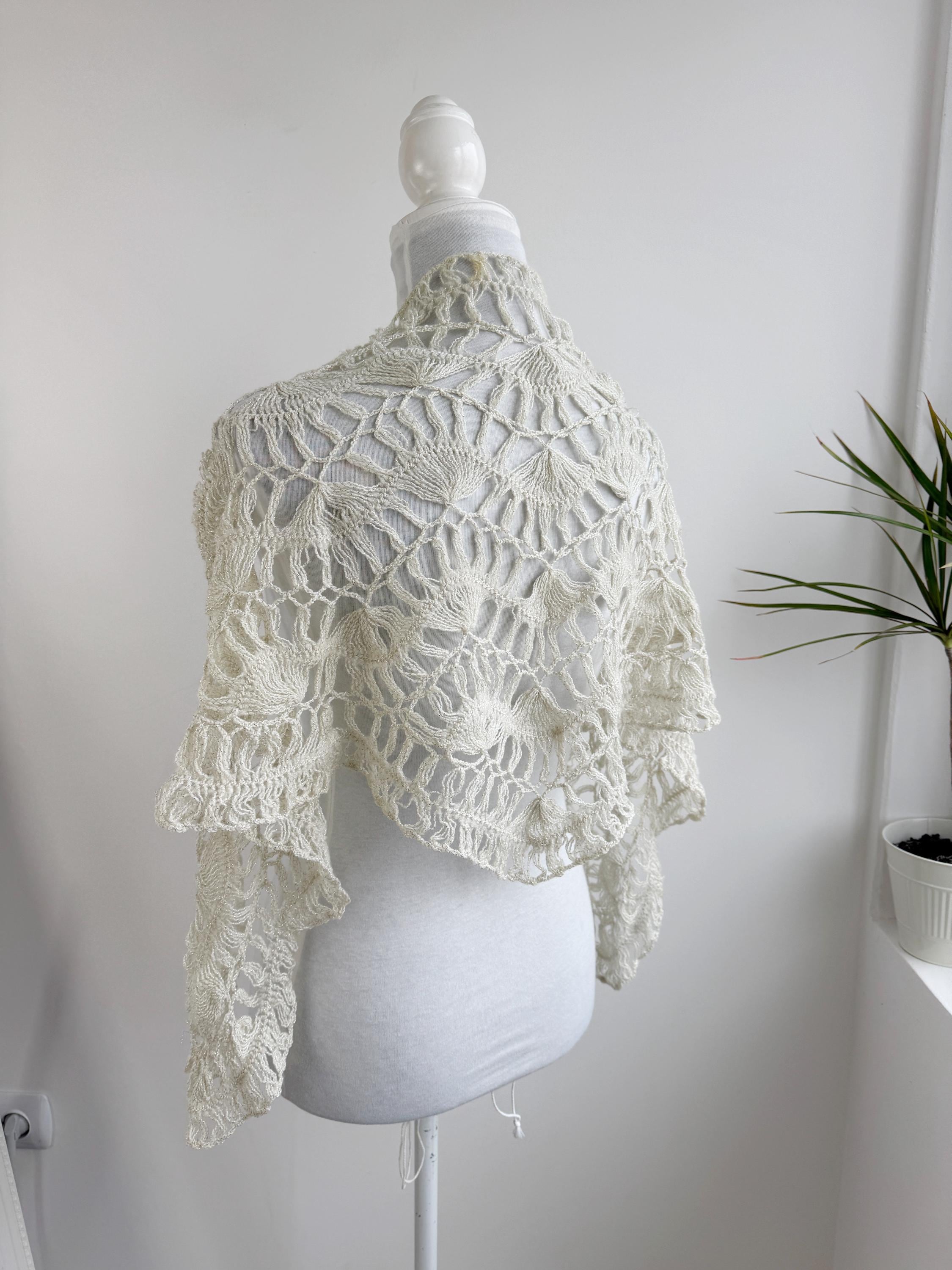 Elevate your evening attire with this exquisite vintage hand-crochet broomstick lace shawl. Featuring a delicate fan-shaped openwork pattern, this handmade wrap is crafted from a soft cream-white yarn interwoven with a subtle silver metallic thread that catches the light beautifully.