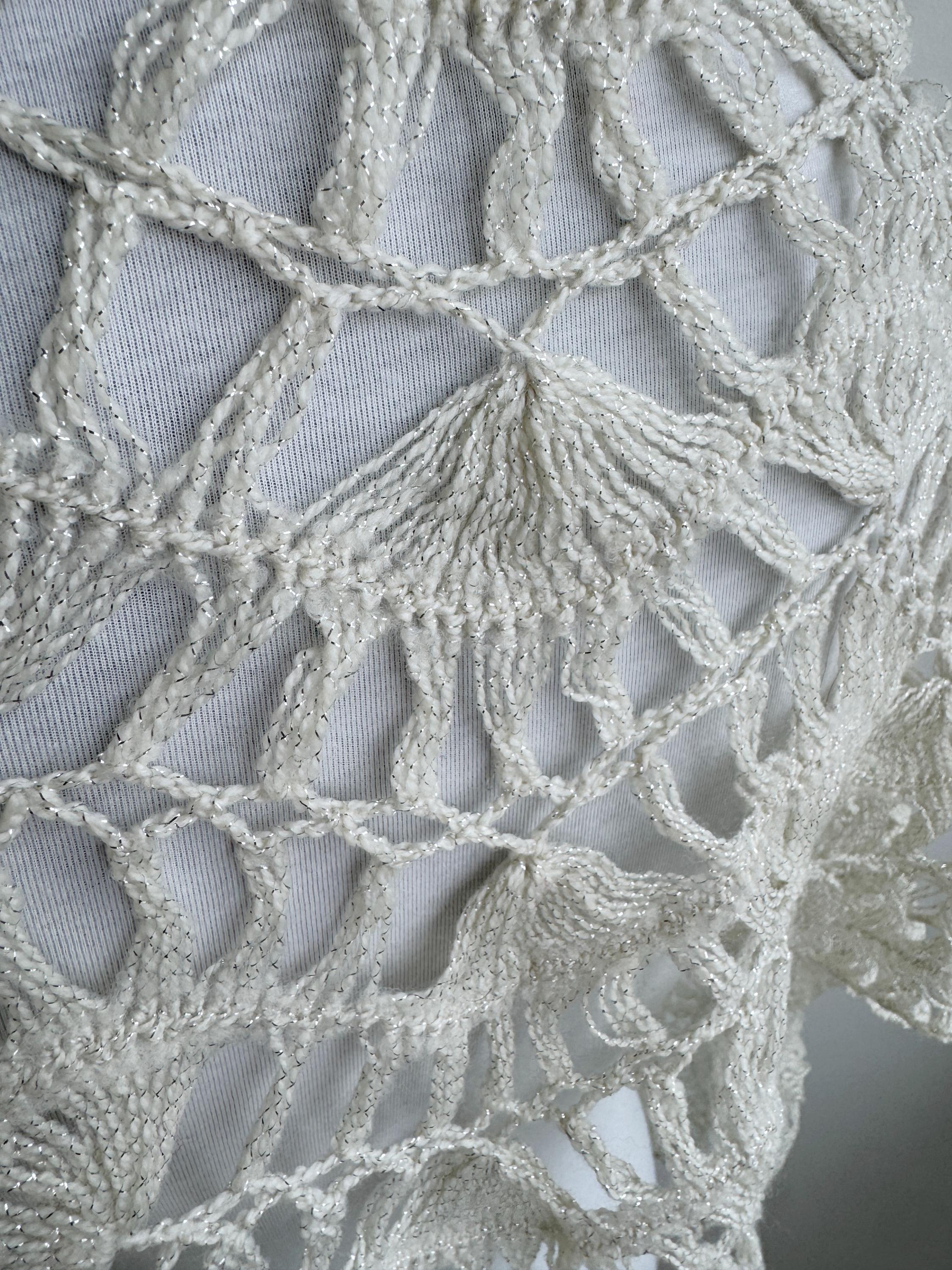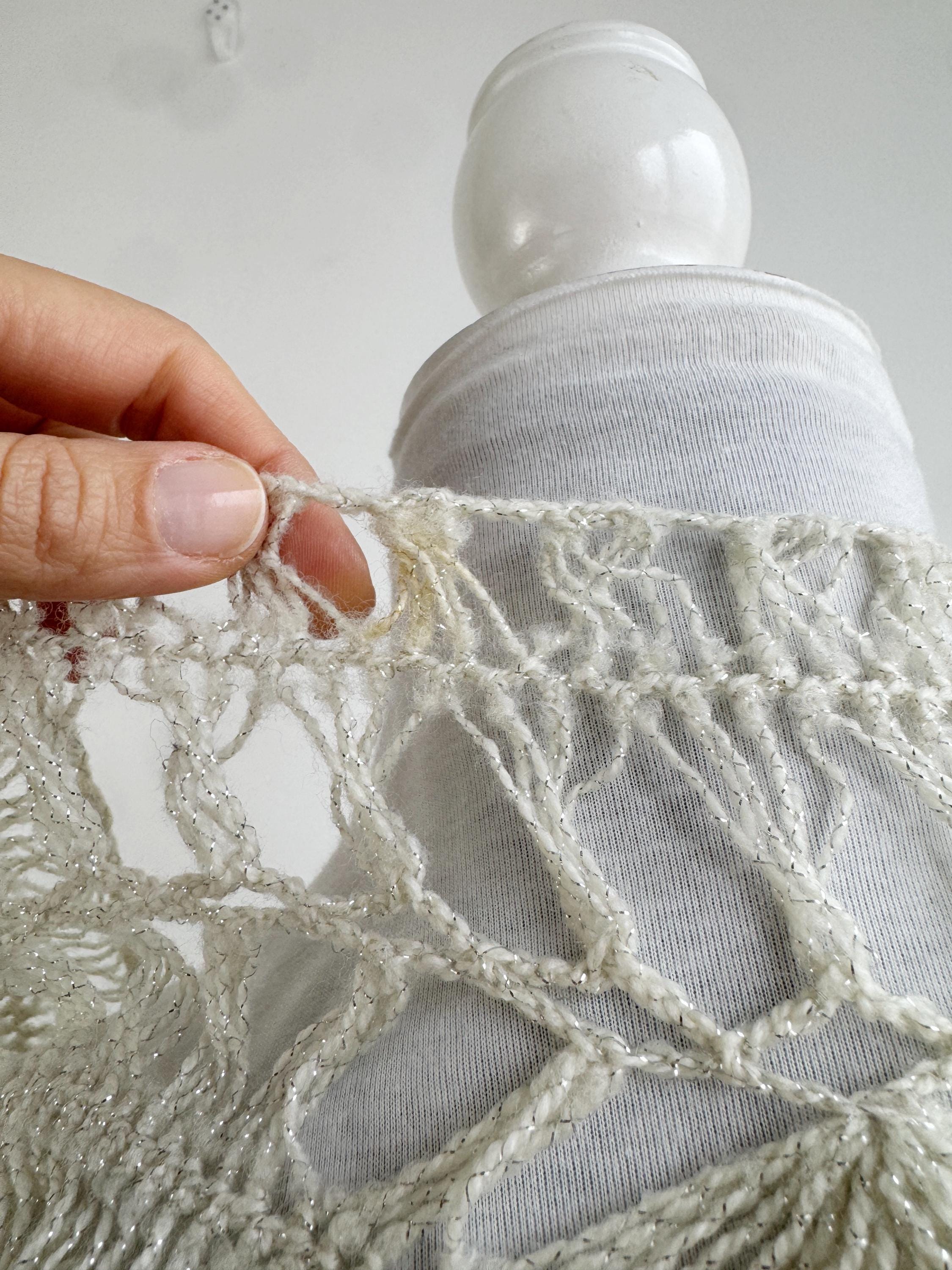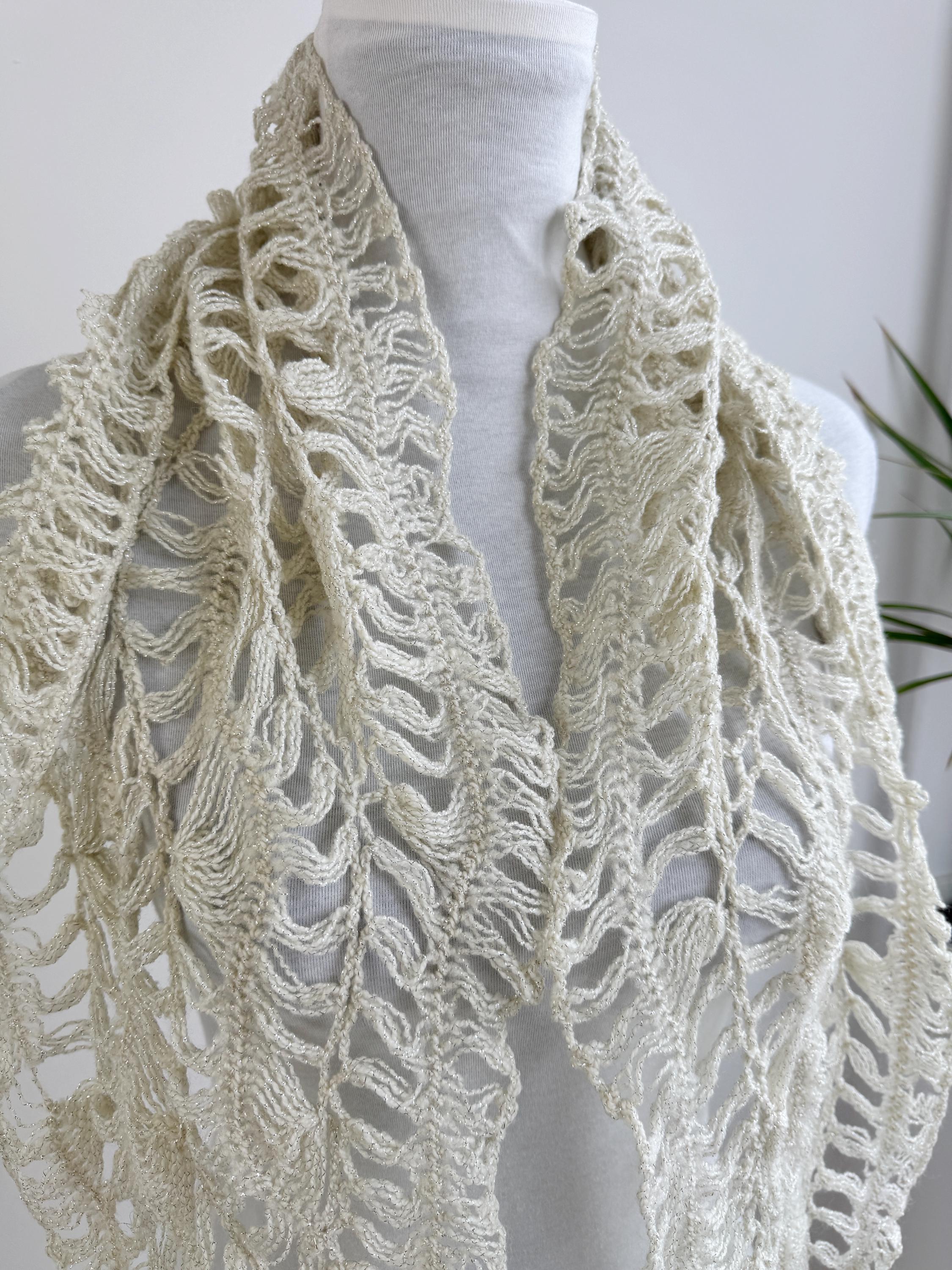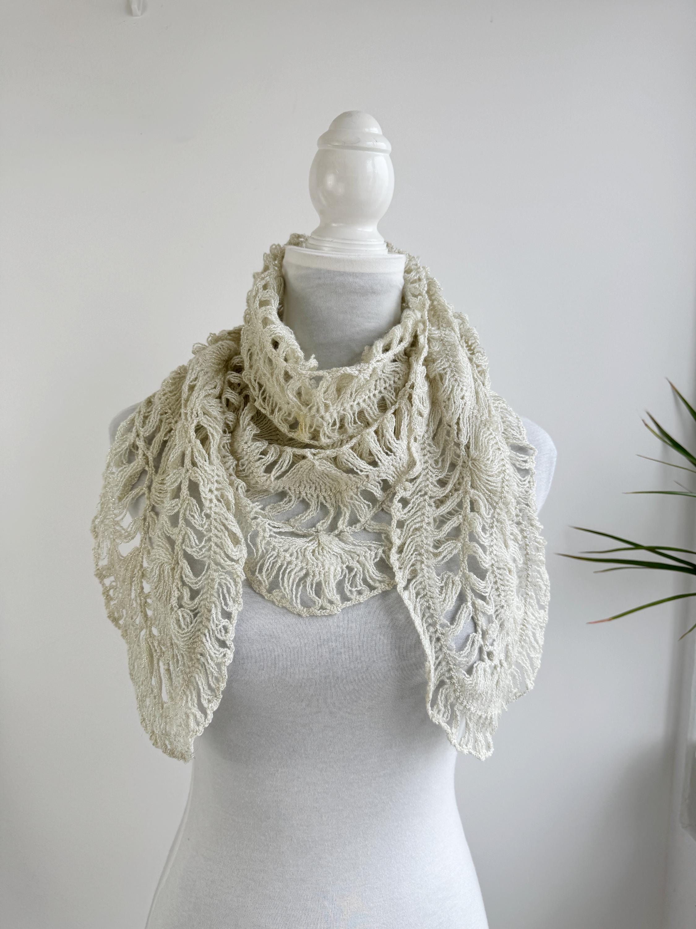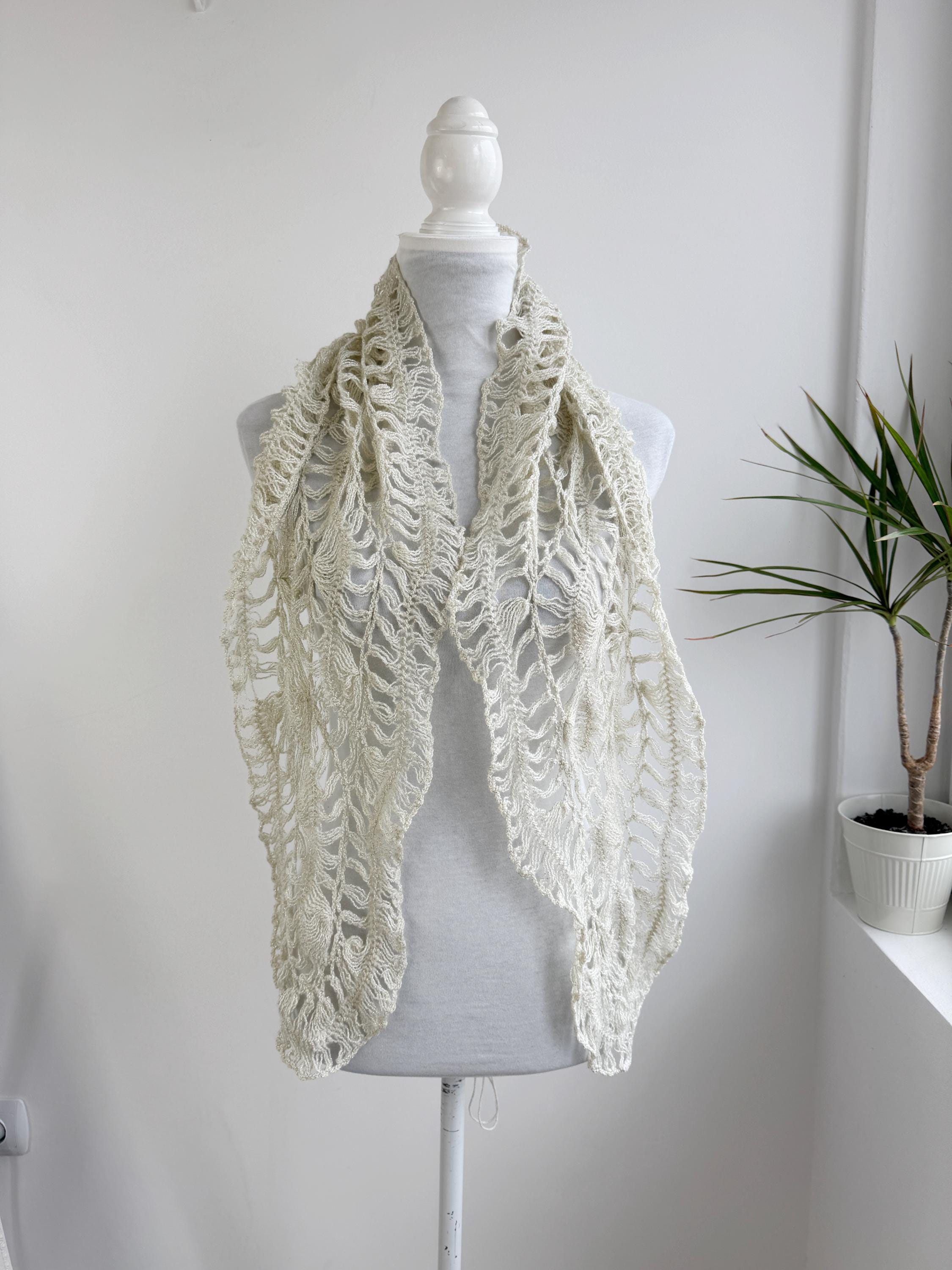 Elevate your evening attire with this exquisite vintage hand-crochet broomstick lace shawl. Featuring a delicate fan-shaped openwork pattern, this handmade wrap is crafted from a soft cream-white yarn interwoven with a subtle silver metallic thread that catches the light beautifully.