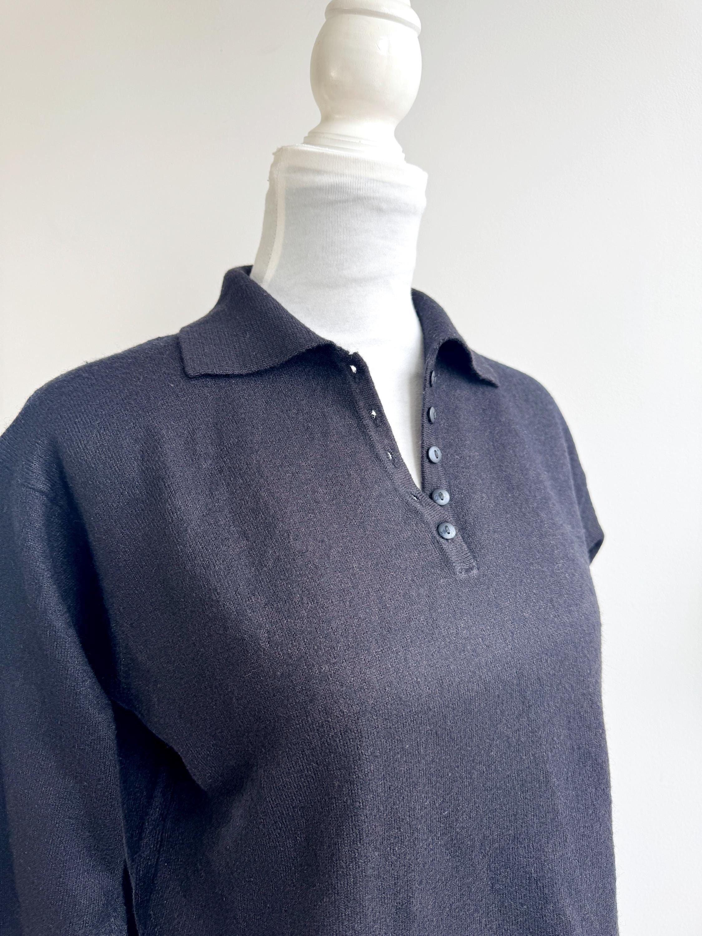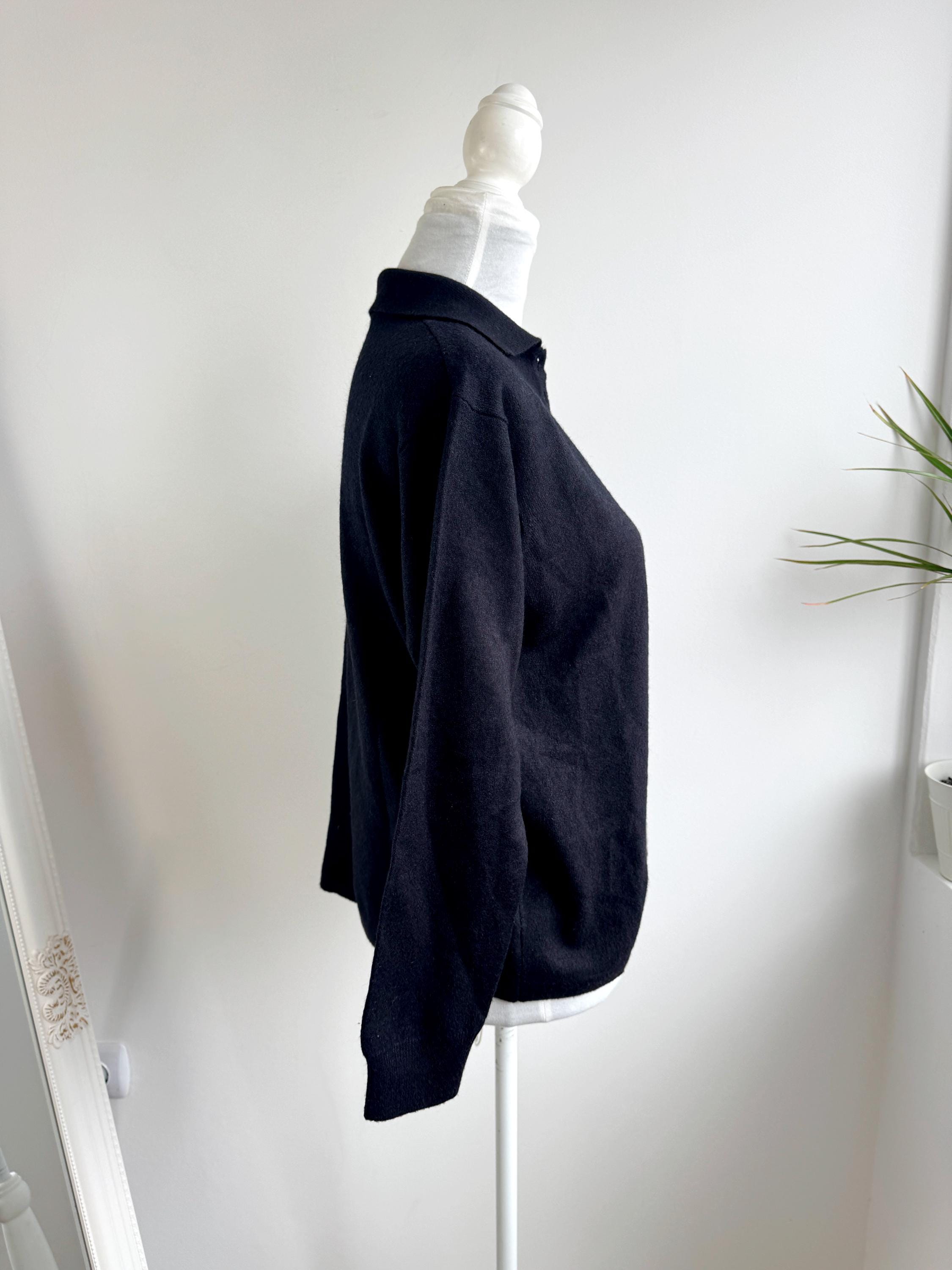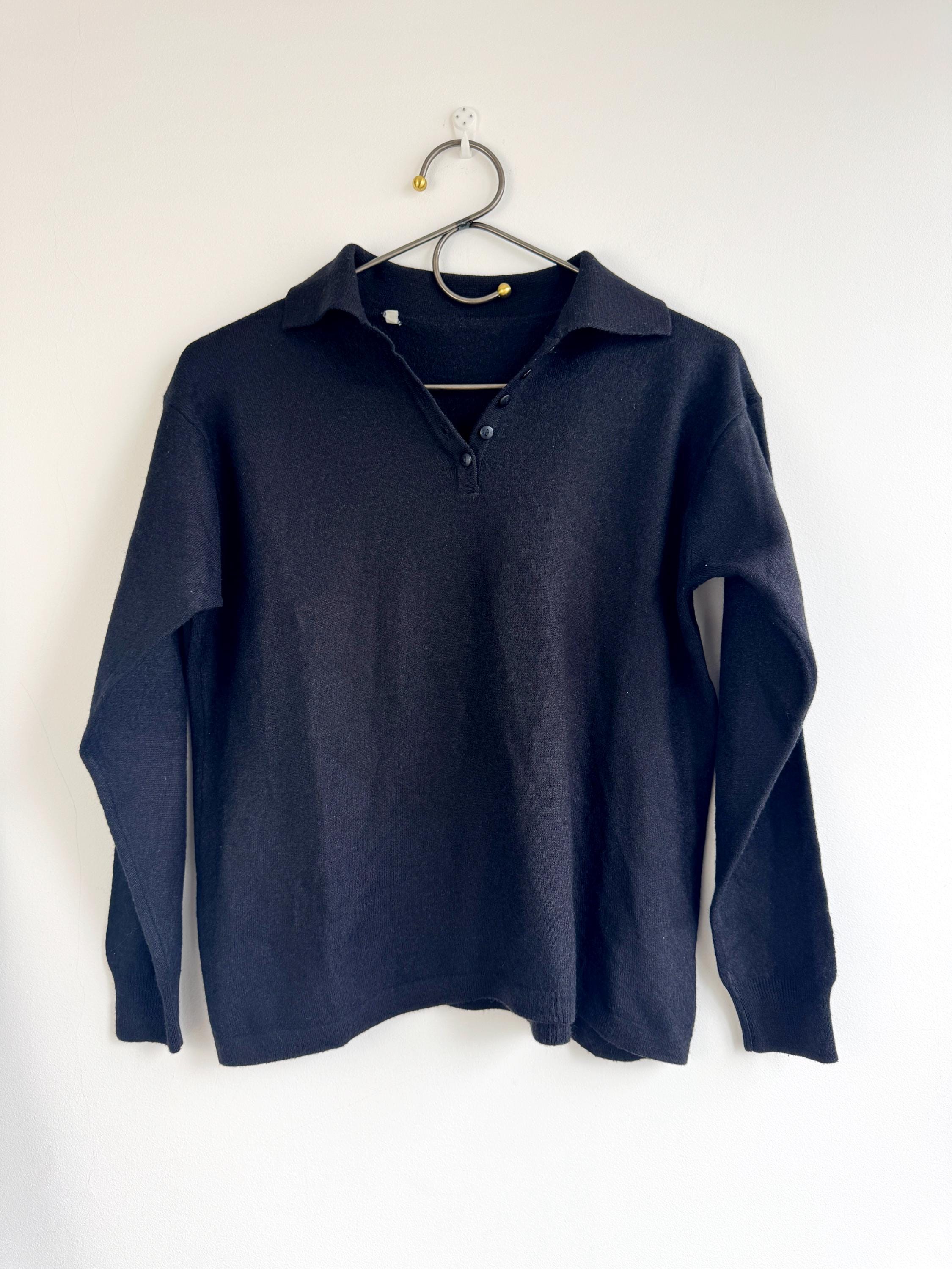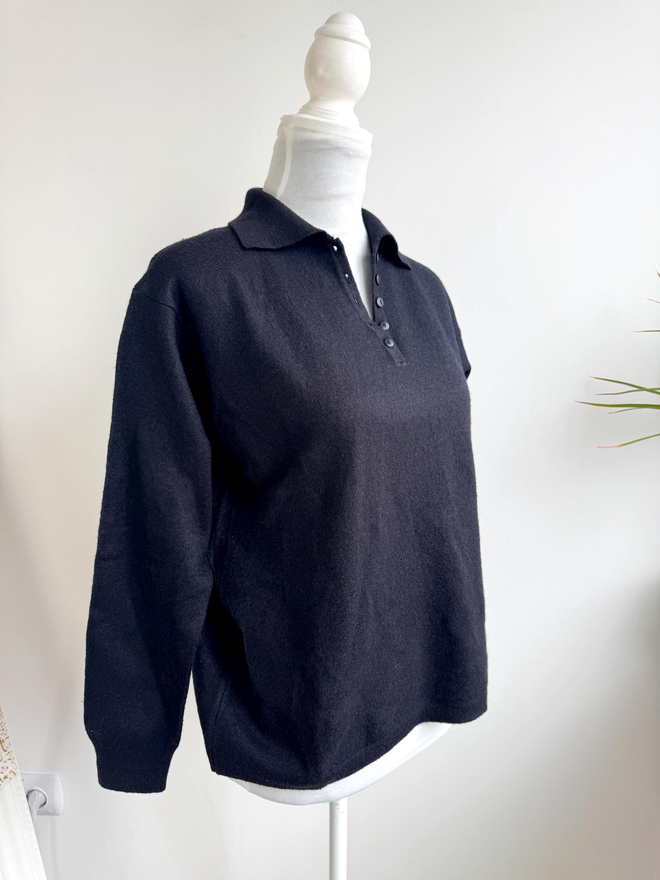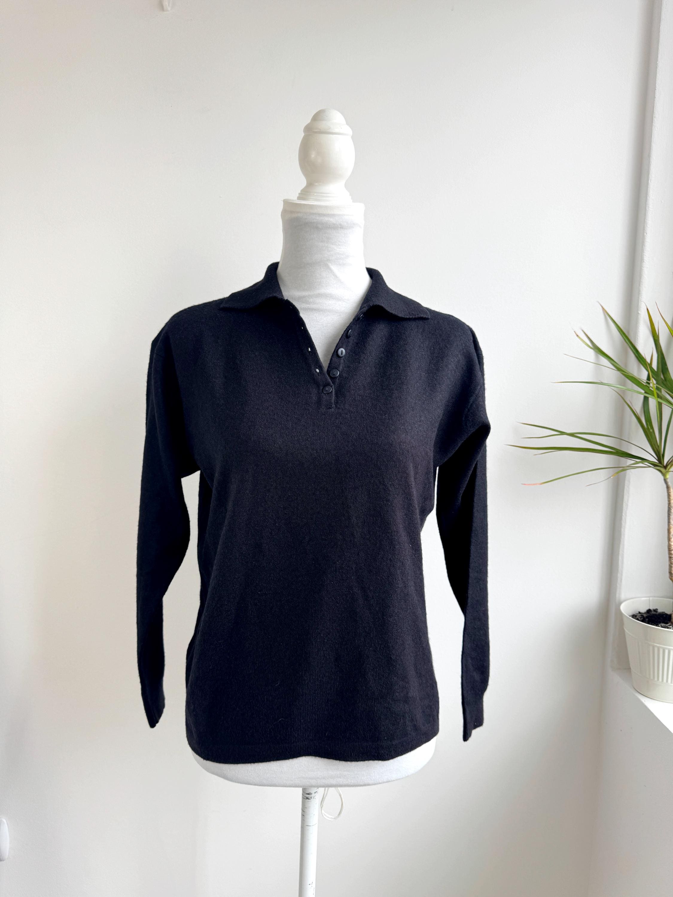 Step into timeless style with this classic vintage black knit polo sweater for women in size M. A perfect staple for any curated wardrobe, this classic vintage 90s pullover features a sophisticated collared neckline and a delicate four-button placket. The jet-black hue and soft, dense knit make it an incredibly versatile piece—ideal for layering over a crisp white shirt for a preppy look or wearing solo for that effortless minimalist aesthetic. Whether you're channeling dark academia vibes or looking for a cozy yet polished office outfit, this high-quality knit offers both comfort and retro charm.