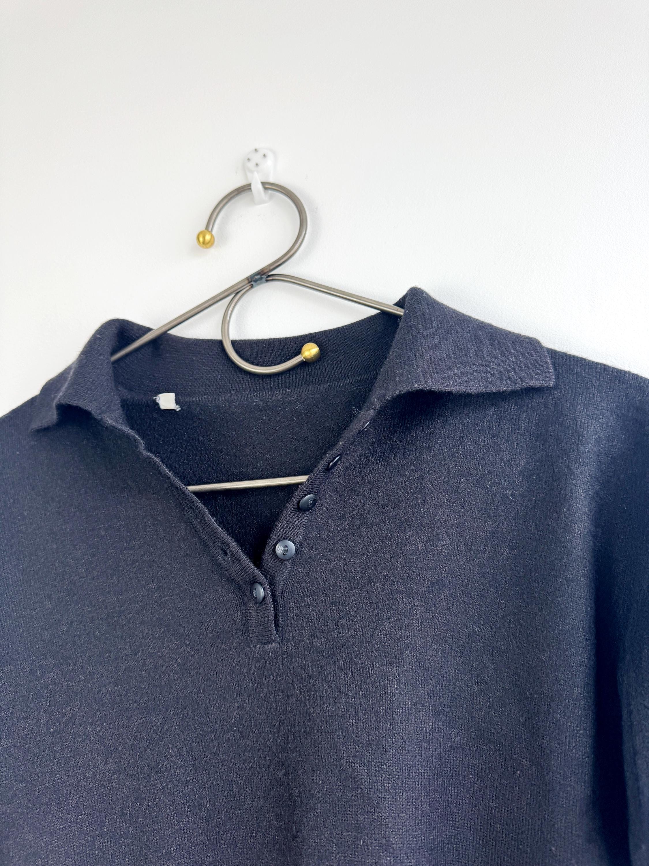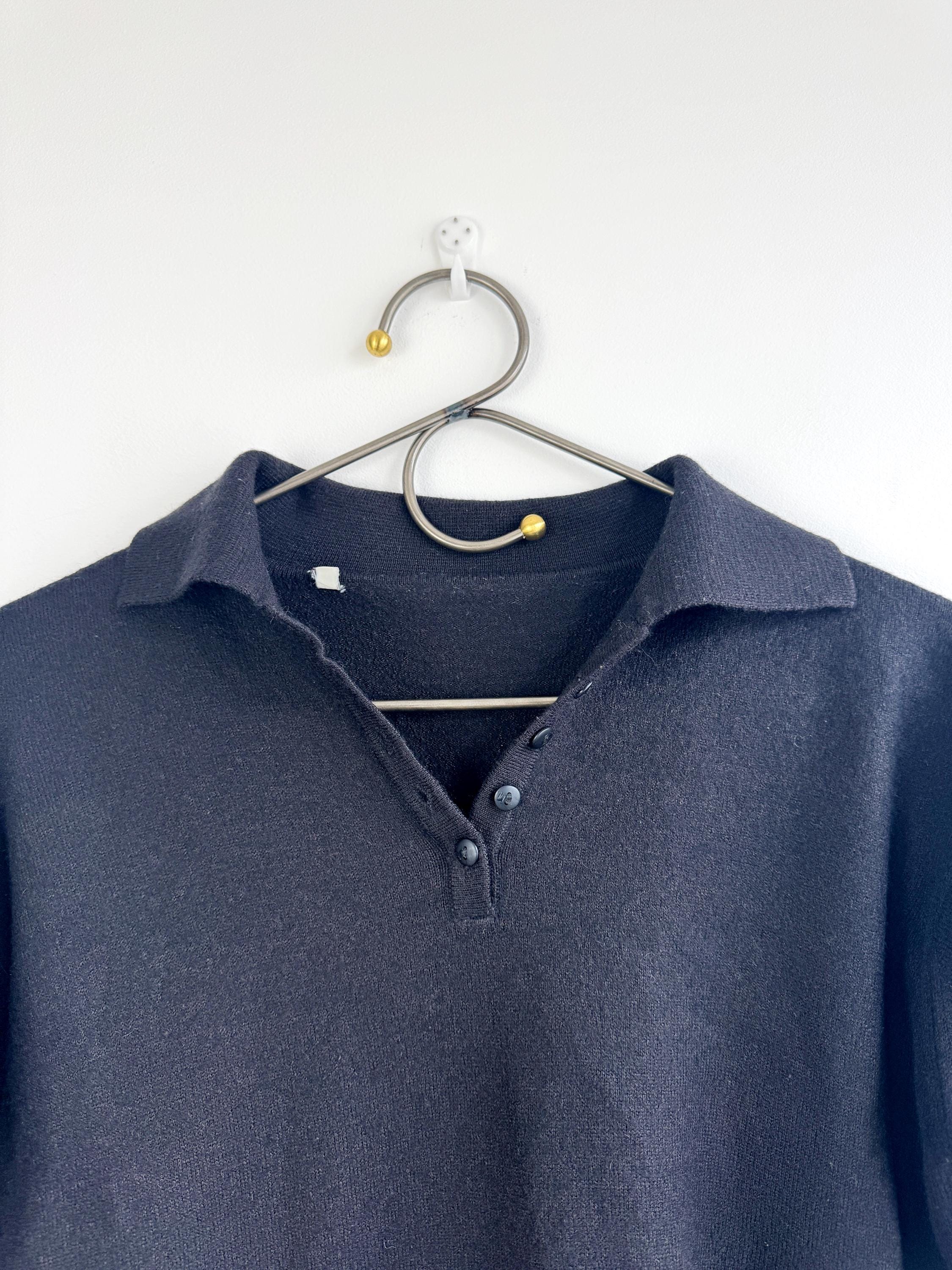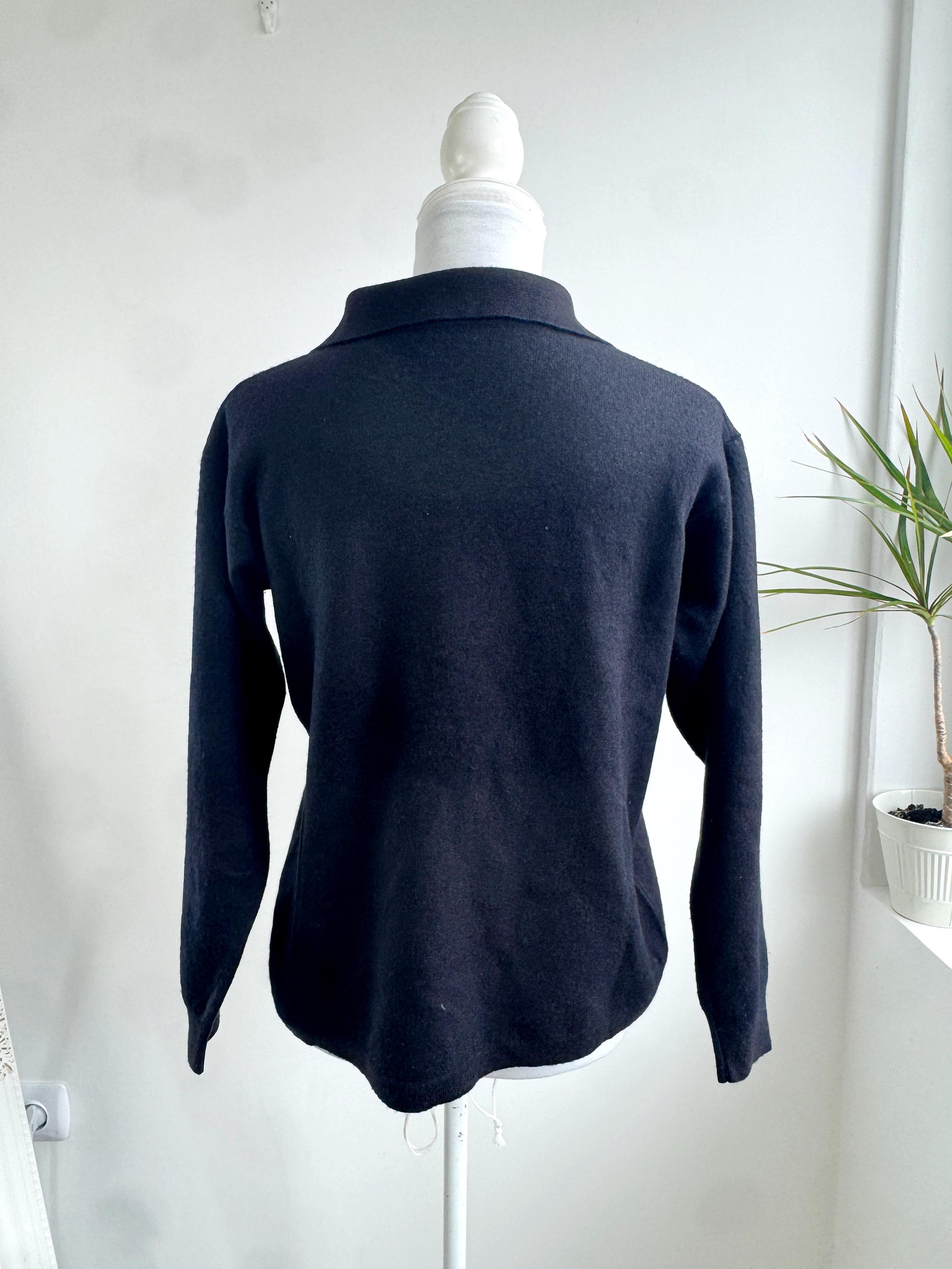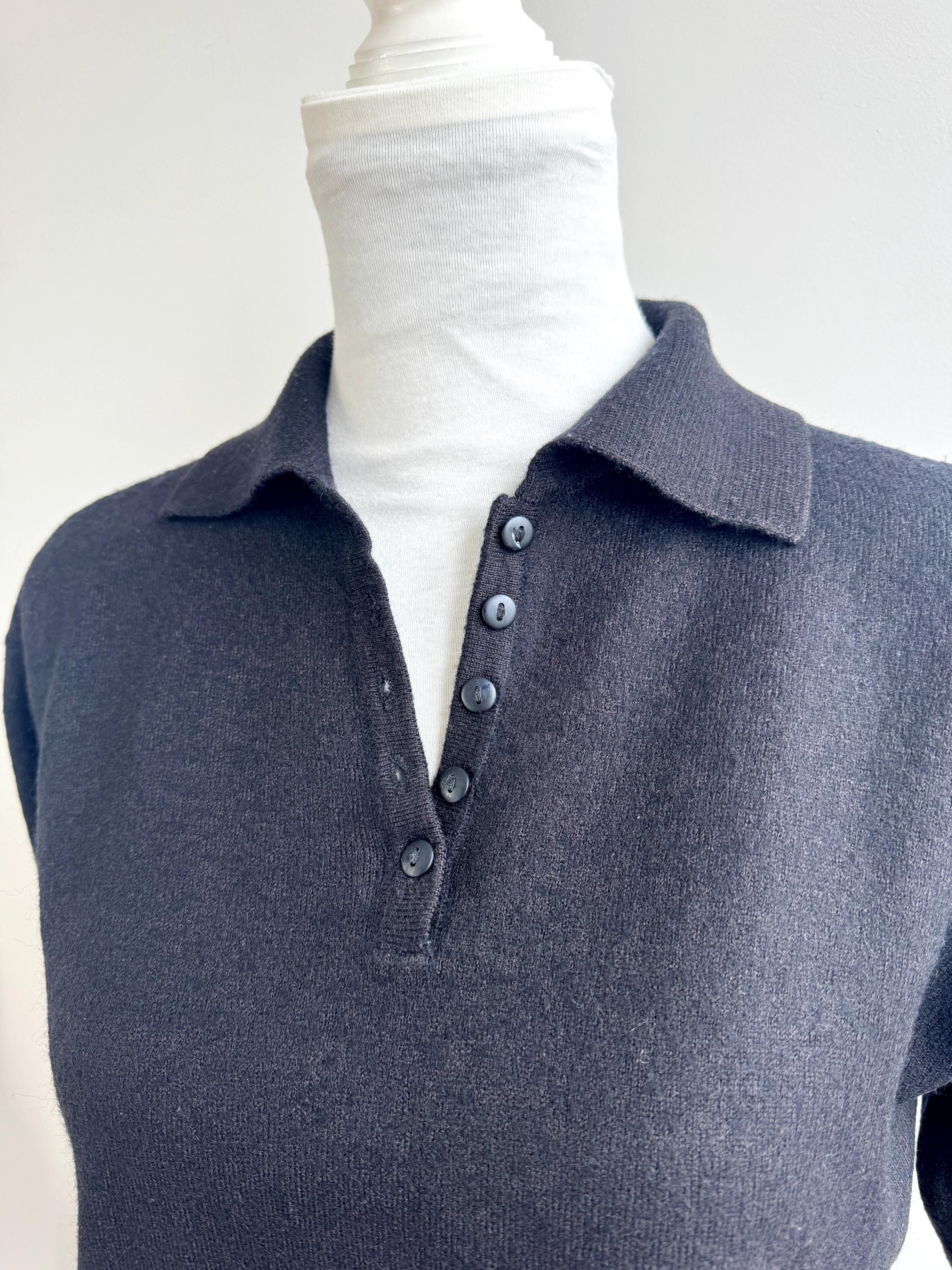 Step into timeless style with this classic vintage black knit polo sweater for women in size M. A perfect staple for any curated wardrobe, this classic vintage 90s pullover features a sophisticated collared neckline and a delicate four-button placket. The jet-black hue and soft, dense knit make it an incredibly versatile piece—ideal for layering over a crisp white shirt for a preppy look or wearing solo for that effortless minimalist aesthetic. Whether you're channeling dark academia vibes or looking for a cozy yet polished office outfit, this high-quality knit offers both comfort and retro charm.
