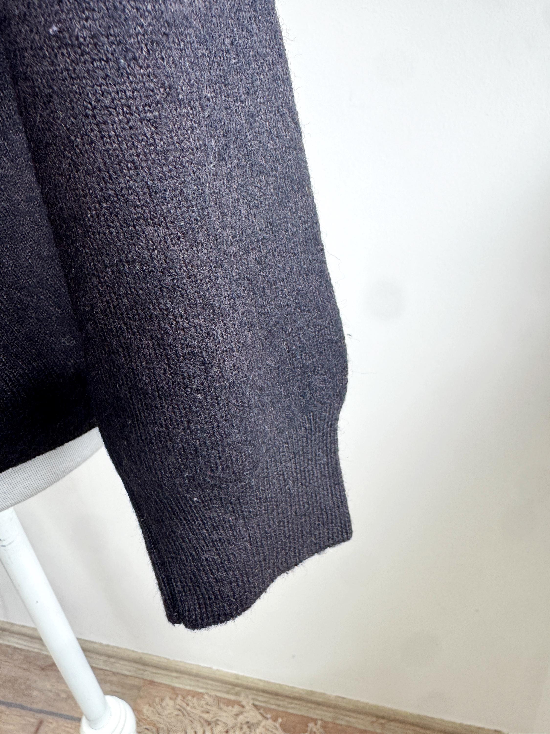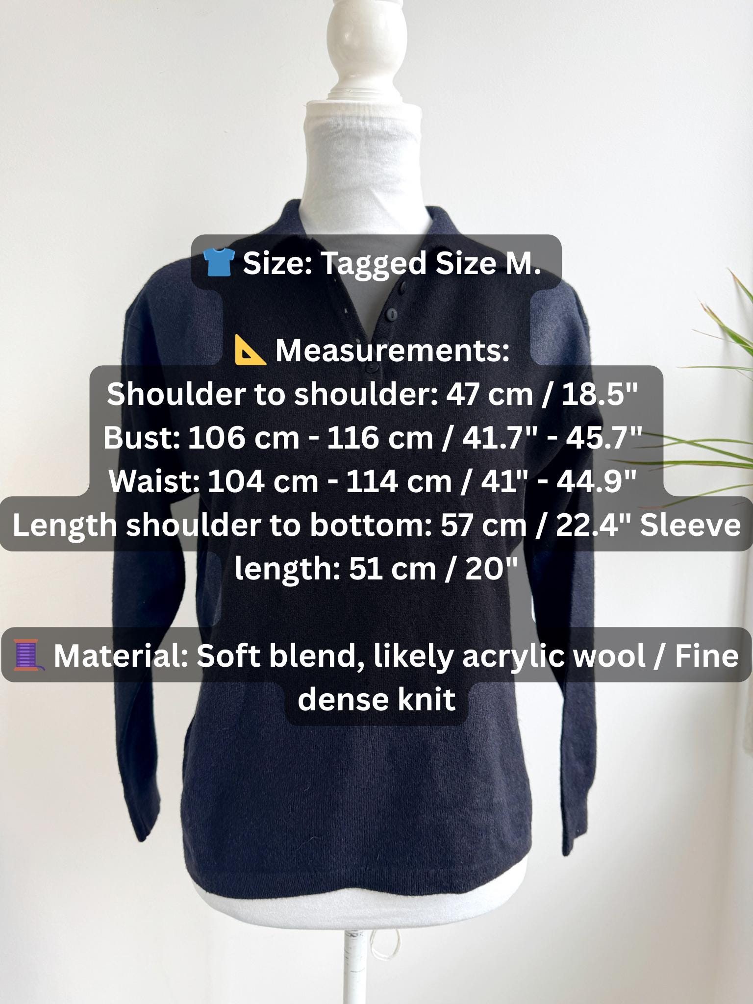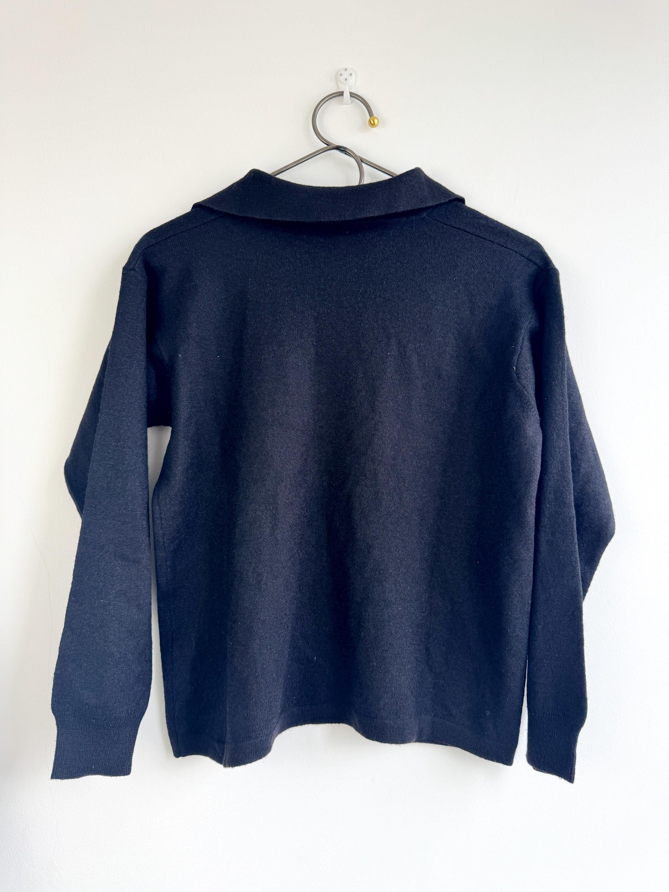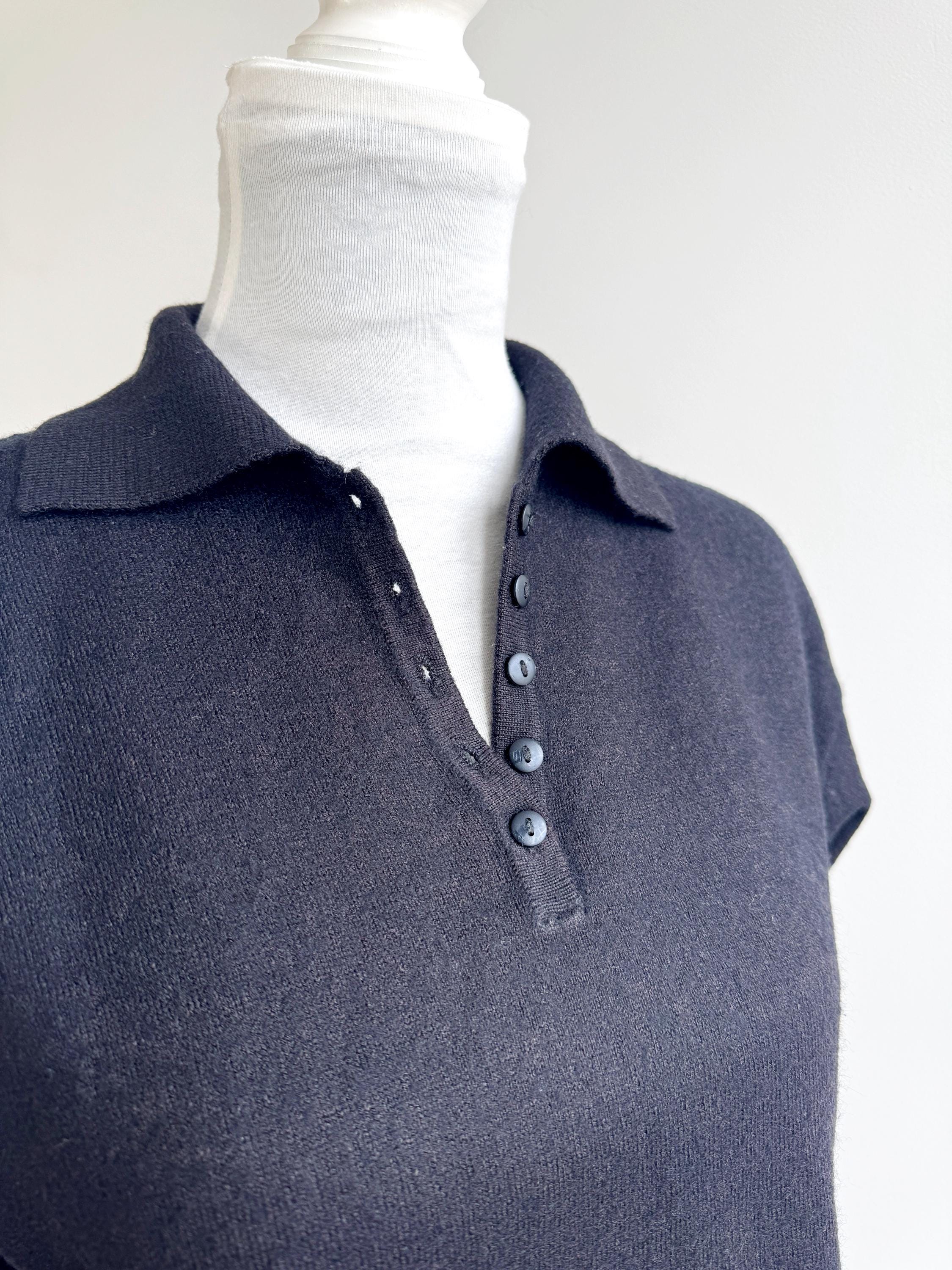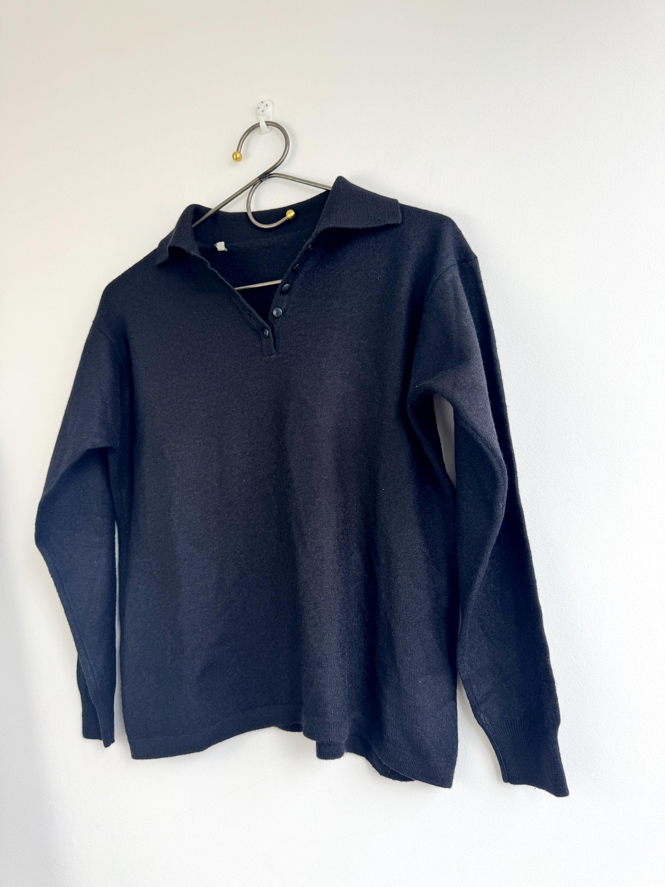 Step into timeless style with this classic vintage black knit polo sweater for women in size M. A perfect staple for any curated wardrobe, this classic vintage 90s pullover features a sophisticated collared neckline and a delicate four-button placket. The jet-black hue and soft, dense knit make it an incredibly versatile piece—ideal for layering over a crisp white shirt for a preppy look or wearing solo for that effortless minimalist aesthetic. Whether you're channeling dark academia vibes or looking for a cozy yet polished office outfit, this high-quality knit offers both comfort and retro charm.