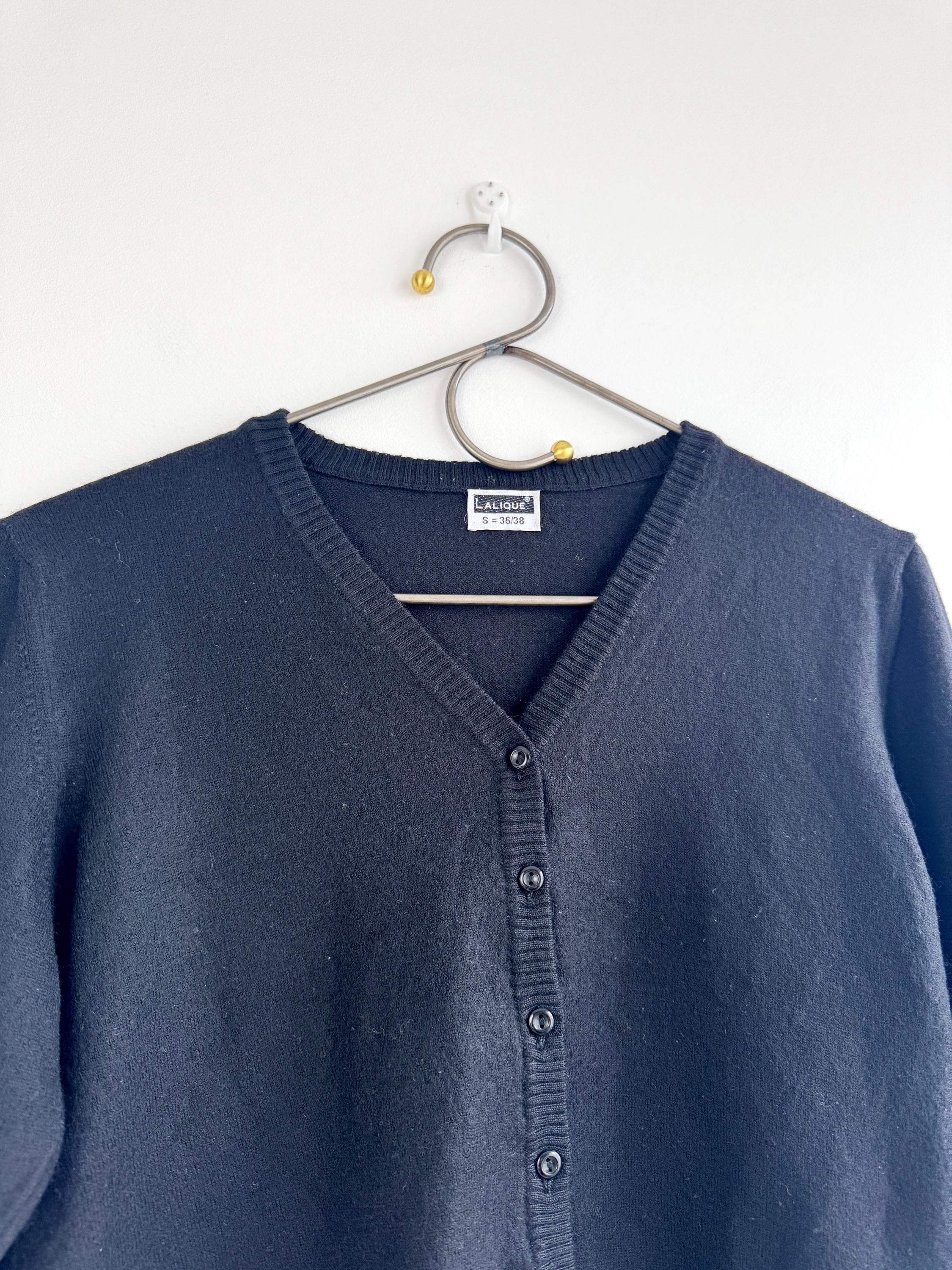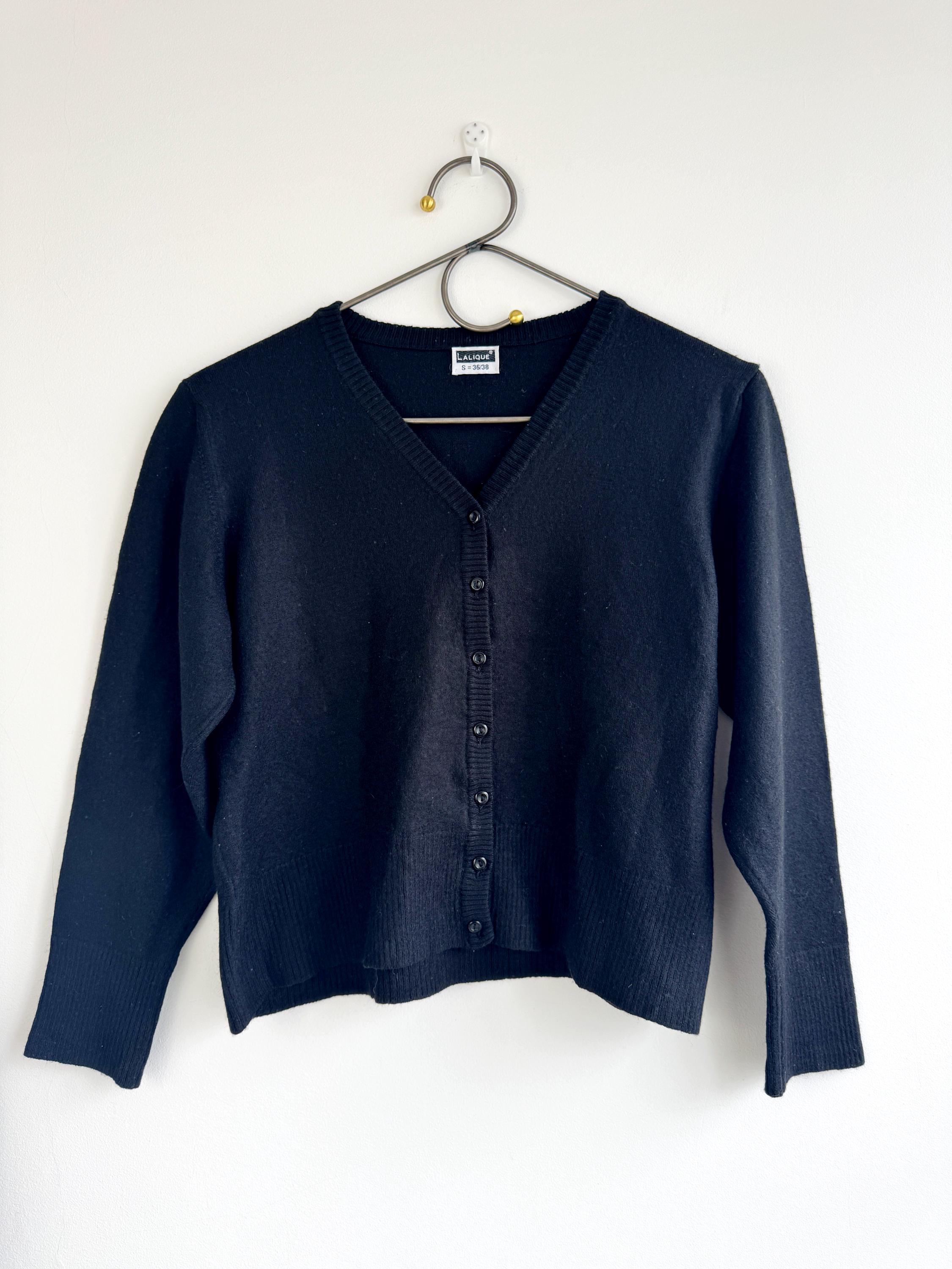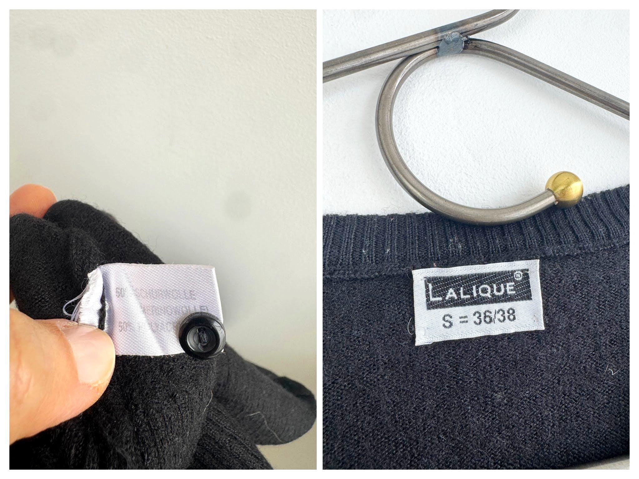 This Lalique cardigan for women is a beautiful example of minimalist 90s chic. It features a cropped silhouette that hits perfectly at the waist, making it an ideal companion for high-waisted trousers or layered over a slip dress. The knit is fine and soft, providing warmth without bulk, and the deep V-neckline offers a flattering, elongated look.