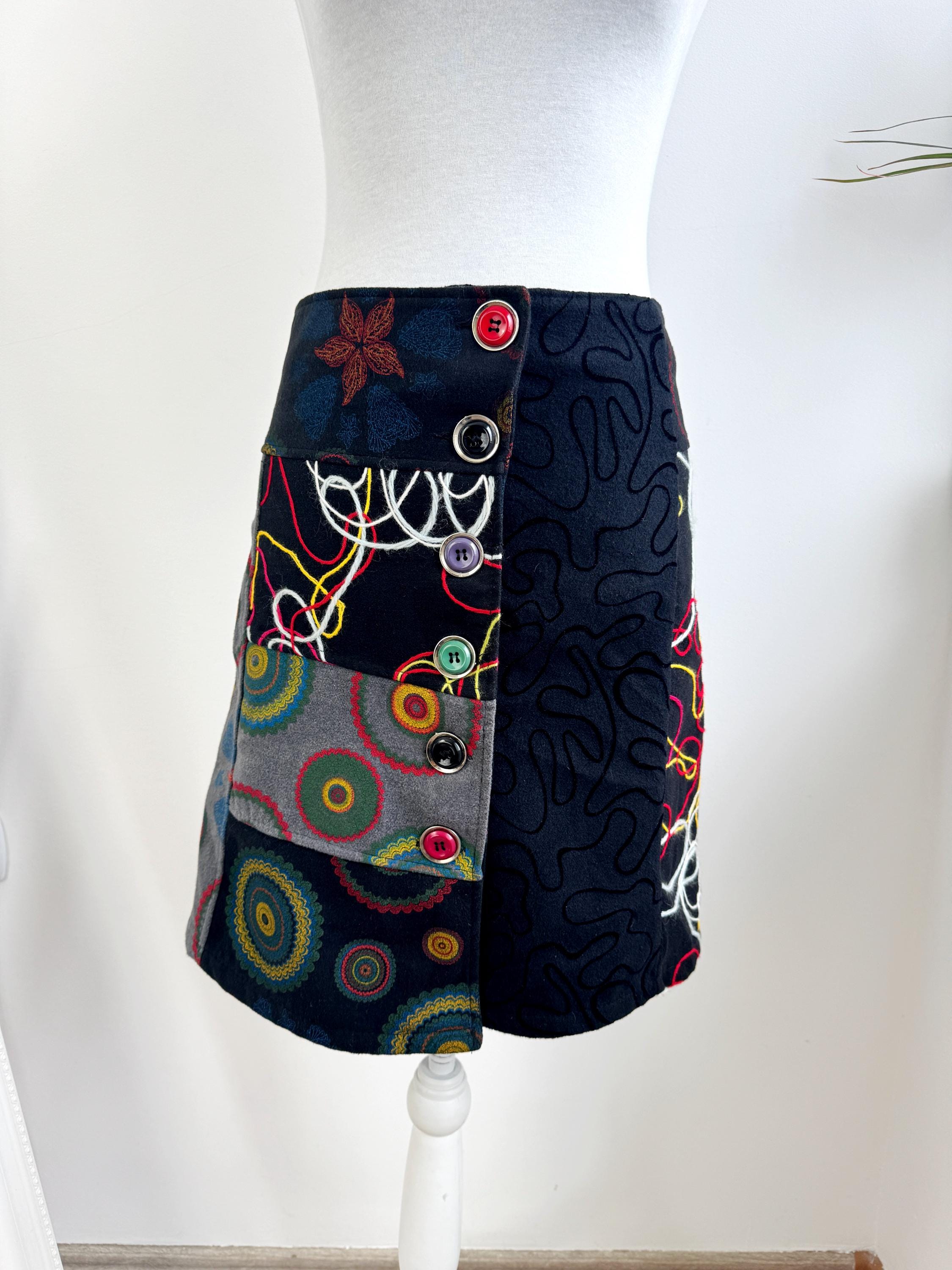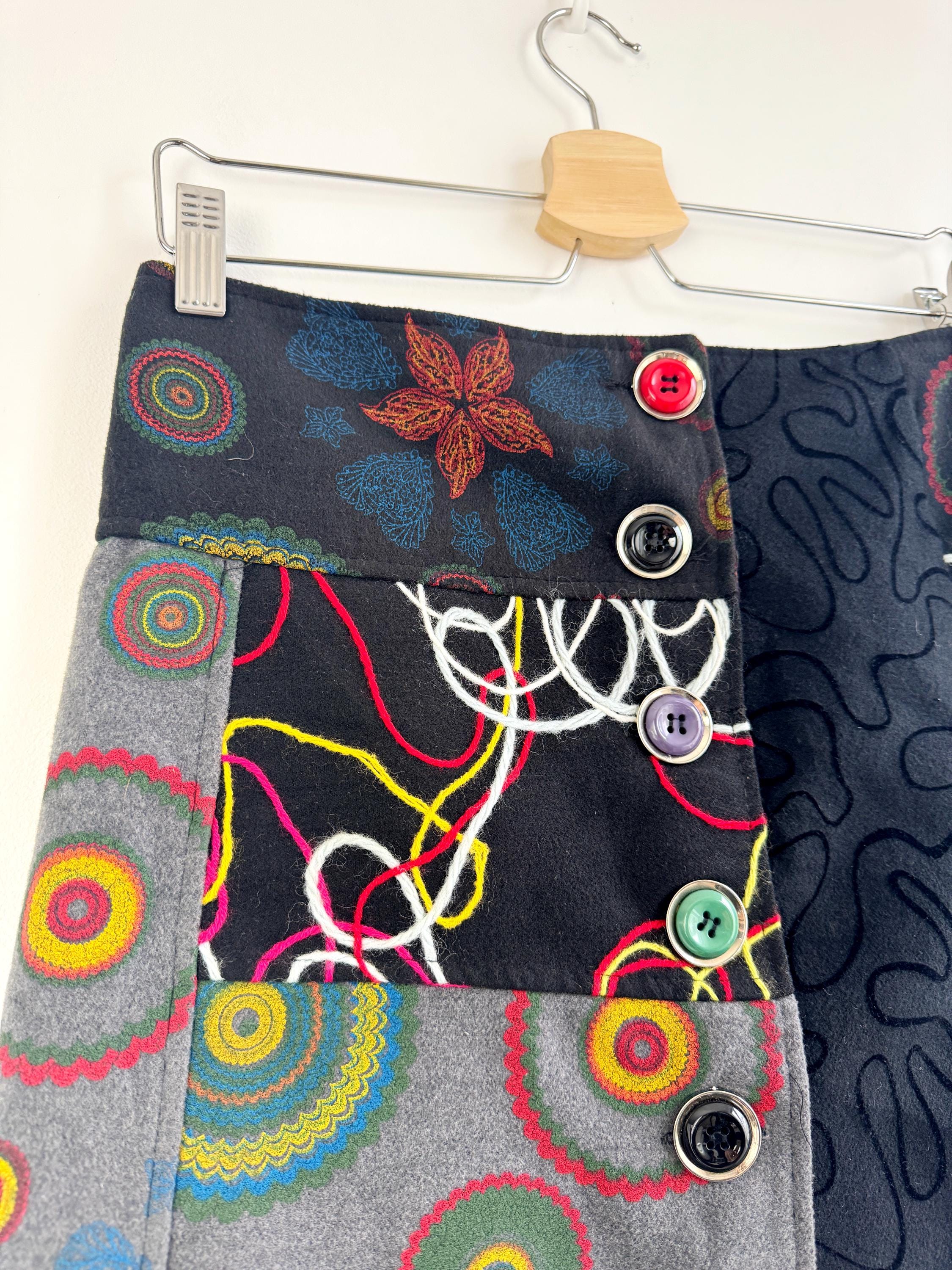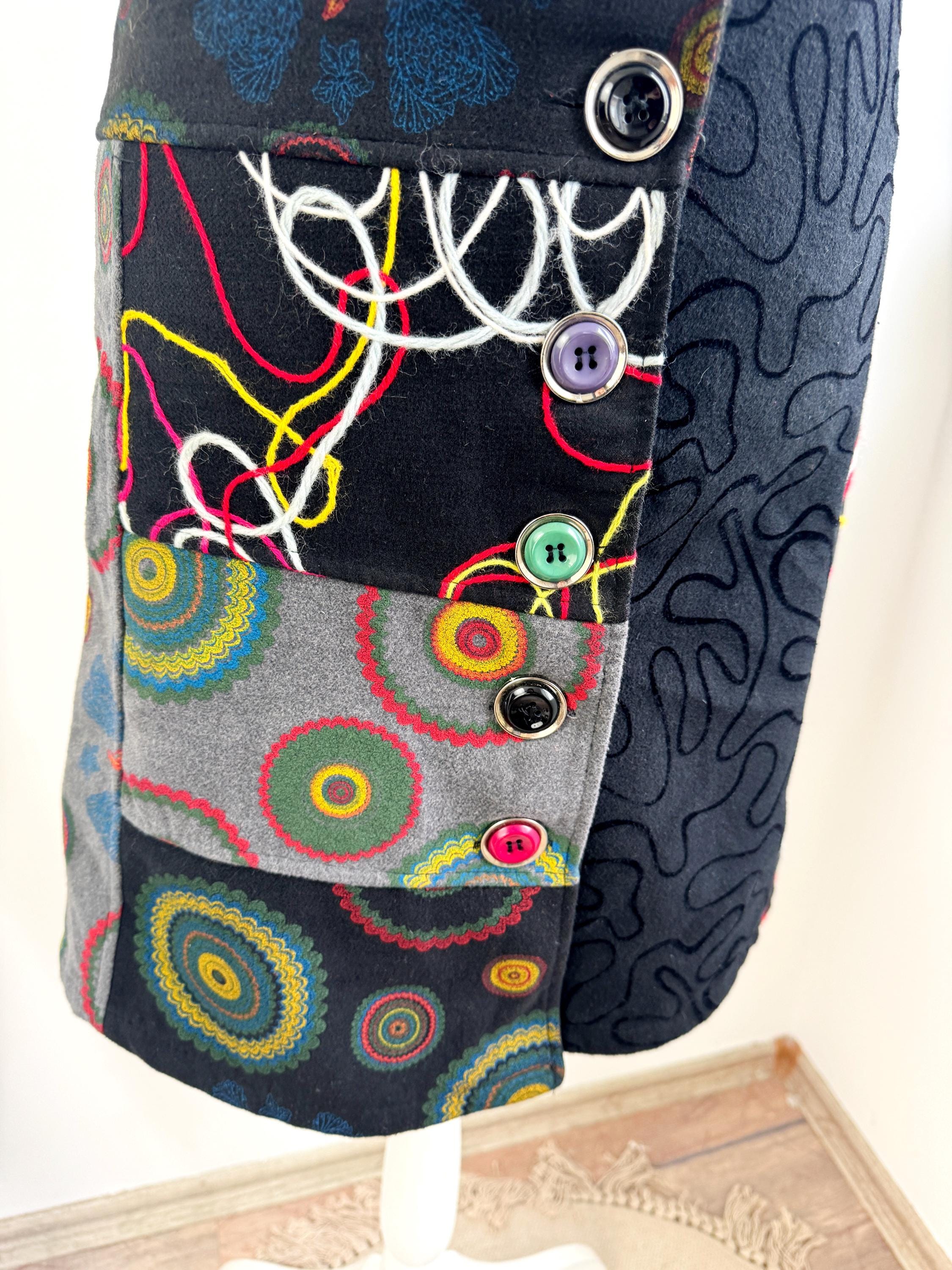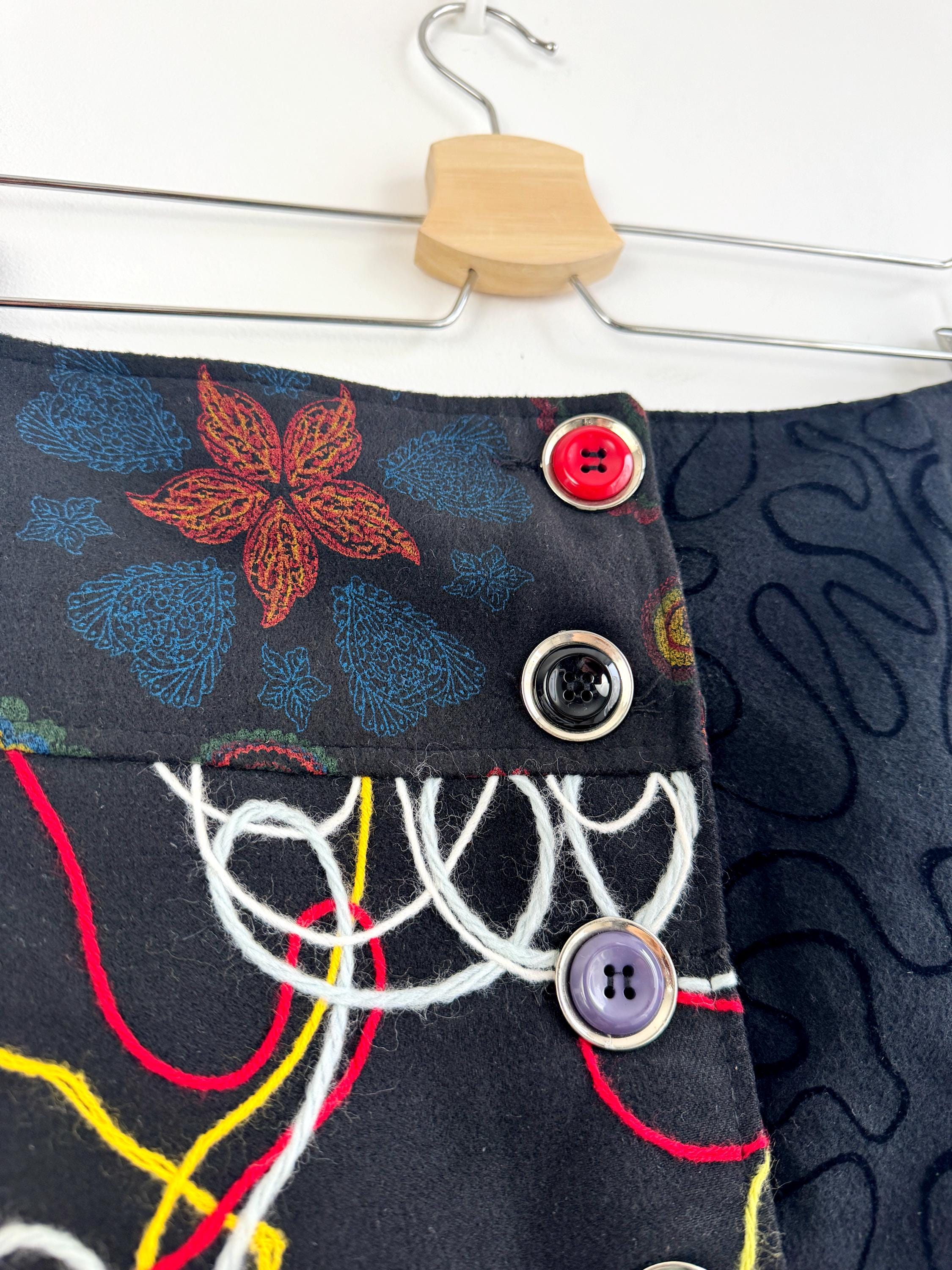 This stunning vintage 90s patchwork mini skirt is a wearable piece of art, blending Italian craftsmanship with a bold, eclectic aesthetic. Featuring a unique mix of textures, including smooth wool blends, raised velvet-like squiggles, and vibrant spiral embroidery, this wool mini skirt is perfect for those who love the art, bohemian, or maximalist style. The button-down front with mismatched colorful buttons adds a playful, artisanal touch that makes this a true one-of-a-kind find.