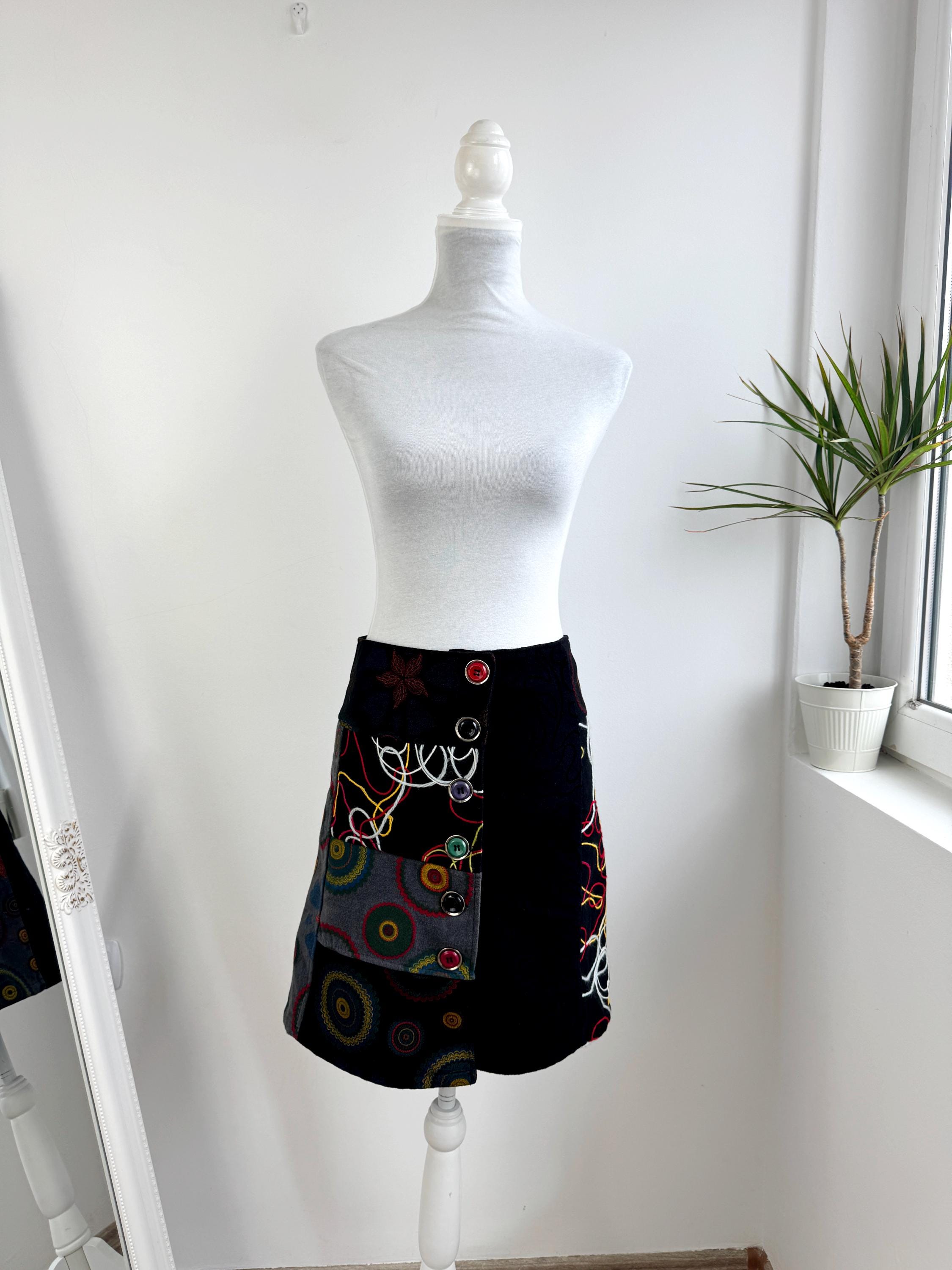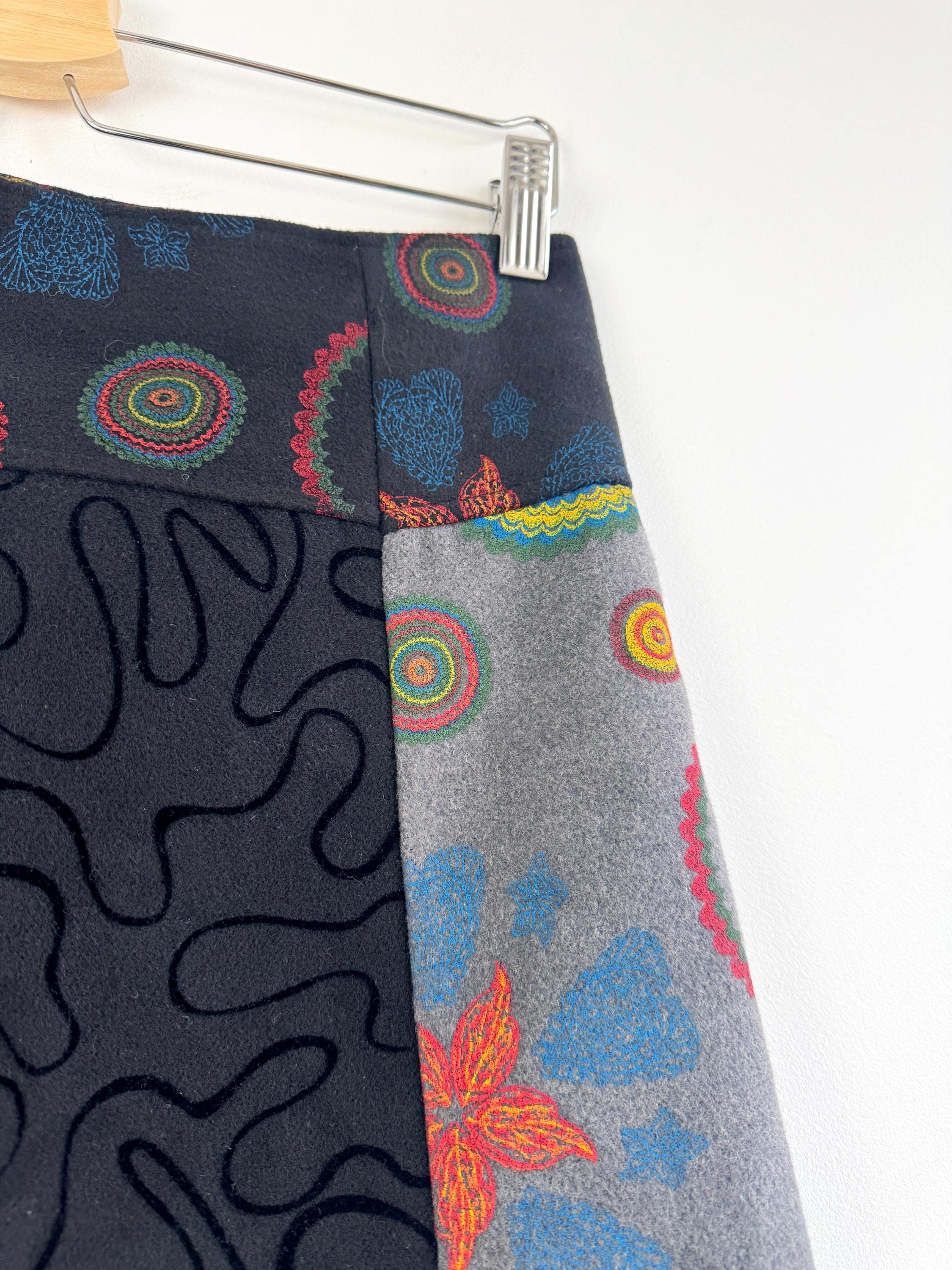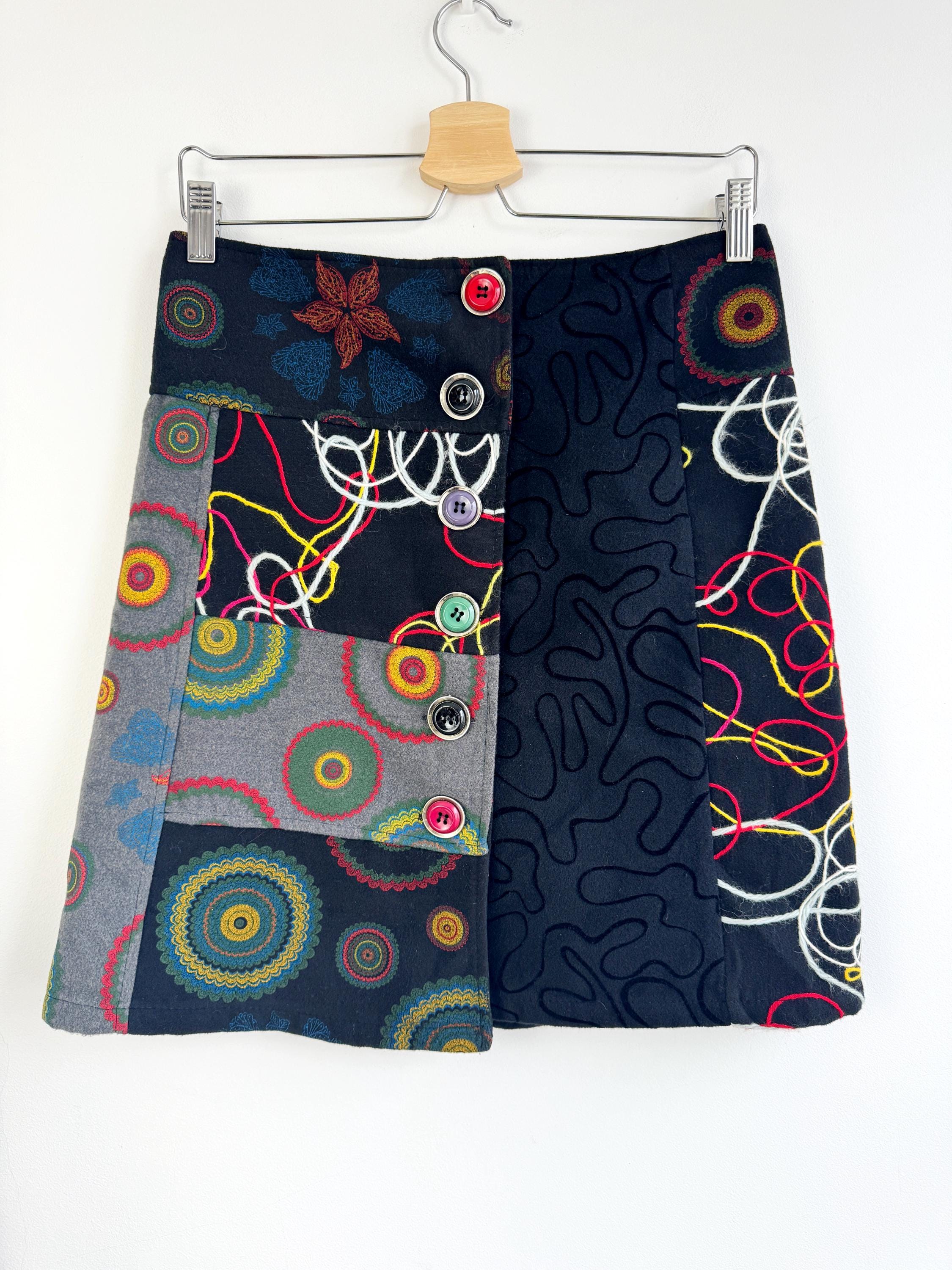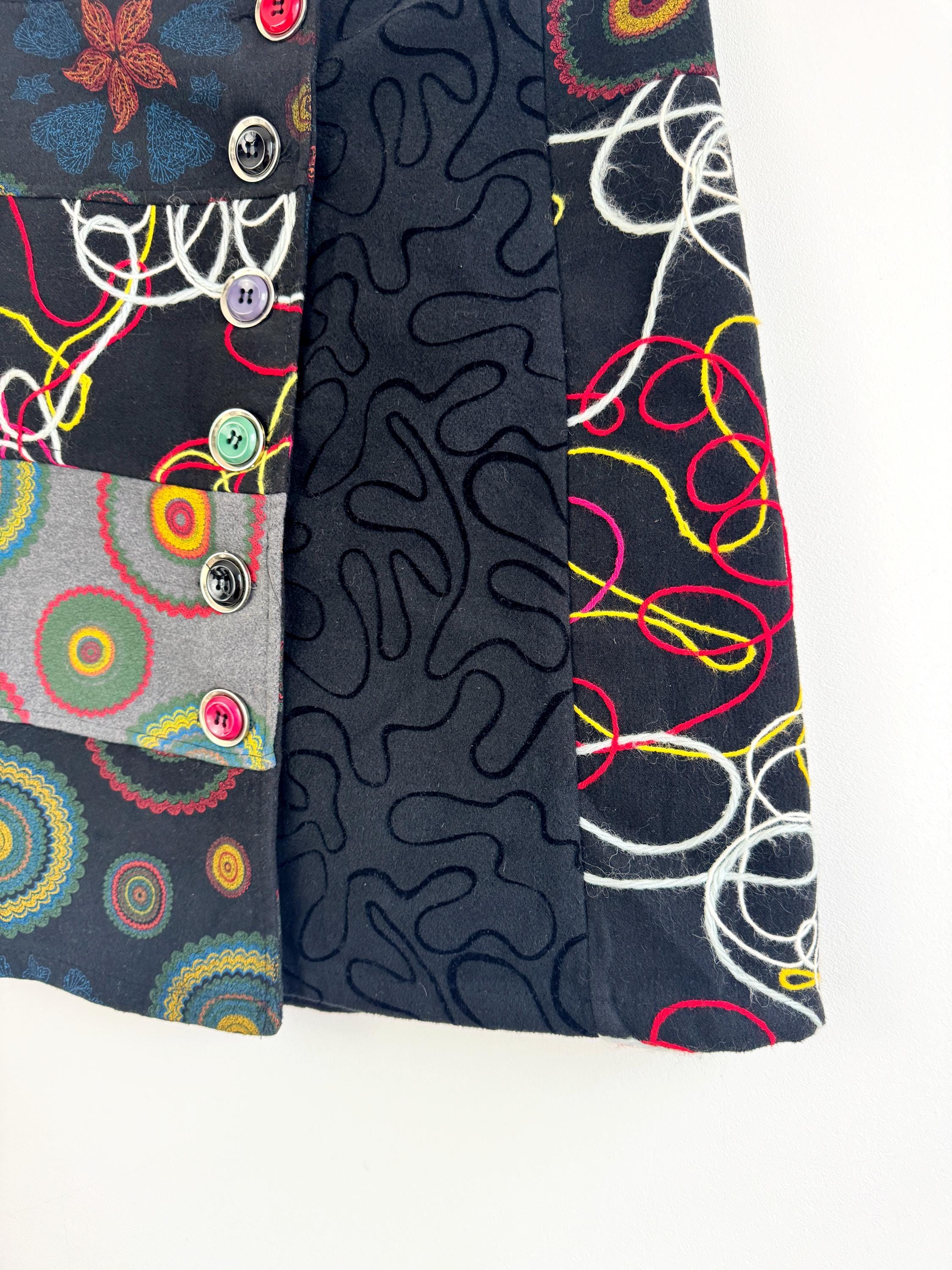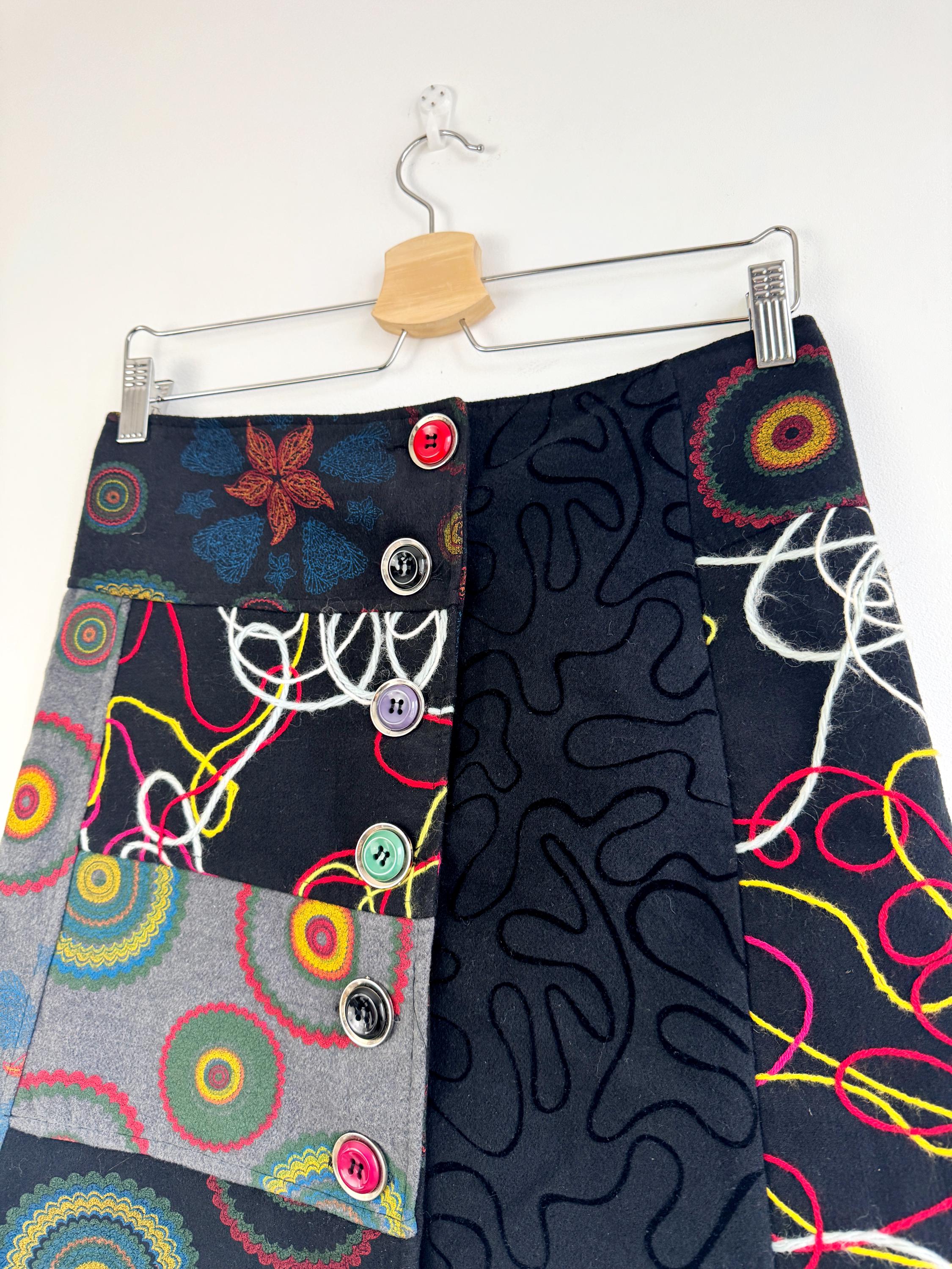This stunning vintage 90s patchwork mini skirt is a wearable piece of art, blending Italian craftsmanship with a bold, eclectic aesthetic. Featuring a unique mix of textures, including smooth wool blends, raised velvet-like squiggles, and vibrant spiral embroidery, this wool mini skirt is perfect for those who love the art, bohemian, or maximalist style. The button-down front with mismatched colorful buttons adds a playful, artisanal touch that makes this a true one-of-a-kind find.