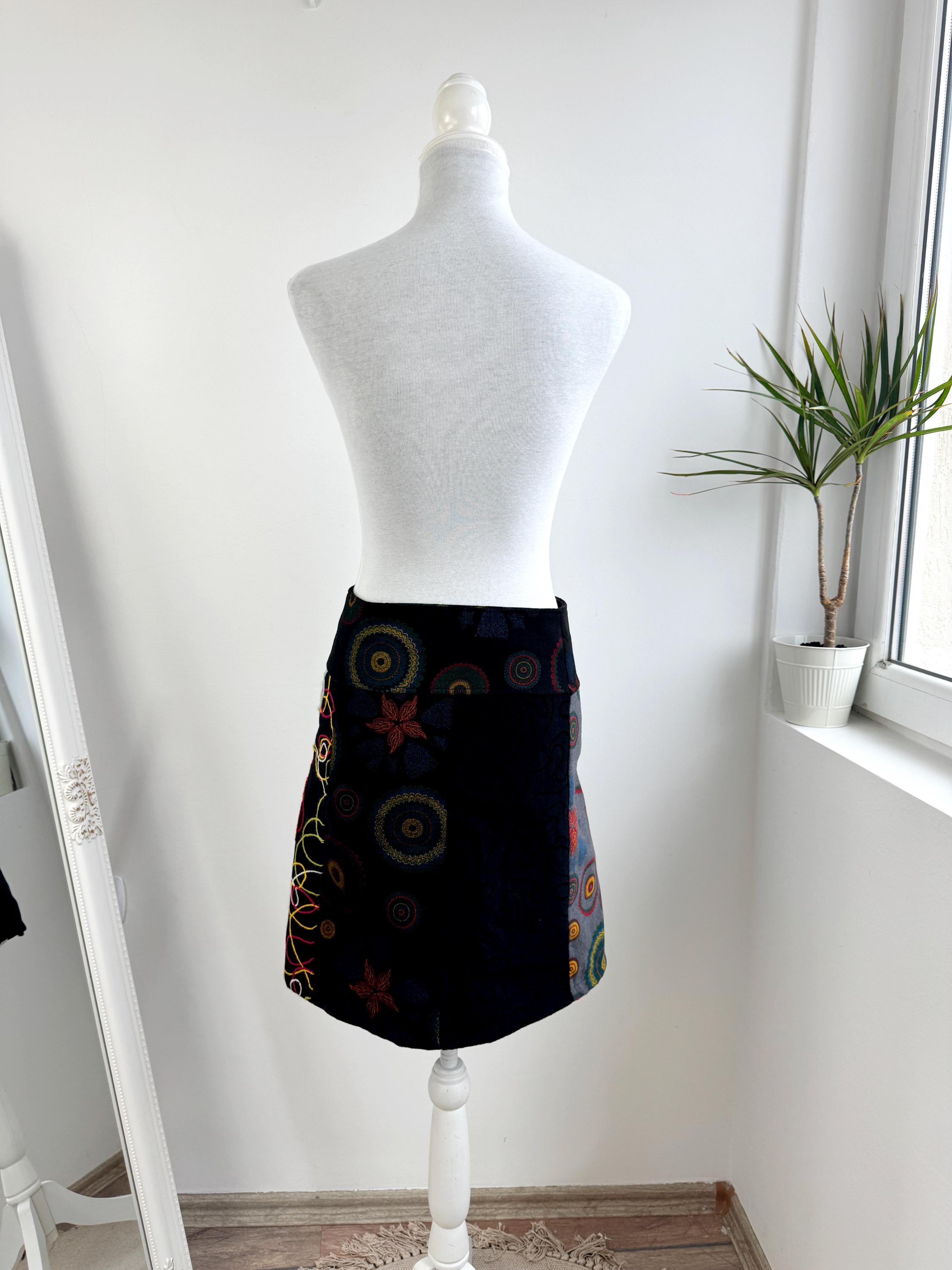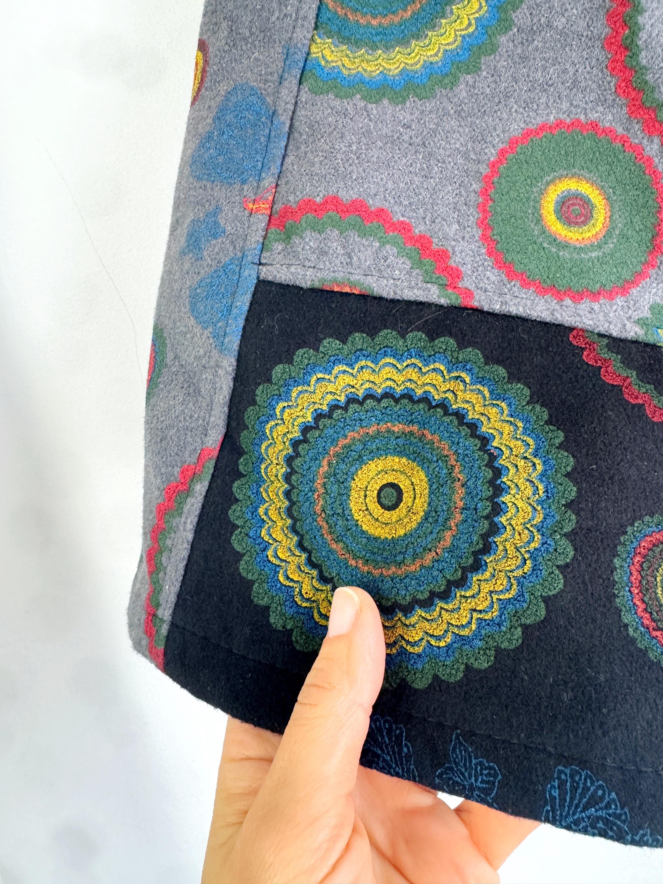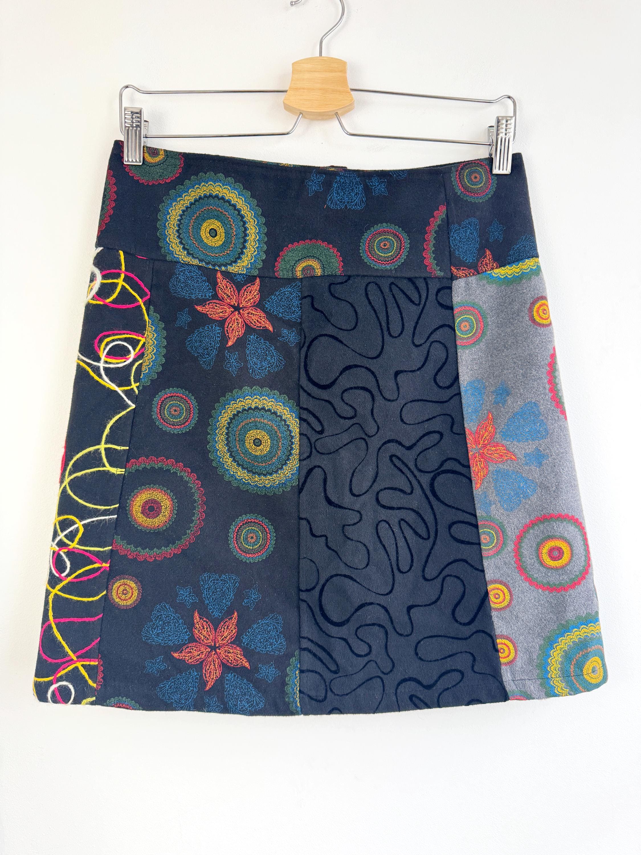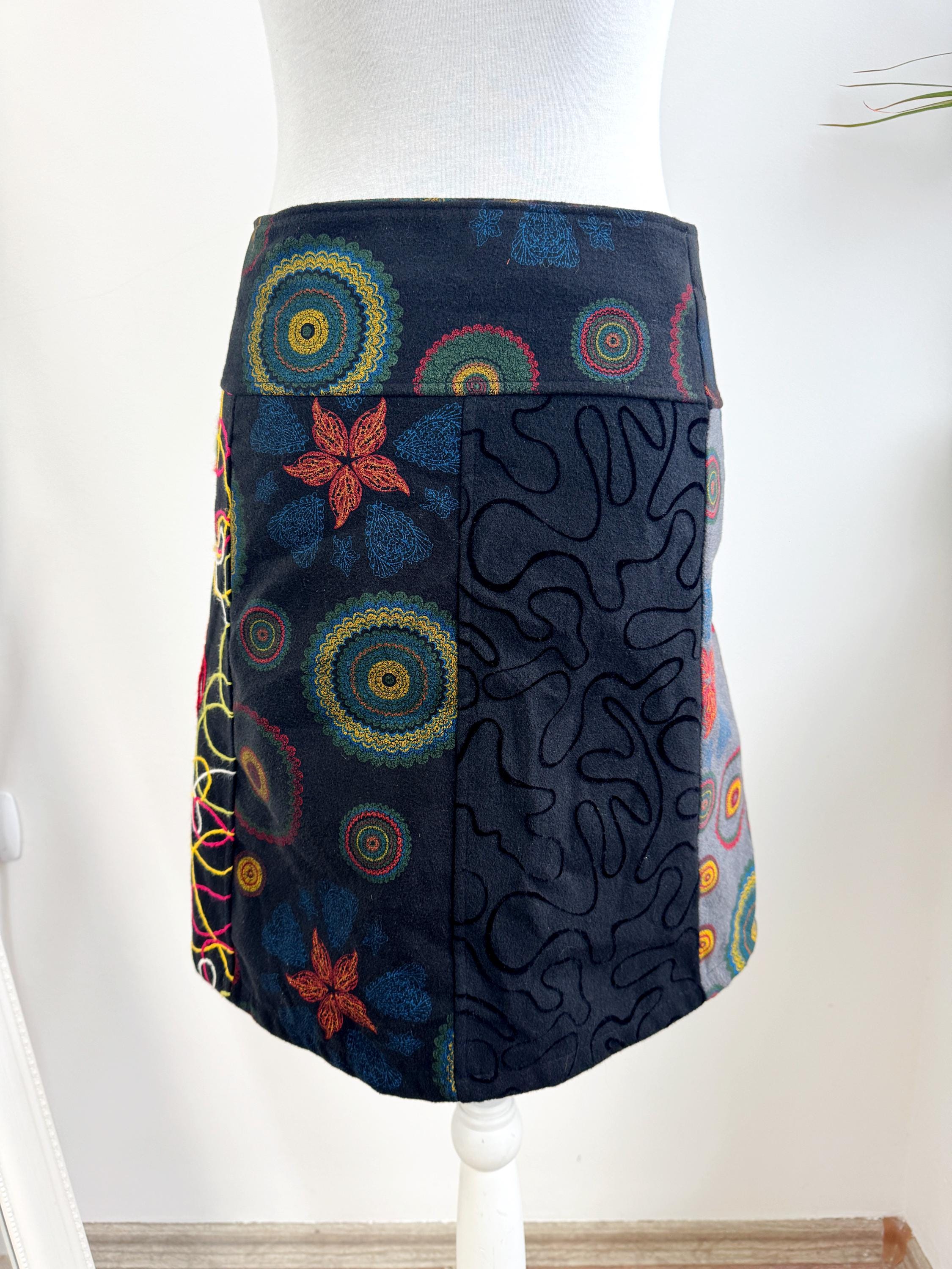 This stunning vintage 90s patchwork mini skirt is a wearable piece of art, blending Italian craftsmanship with a bold, eclectic aesthetic. Featuring a unique mix of textures, including smooth wool blends, raised velvet-like squiggles, and vibrant spiral embroidery, this wool mini skirt is perfect for those who love the art, bohemian, or maximalist style. The button-down front with mismatched colorful buttons adds a playful, artisanal touch that makes this a true one-of-a-kind find.
