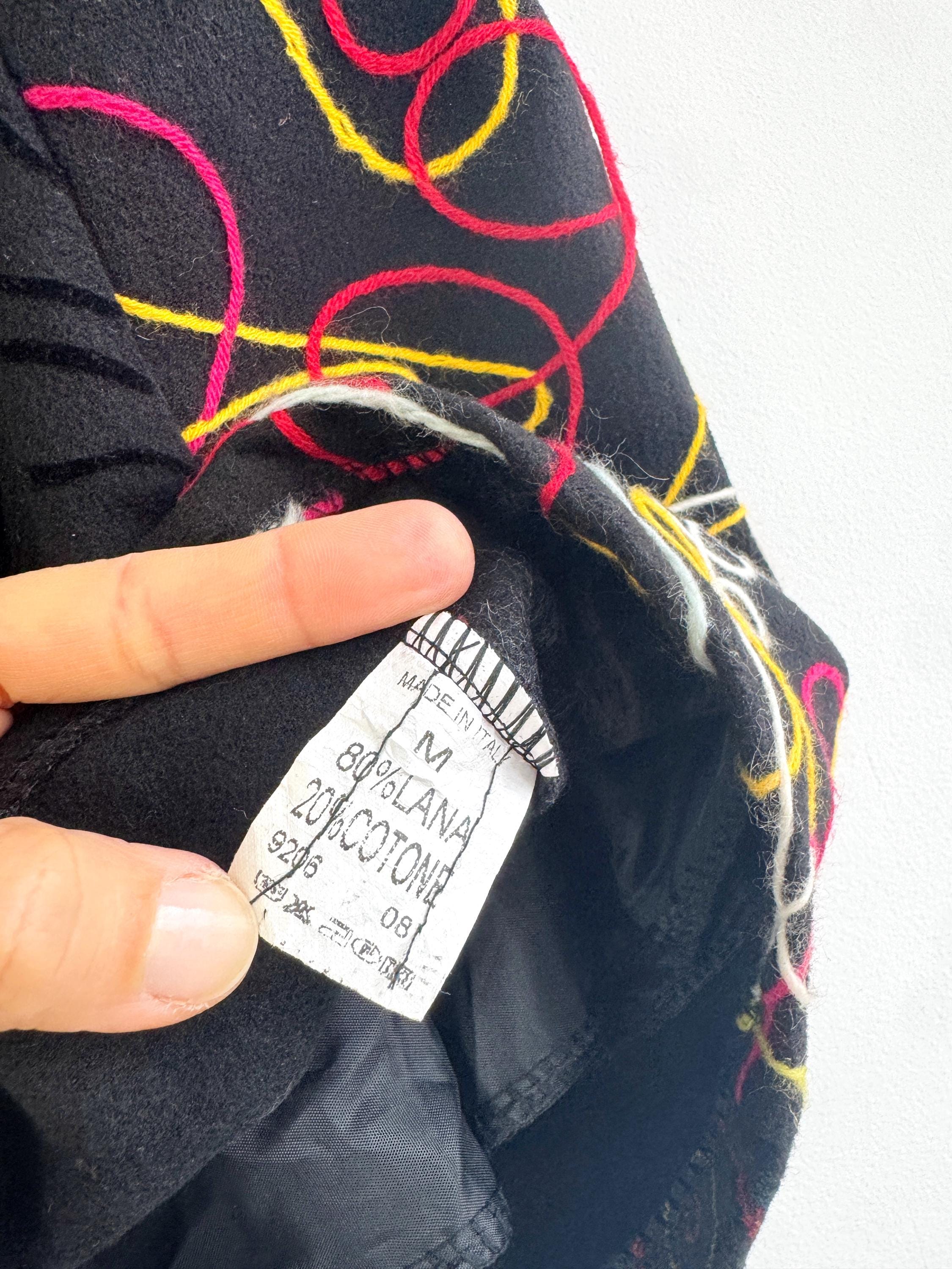 Crafted in Italy from a high-quality wool and cotton blend, the skirt offers a structured yet comfortable A-line silhouette. The intricate swirl patterns and circular motifs in primary colors pop against the deep black background, making it easy to pair with chunky knits or sleek turtlenecks. Whether you’re looking for a statement piece for your winter wardrobe or a unique retro addition to your year-round style, this artistic mini skirt delivers on both quality and character.