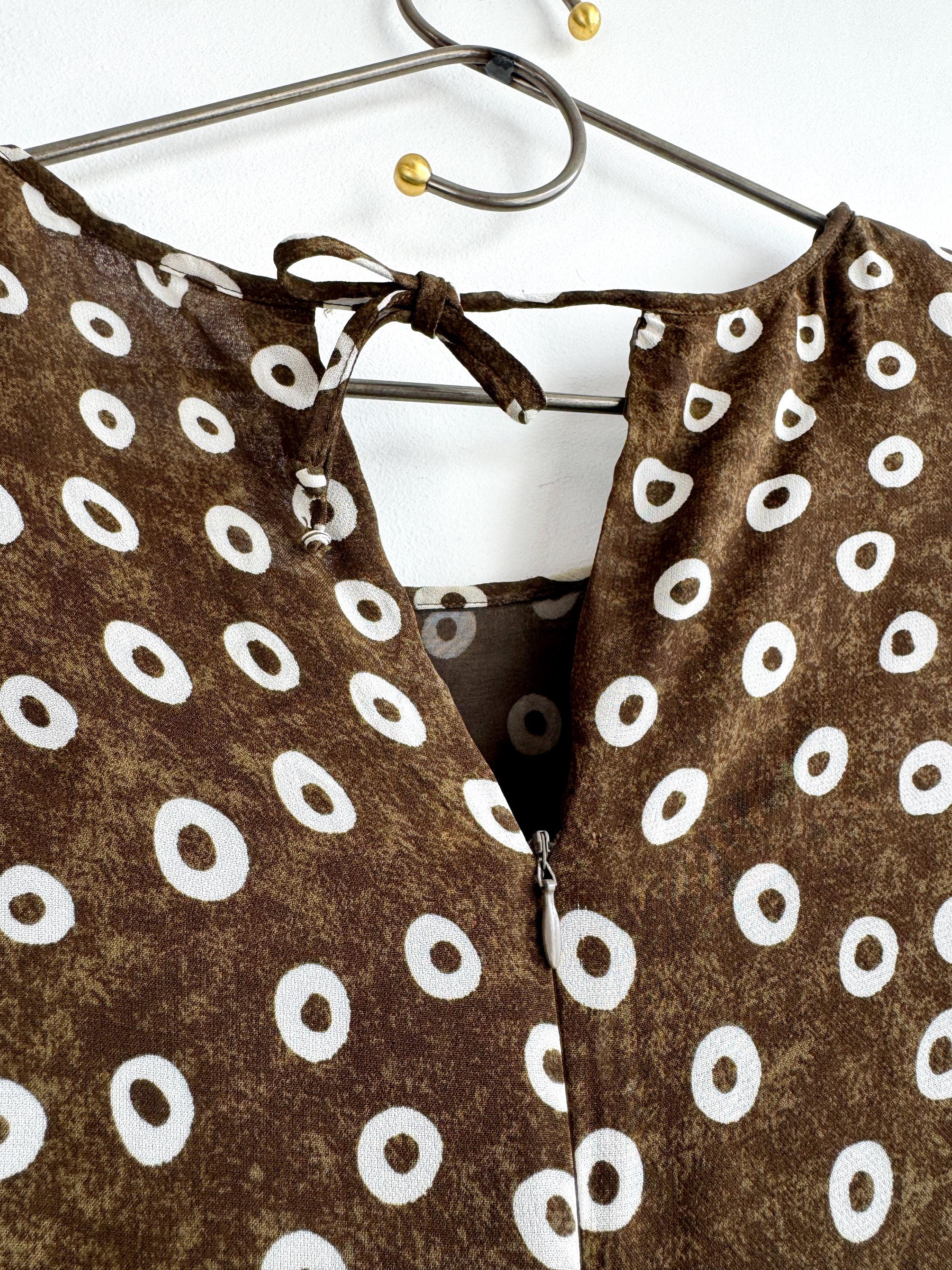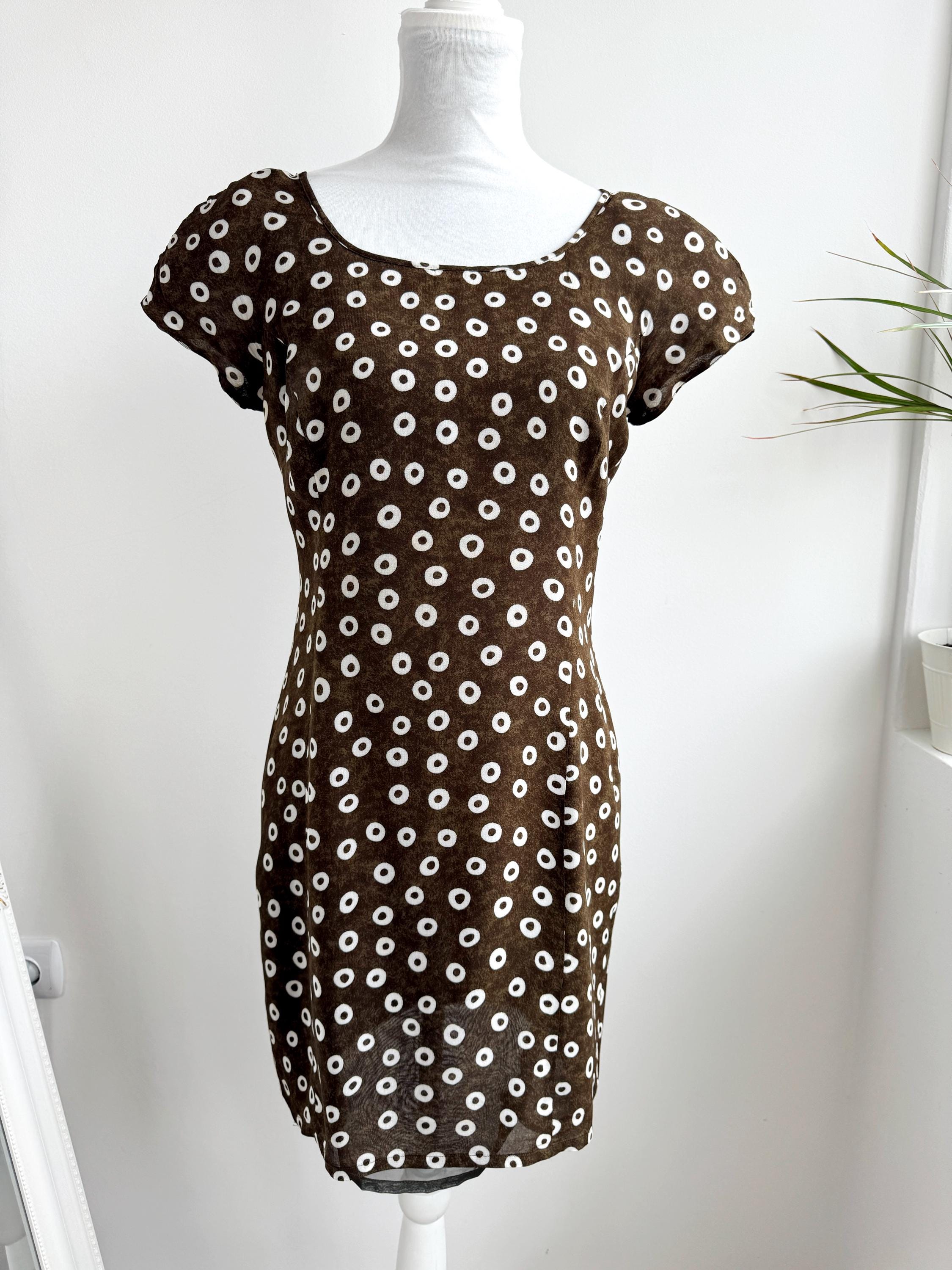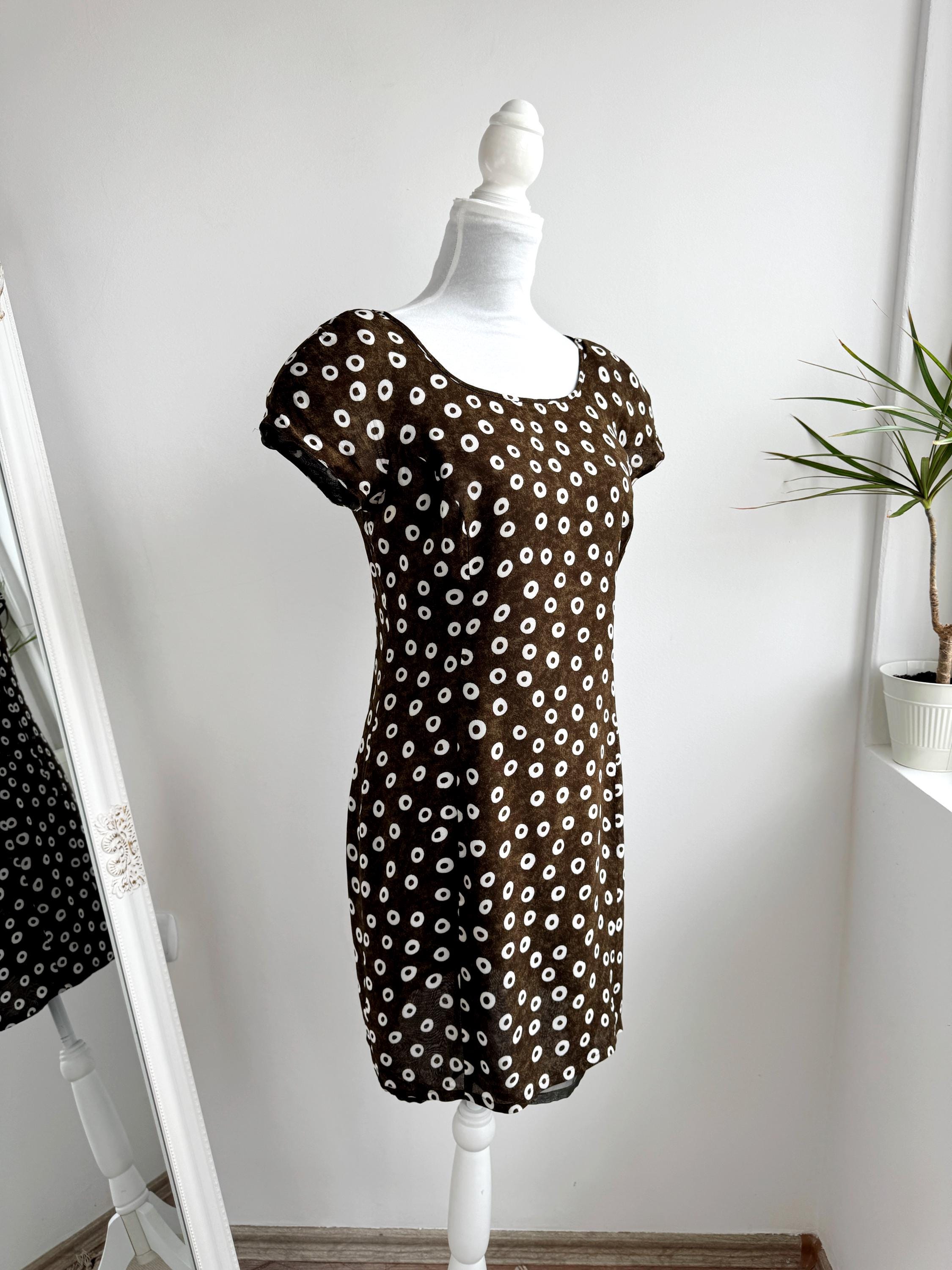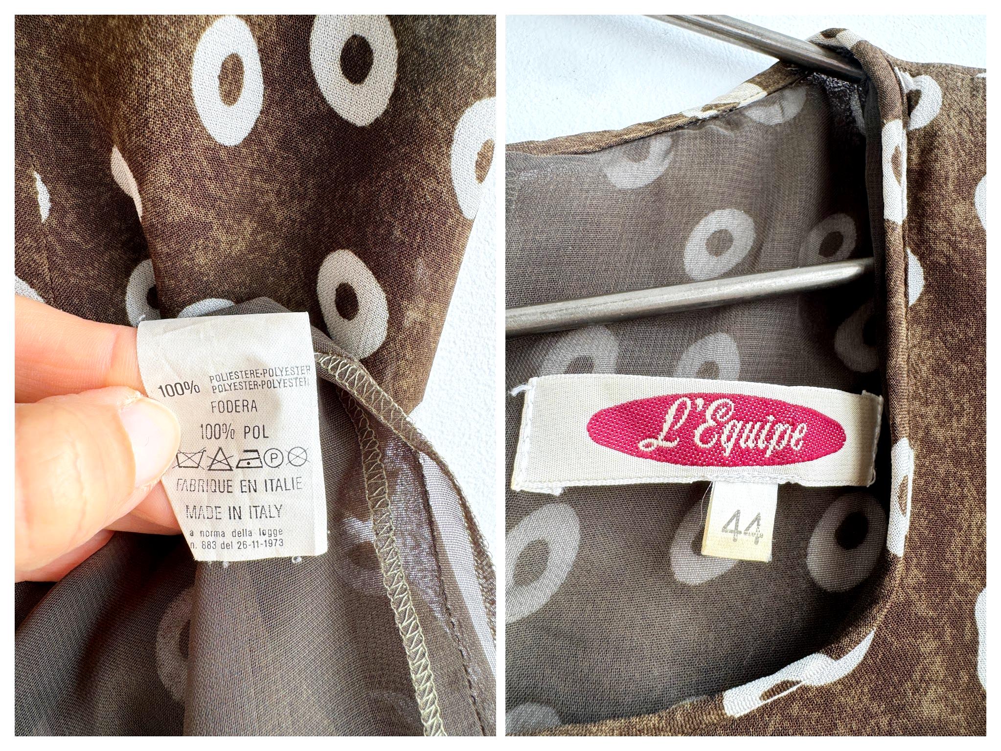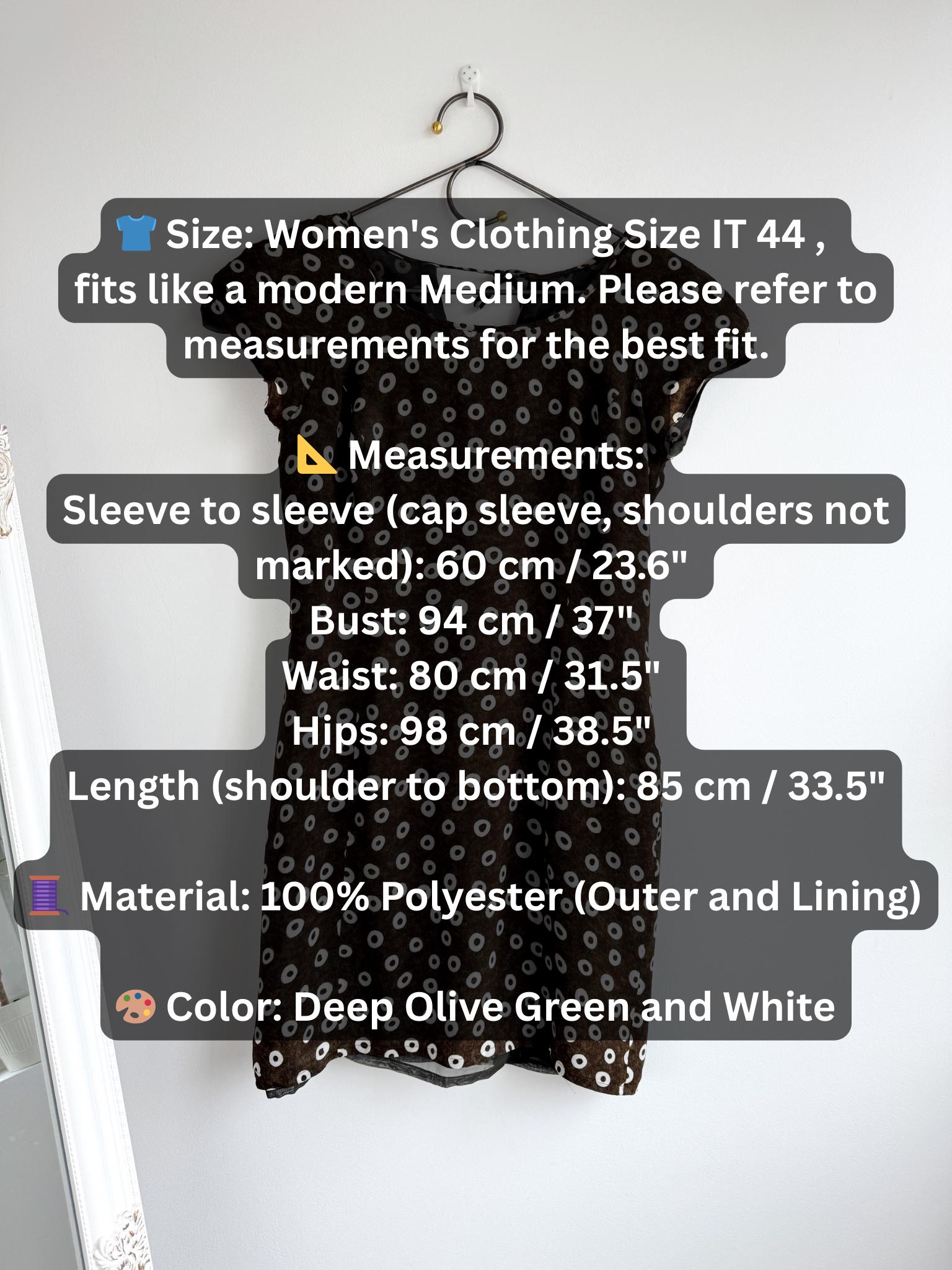 Add a touch of Italian chic to your wardrobe with this stunning vintage L'Equipe shift dress. Made in Italy, this deep olive green dress is crafted from a lightweight, polyester fabric that drapes beautifully. The sophisticated olive green tone paired with the repeating white circle motif creates a timeless retro aesthetic. Designed with a classic scoop neck and a discreet back zipper for a tailored fit, it's a versatile retro style shift dress that pairs perfectly with boots for a mod look or sleek heels for a contemporary ensemble.