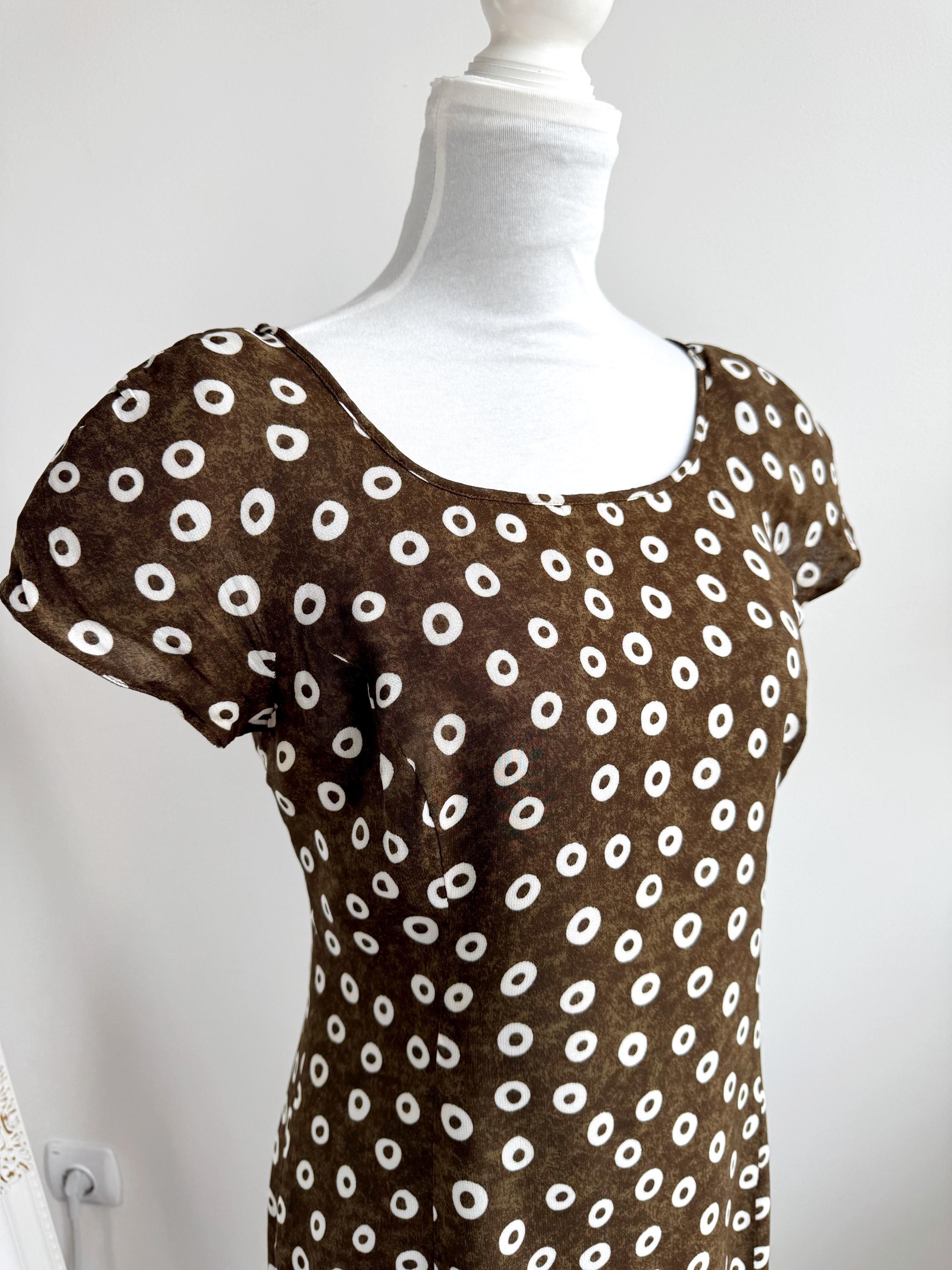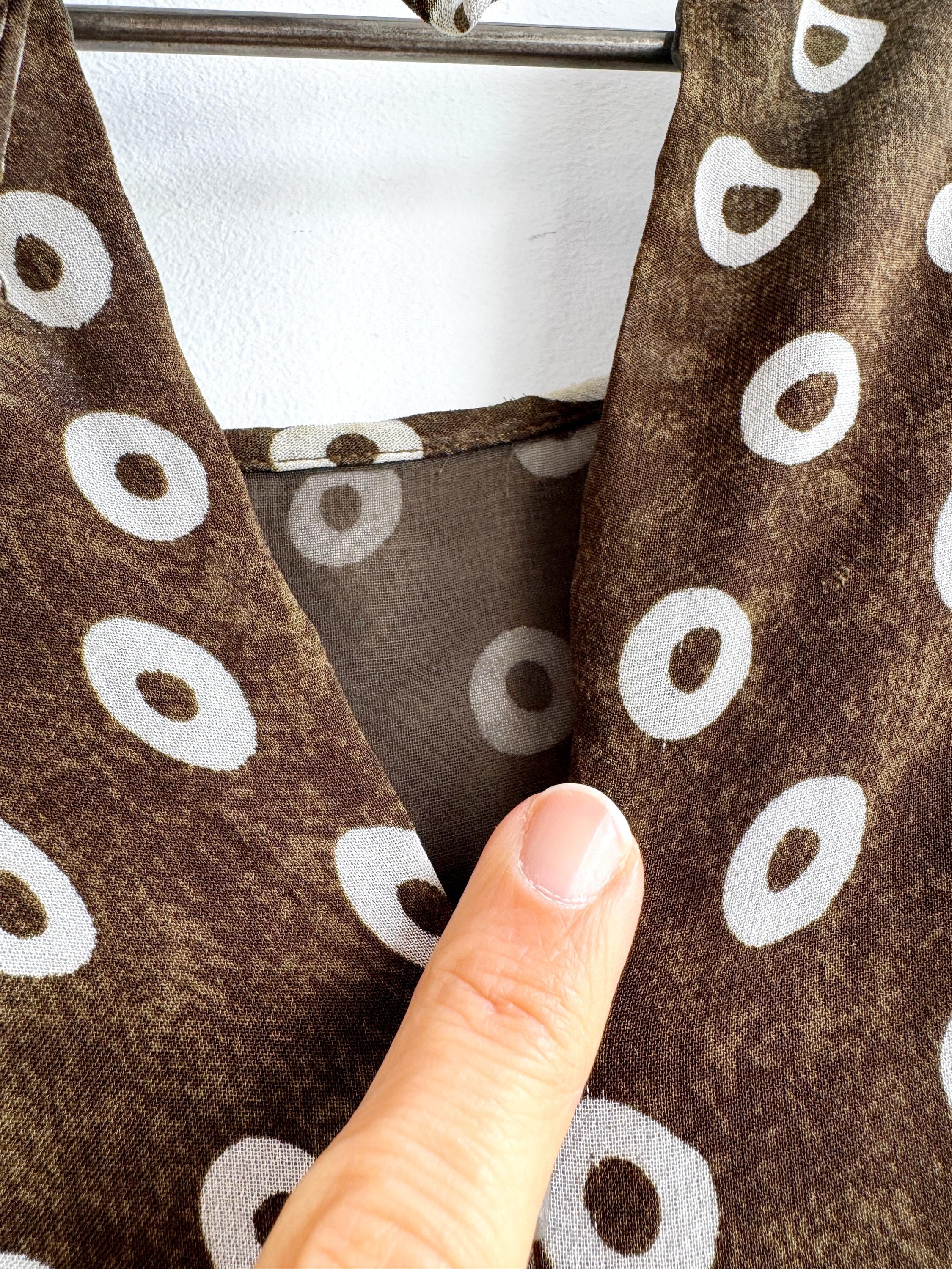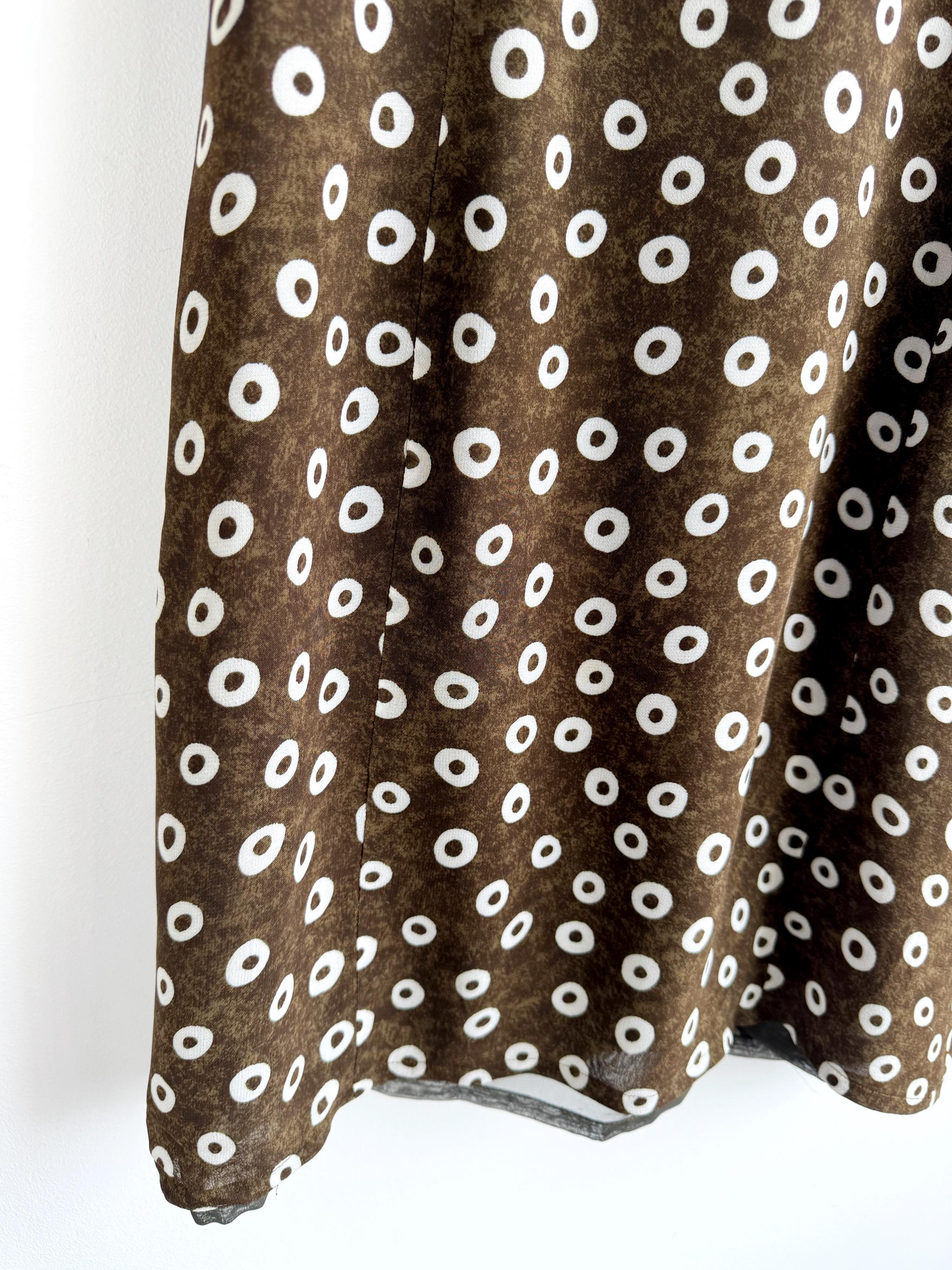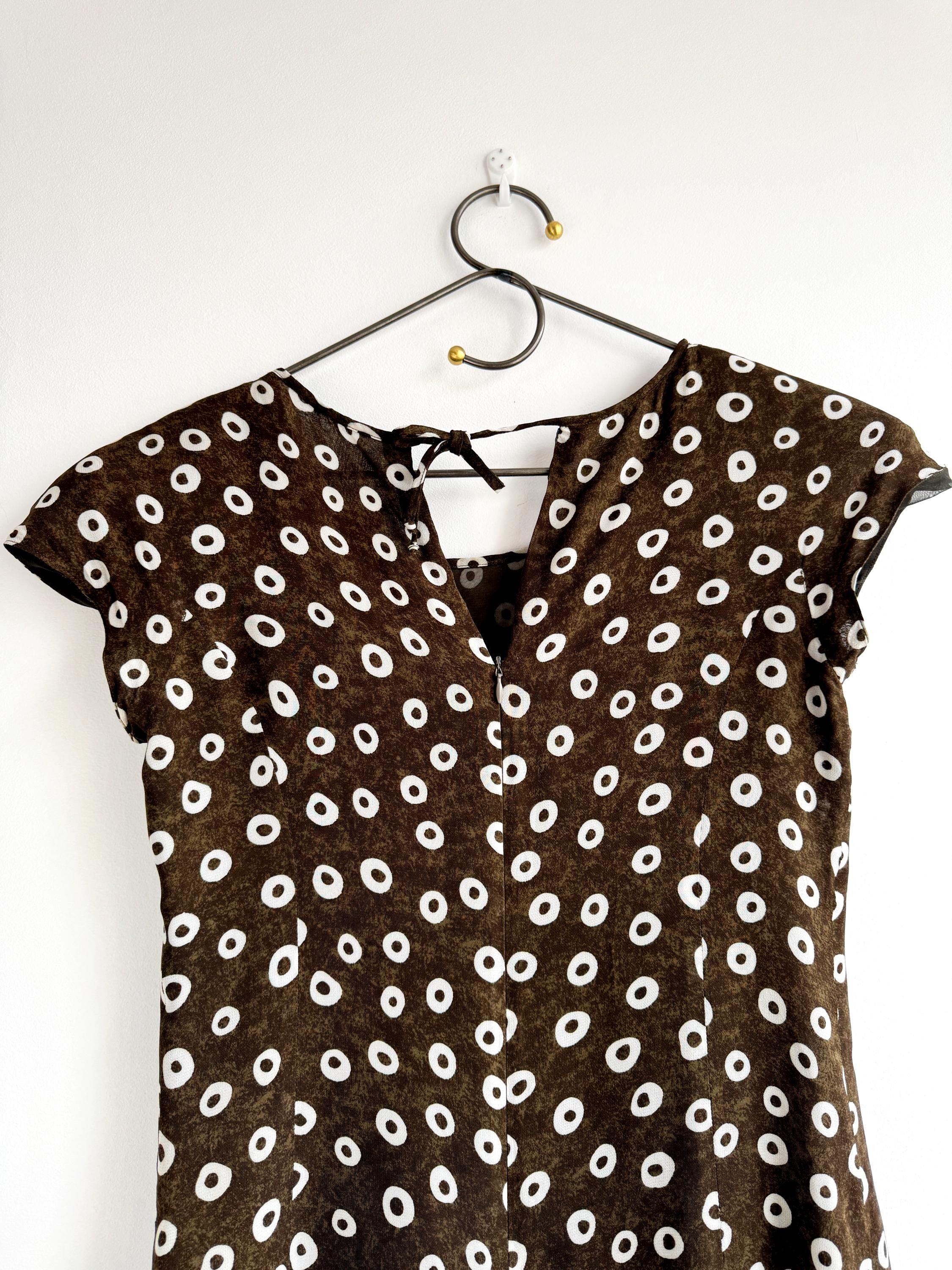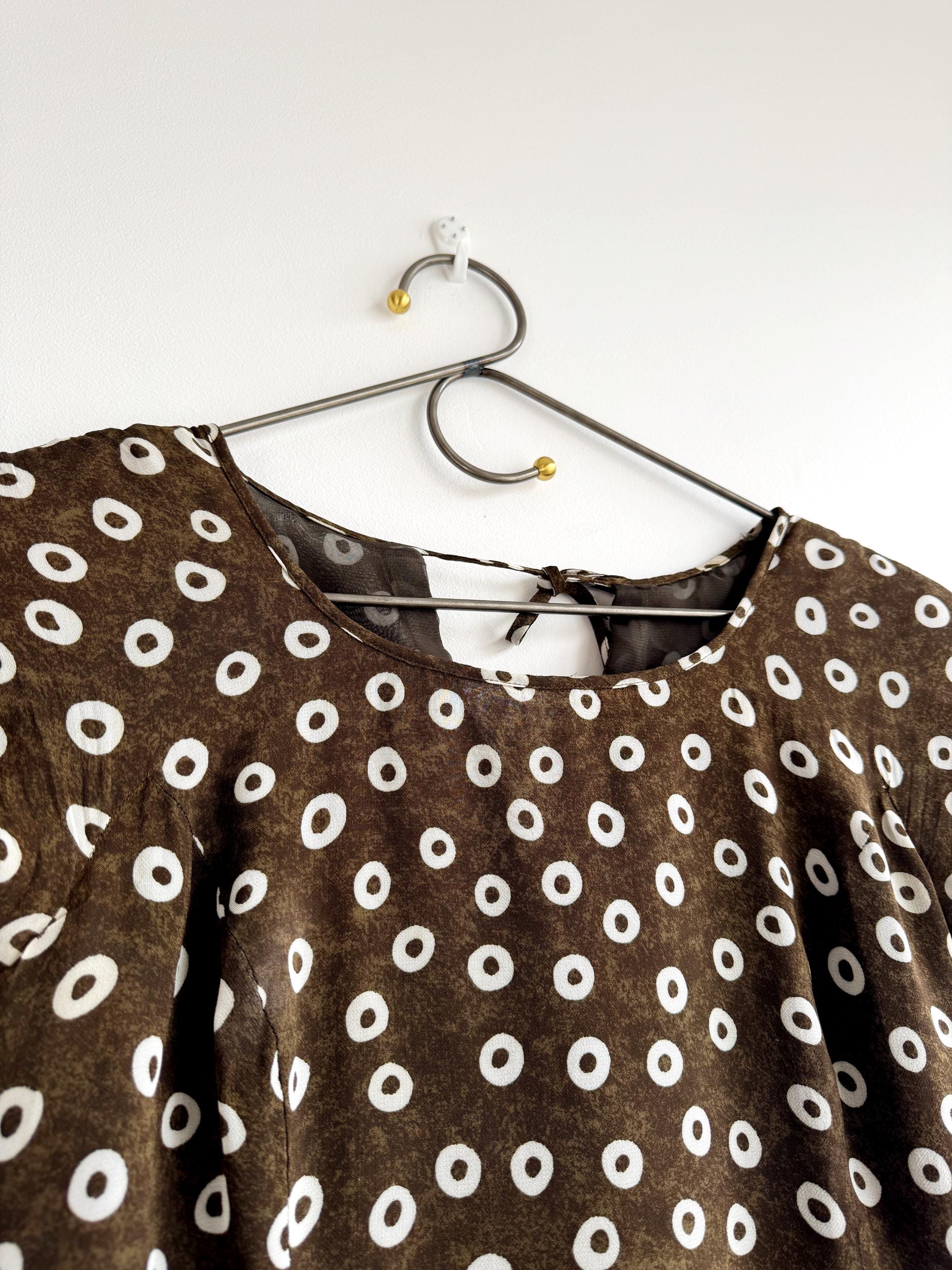 Add a touch of Italian chic to your wardrobe with this stunning vintage L'Equipe shift dress. Made in Italy, this deep olive green dress is crafted from a lightweight, polyester fabric that drapes beautifully. The sophisticated olive green tone paired with the repeating white circle motif creates a timeless retro aesthetic. Designed with a classic scoop neck and a discreet back zipper for a tailored fit, it's a versatile retro style shift dress that pairs perfectly with boots for a mod look or sleek heels for a contemporary ensemble.