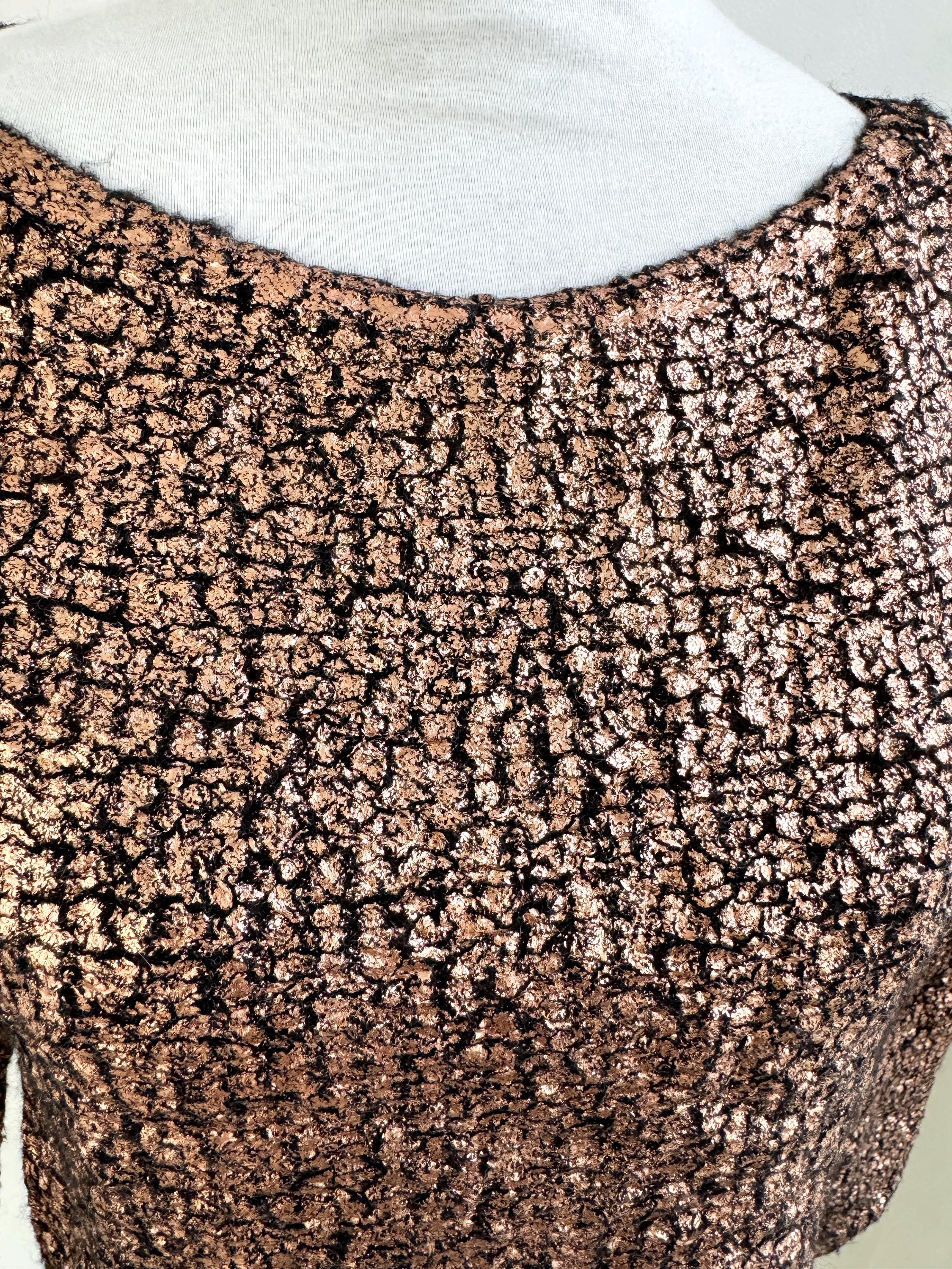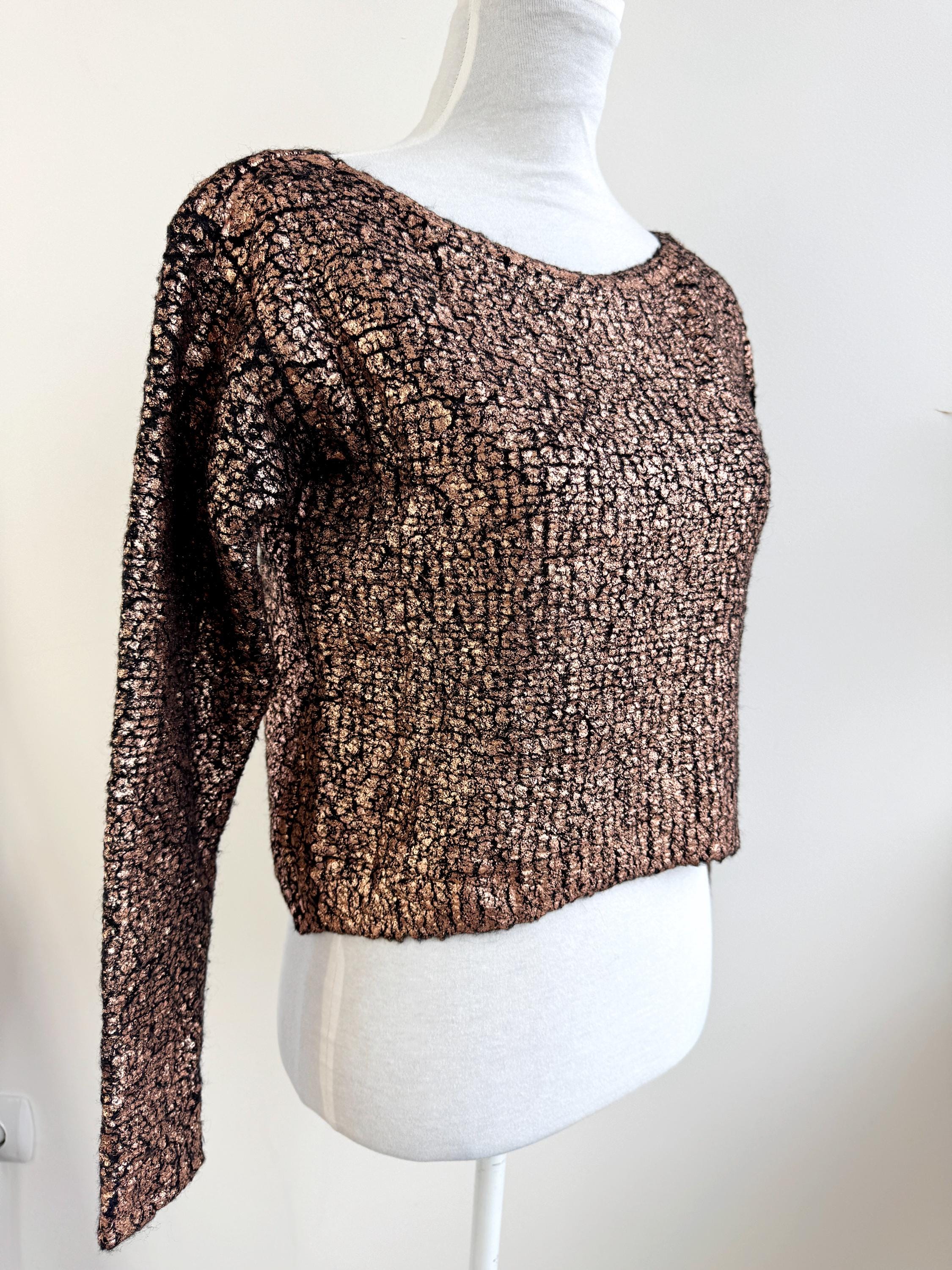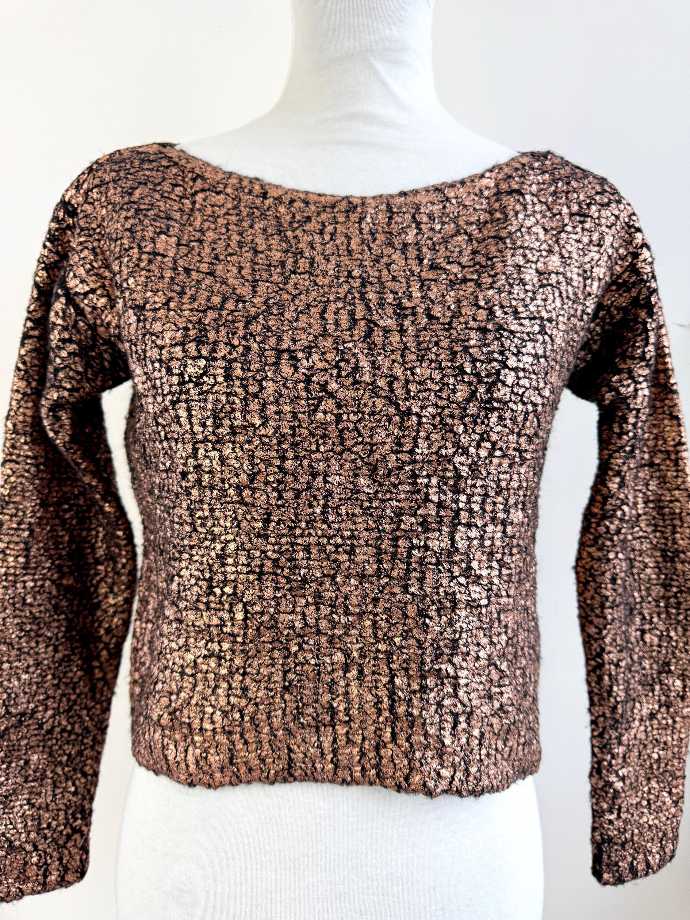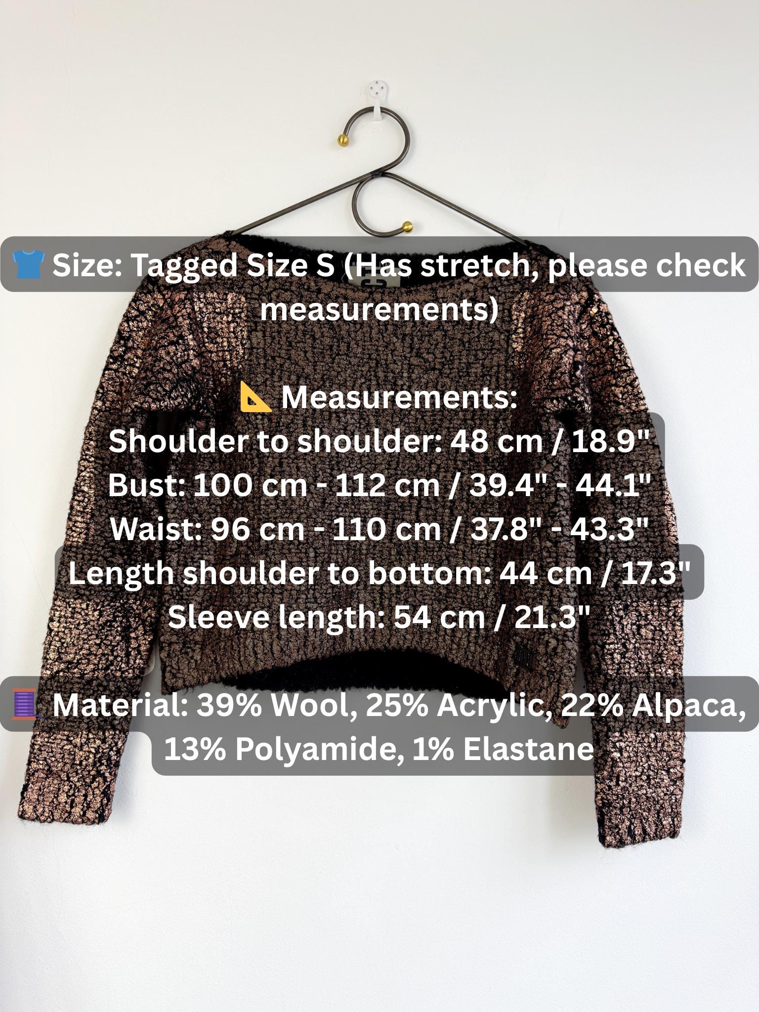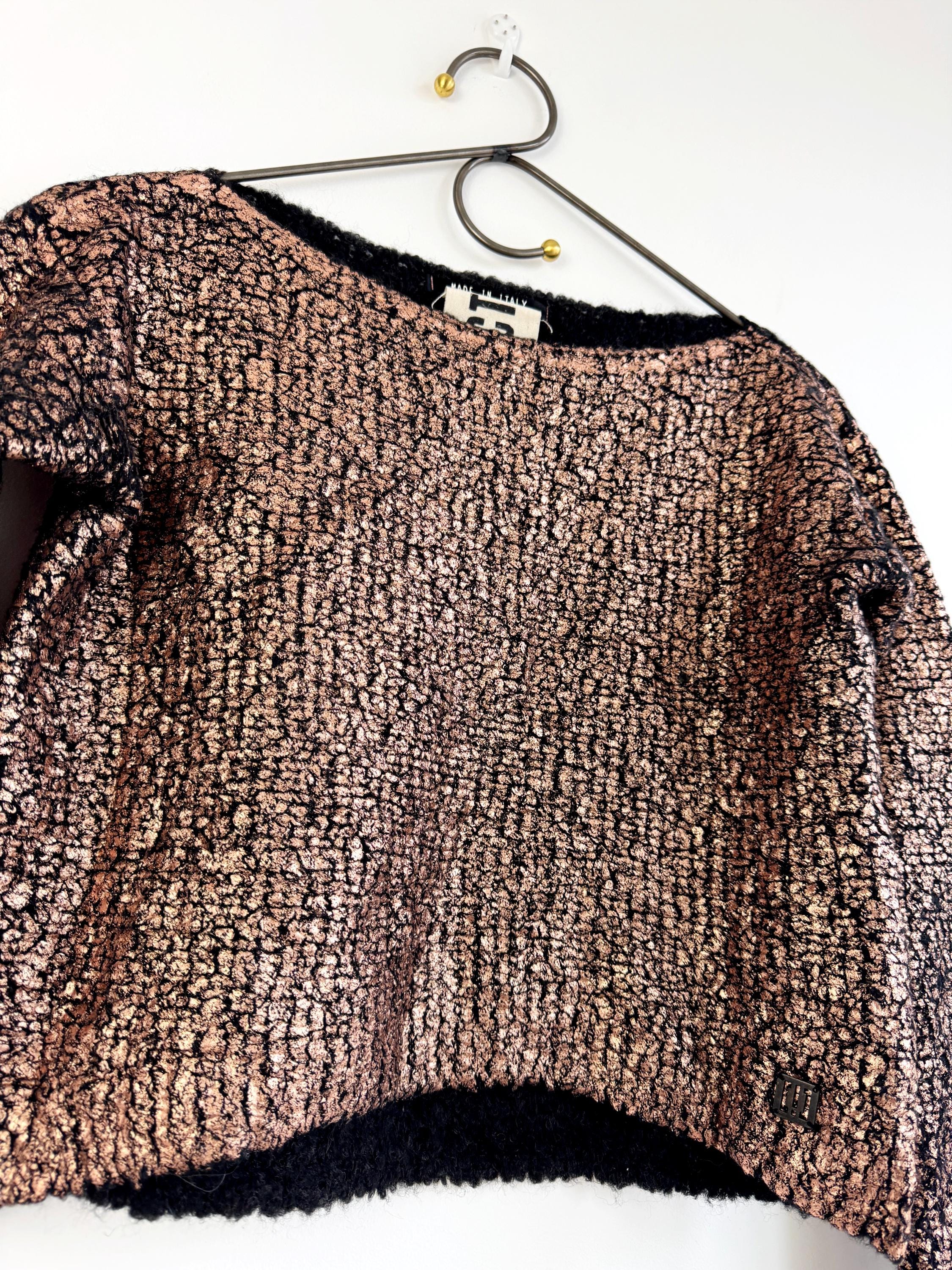 Elevate your evening wardrobe with this stunning vintage Italian metallic knit sweater by the brand !M?ERFECT by Five Seasons in size S. This eye-catching metallic sweater features a unique, textured "crackled" bronze gold foil effect over a soft, fuzzy black base, creating a sophisticated avant-garde aesthetic. Designed with a flattering boat neckline and a cropped silhouette, this cracked gold pullover strikes the perfect balance between high-fashion drama and cozy comfort.