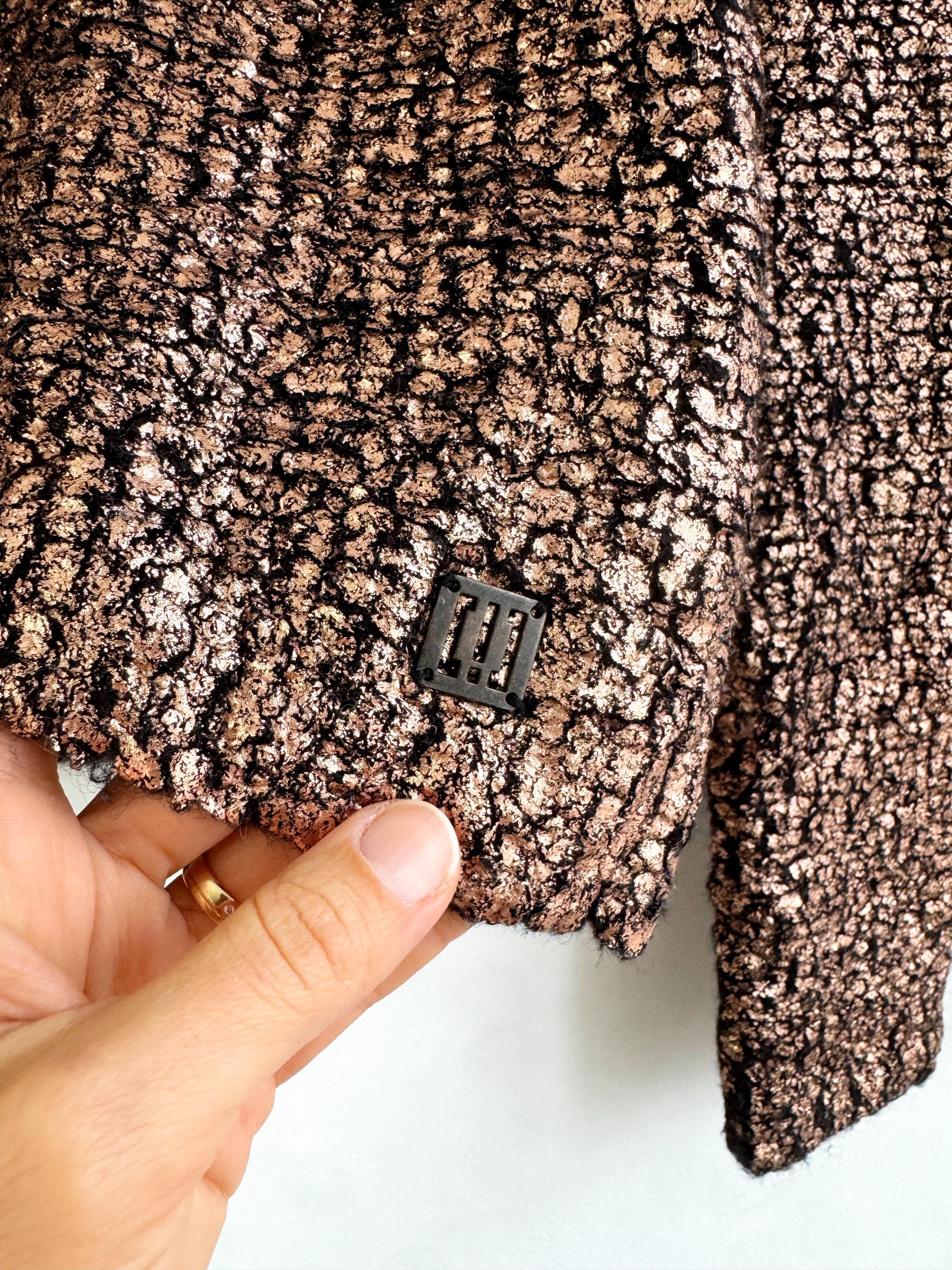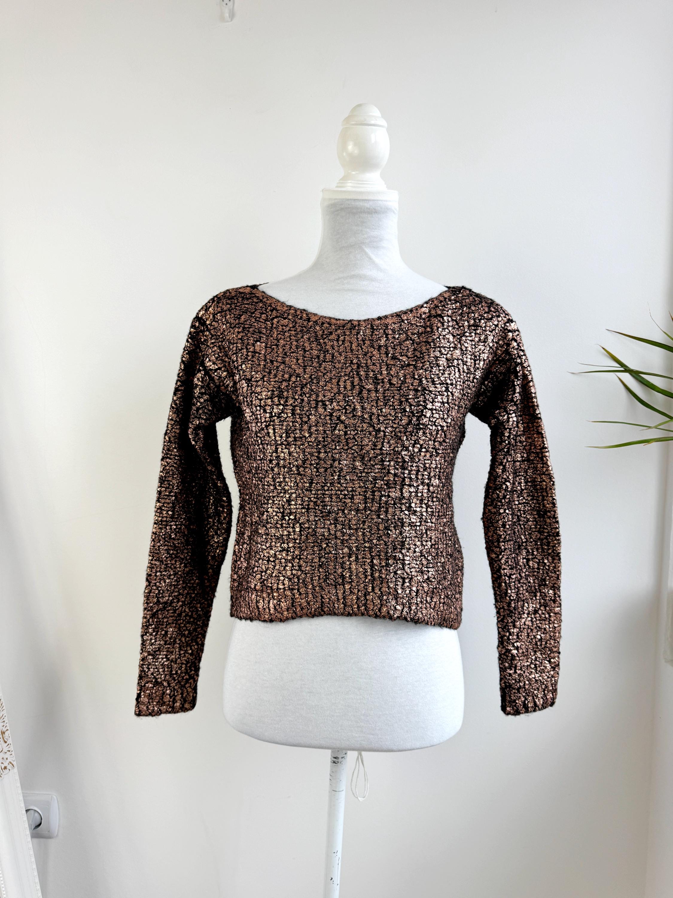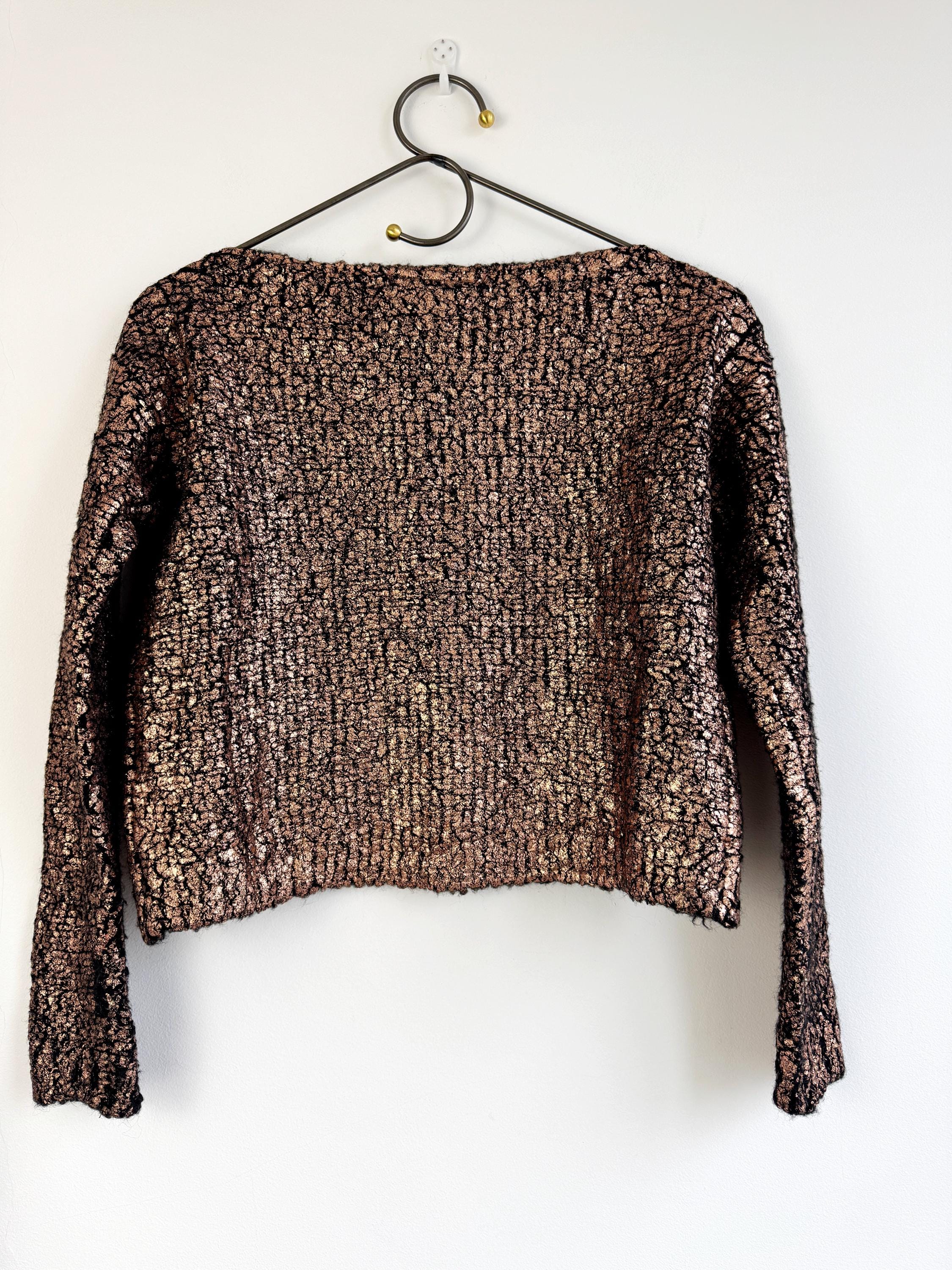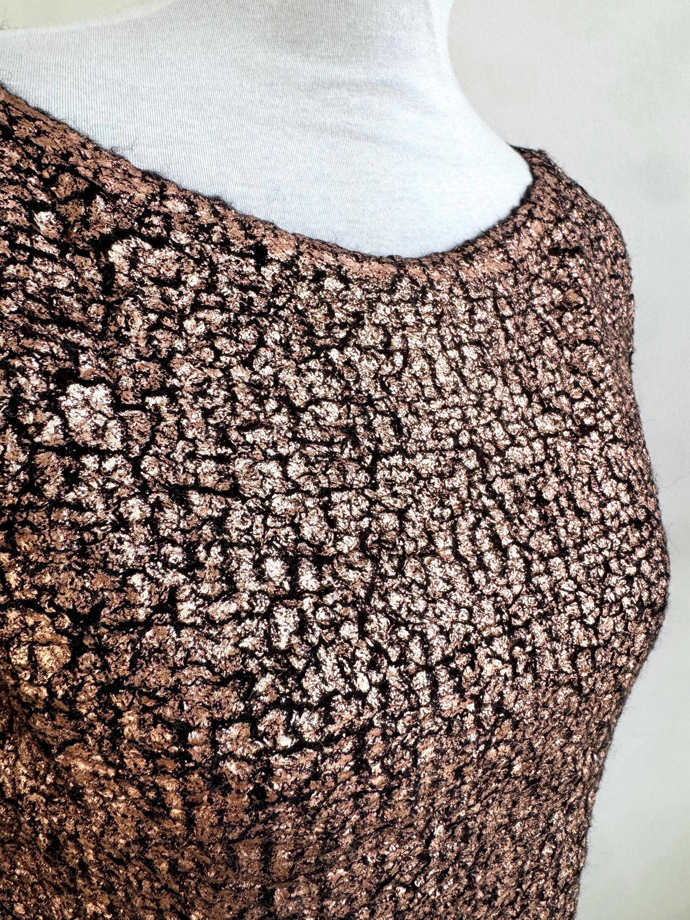 Elevate your evening wardrobe with this stunning vintage Italian metallic knit sweater by the brand !M?ERFECT by Five Seasons in size S. This eye-catching metallic sweater features a unique, textured "crackled" bronze gold foil effect over a soft, fuzzy black base, creating a sophisticated avant-garde aesthetic. Designed with a flattering boat neckline and a cropped silhouette, this cracked gold pullover strikes the perfect balance between high-fashion drama and cozy comfort.