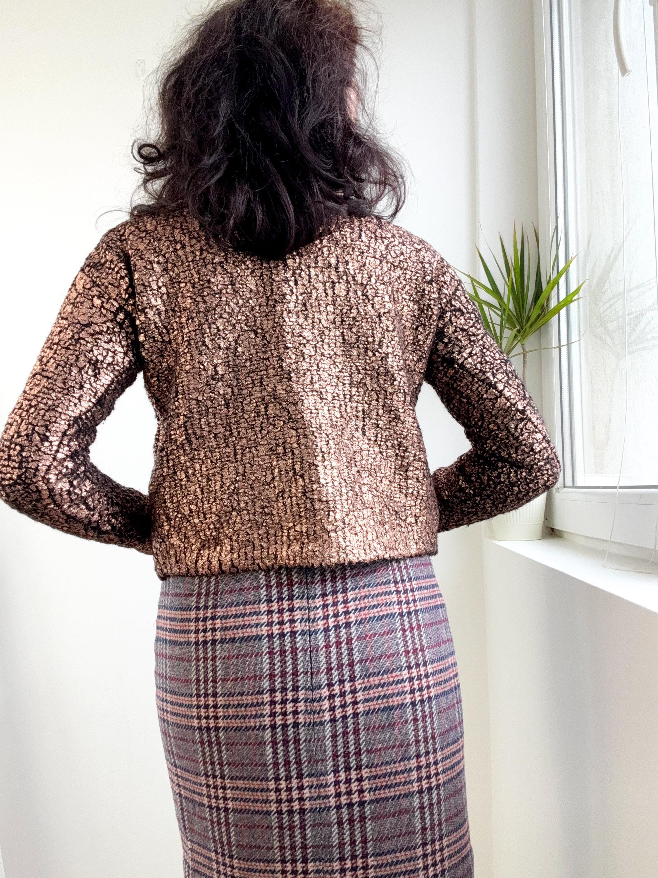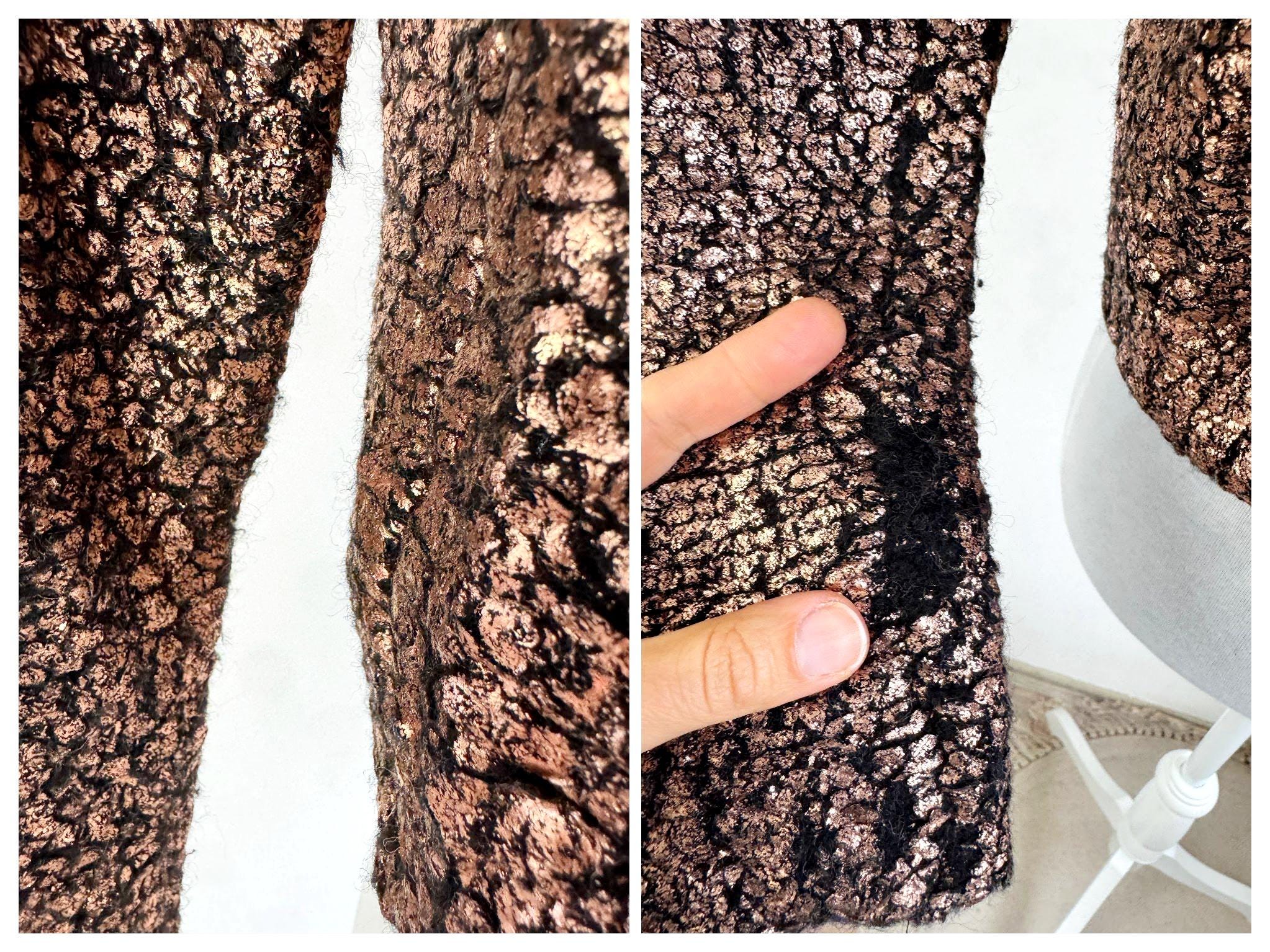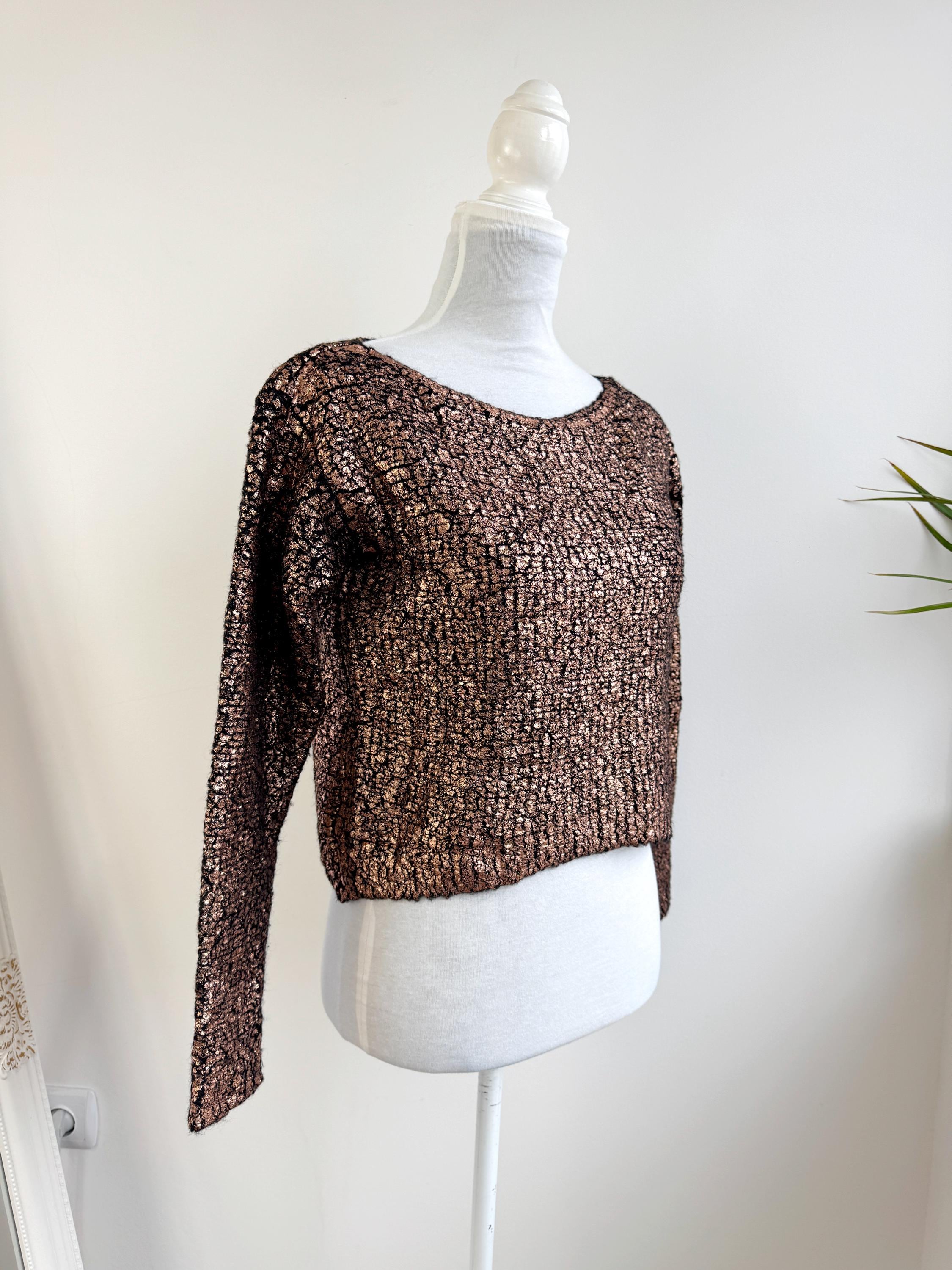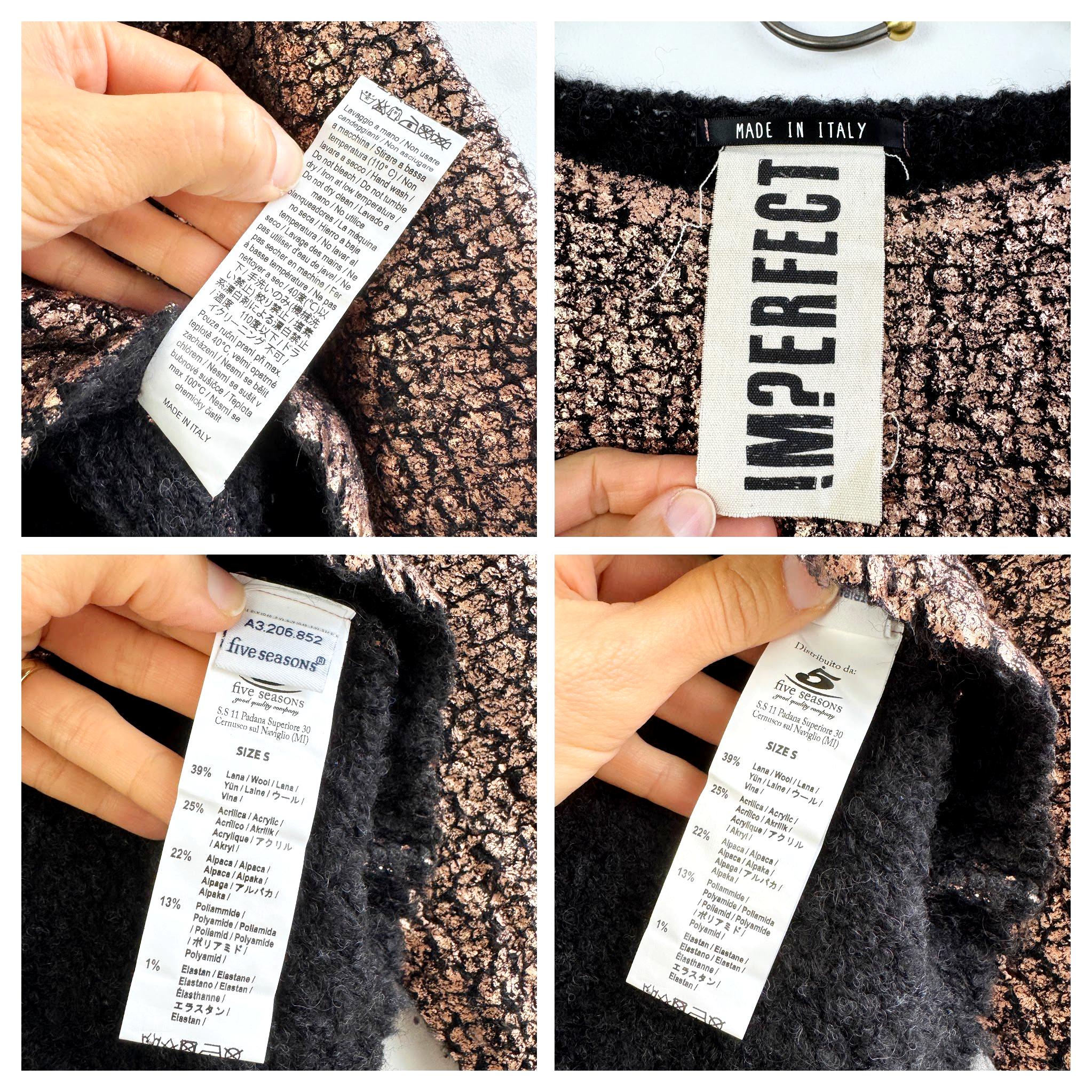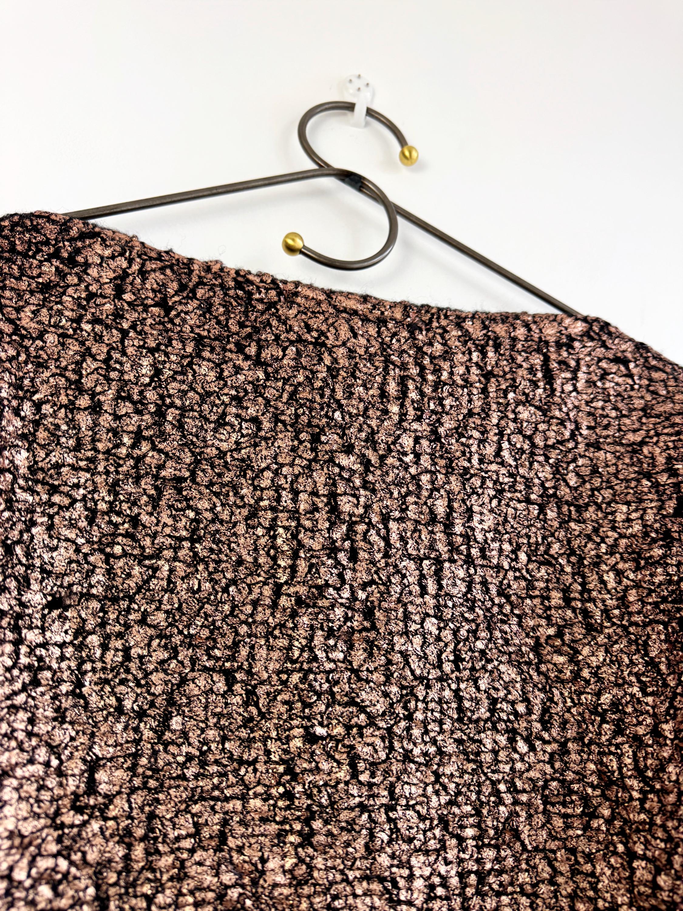 Elevate your evening wardrobe with this stunning vintage Italian metallic knit sweater by the brand !M?ERFECT by Five Seasons in size S. This eye-catching metallic sweater features a unique, textured "crackled" bronze gold foil effect over a soft, fuzzy black base, creating a sophisticated avant-garde aesthetic. Designed with a flattering boat neckline and a cropped silhouette, this cracked gold pullover strikes the perfect balance between high-fashion drama and cozy comfort.