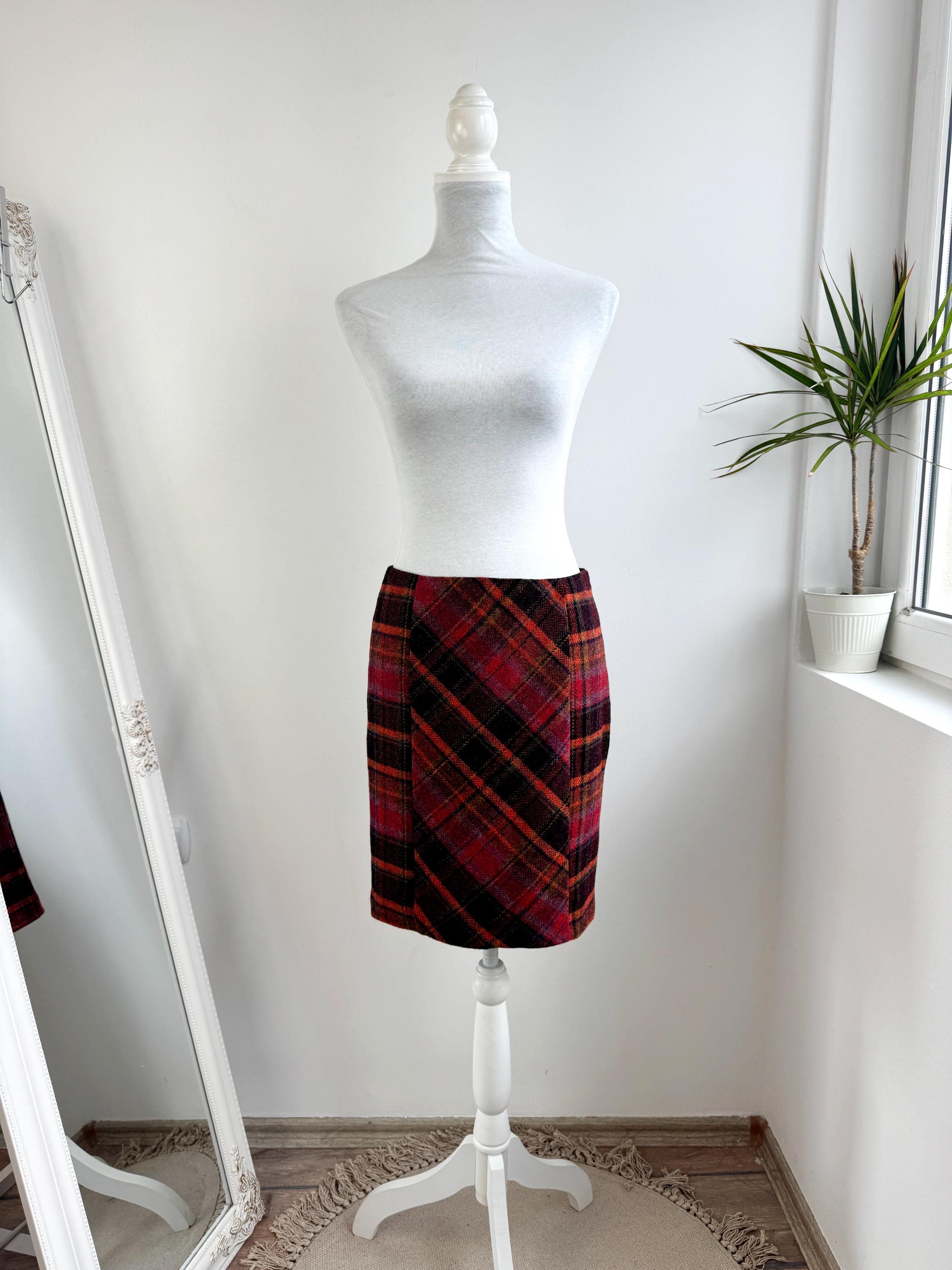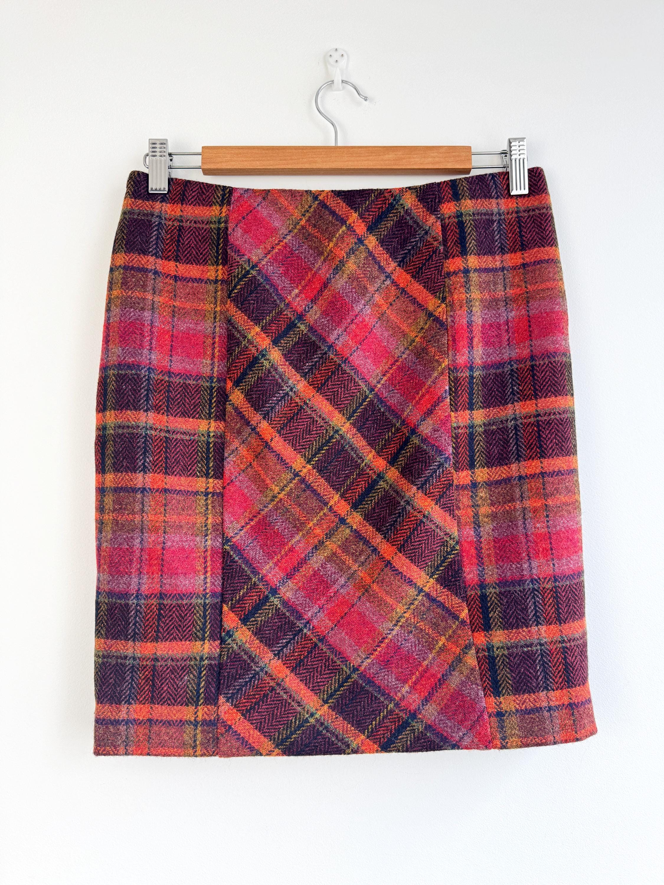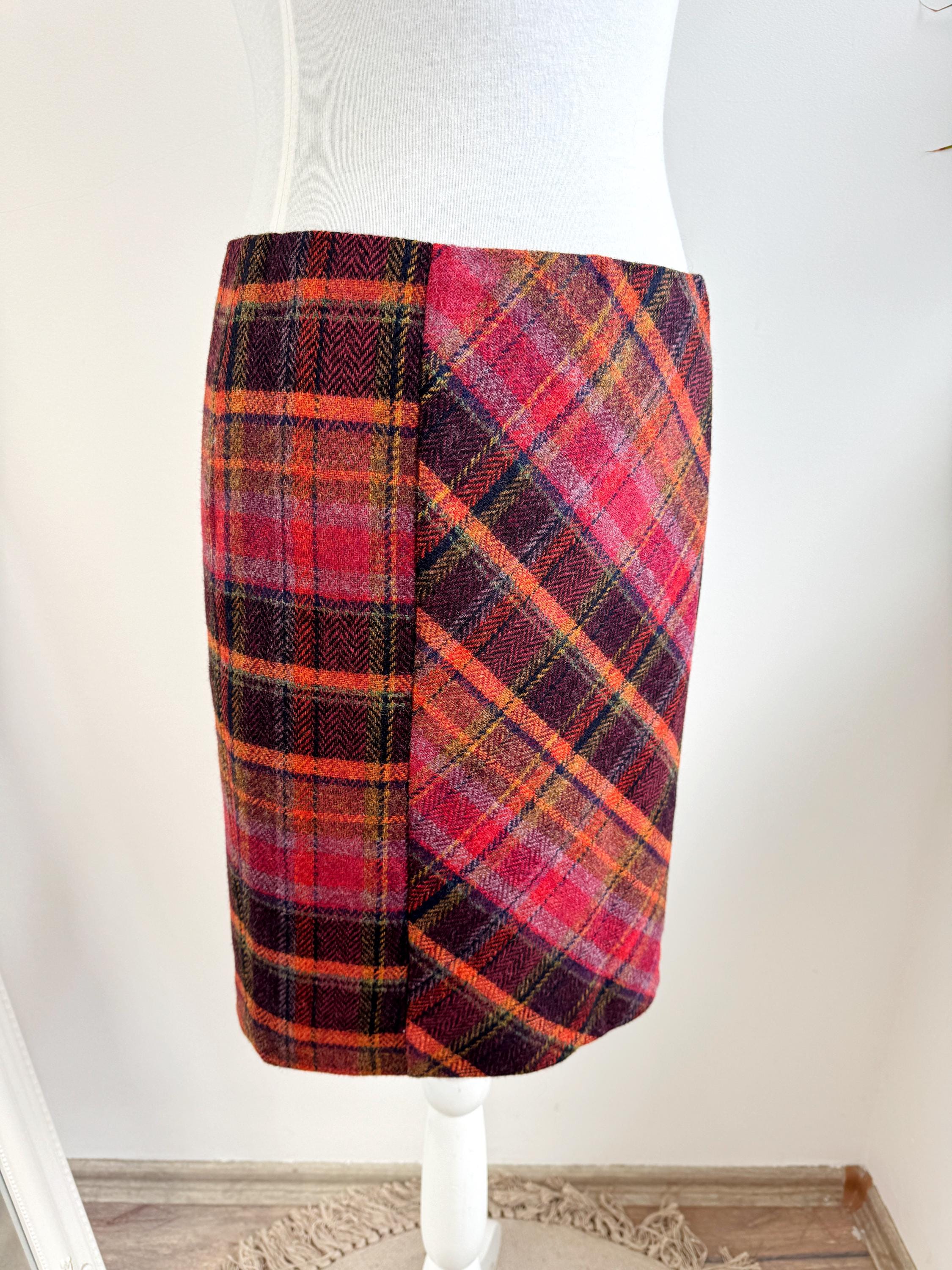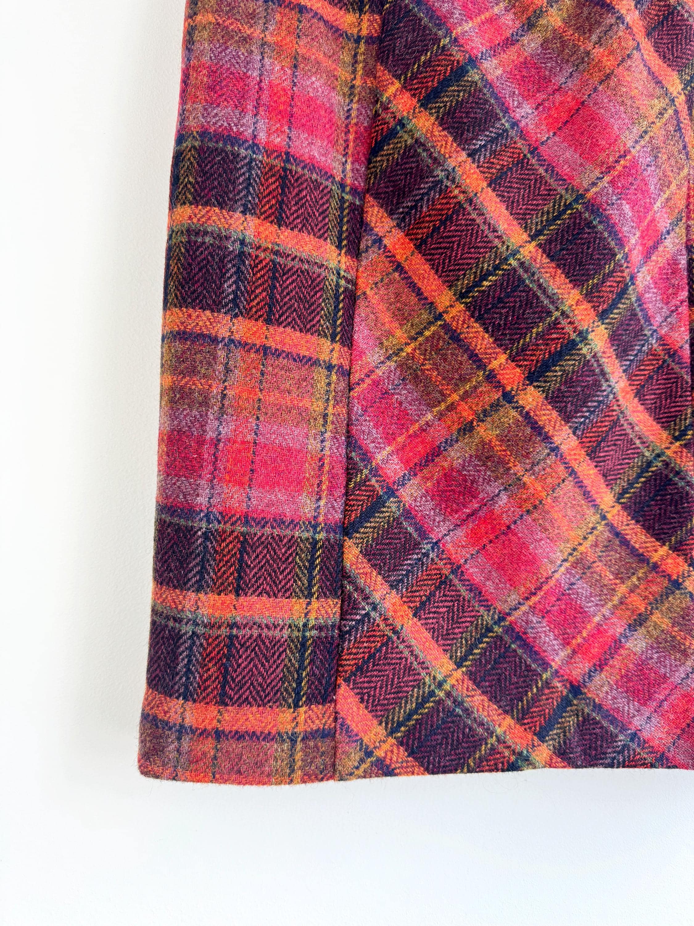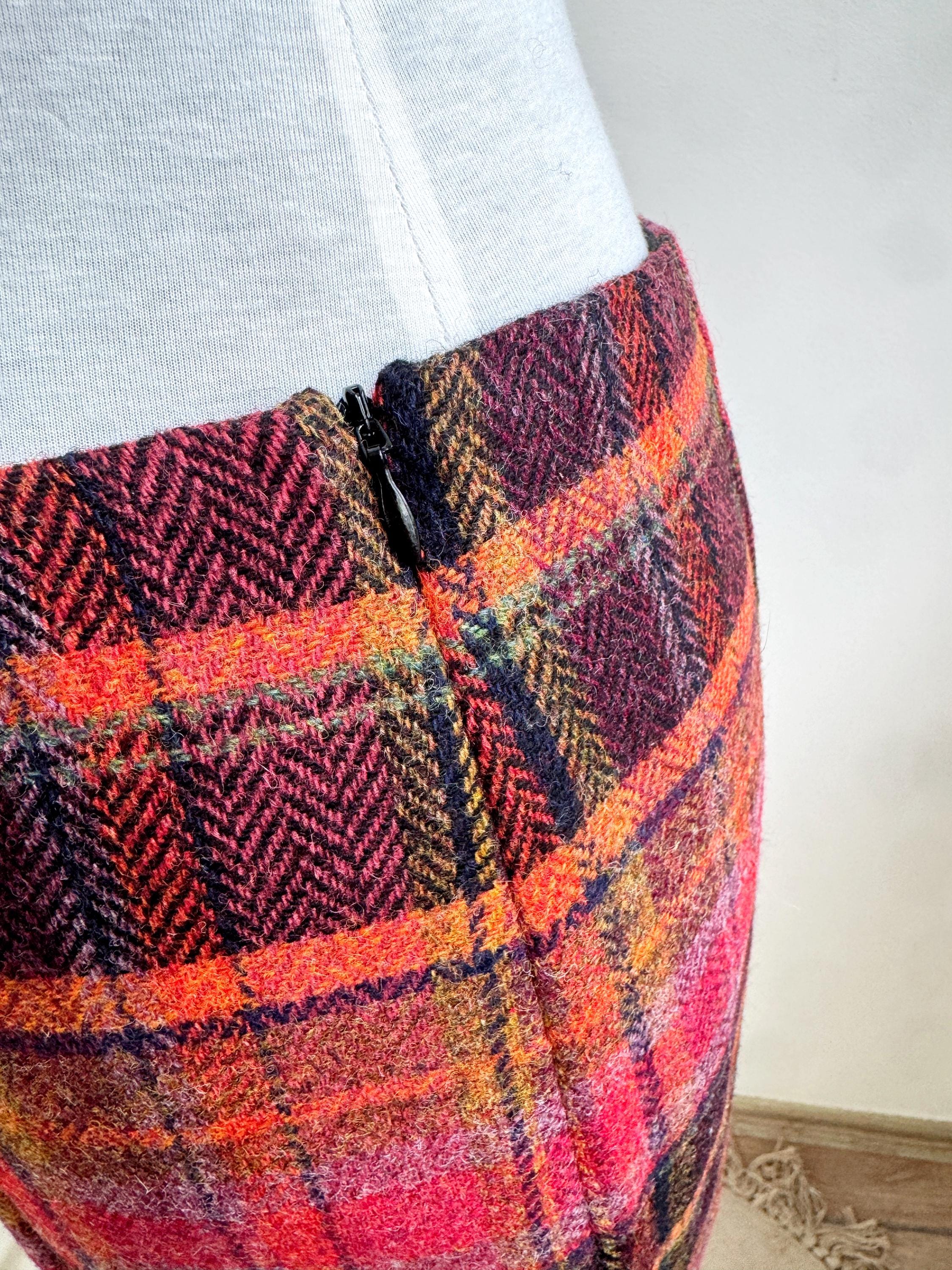 Step into effortless vintage style with this beautifully crafted 100% new wool mini skirt in size M. Featuring a rich, textured herringbone plaid in a bold palette of magenta, tangerine, and plum, this 100% wool mini skirt perfectly bridges the gap between classic academic style and modern street fashion. The unique construction combines straight side panels with a diagonal bias-cut center, allowing the fabric to move beautifully while maintaining a sleek, tailored silhouette.