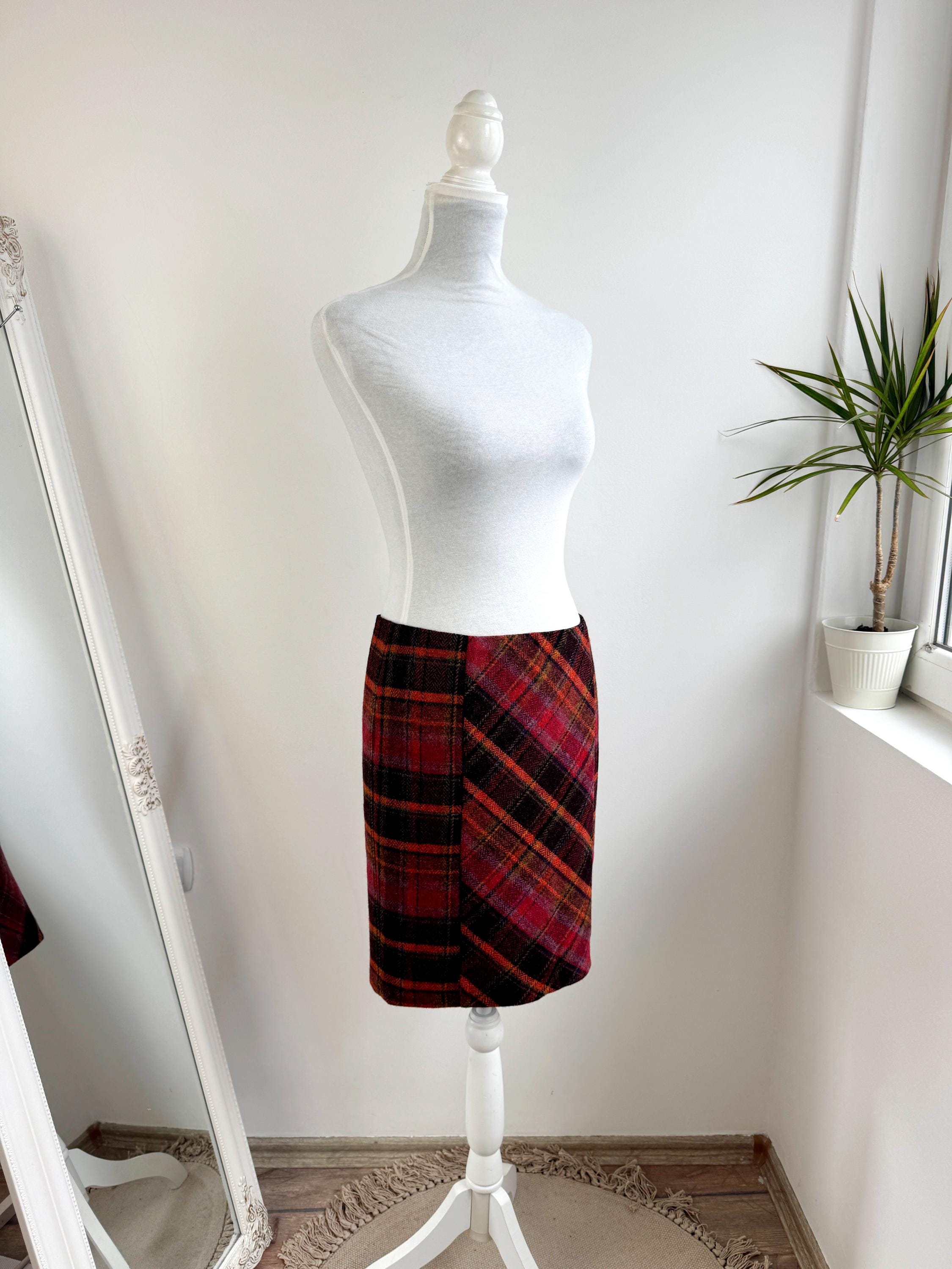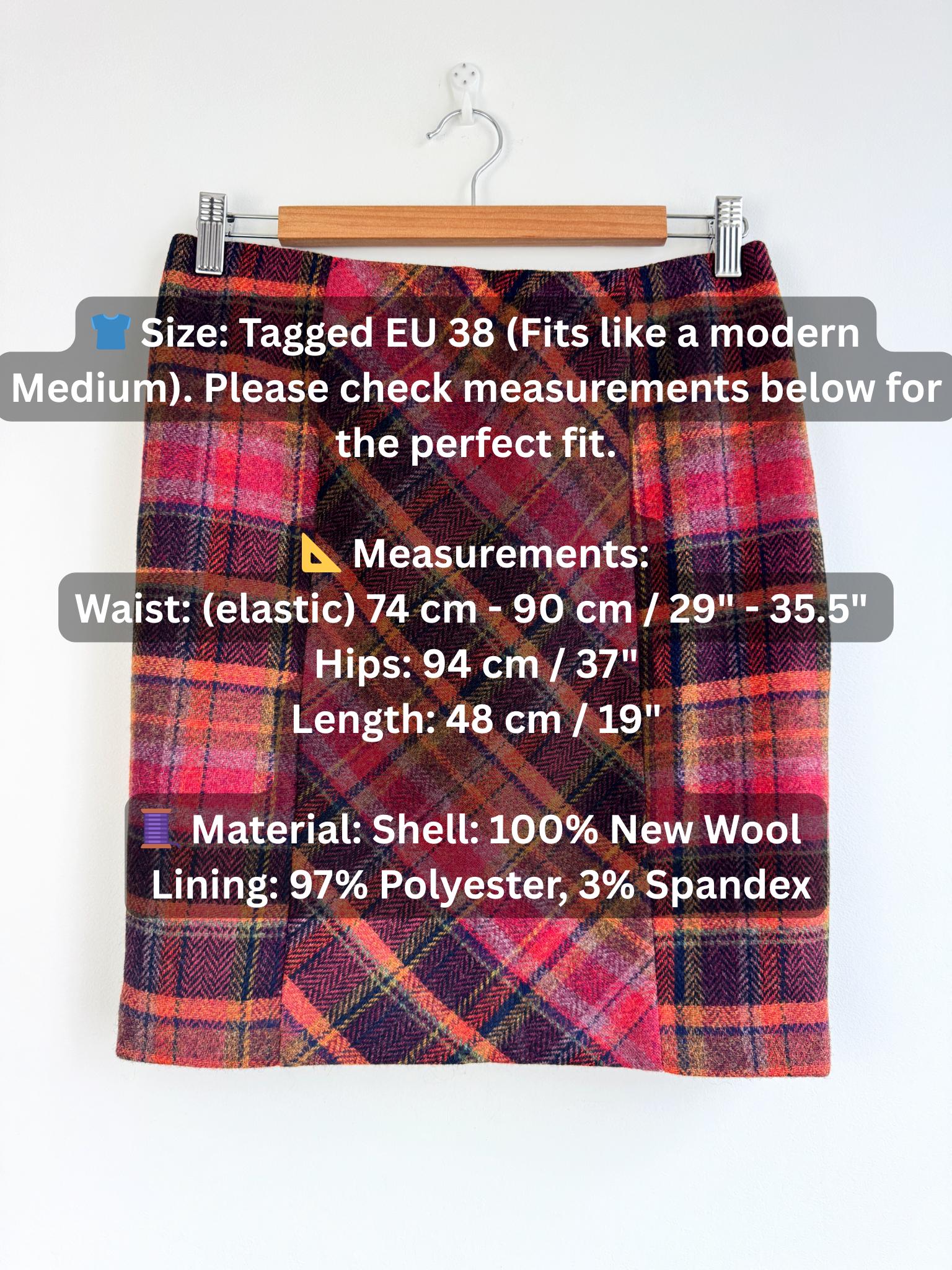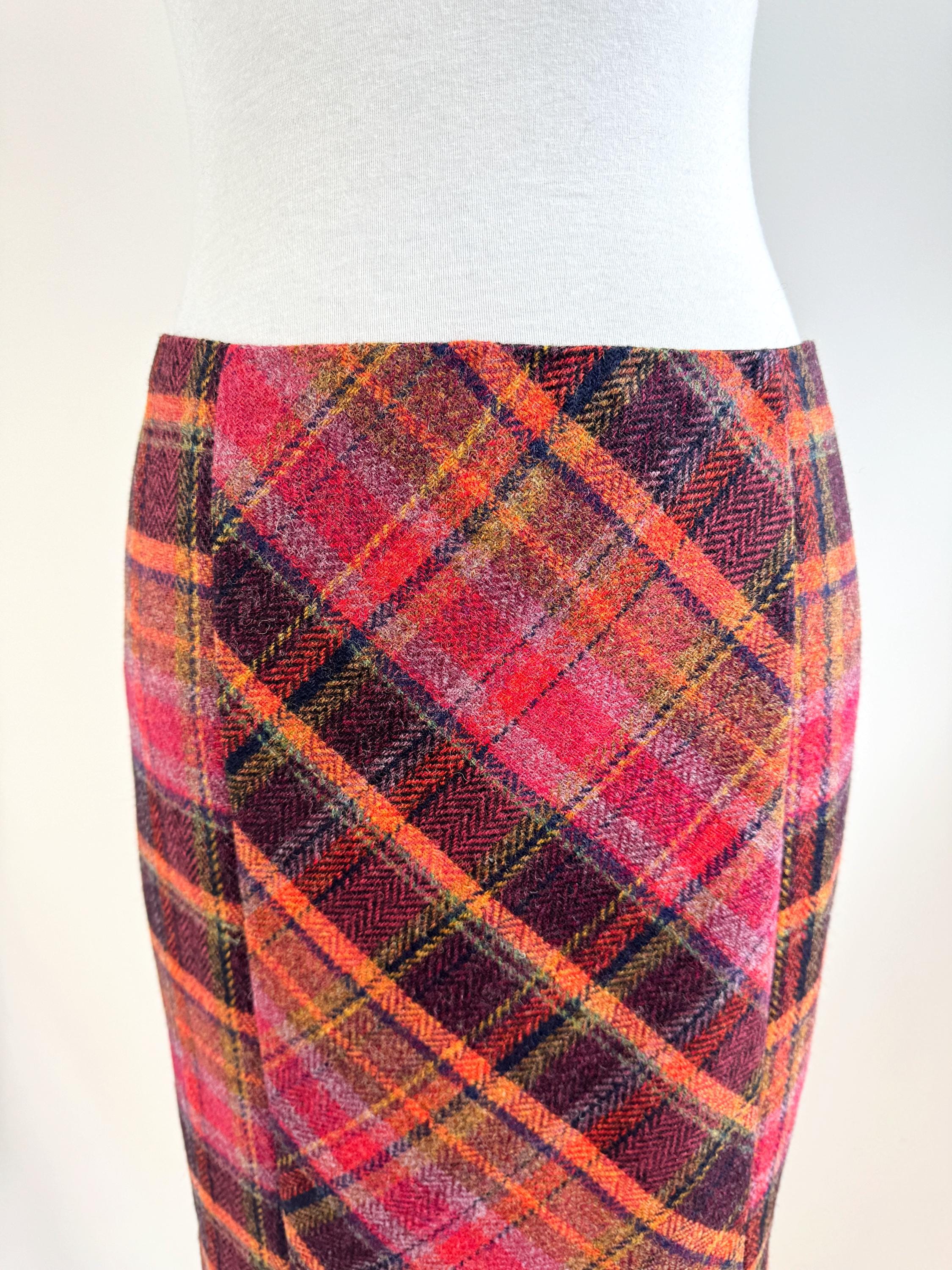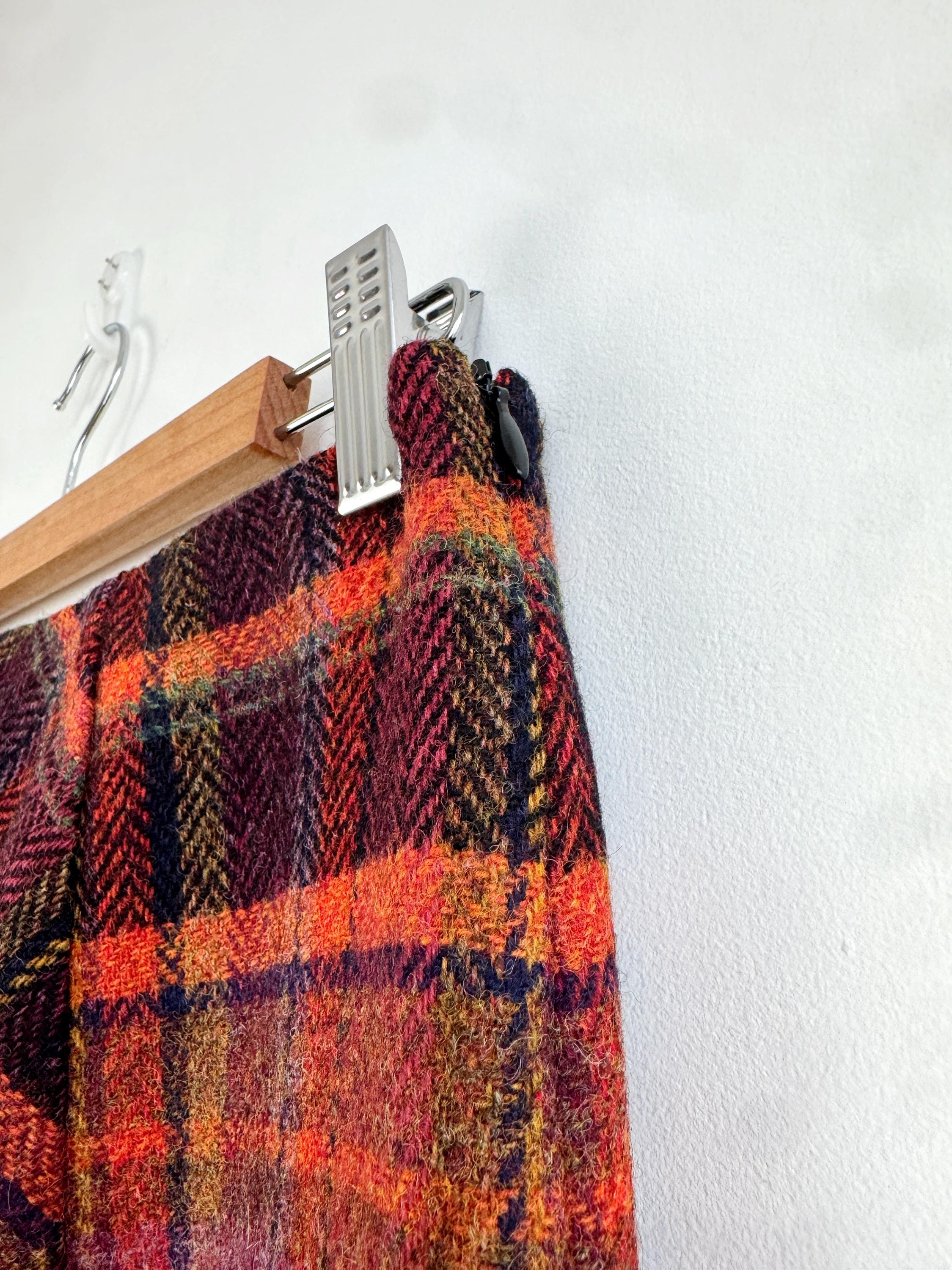 Step into effortless vintage style with this beautifully crafted 100% new wool mini skirt in size M. Featuring a rich, textured herringbone plaid in a bold palette of magenta, tangerine, and plum, this 100% wool mini skirt perfectly bridges the gap between classic academic style and modern street fashion. The unique construction combines straight side panels with a diagonal bias-cut center, allowing the fabric to move beautifully while maintaining a sleek, tailored silhouette.