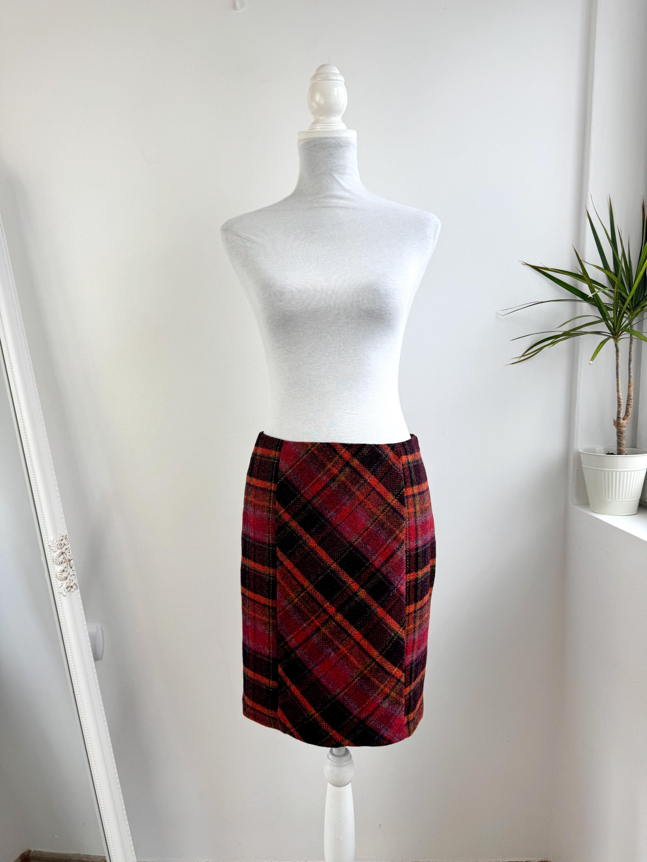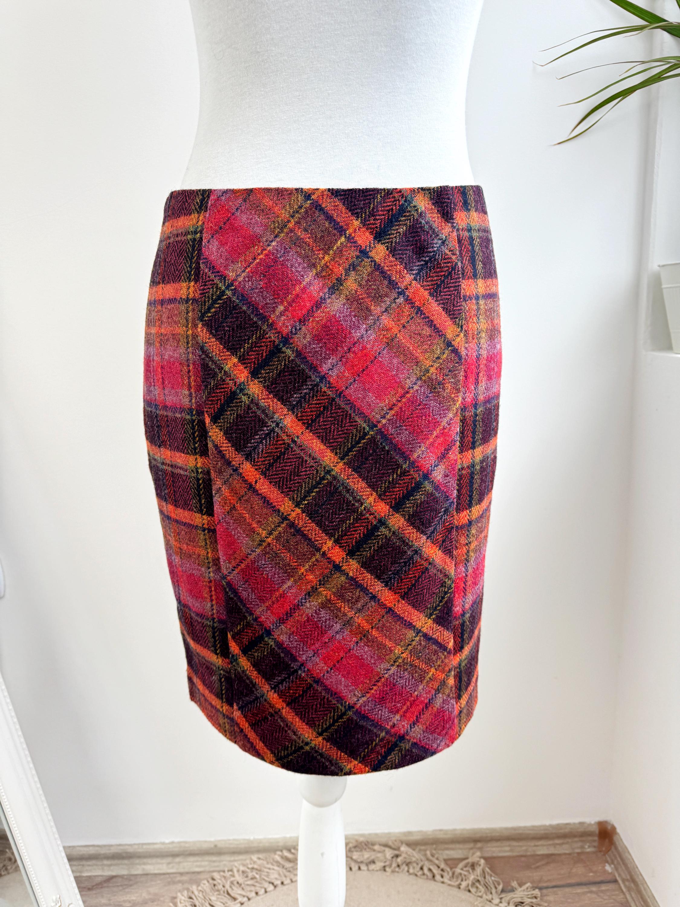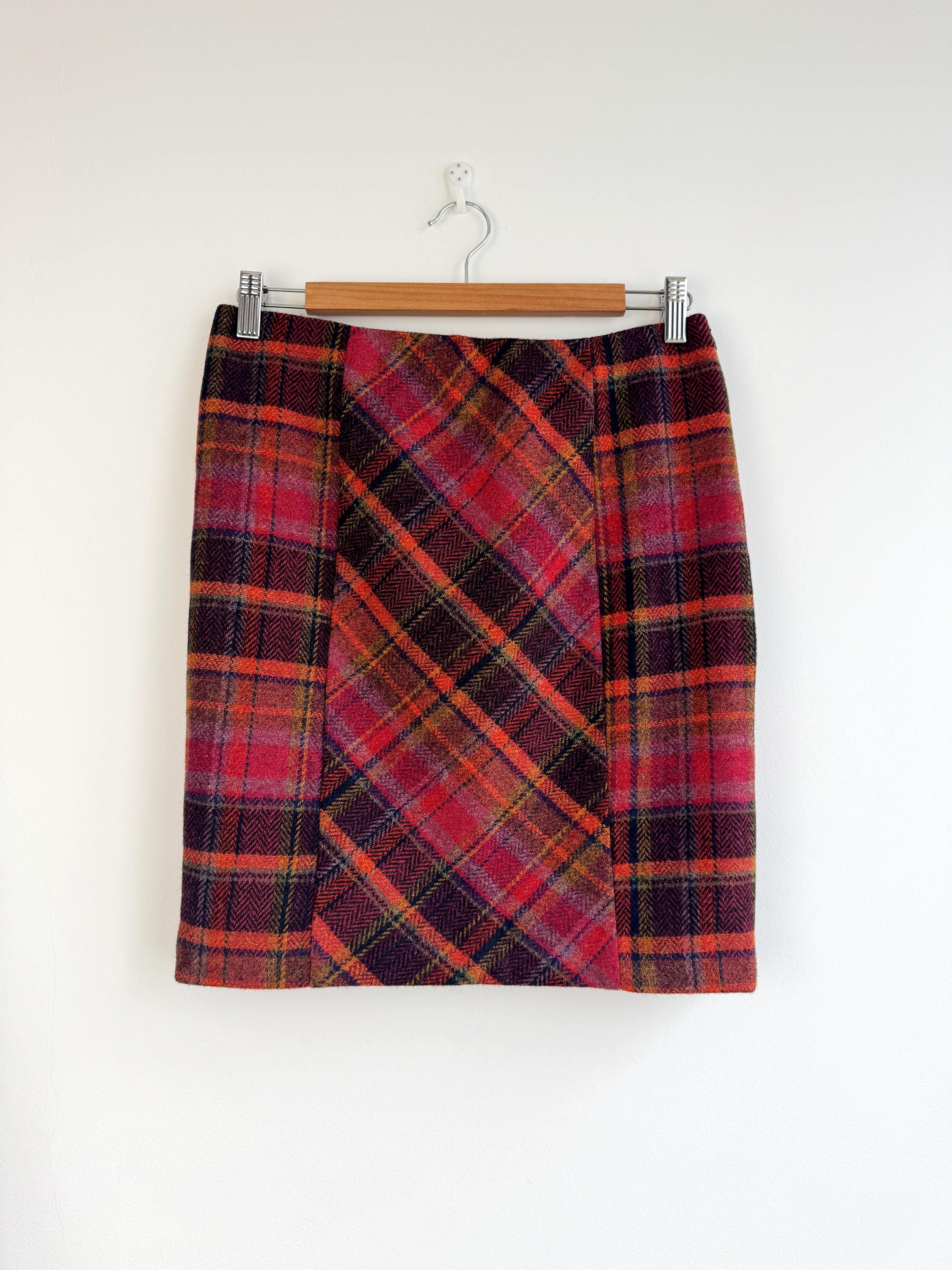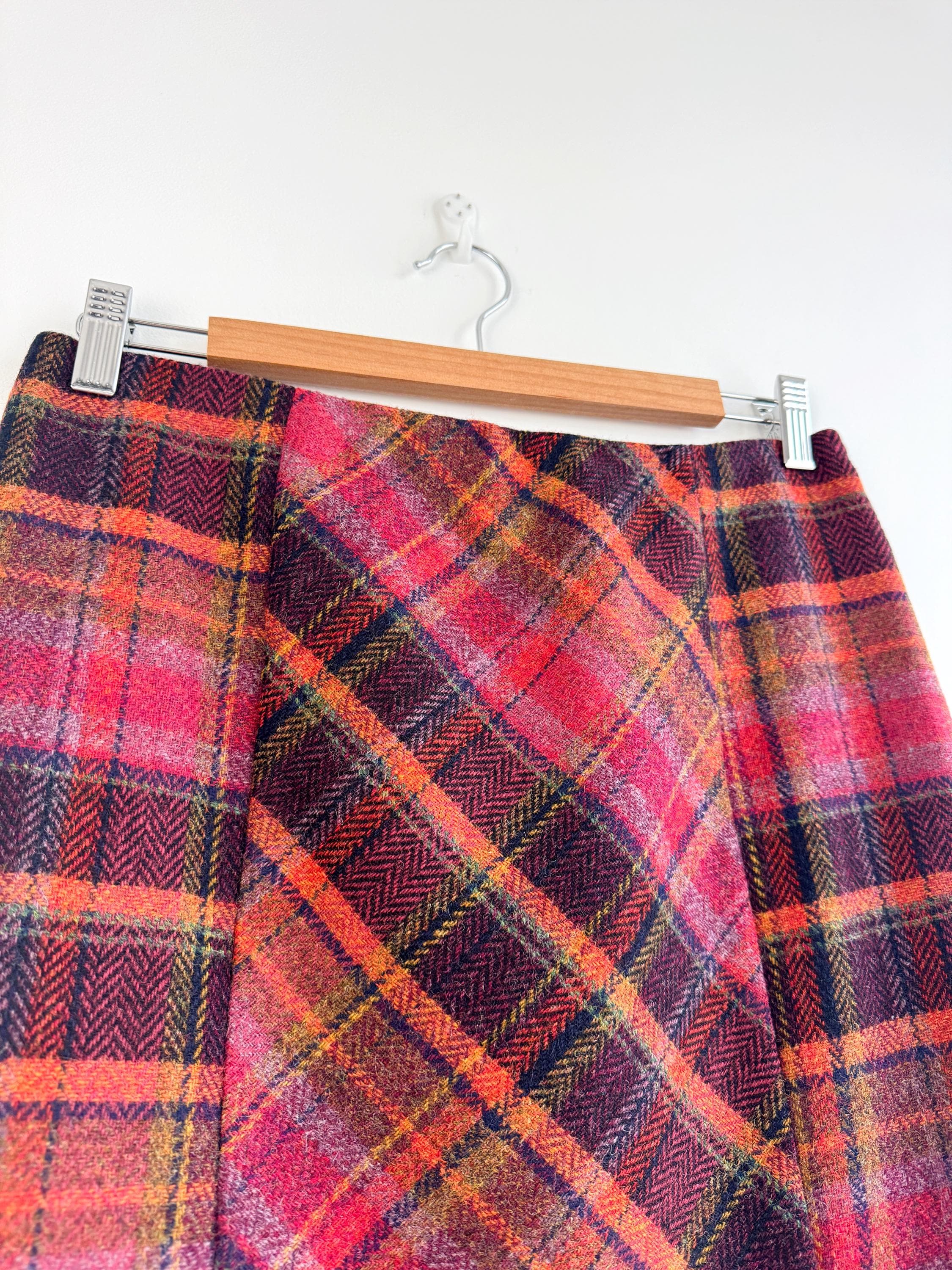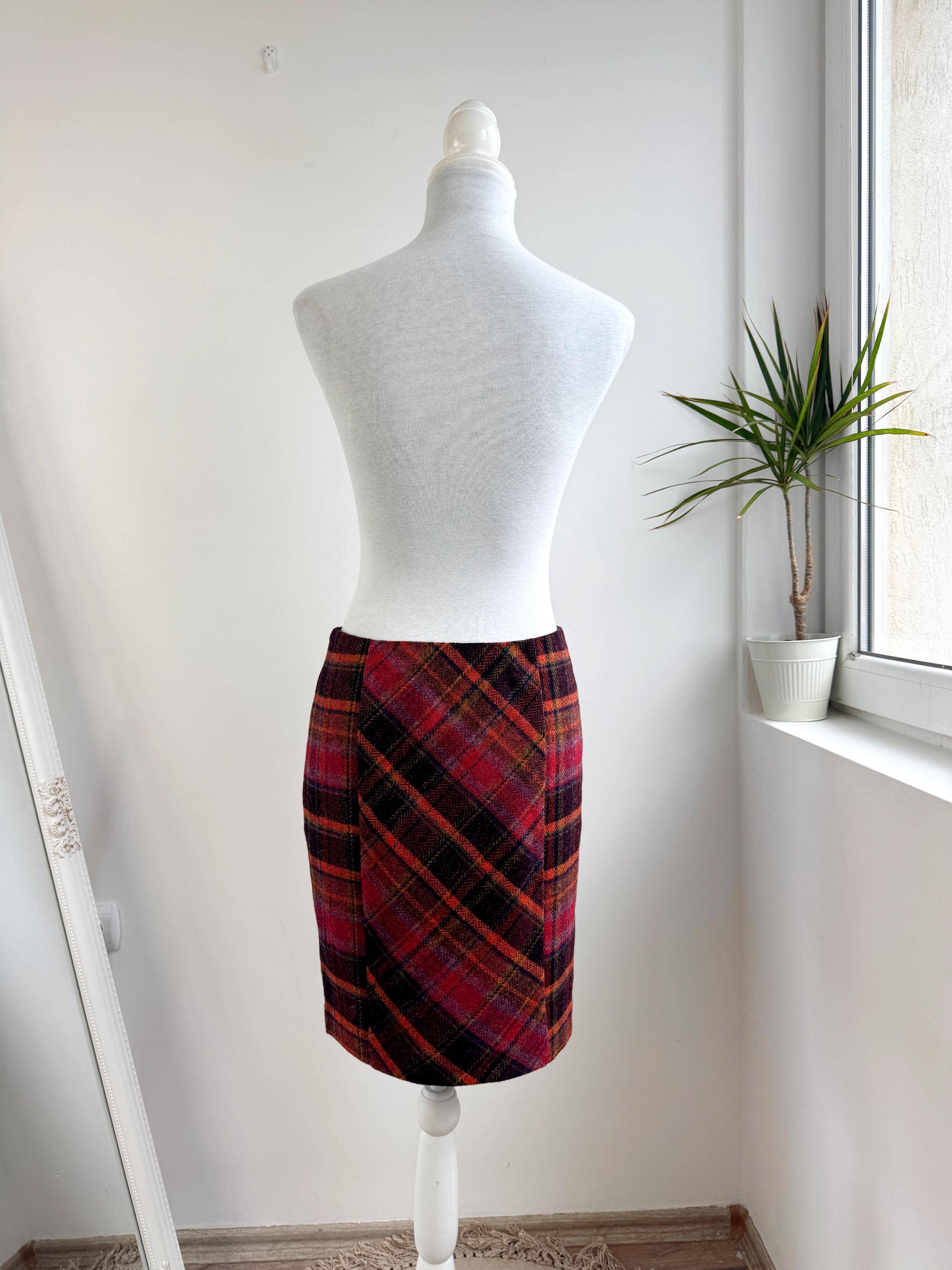 Step into effortless vintage style with this beautifully crafted 100% new wool mini skirt in size M. Featuring a rich, textured herringbone plaid in a bold palette of magenta, tangerine, and plum, this 100% wool mini skirt perfectly bridges the gap between classic academic style and modern street fashion. The unique construction combines straight side panels with a diagonal bias-cut center, allowing the fabric to move beautifully while maintaining a sleek, tailored silhouette.