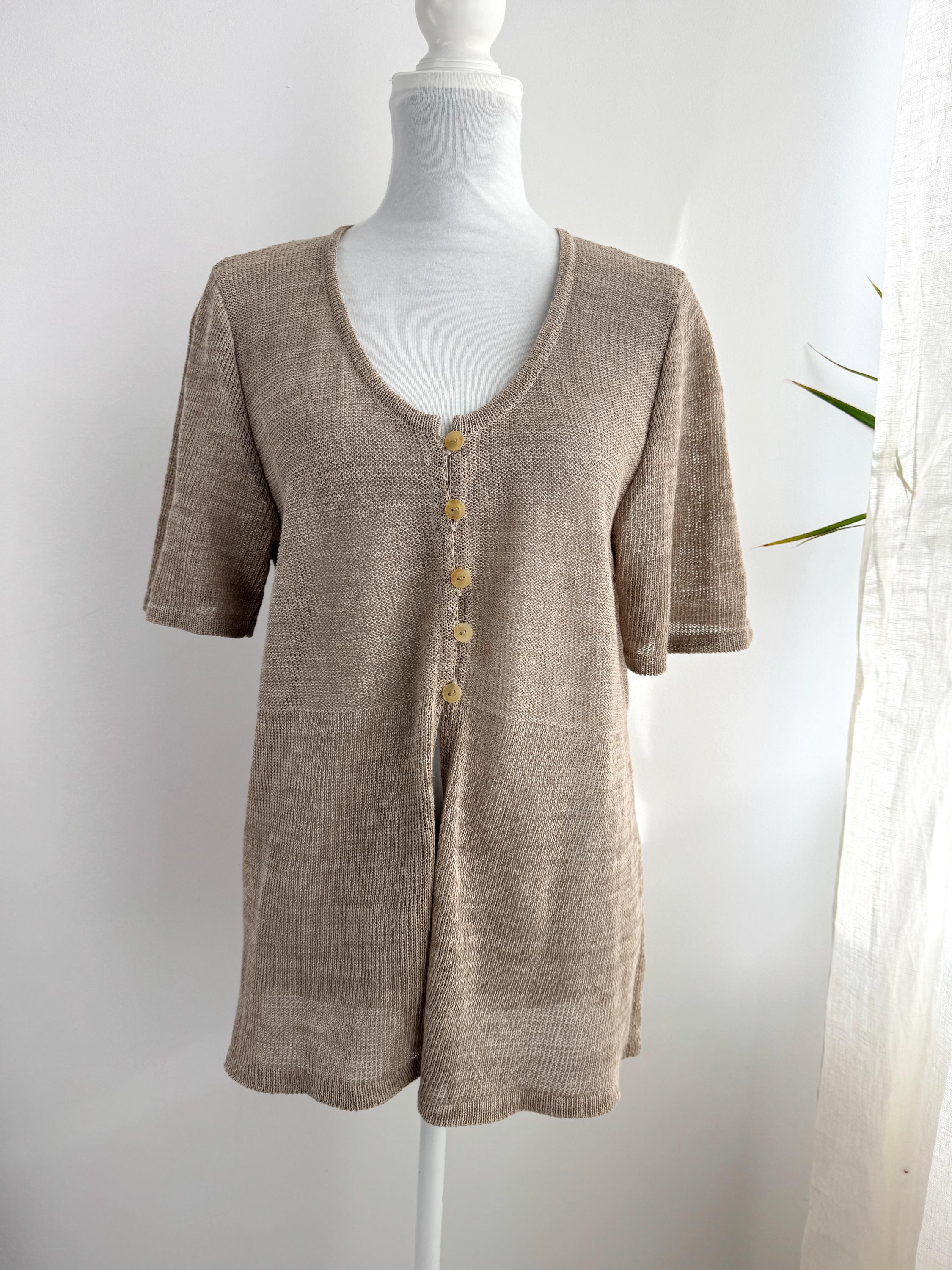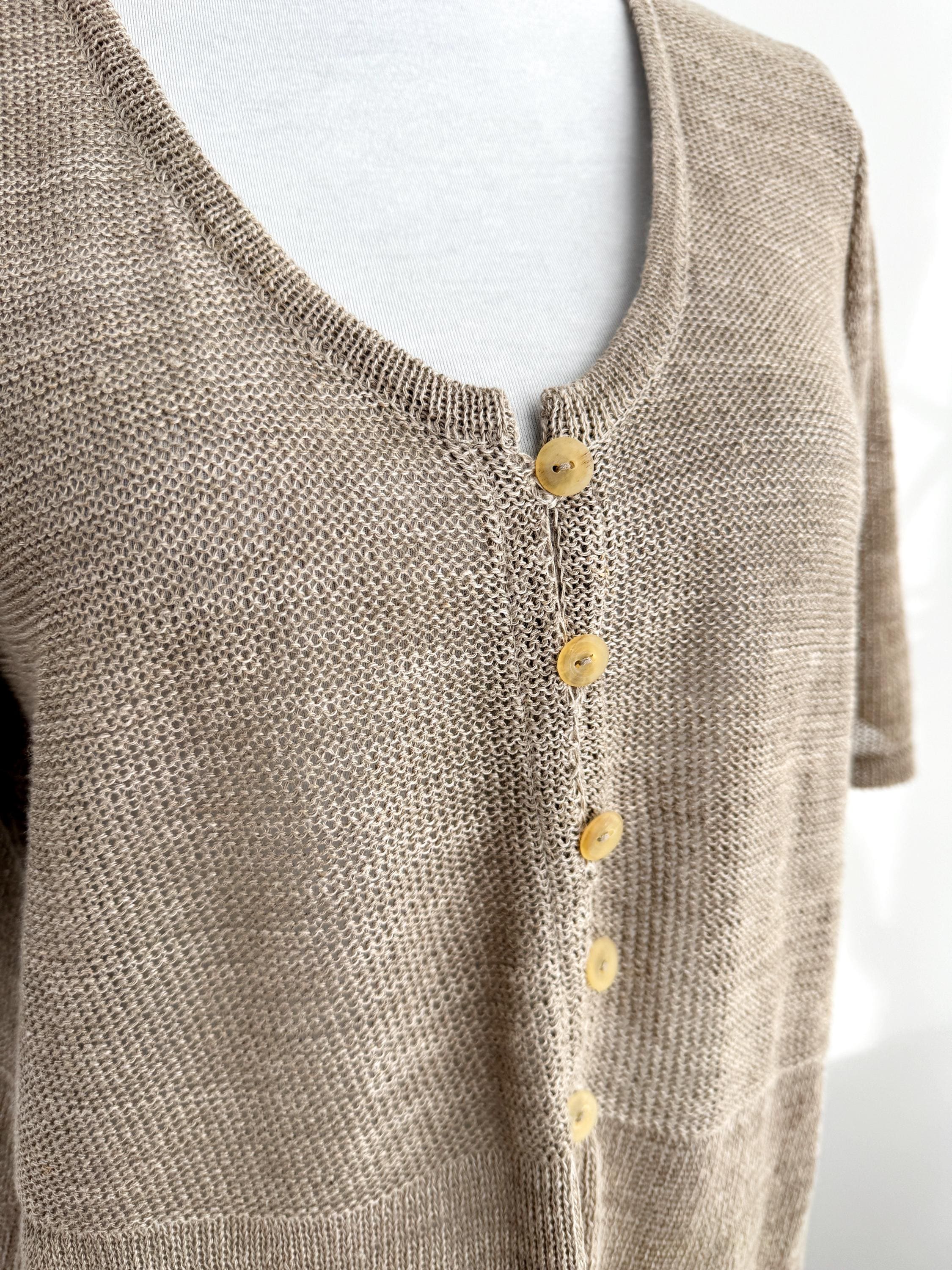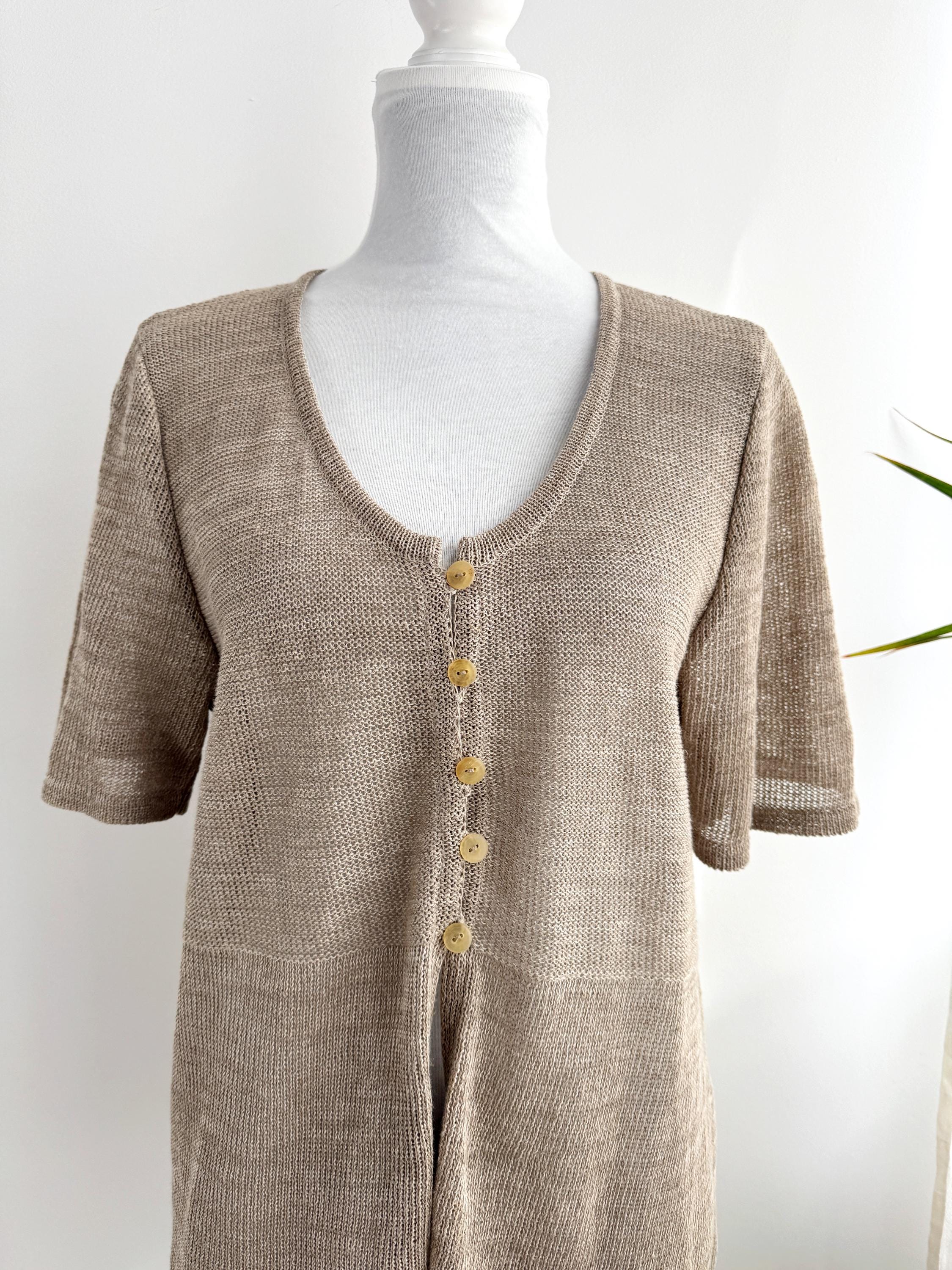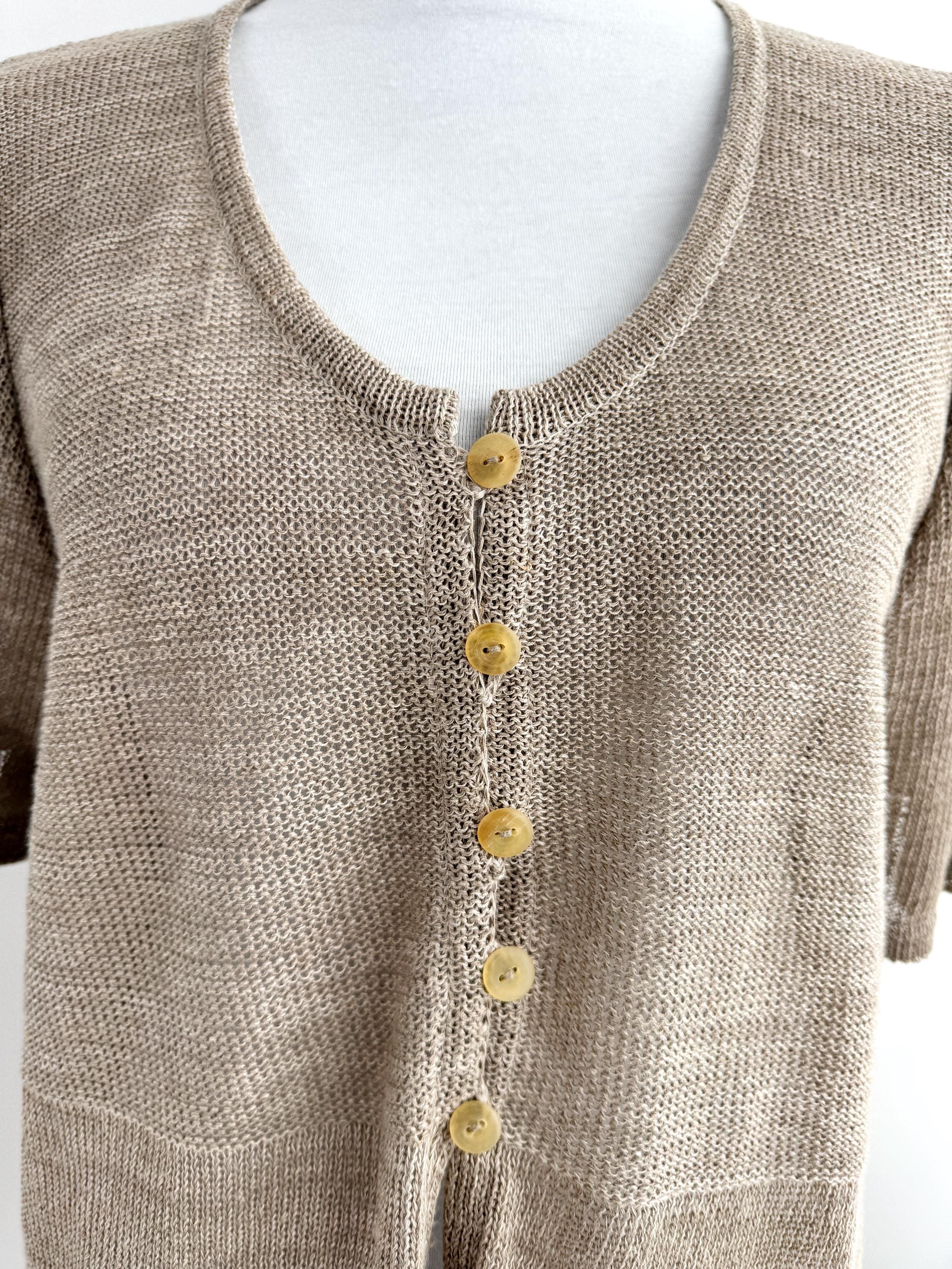 This vintage short-sleeve knit cardigan is the ultimate essential for a sophisticated, minimalist wardrobe. Crafted from a high-quality blend of 70% linen and 30% cotton, this taupe knitted cardigan offers a breathable, lightweight feel that is perfect for layering during the warmer months or transitioning between seasons. The neutral taupe/beige hue and delicate pointelle-style knit texture provide a timeless, earthy aesthetic that pairs effortlessly with linen trousers, denim, or silk skirts.