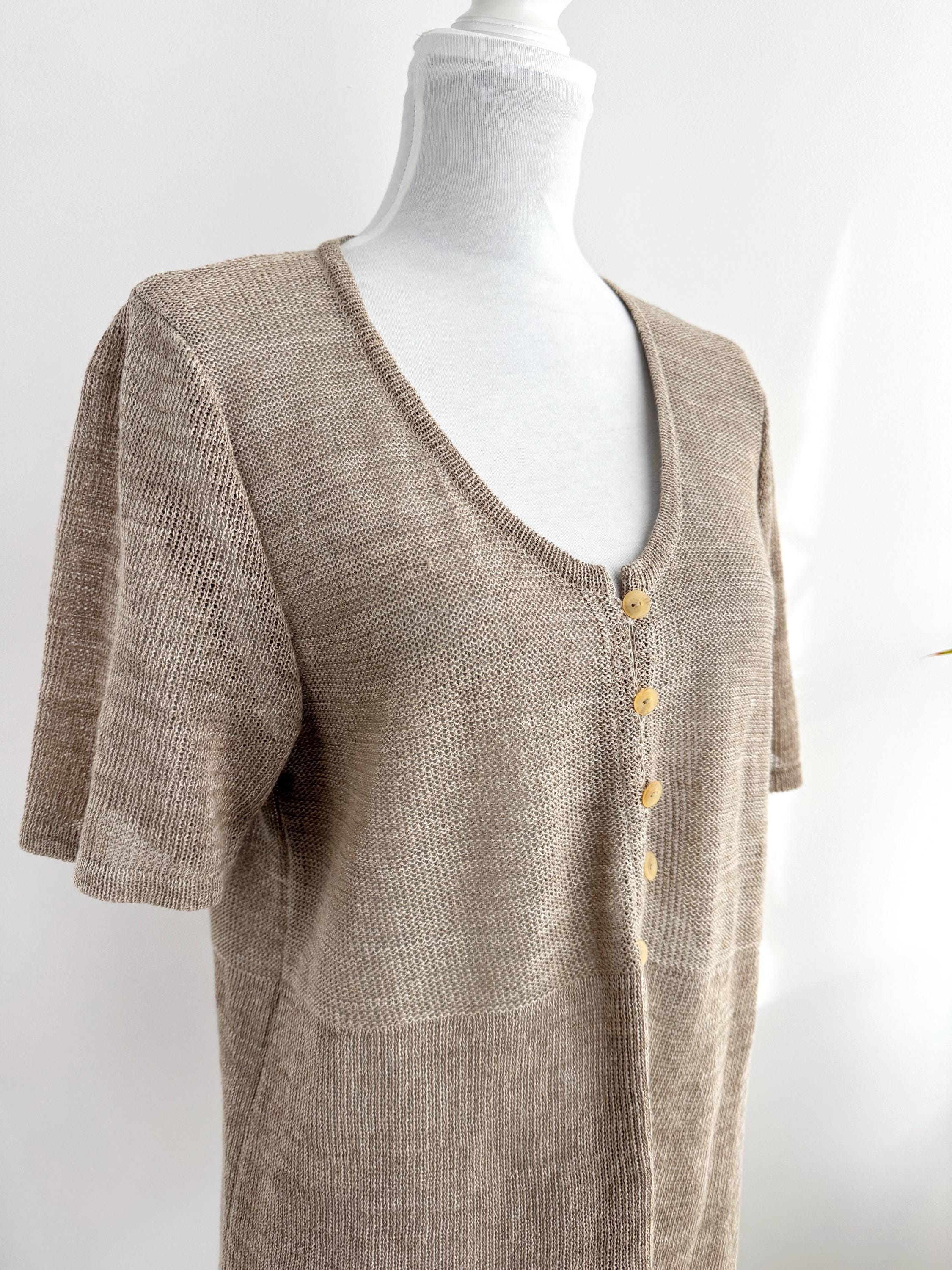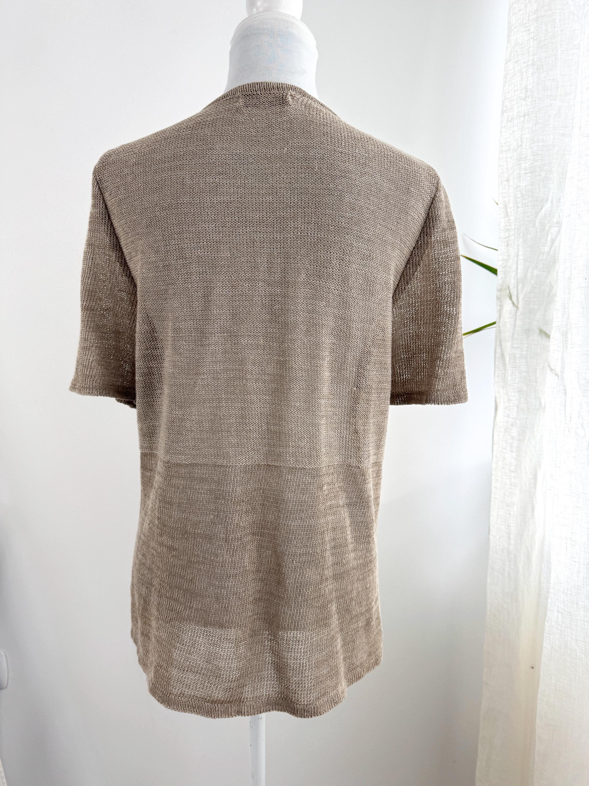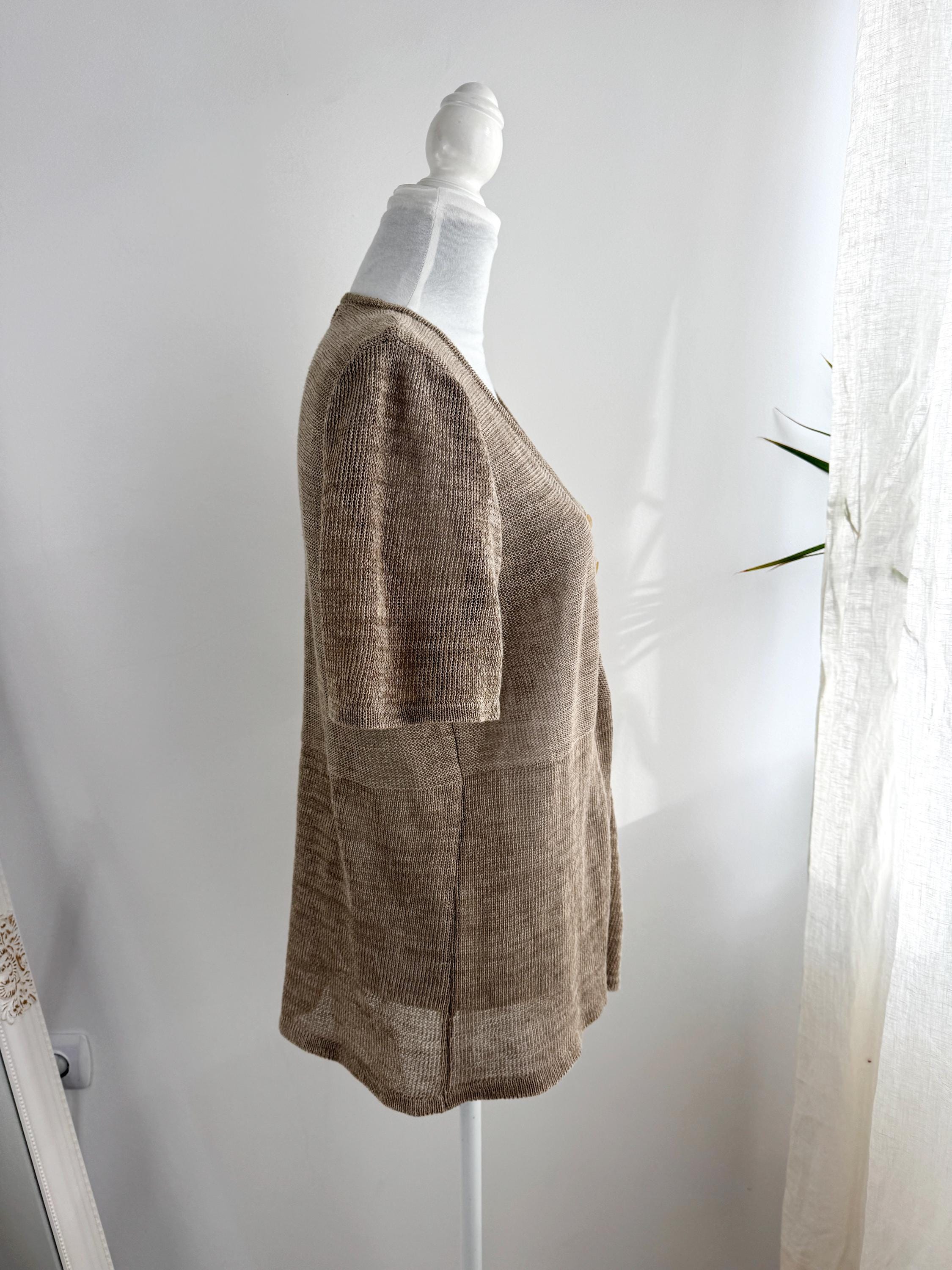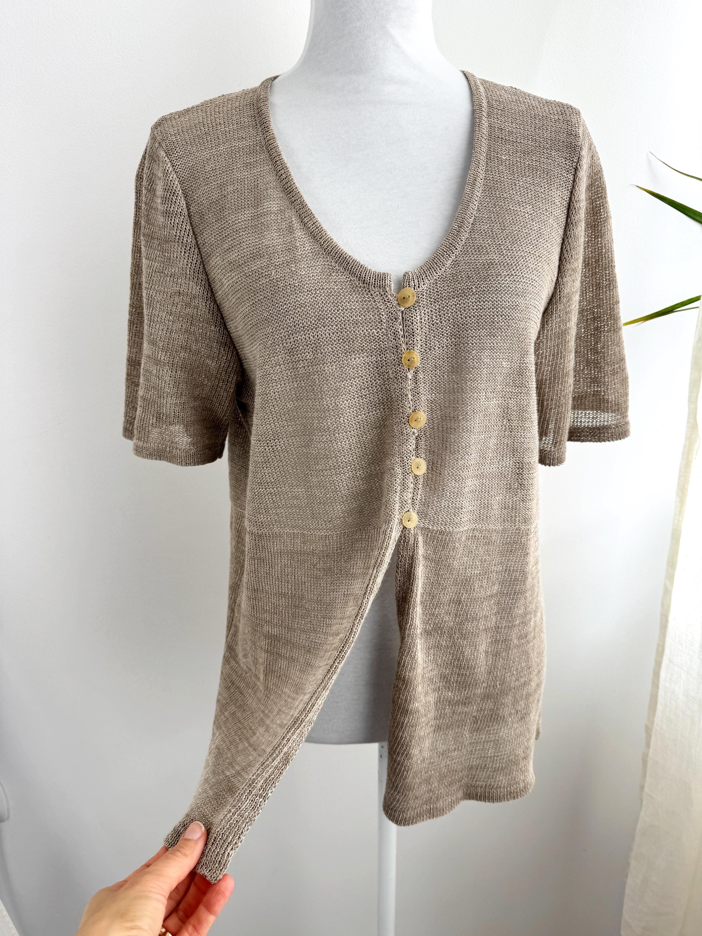 This vintage short-sleeve knit cardigan is the ultimate essential for a sophisticated, minimalist wardrobe. Crafted from a high-quality blend of 70% linen and 30% cotton, this taupe knitted cardigan offers a breathable, lightweight feel that is perfect for layering during the warmer months or transitioning between seasons. The neutral taupe/beige hue and delicate pointelle-style knit texture provide a timeless, earthy aesthetic that pairs effortlessly with linen trousers, denim, or silk skirts.