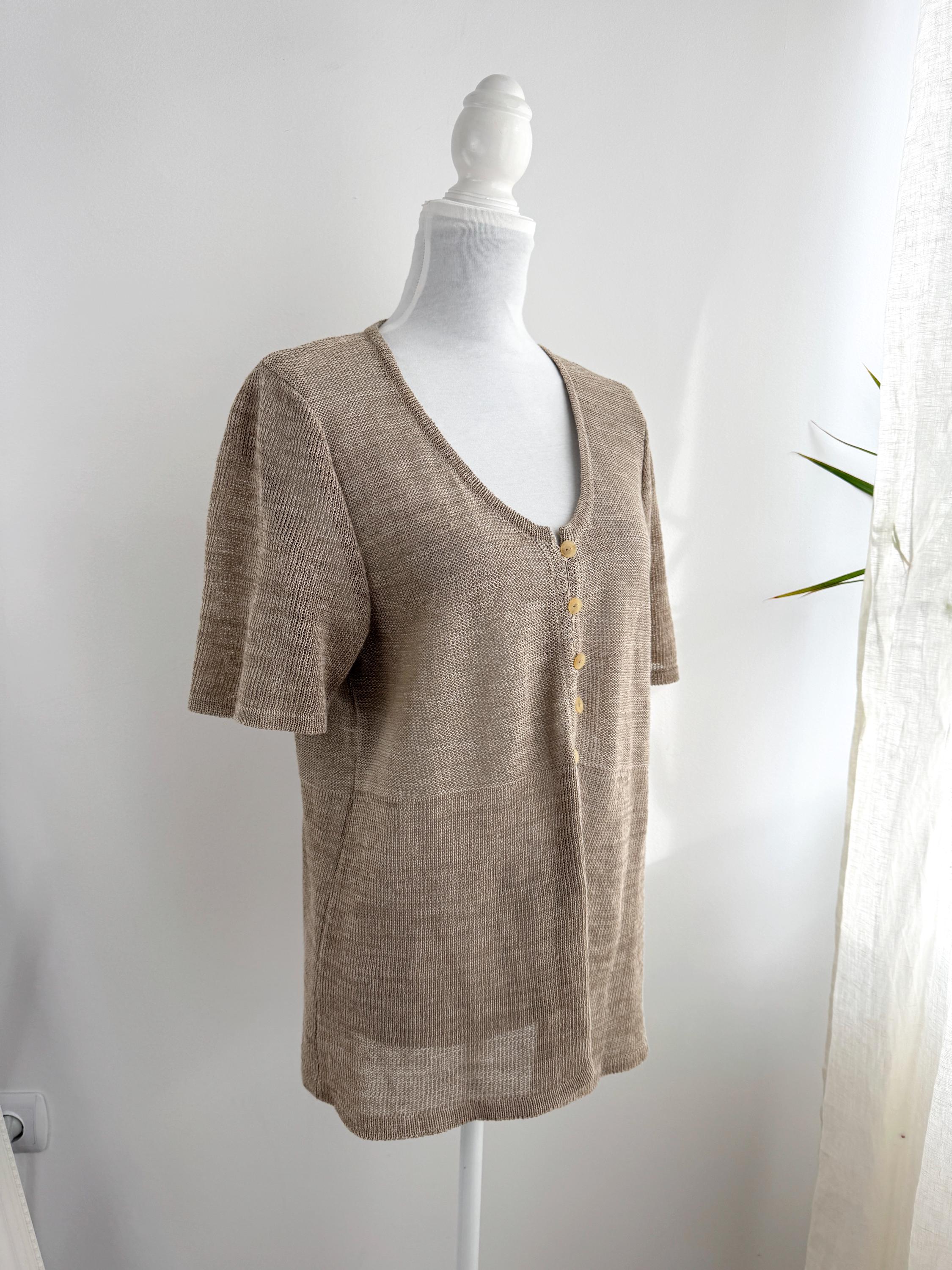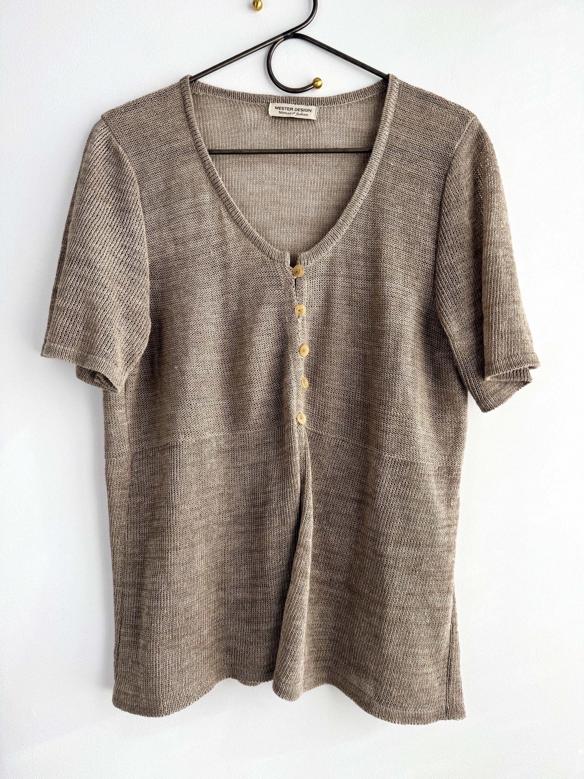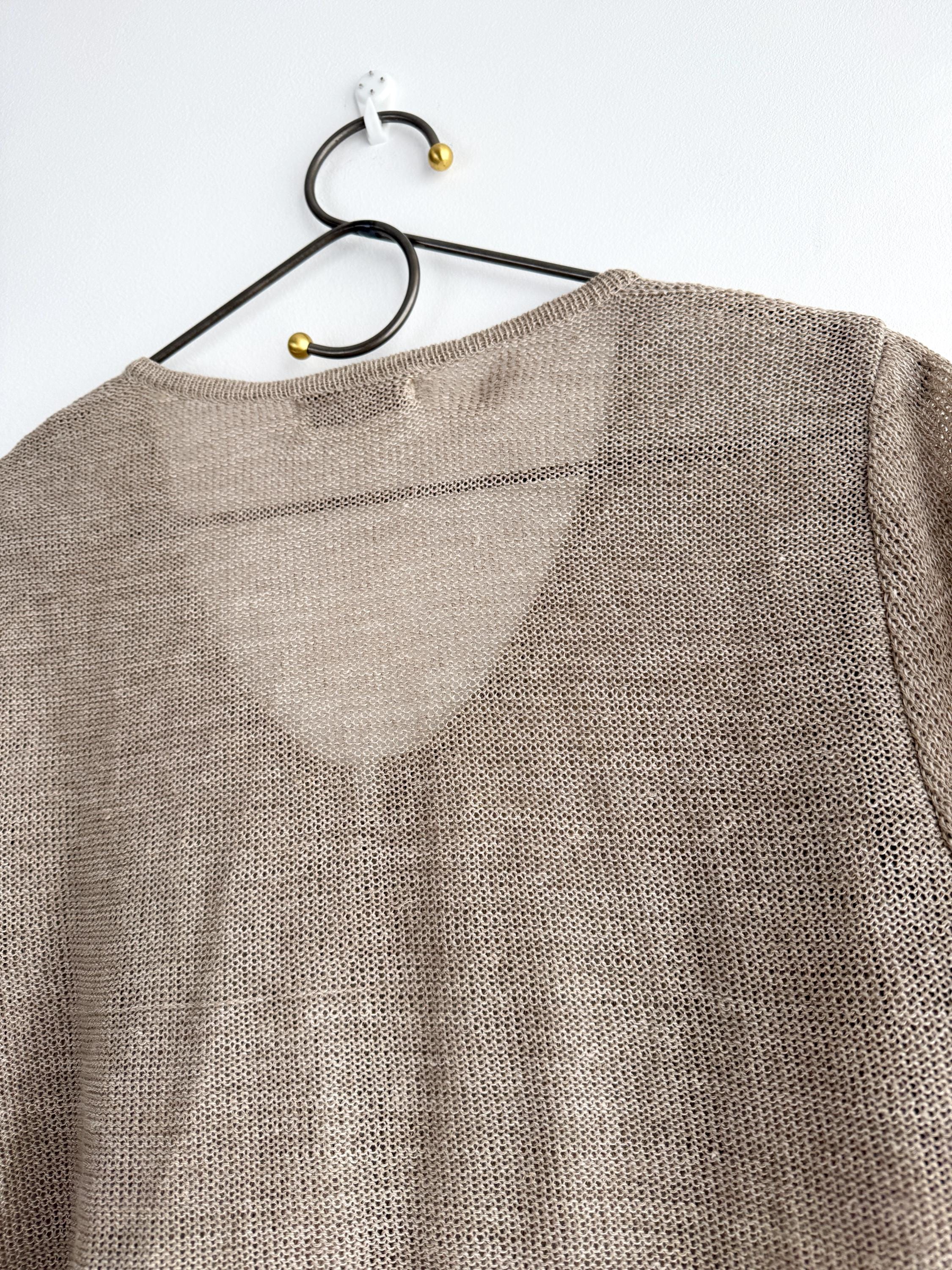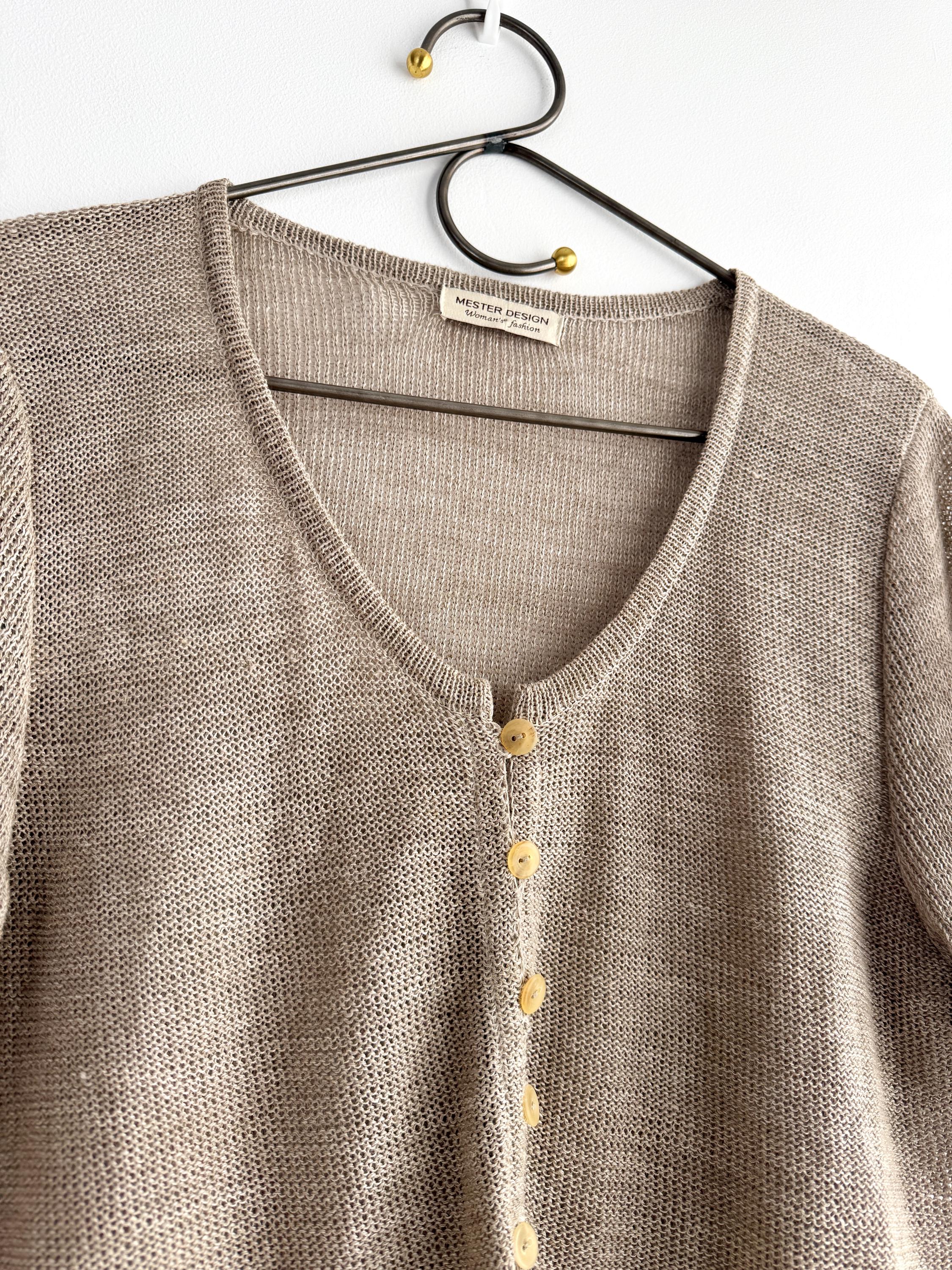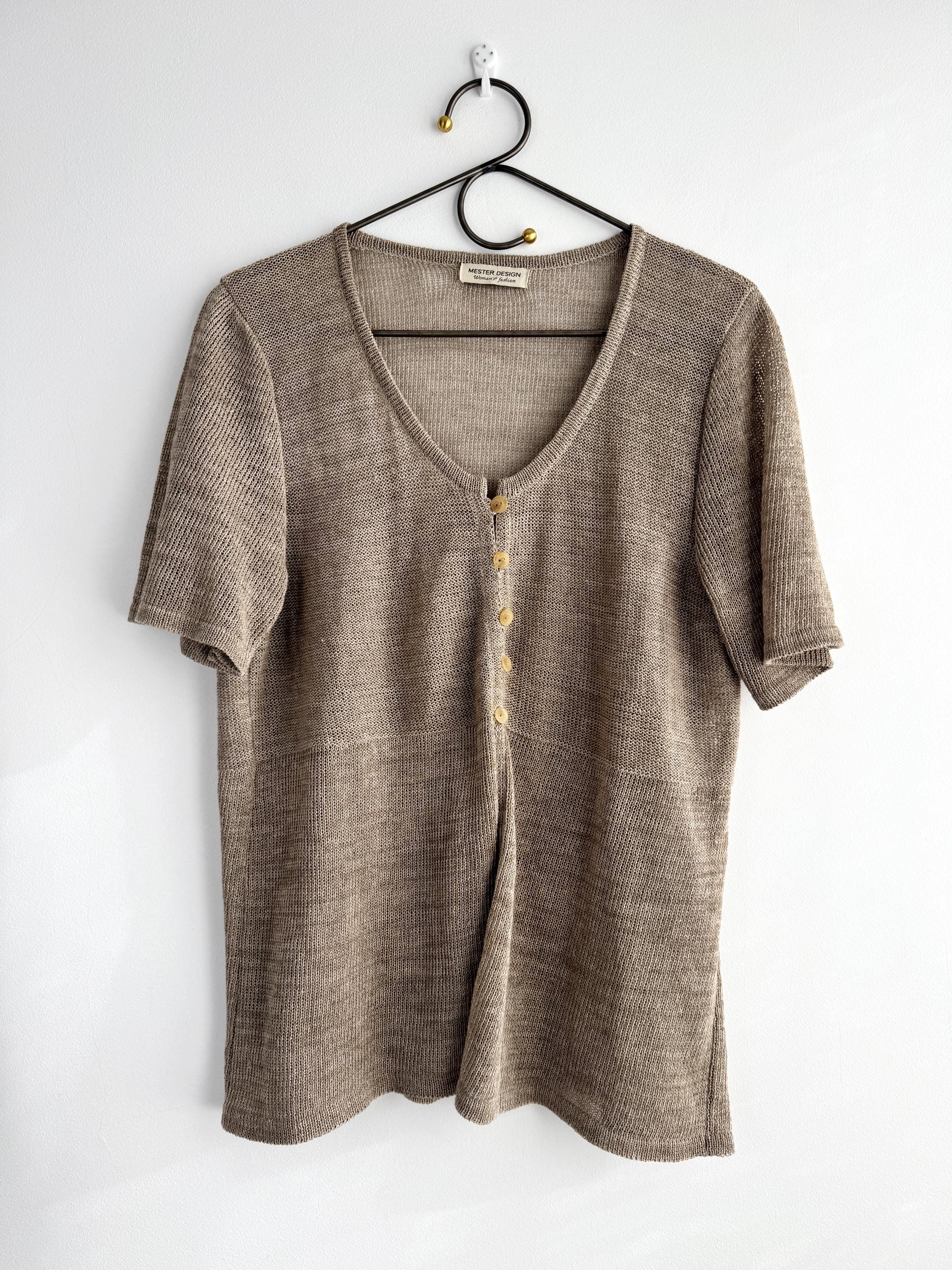 This vintage short-sleeve knit cardigan is the ultimate essential for a sophisticated, minimalist wardrobe. Crafted from a high-quality blend of 70% linen and 30% cotton, this taupe knitted cardigan offers a breathable, lightweight feel that is perfect for layering during the warmer months or transitioning between seasons. The neutral taupe/beige hue and delicate pointelle-style knit texture provide a timeless, earthy aesthetic that pairs effortlessly with linen trousers, denim, or silk skirts.