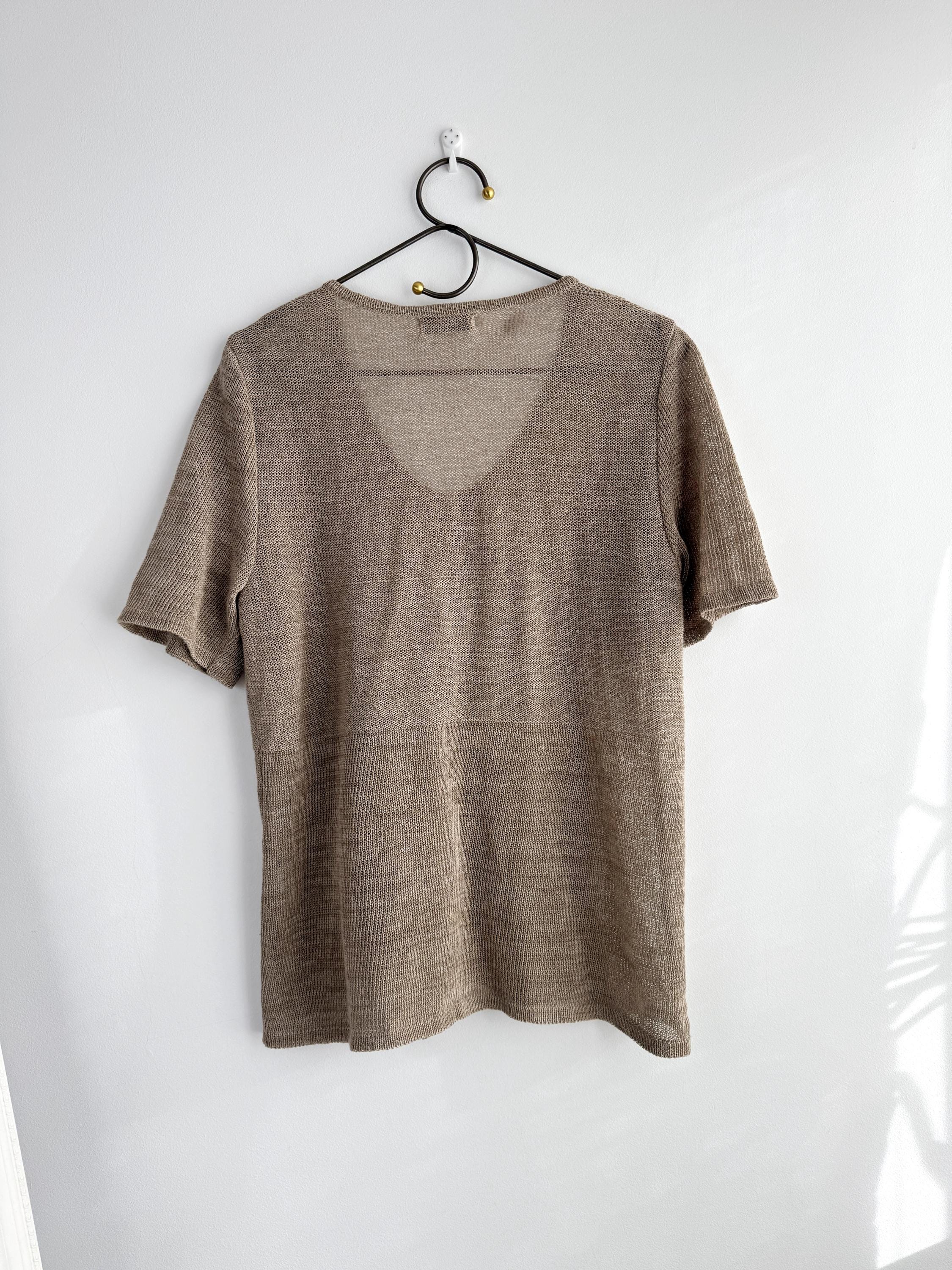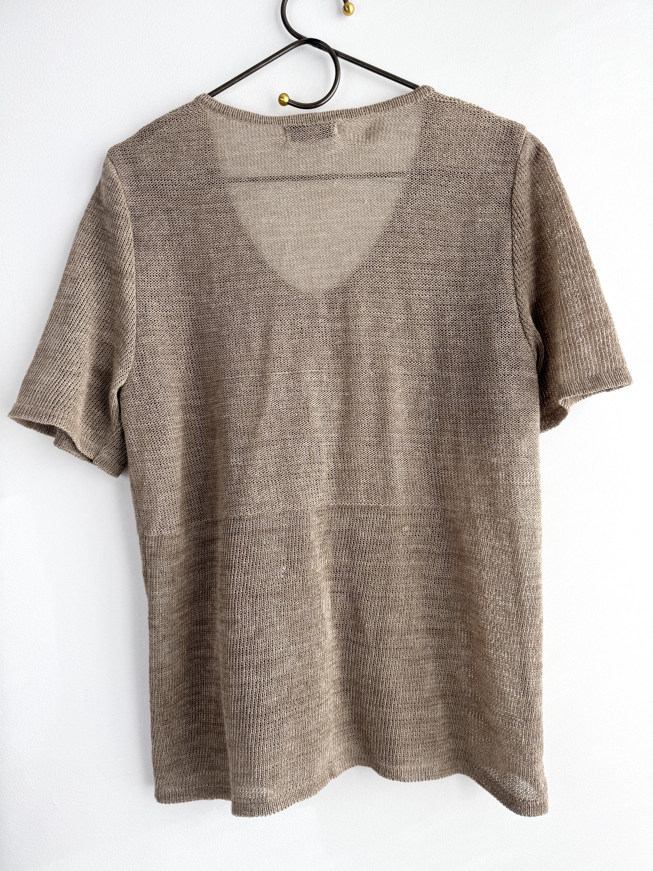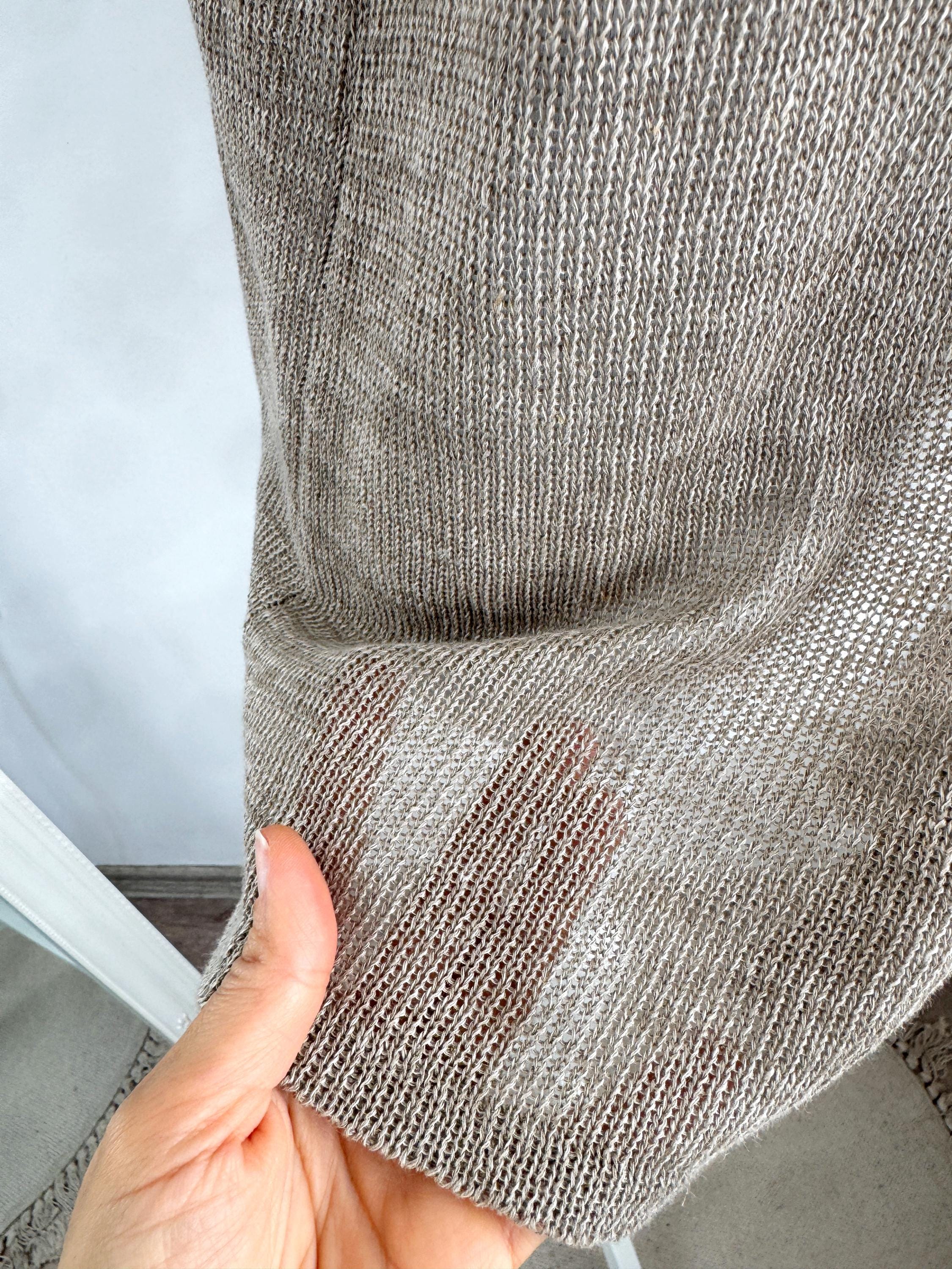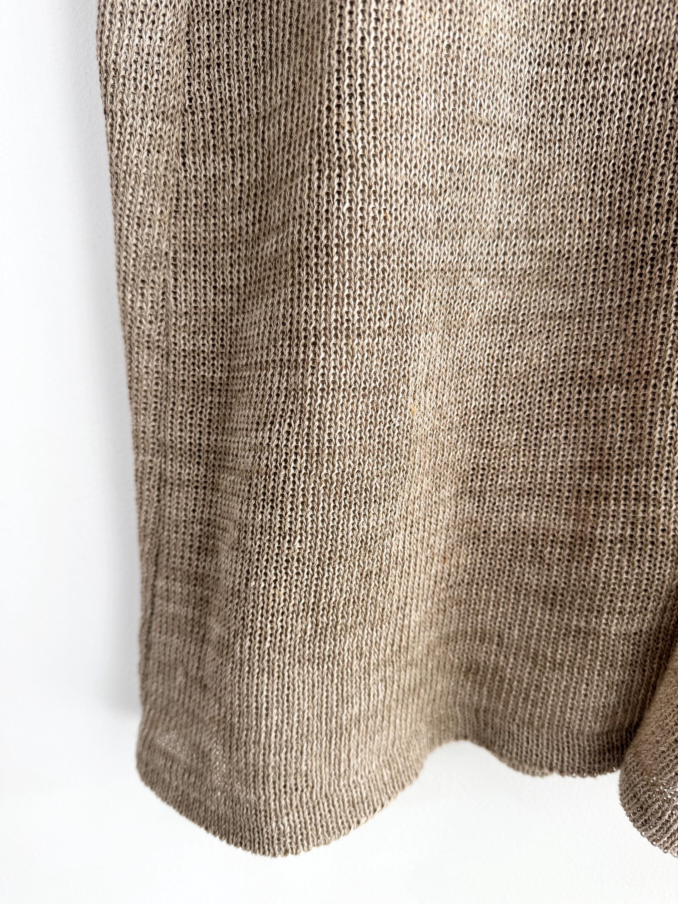 This vintage short-sleeve knit cardigan is the ultimate essential for a sophisticated, minimalist wardrobe. Crafted from a high-quality blend of 70% linen and 30% cotton, this taupe knitted cardigan offers a breathable, lightweight feel that is perfect for layering during the warmer months or transitioning between seasons. The neutral taupe/beige hue and delicate pointelle-style knit texture provide a timeless, earthy aesthetic that pairs effortlessly with linen trousers, denim, or silk skirts.