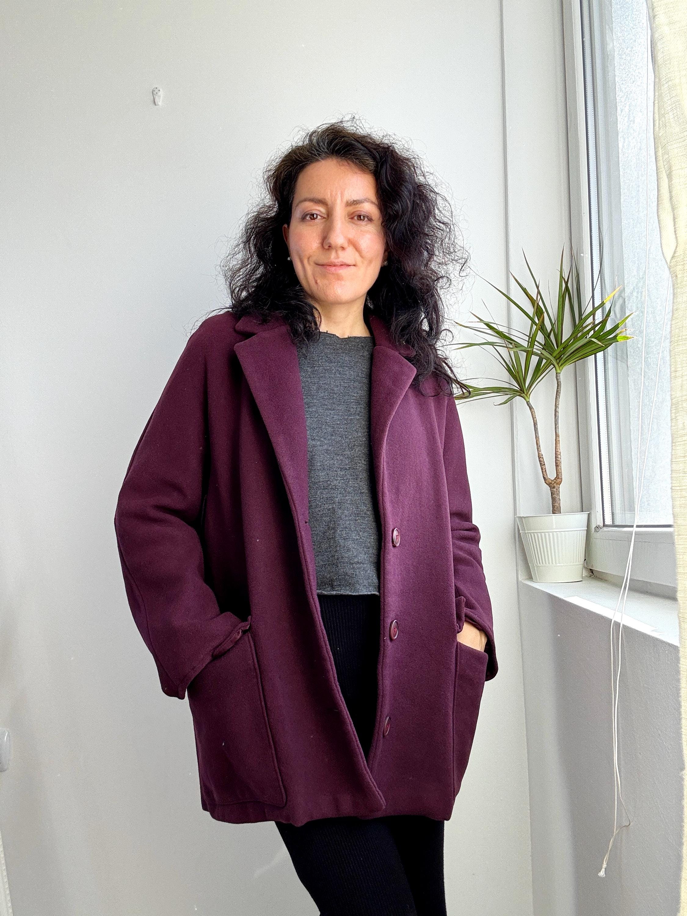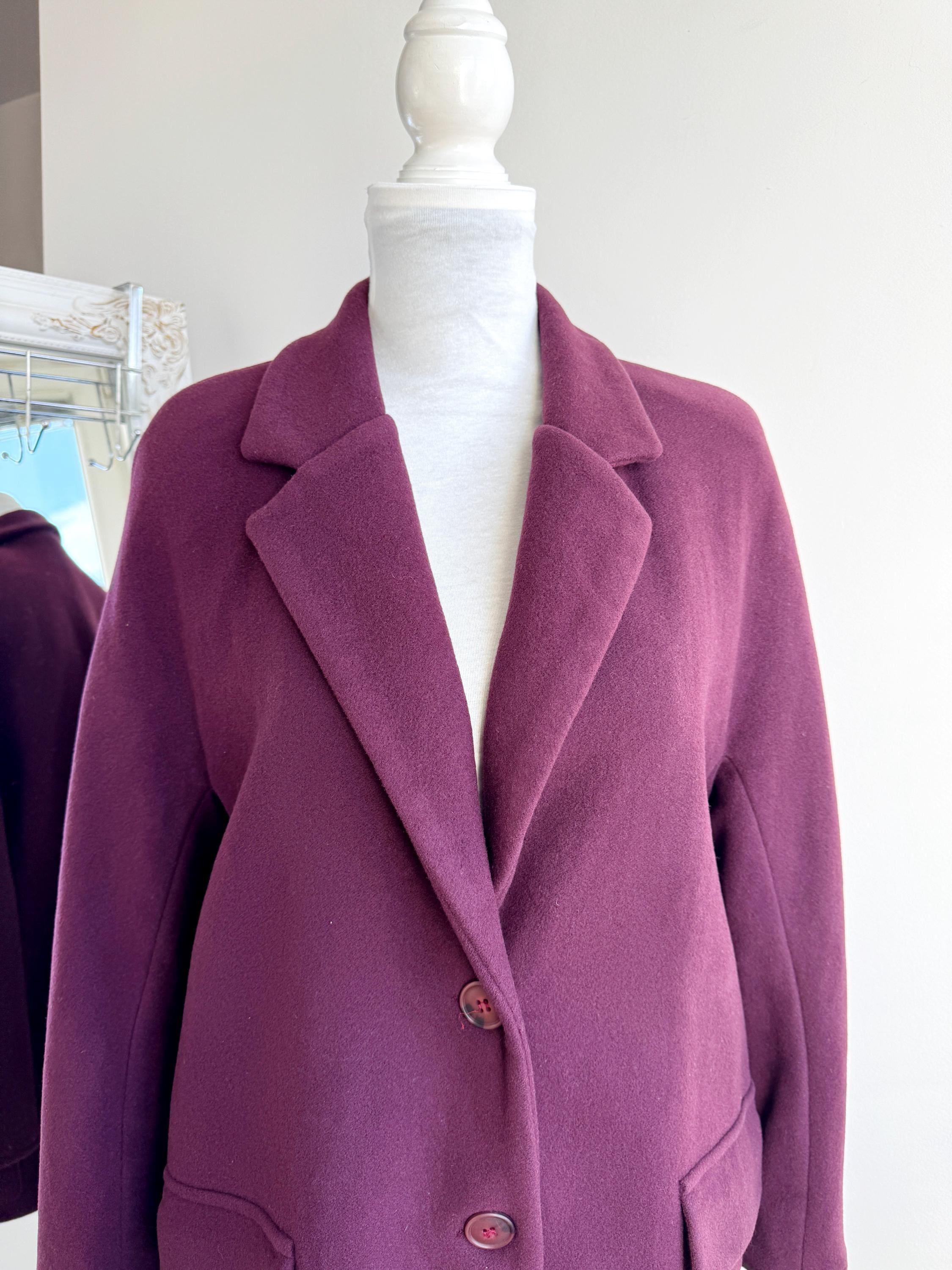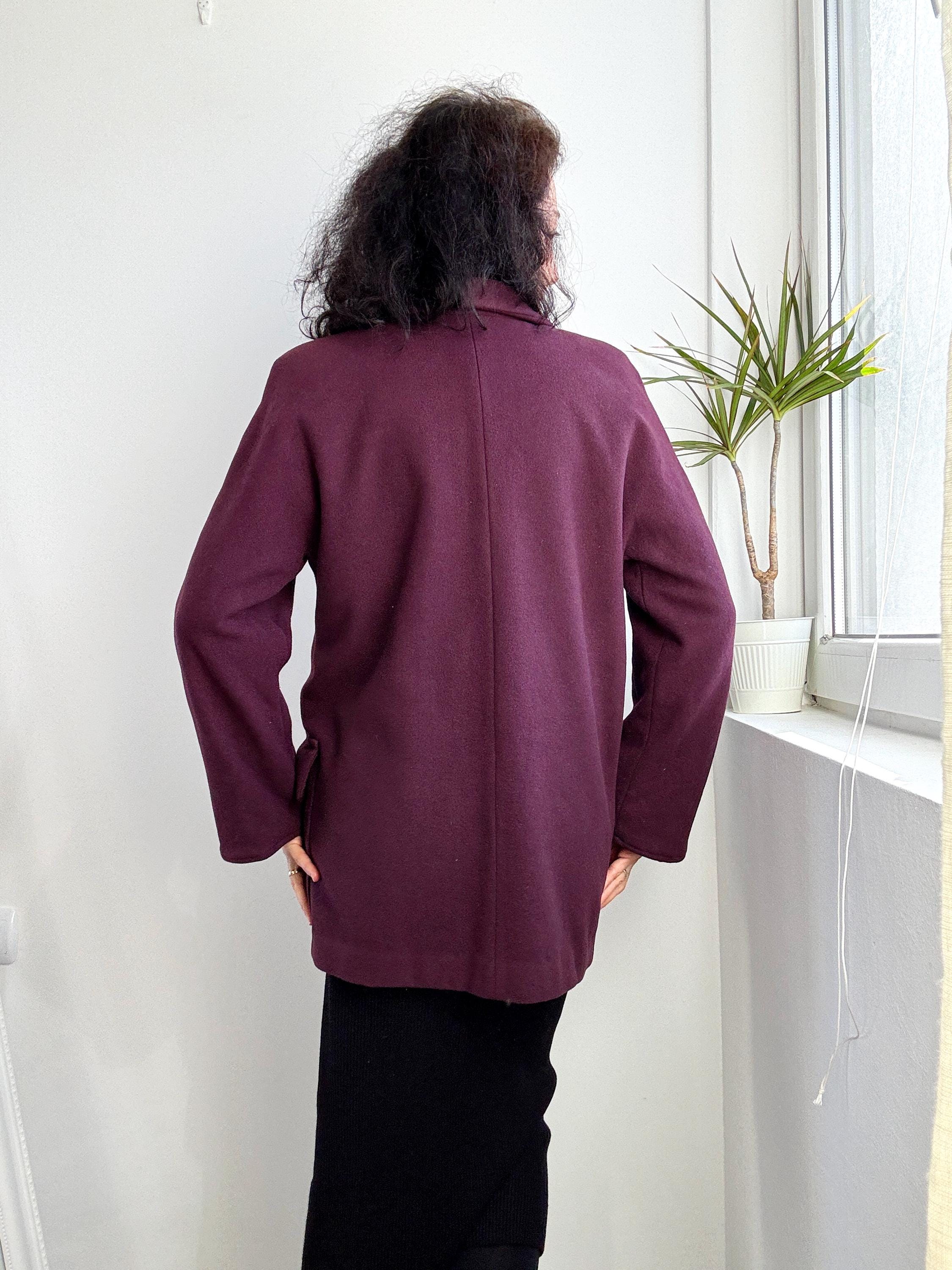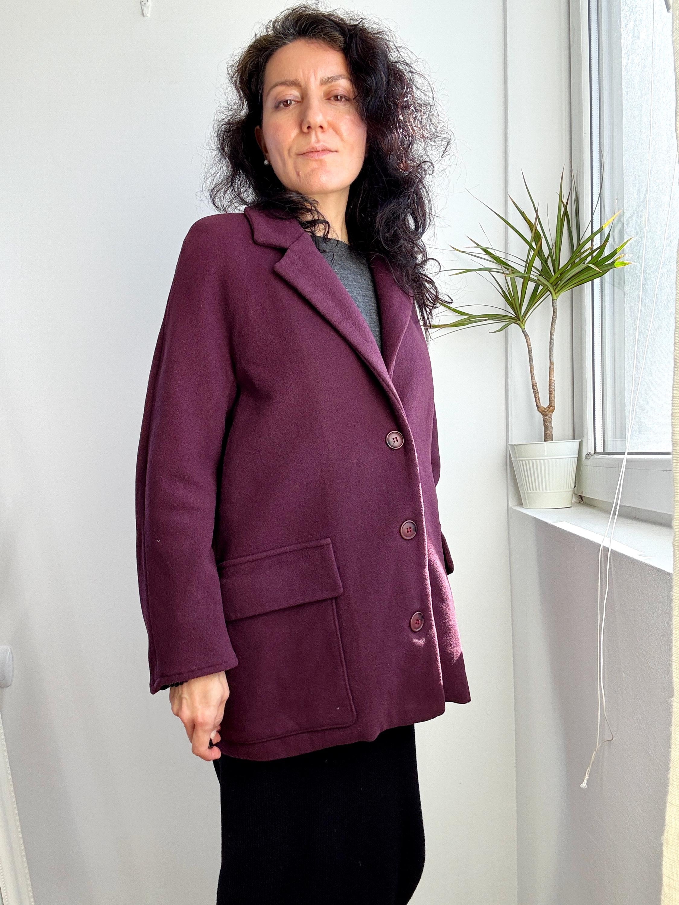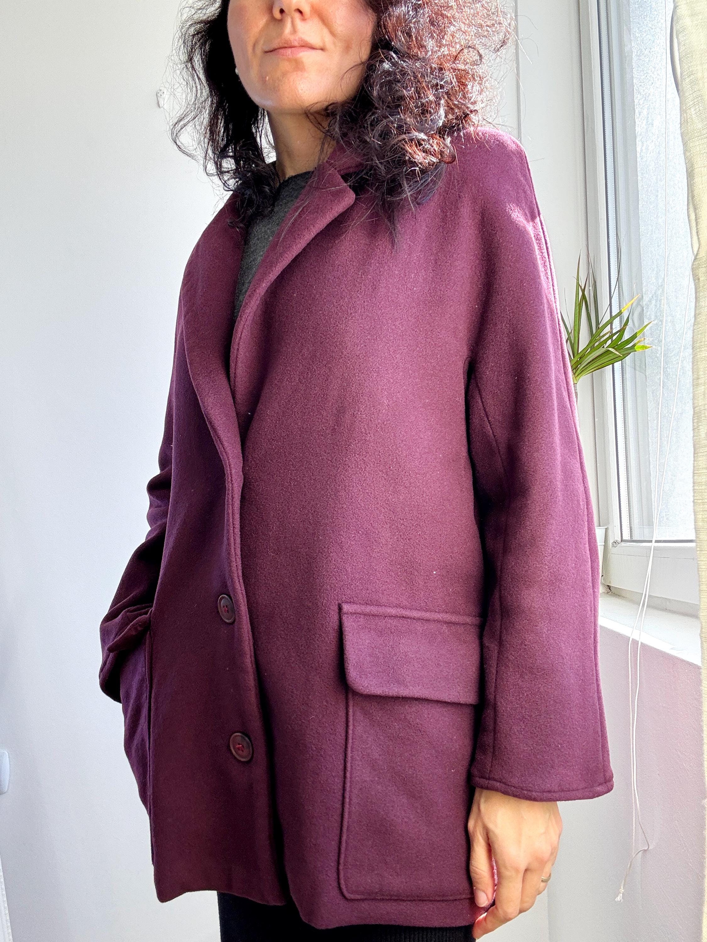 Elevate your winter wardrobe with this stunning 100% wool pea coat, crafted in Italy for timeless style and warmth. This vintage purple wool coat features a rich, deep plum burgundy hue that adds a sophisticated pop of color to any outfit. Designed with a classic notched lapel and an effortless, slightly oversized silhouette, it bridges the gap between a structured blazer and a cozy winter coat.