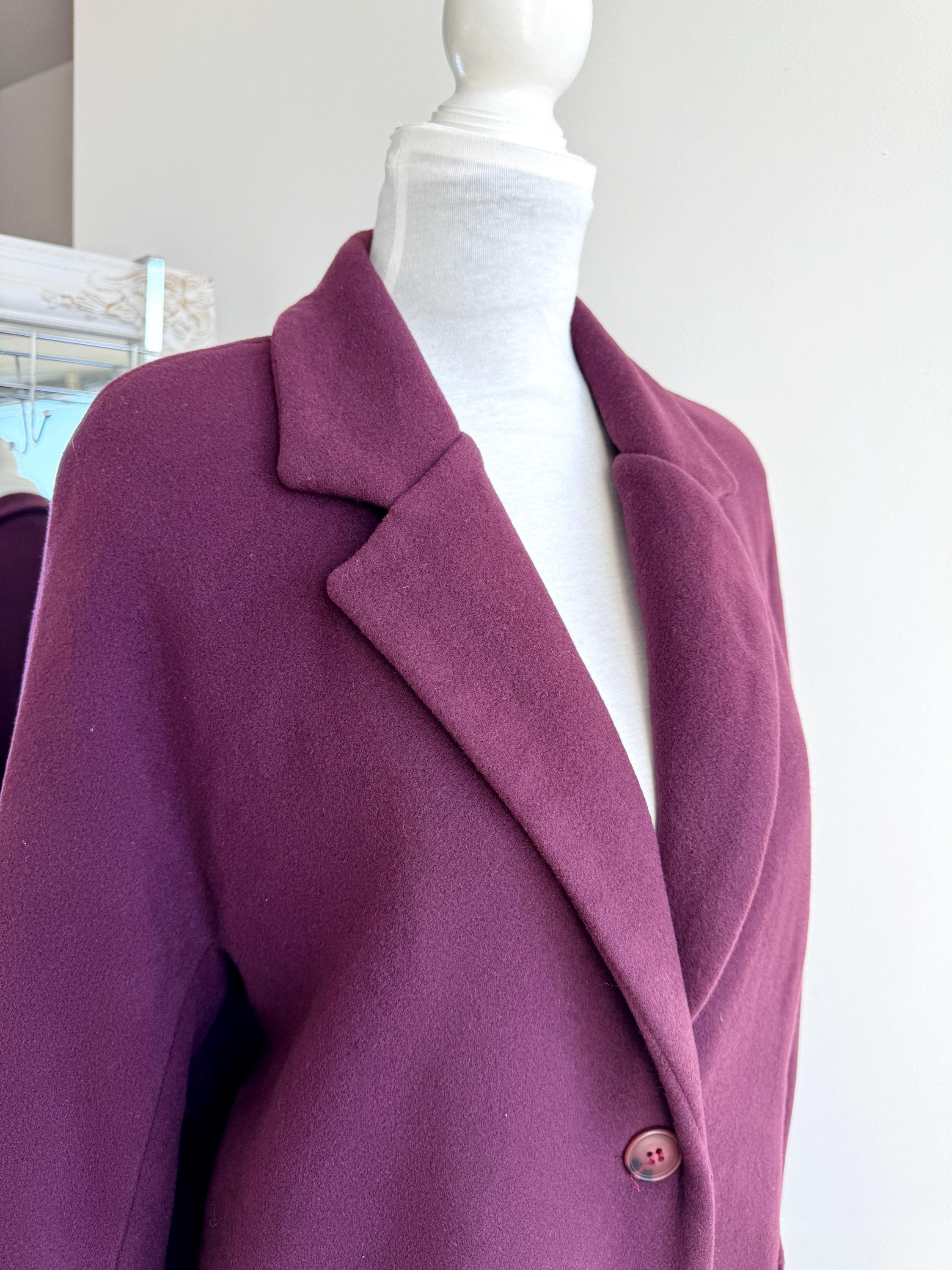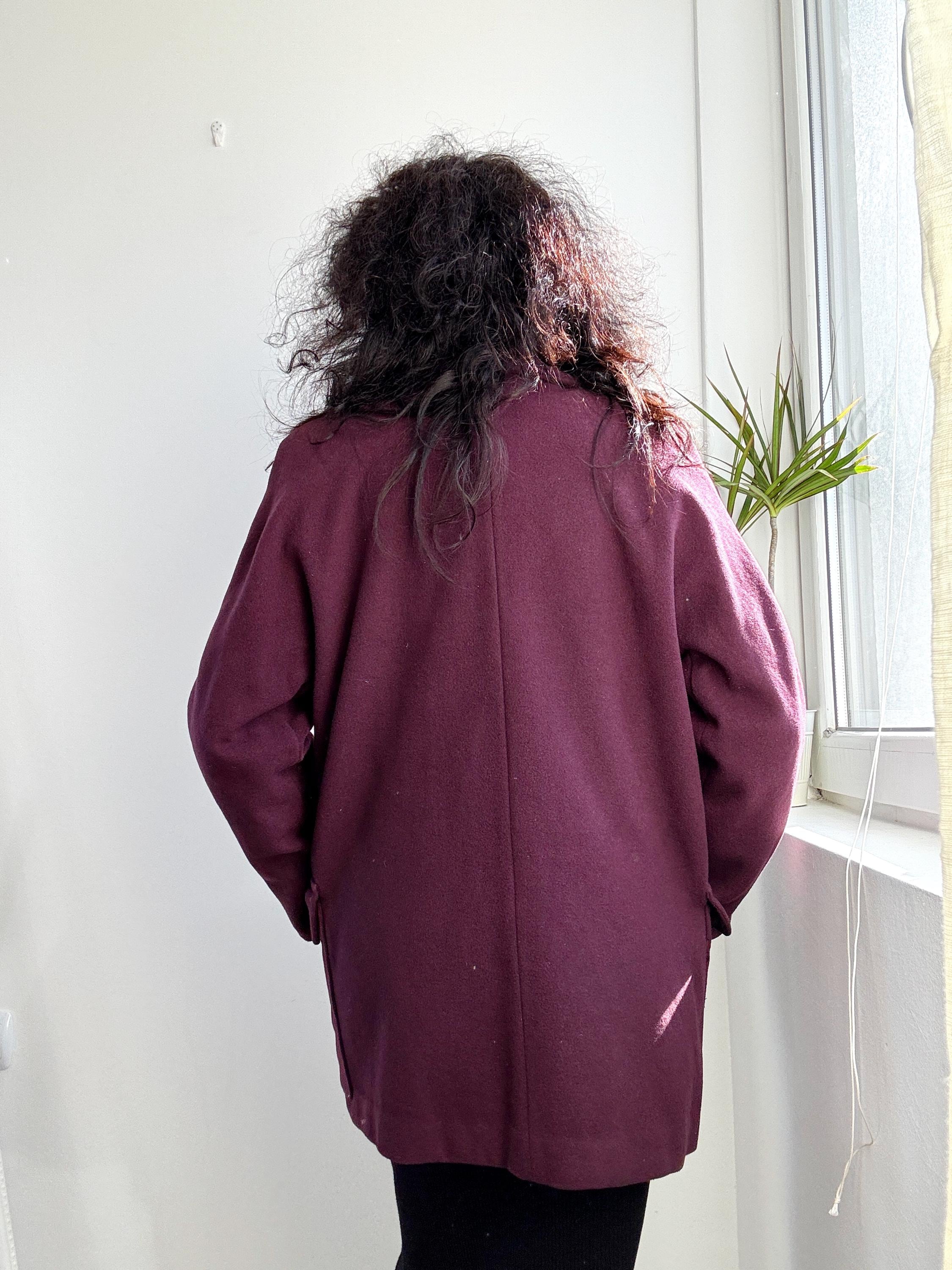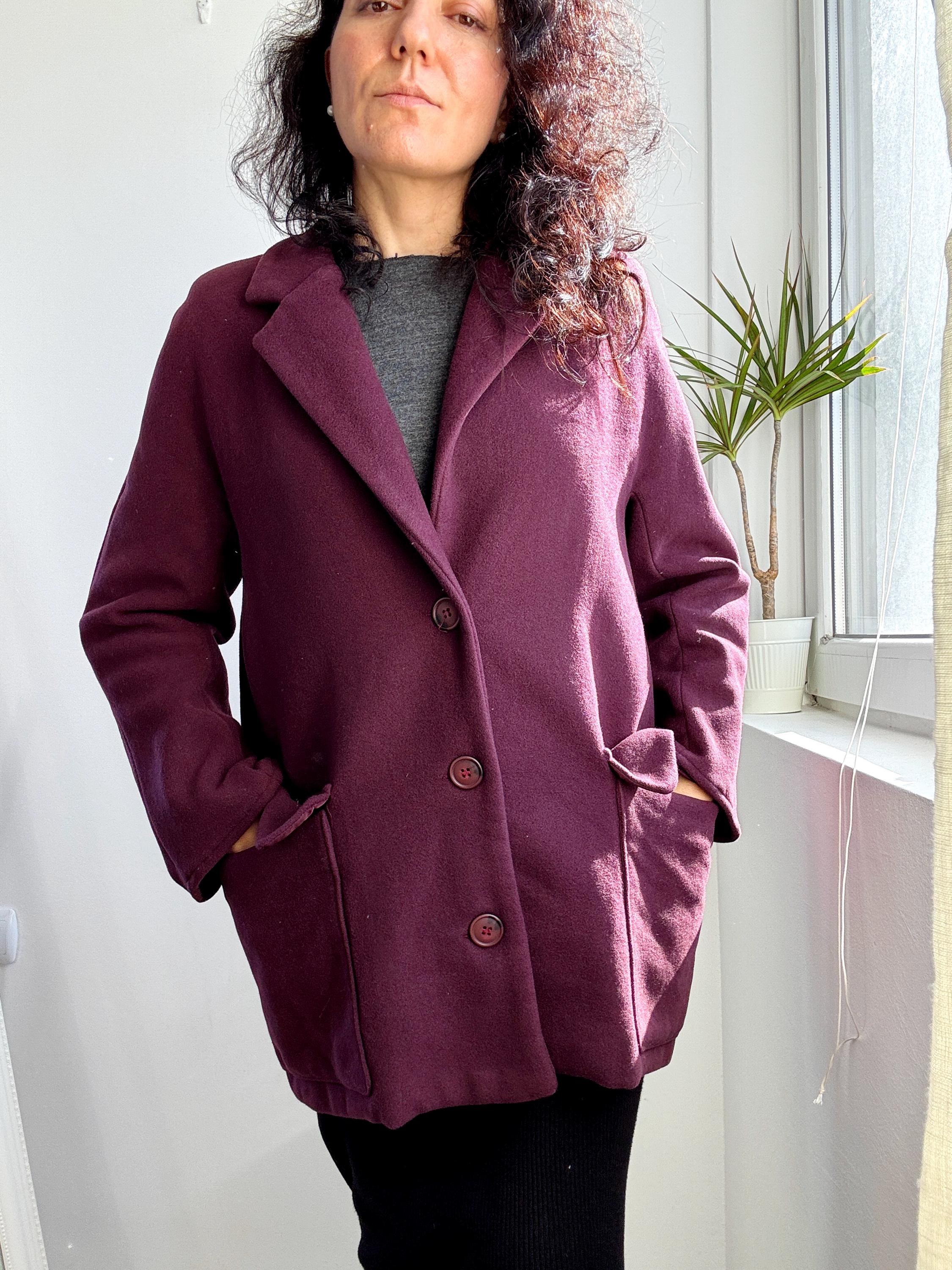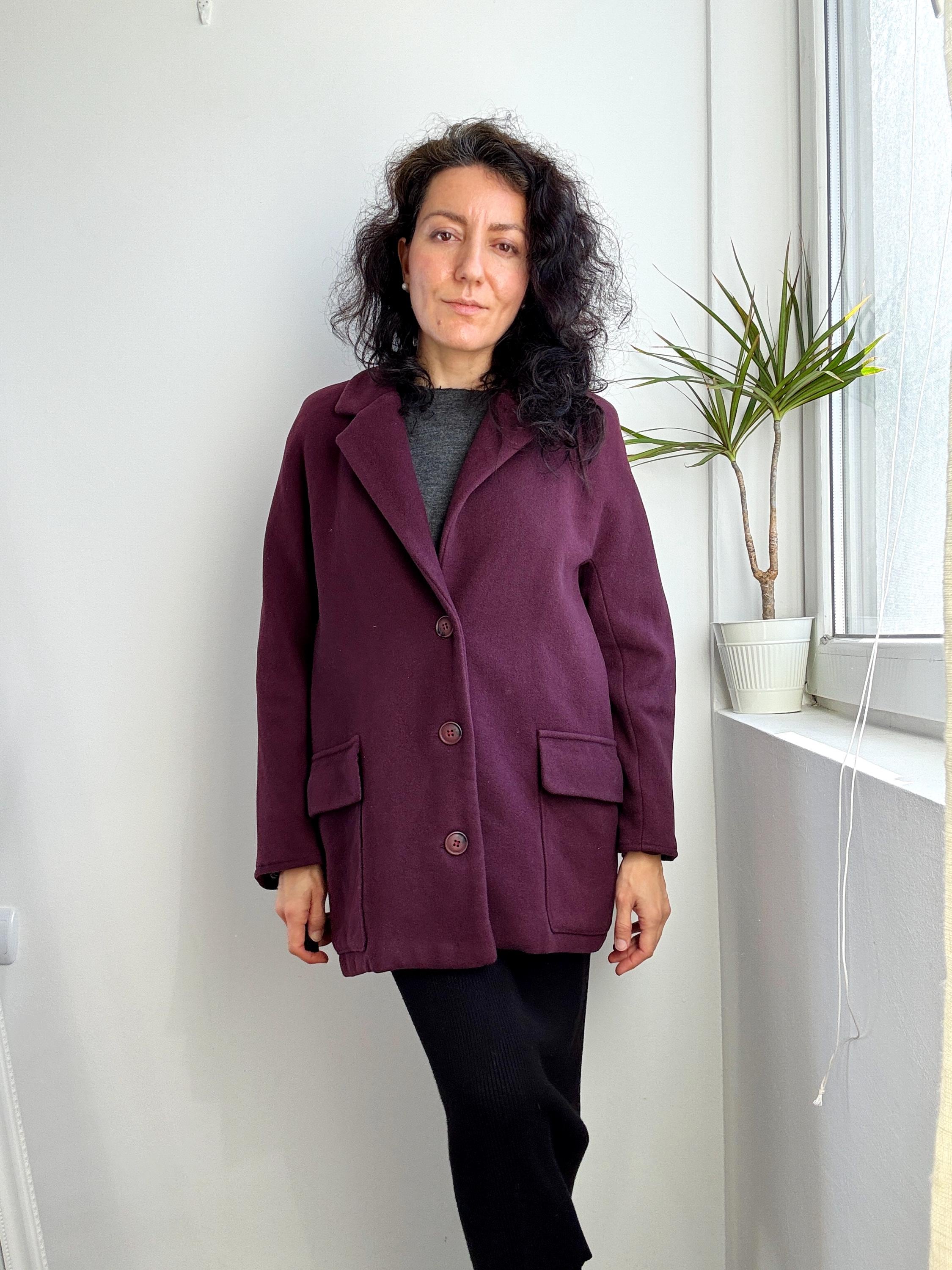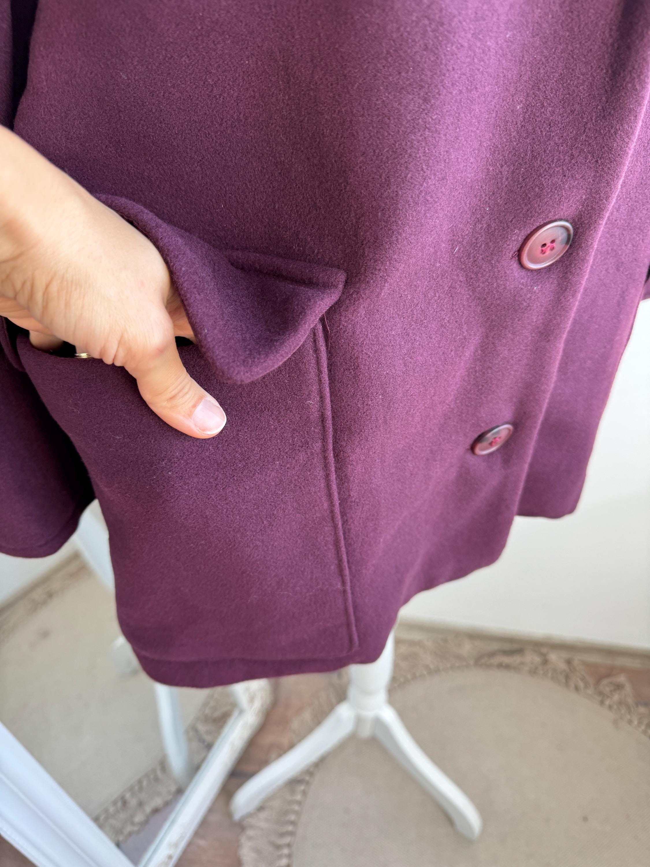 Elevate your winter wardrobe with this stunning 100% wool pea coat, crafted in Italy for timeless style and warmth. This vintage purple wool coat features a rich, deep plum burgundy hue that adds a sophisticated pop of color to any outfit. Designed with a classic notched lapel and an effortless, slightly oversized silhouette, it bridges the gap between a structured blazer and a cozy winter coat.