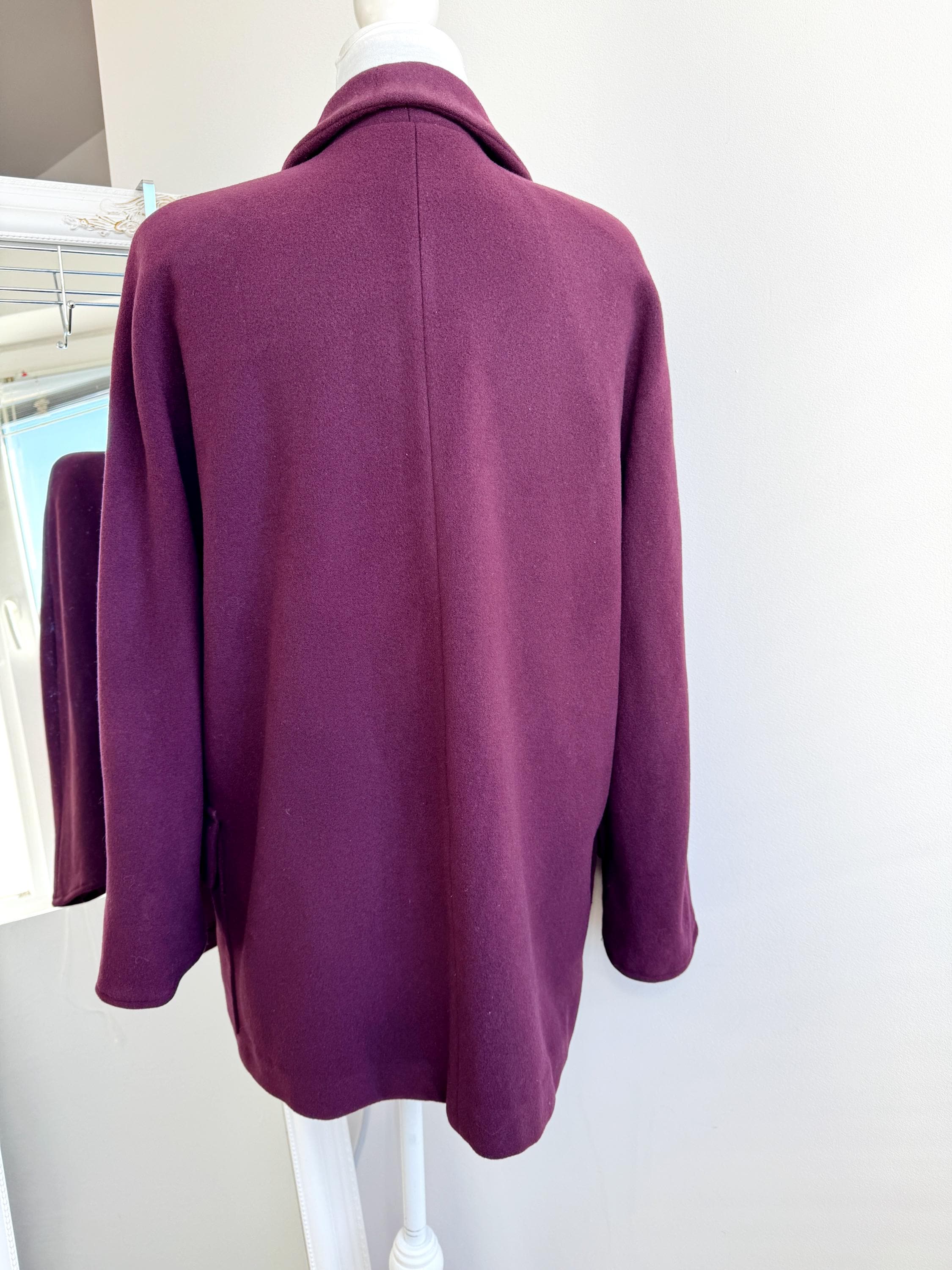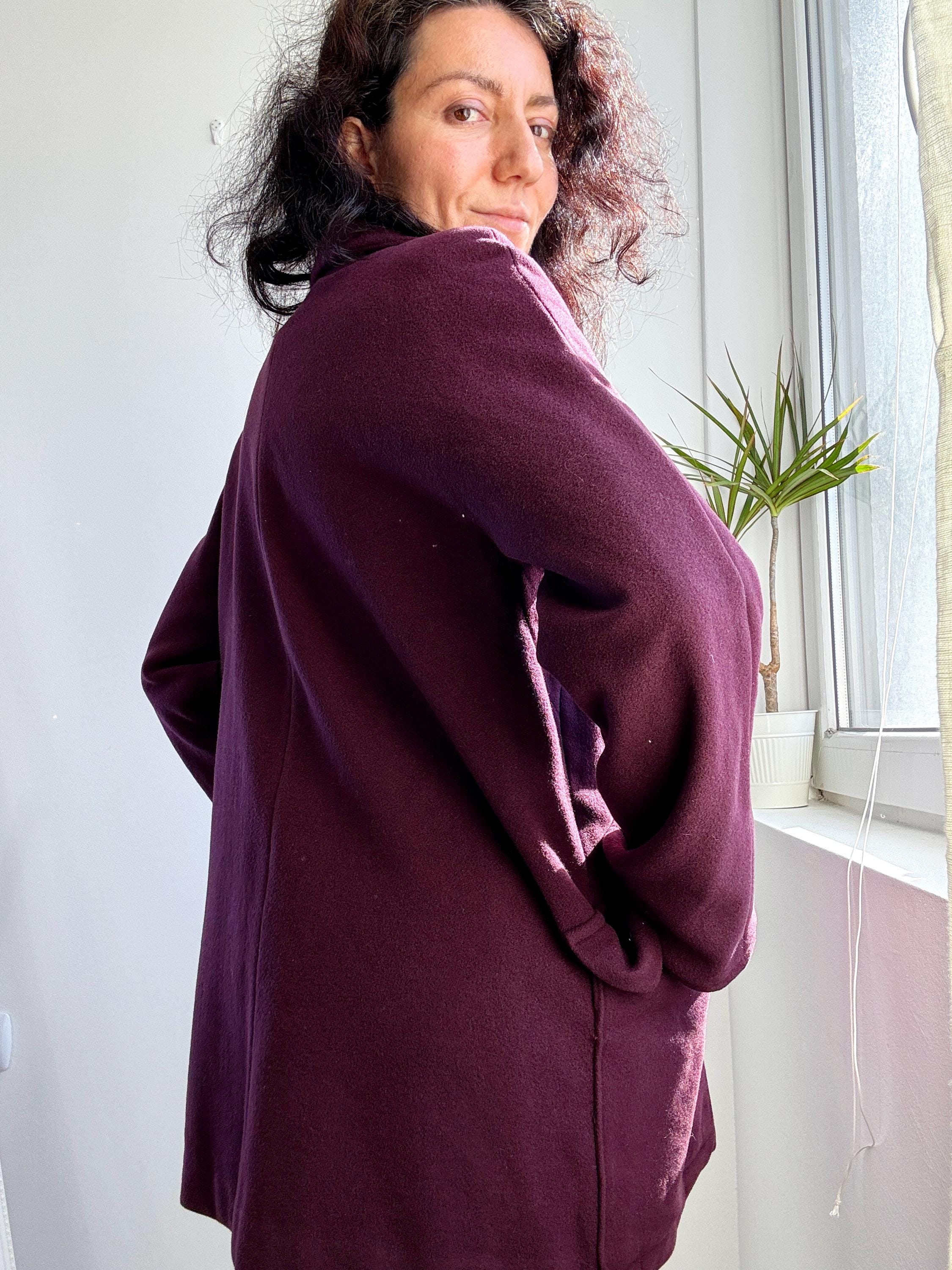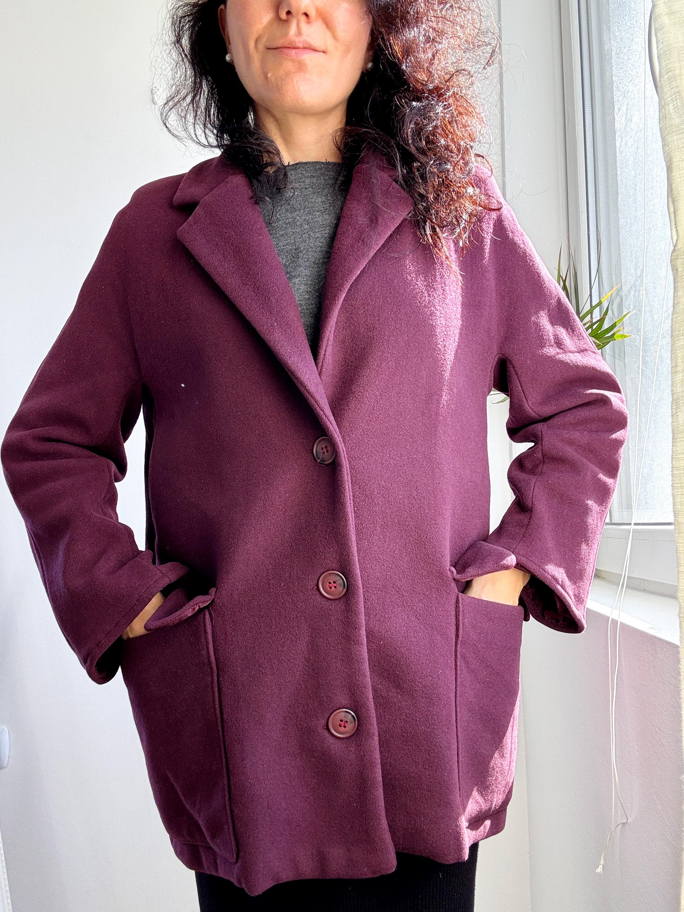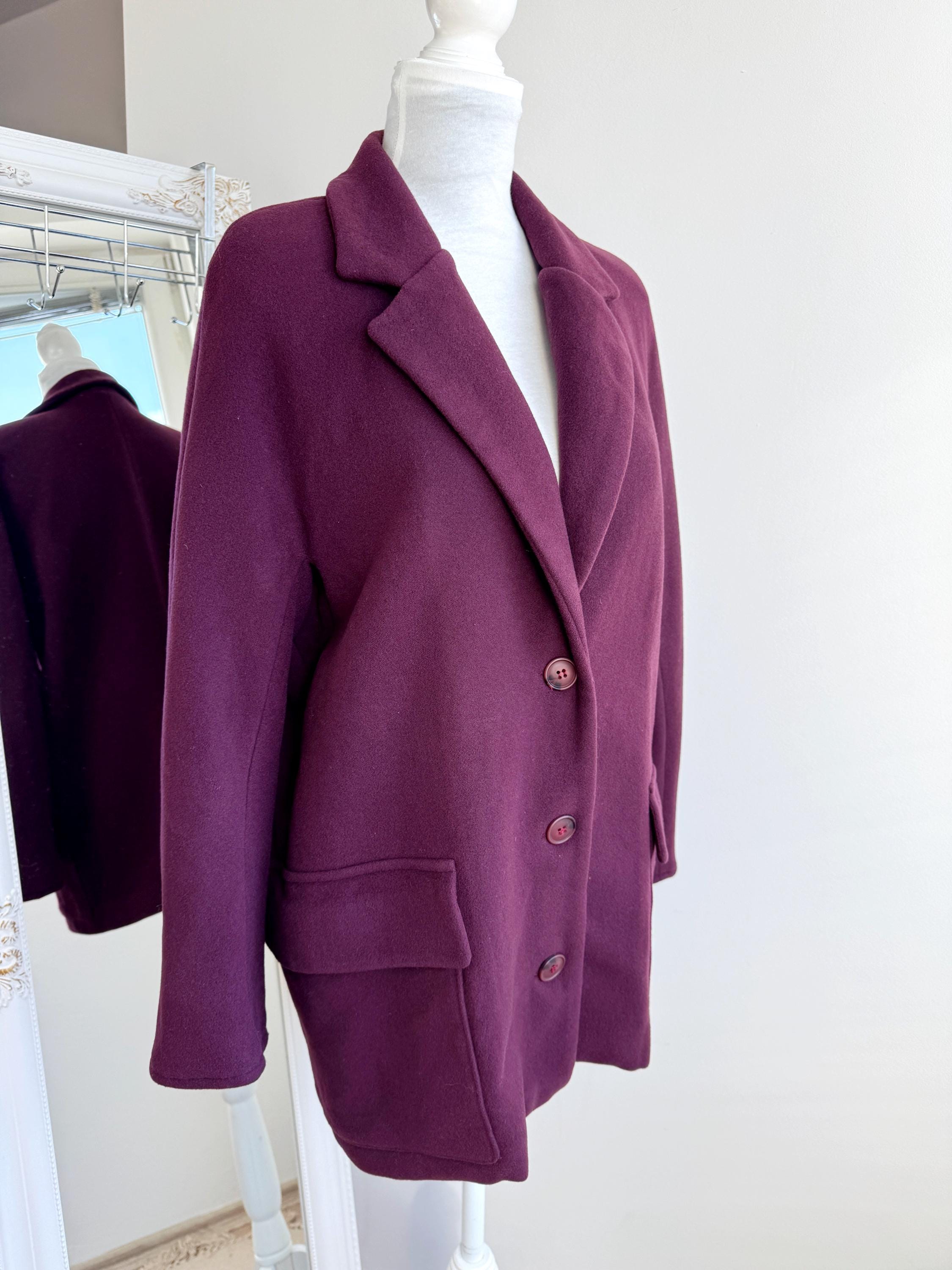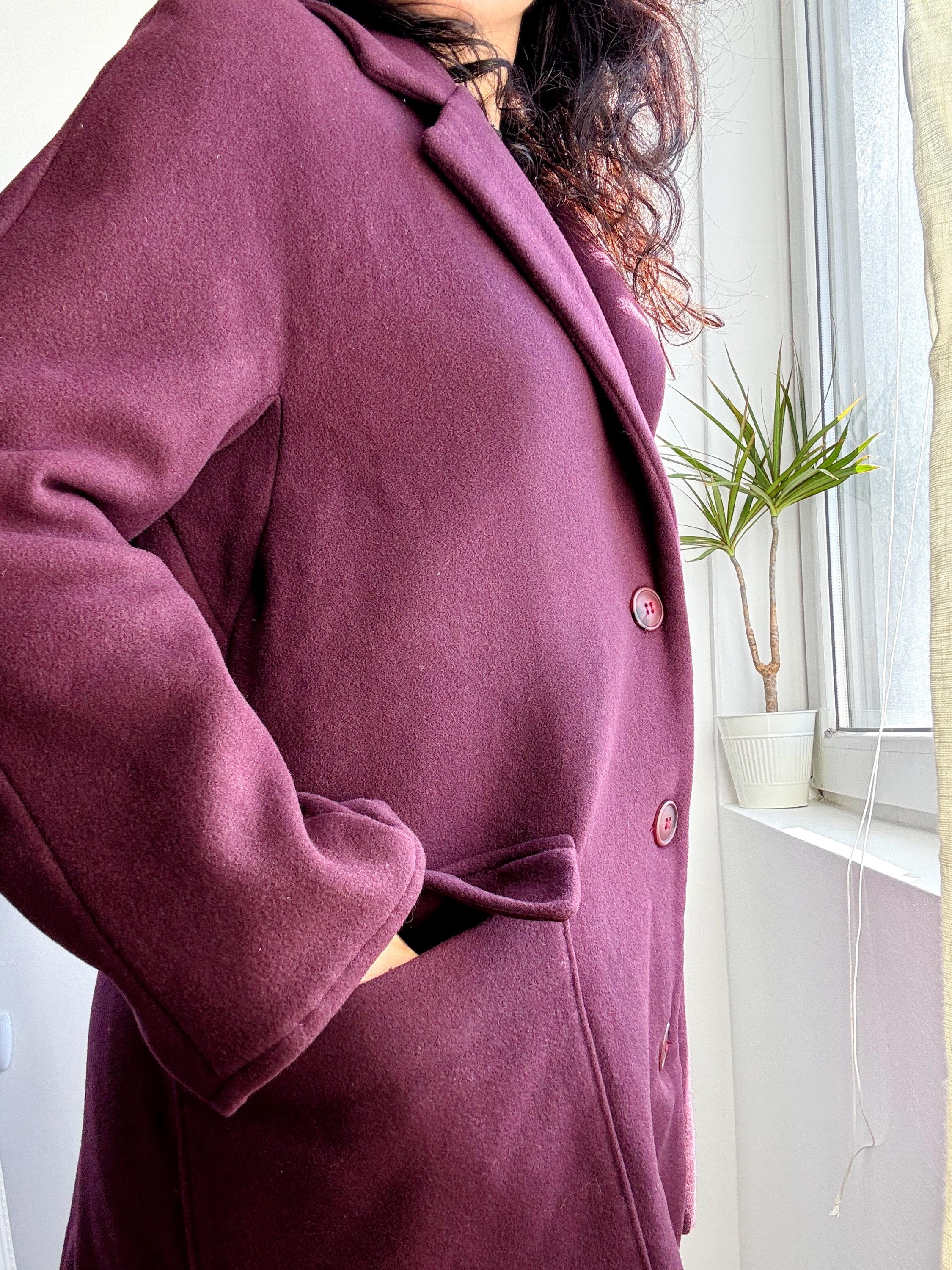 Elevate your winter wardrobe with this stunning 100% wool pea coat, crafted in Italy for timeless style and warmth. This vintage purple wool coat features a rich, deep plum burgundy hue that adds a sophisticated pop of color to any outfit. Designed with a classic notched lapel and an effortless, slightly oversized silhouette, it bridges the gap between a structured blazer and a cozy winter coat.