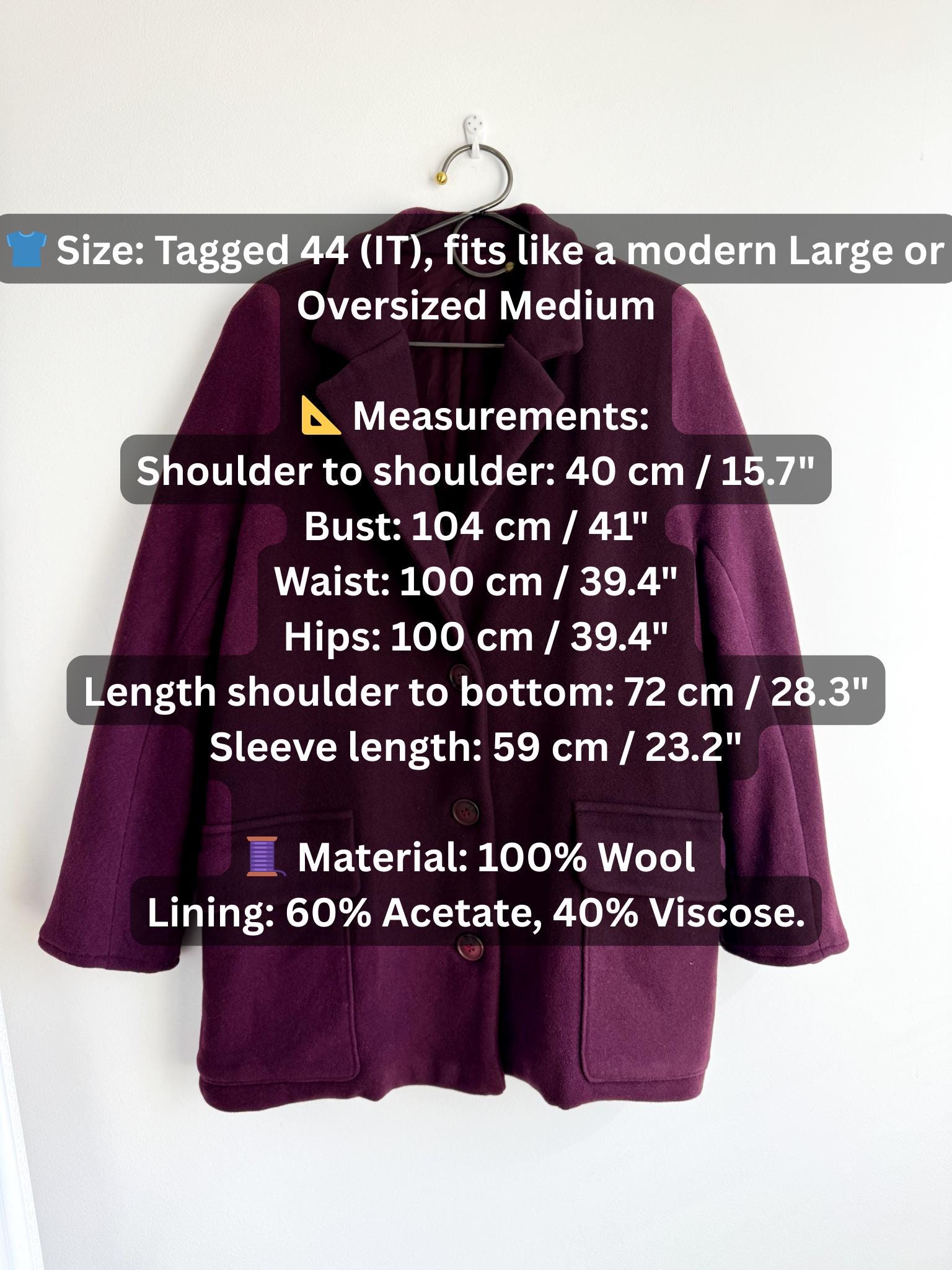 🧵 Material: 100% Wool. Lining: 60% Acetate, 40% Viscose.