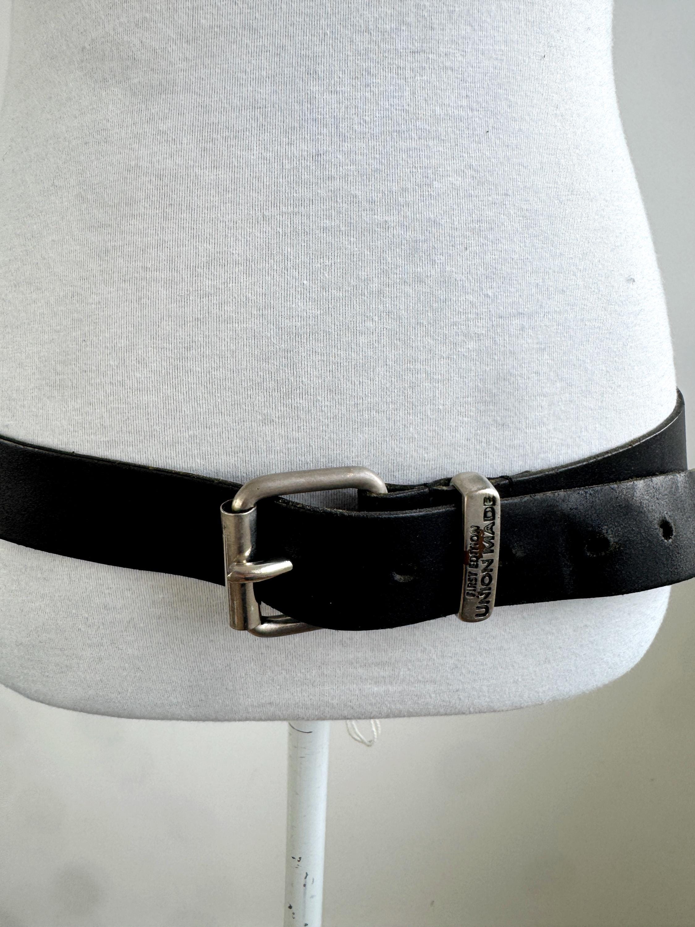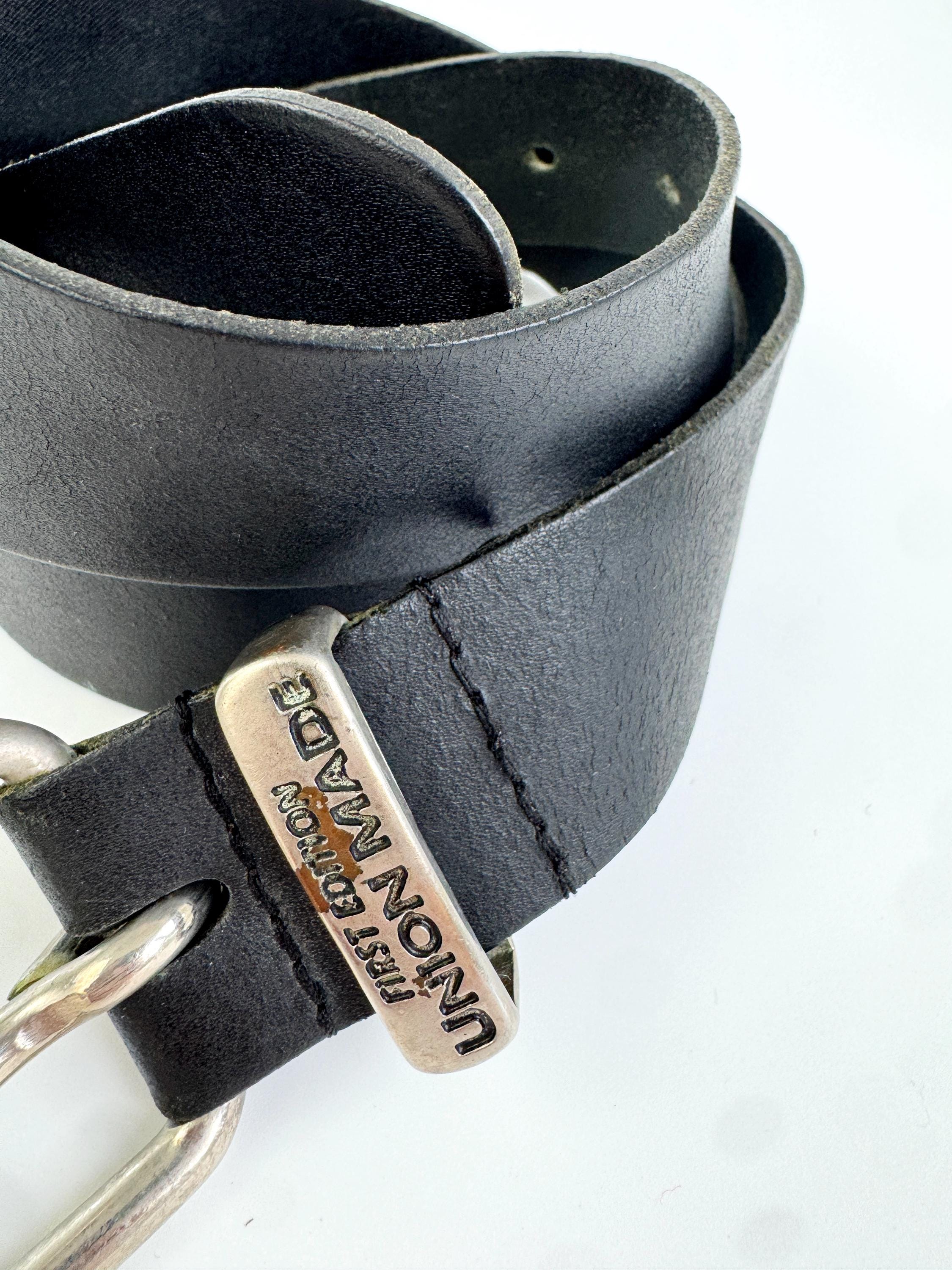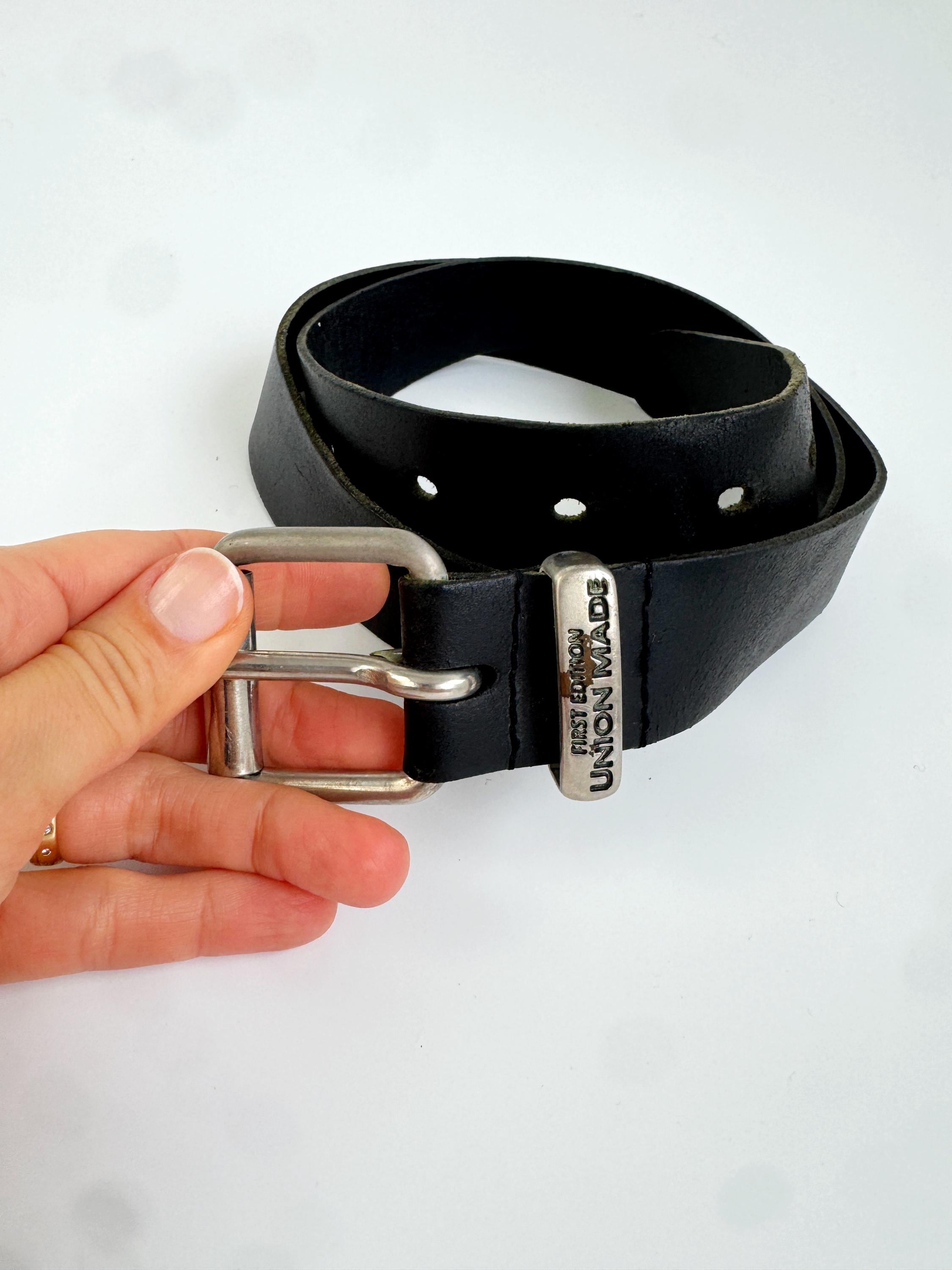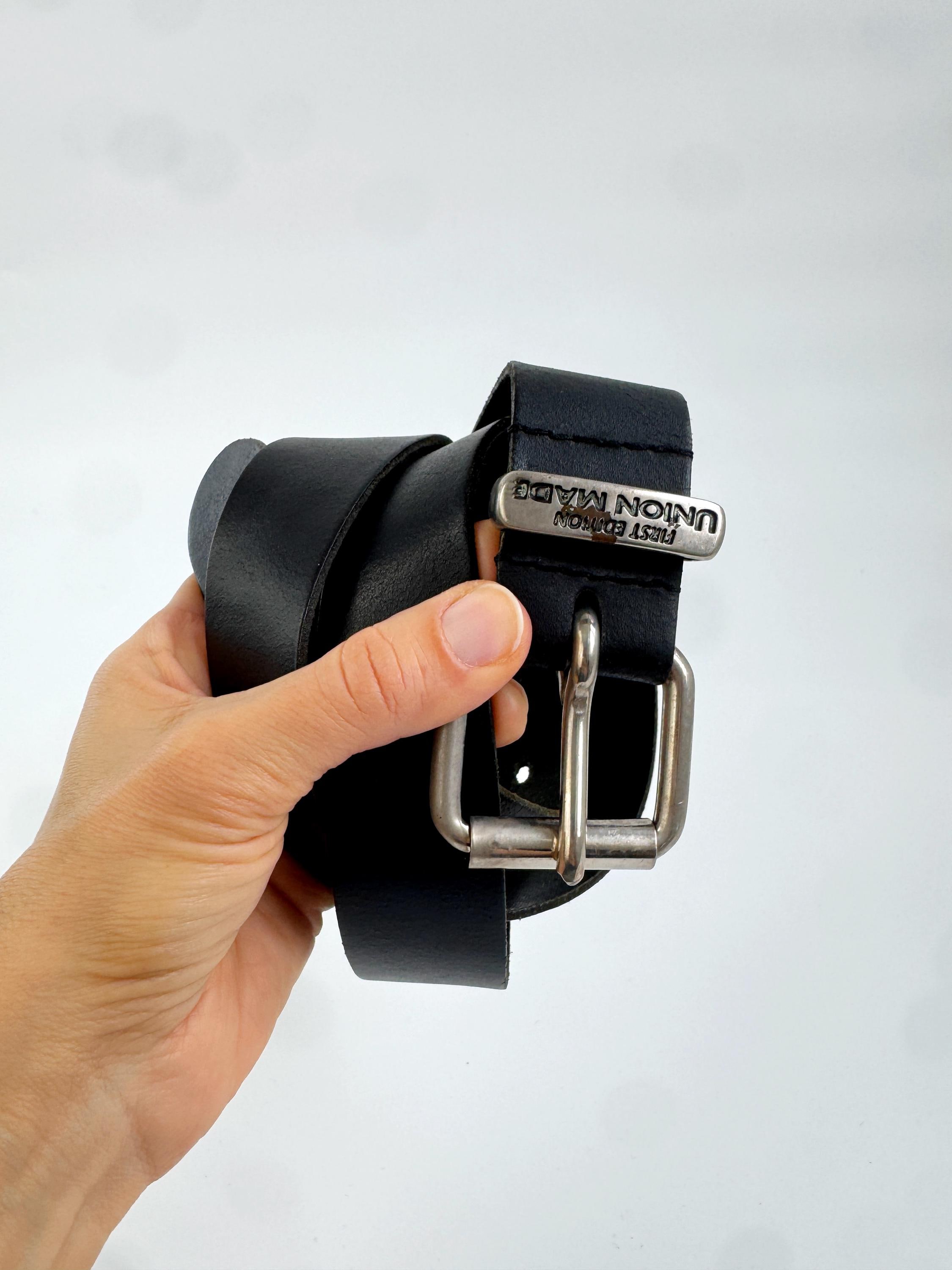This vintage 90s black leather belt is a quintessential wardrobe staple that balances rugged durability with a timeless, minimalist aesthetic. Crafted from thick, high-quality real leather, this black waist belt features a heavy-duty silver-tone buckle and a distinctive "First Edition Union Made" metal buckle. Whether you’re cinching a pair of classic denim jeans or layering it over a flowy boho dress, this real leather belt offers that coveted "lived-in" vintage character.