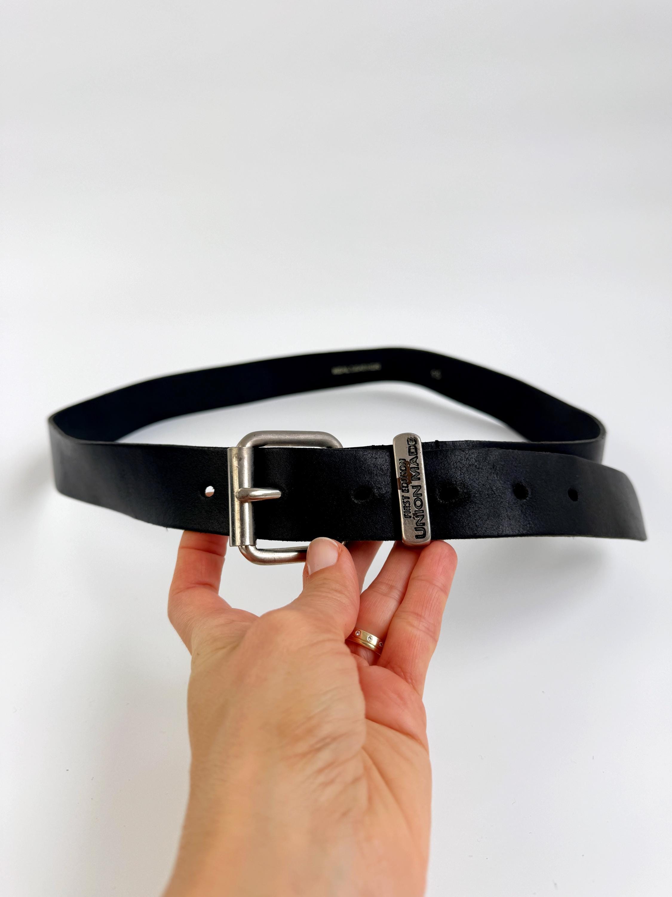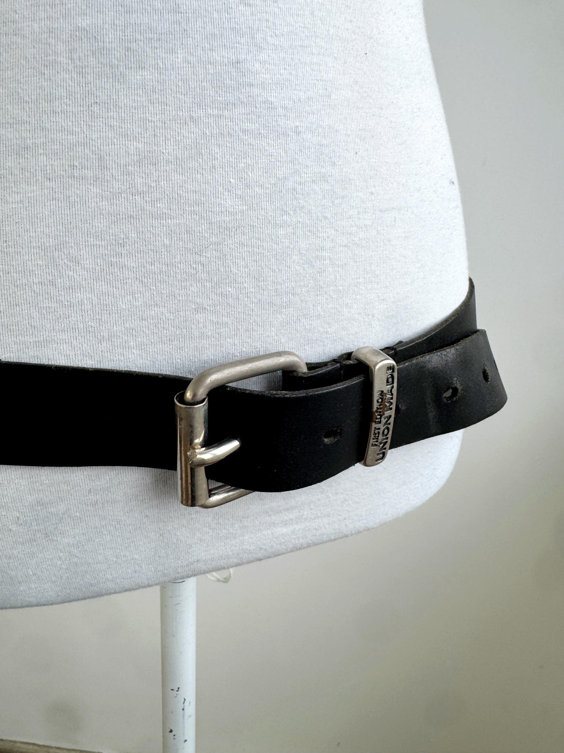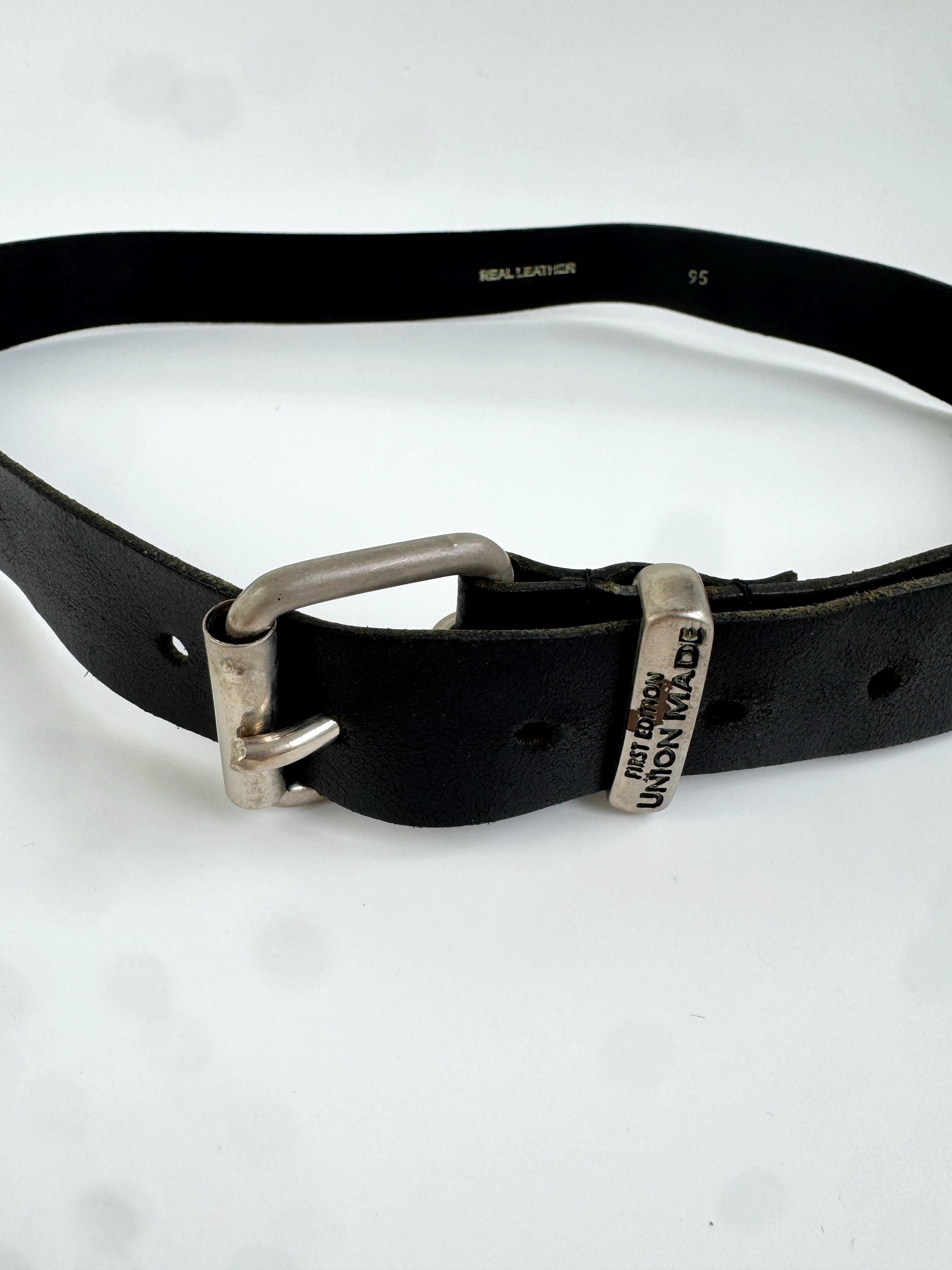 This vintage 90s black leather belt is a quintessential wardrobe staple that balances rugged durability with a timeless, minimalist aesthetic. Crafted from thick, high-quality real leather, this black waist belt features a heavy-duty silver-tone buckle and a distinctive "First Edition Union Made" metal buckle. Whether you’re cinching a pair of classic denim jeans or layering it over a flowy boho dress, this real leather belt offers that coveted "lived-in" vintage character.