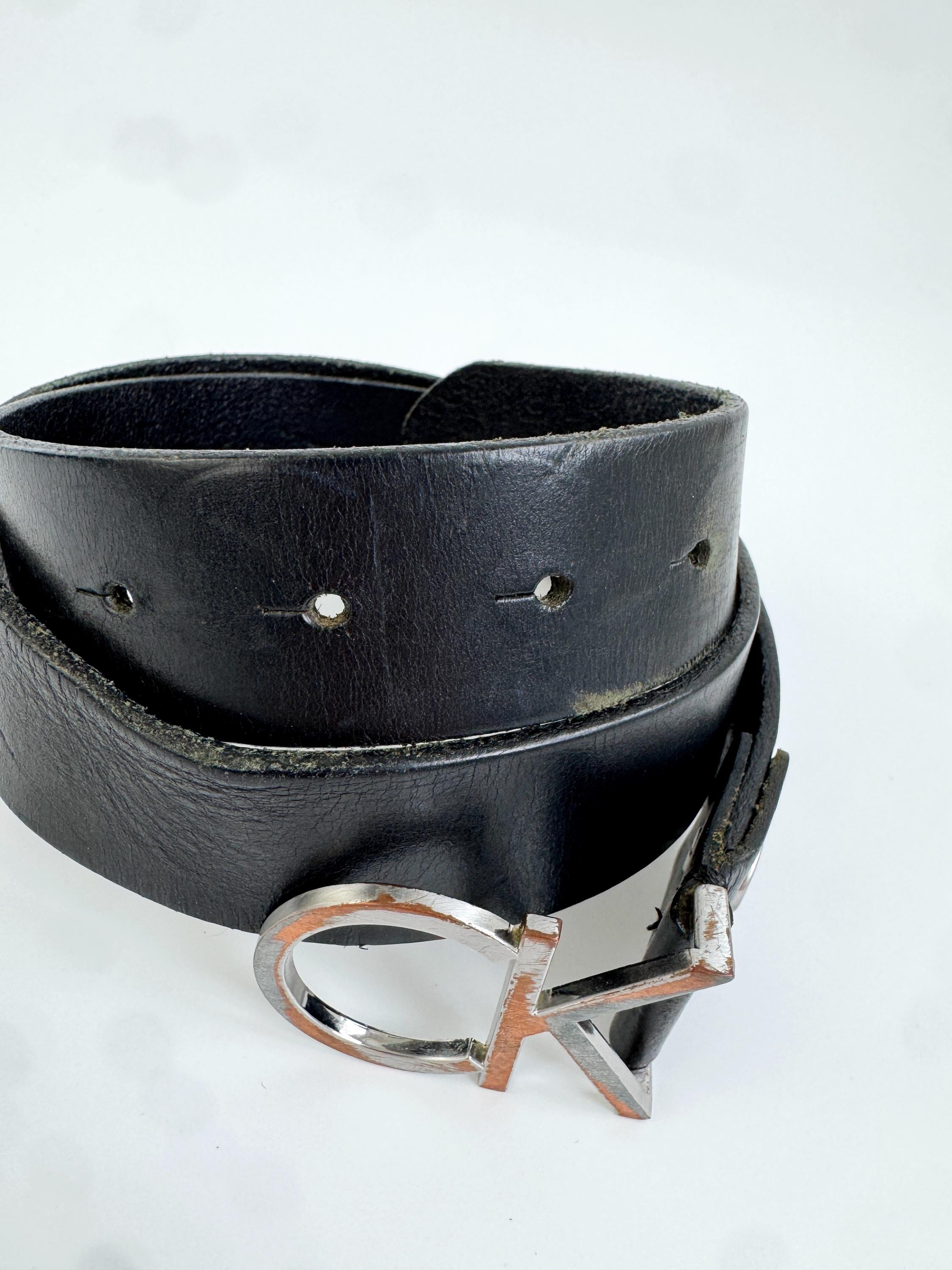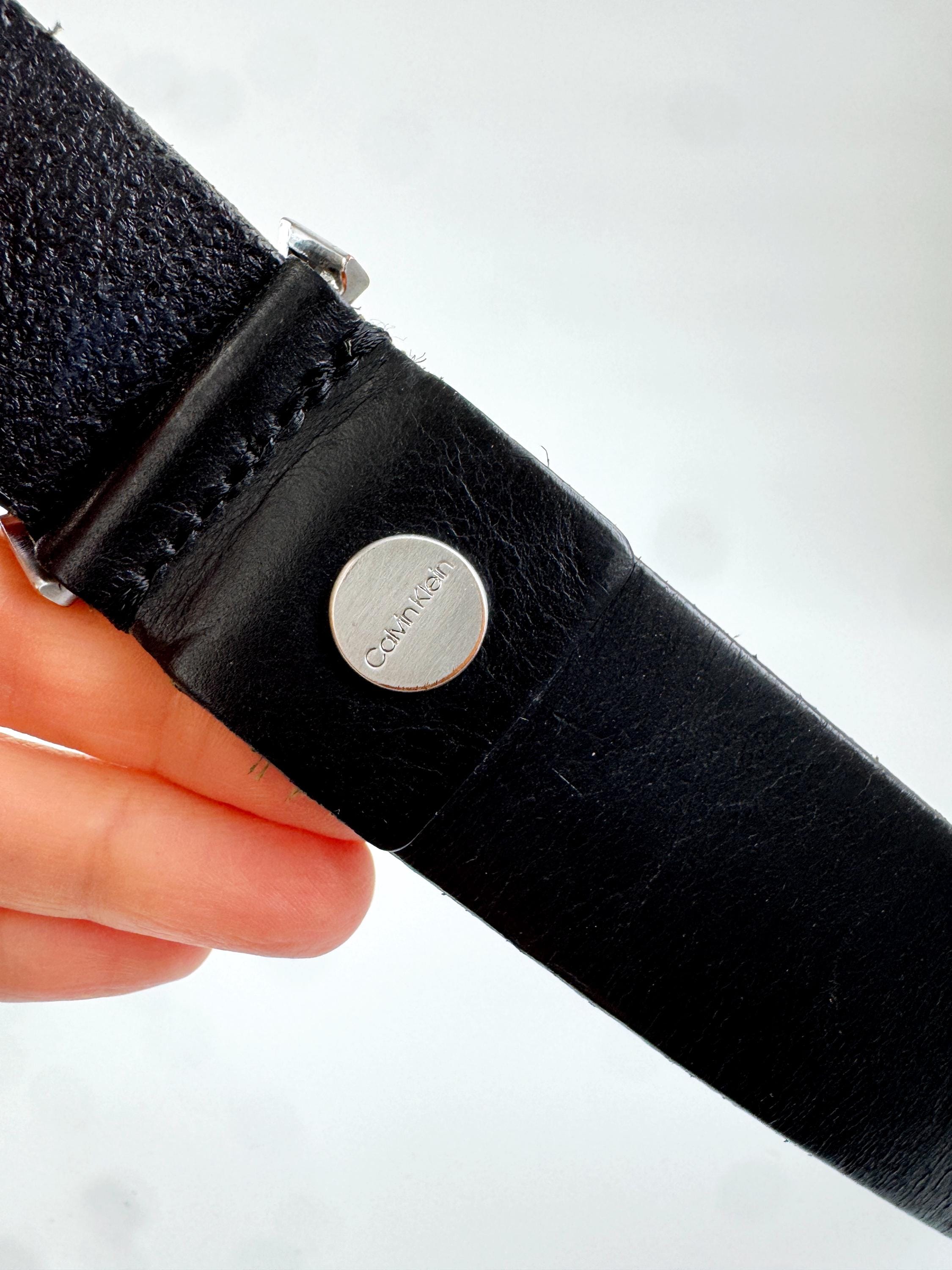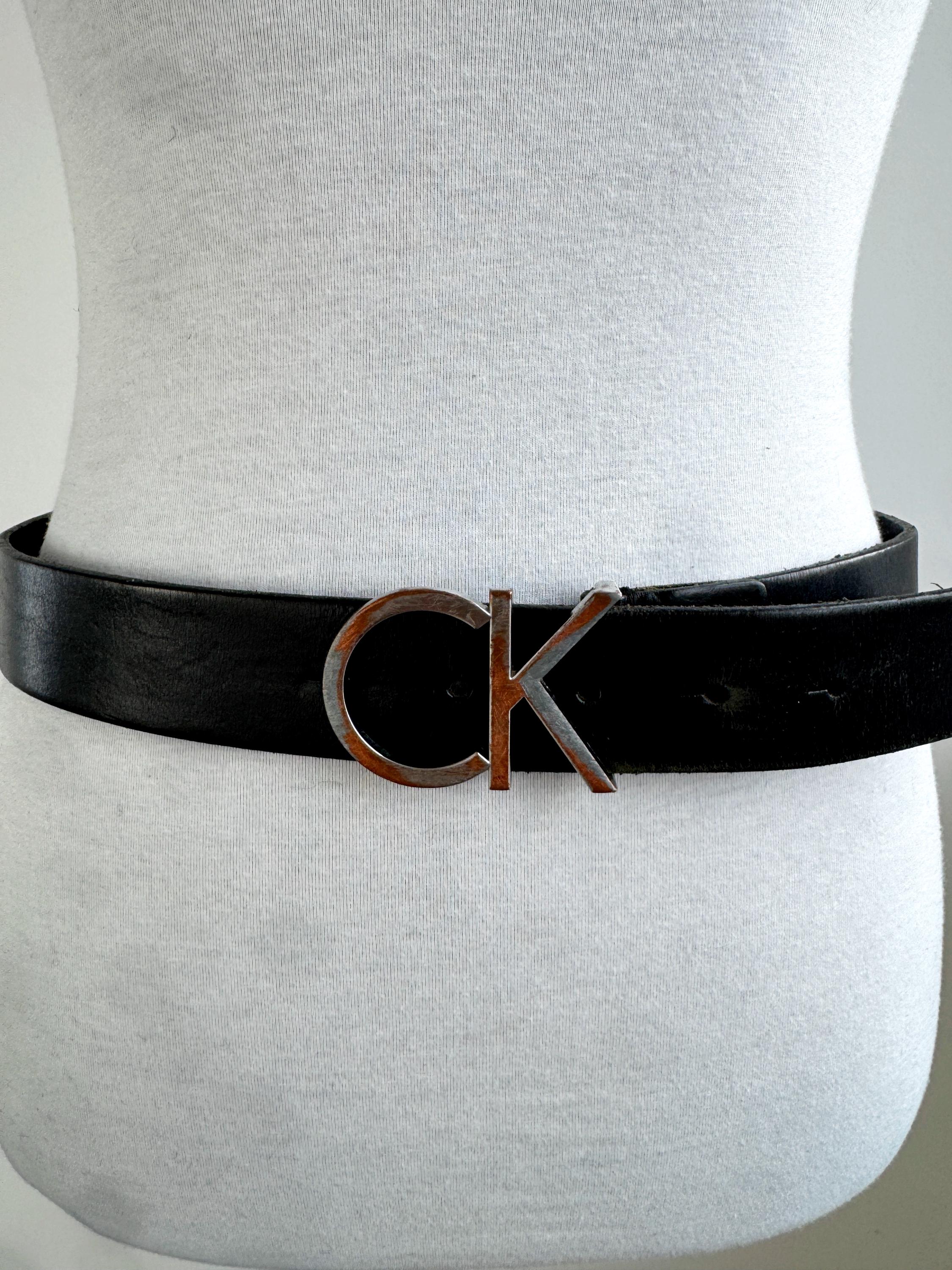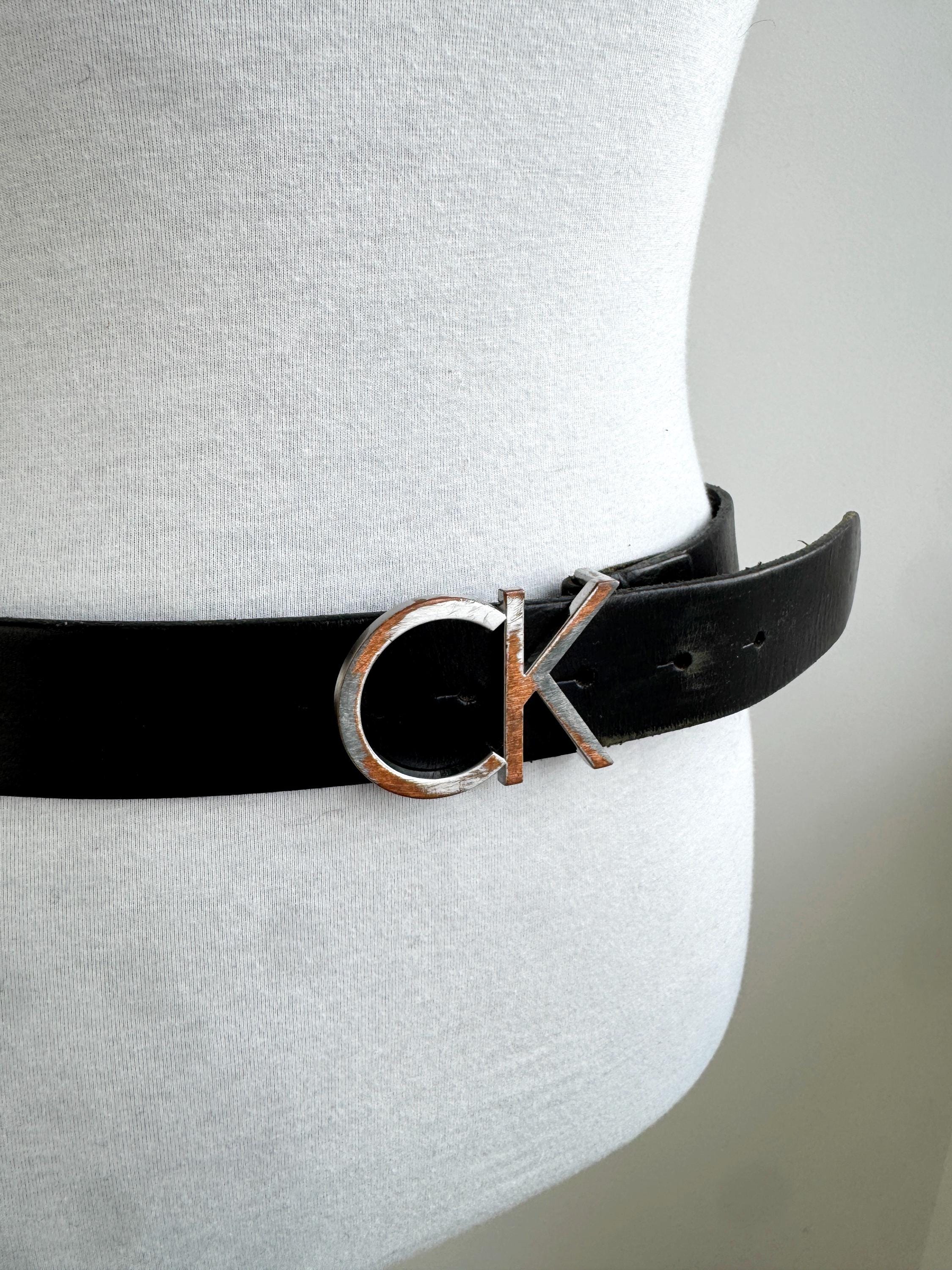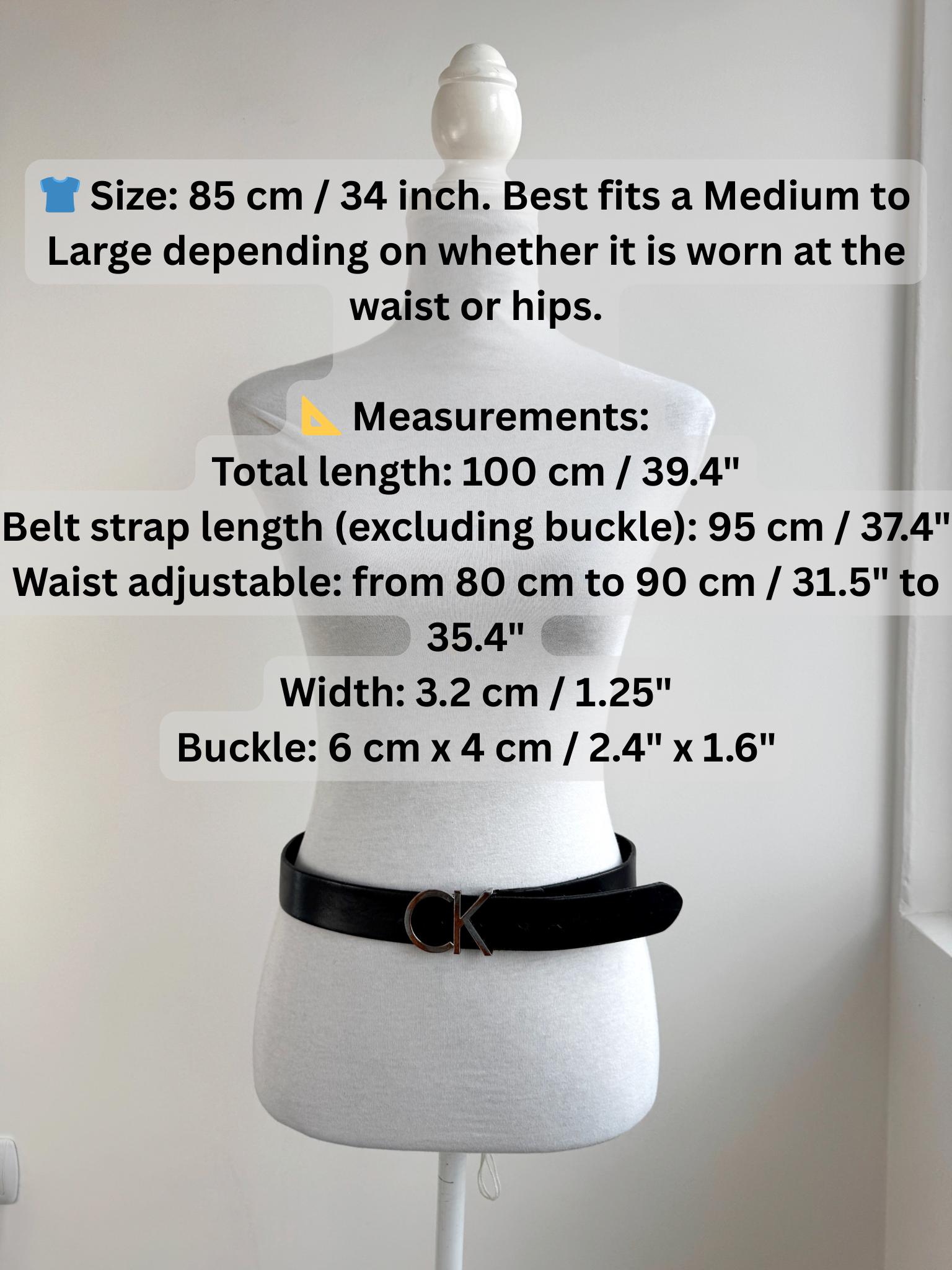 This is a vintage Calvin Klein black leather belt in size 85 cm / 34" - a quintessential 90s statement piece that effortlessly blends minimalism with bold branding. Crafted from high-quality genuine leather in Romania, this black waist belt features the iconic oversized "CK" monogram buckle. The metal hardware has developed a unique, distressed patina over time, giving it a rugged, industrial edge that perfectly complements the sleek black leather strap. Whether you’re cinching a pair of high-waisted vintage denim or adding a designer touch to a modern oversized blazer, this real leather belt will be the perfect choise.