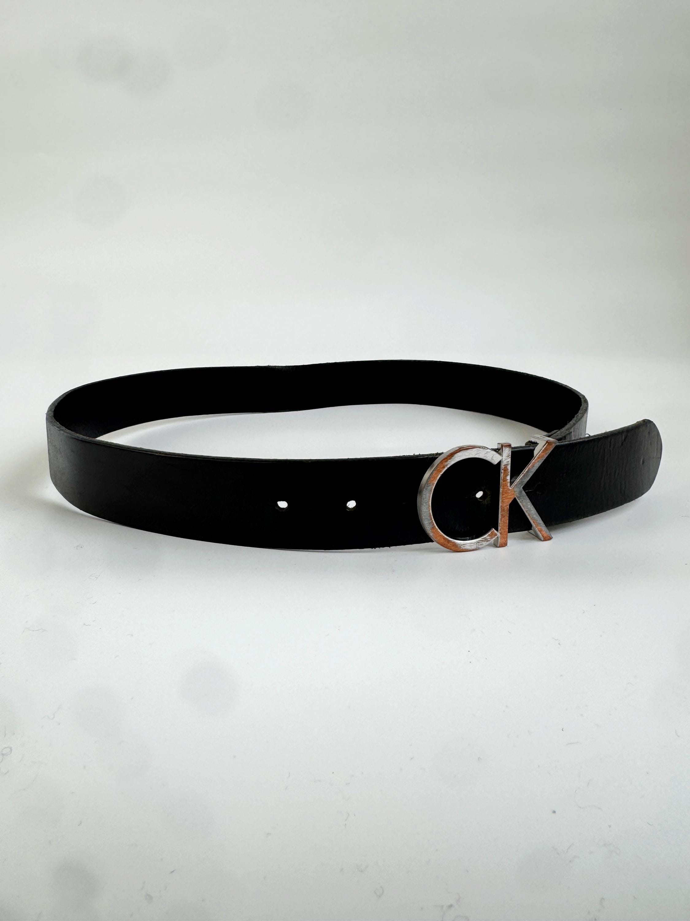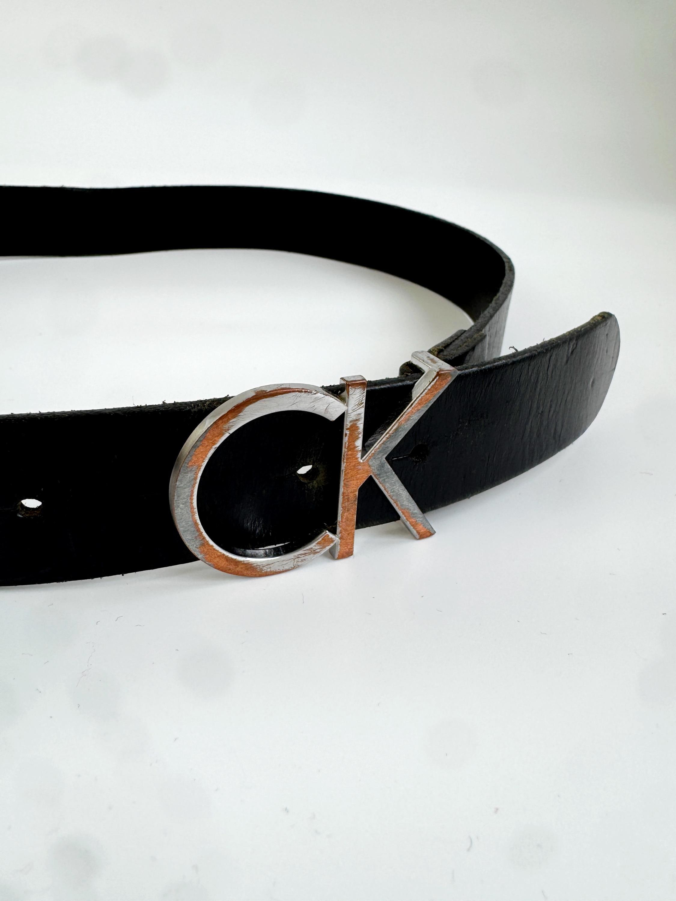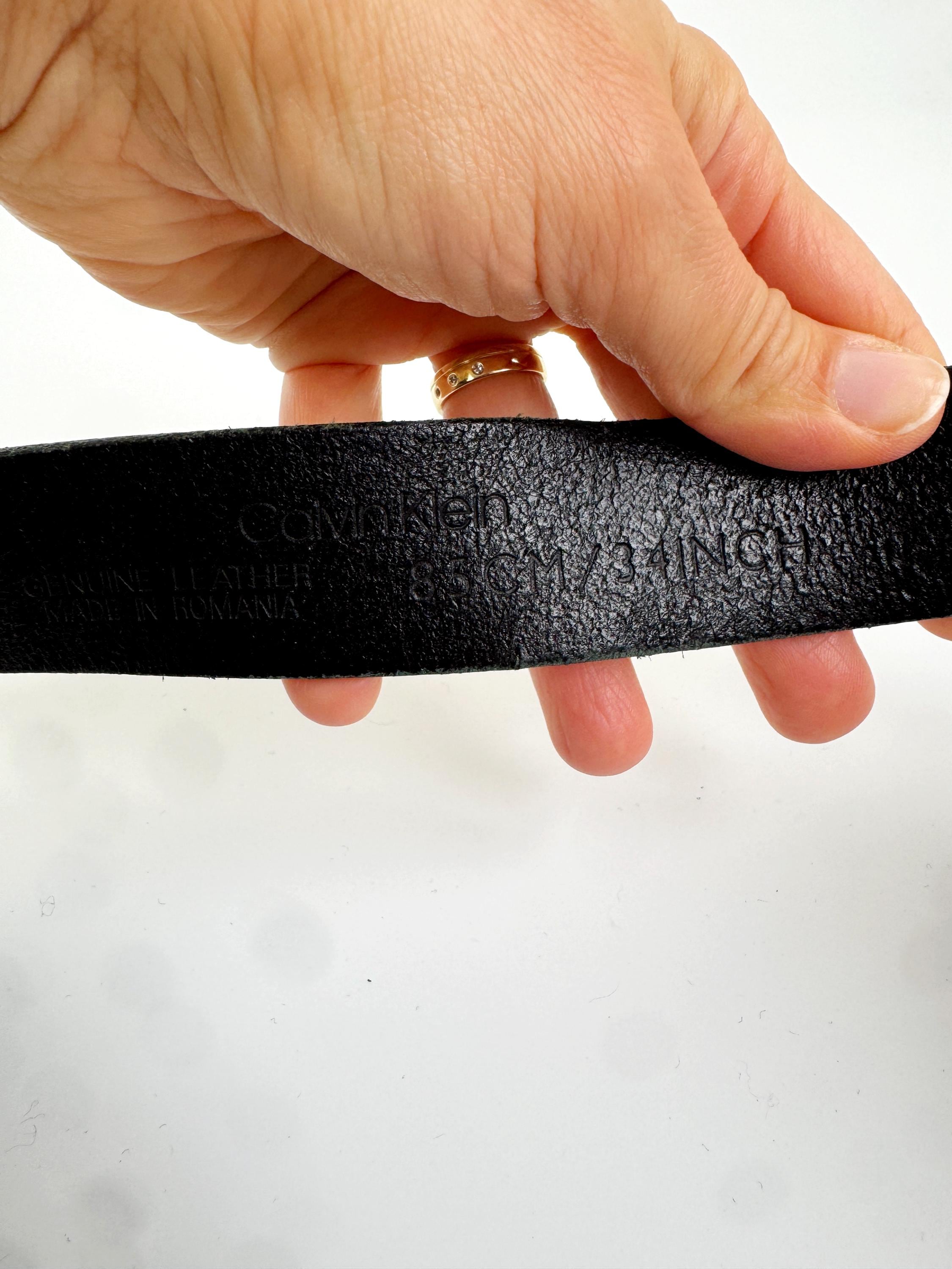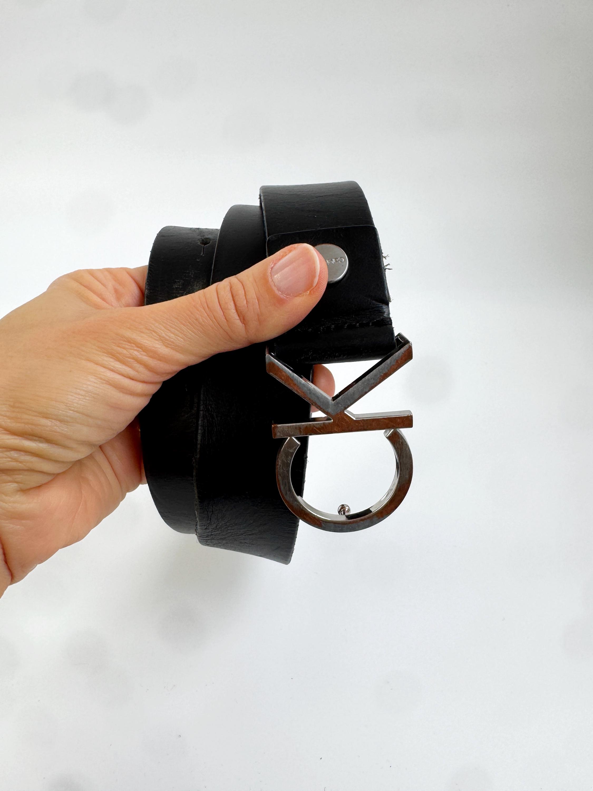This is a vintage Calvin Klein black leather belt in size 85 cm / 34" - a quintessential 90s statement piece that effortlessly blends minimalism with bold branding. Crafted from high-quality genuine leather in Romania, this black waist belt features the iconic oversized "CK" monogram buckle. The metal hardware has developed a unique, distressed patina over time, giving it a rugged, industrial edge that perfectly complements the sleek black leather strap. Whether you’re cinching a pair of high-waisted vintage denim or adding a designer touch to a modern oversized blazer, this real leather belt will be the perfect choise.